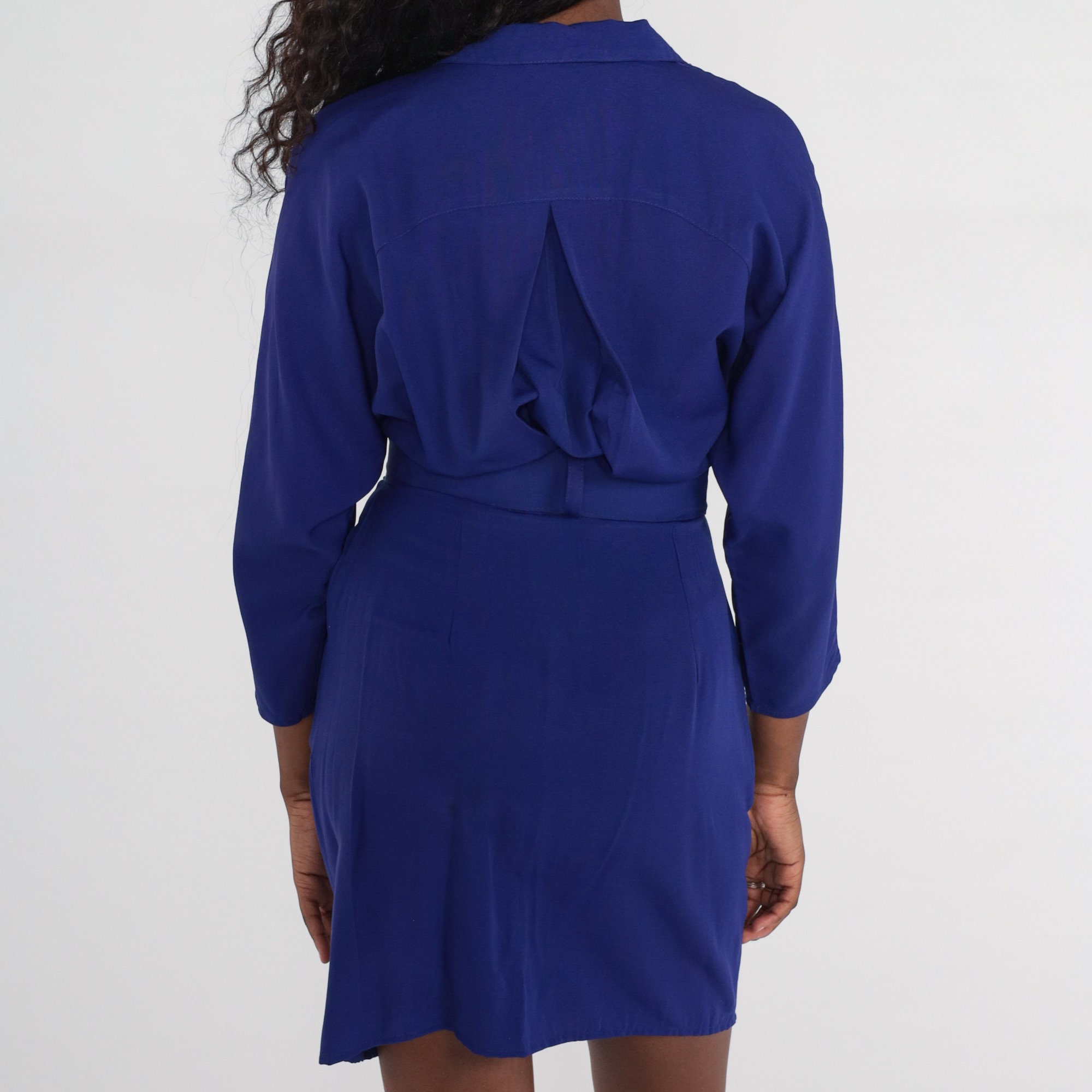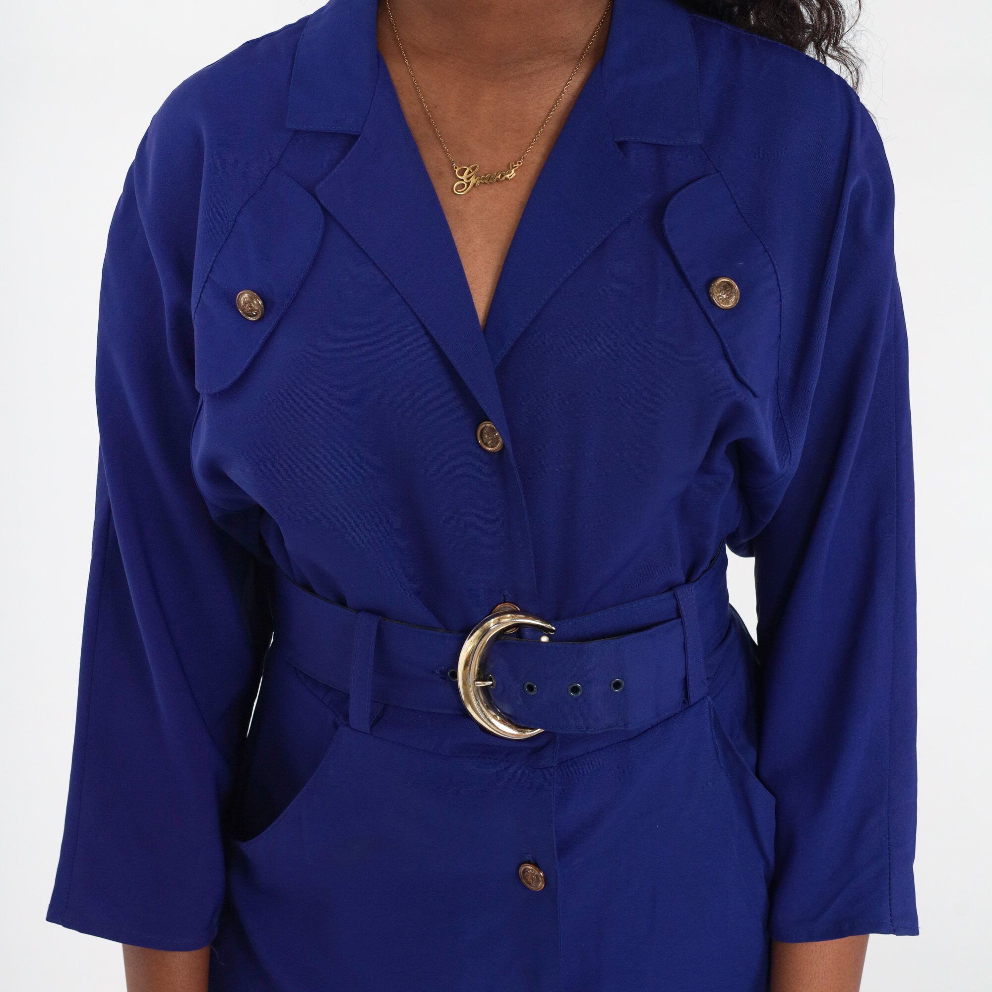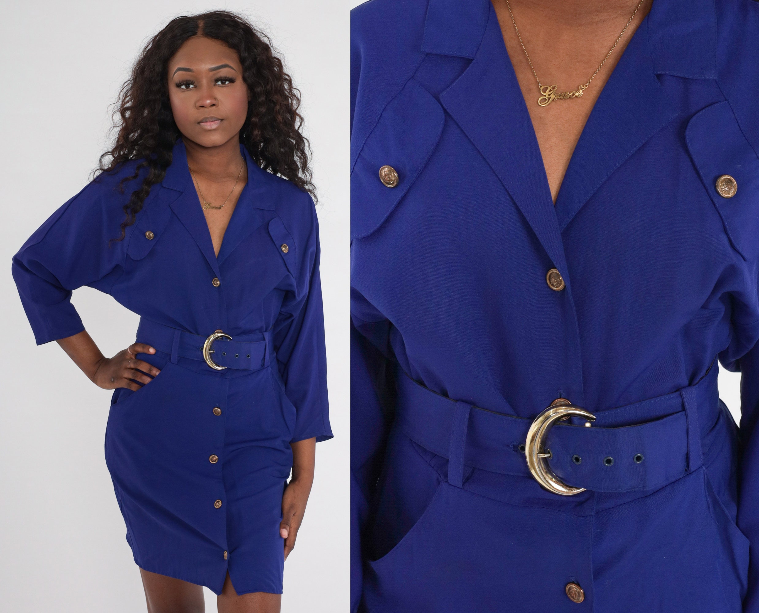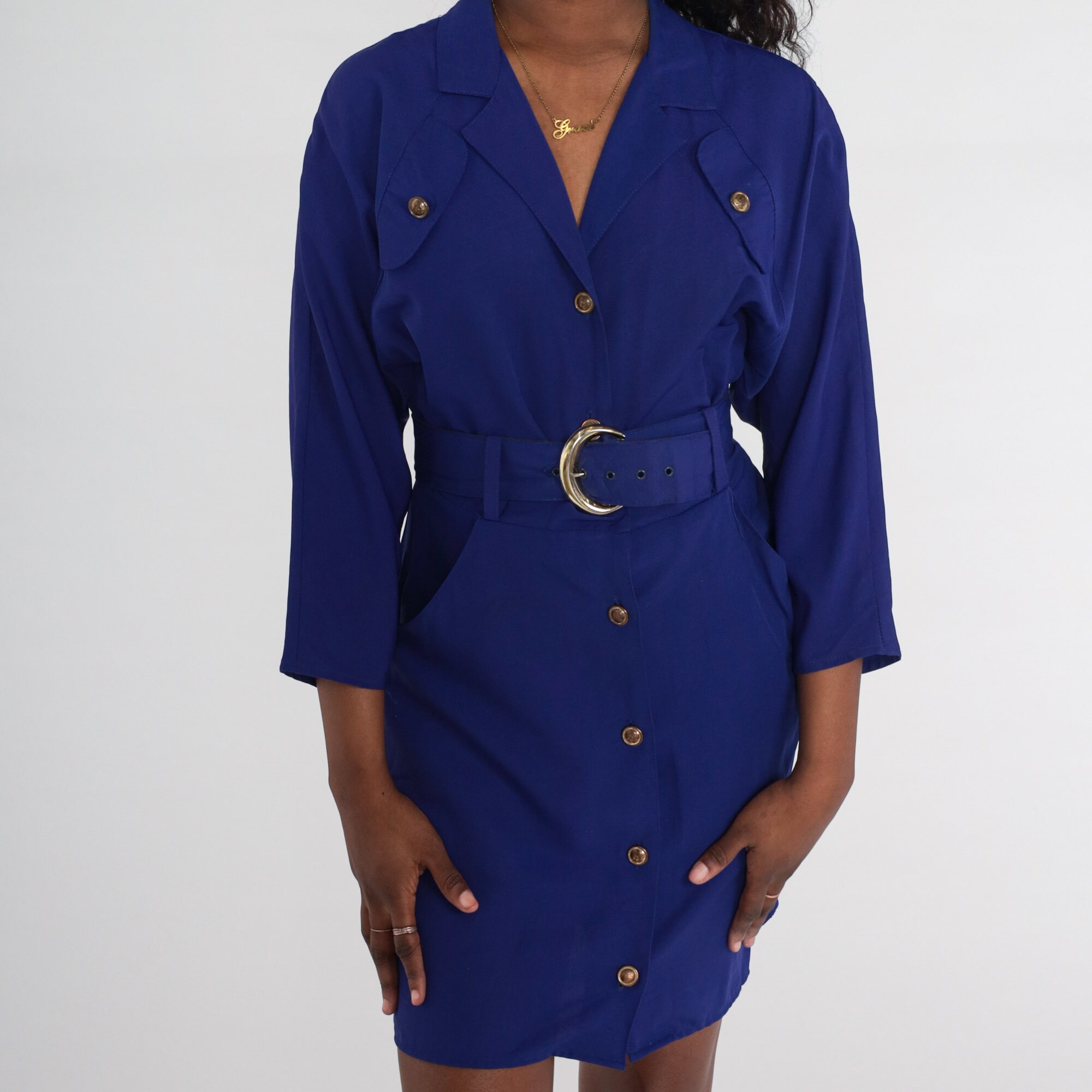 Vintage 90s dress in purple with bronze buttons down the front. It has a sheath cut with dropped armholes and a belt. Mini length.