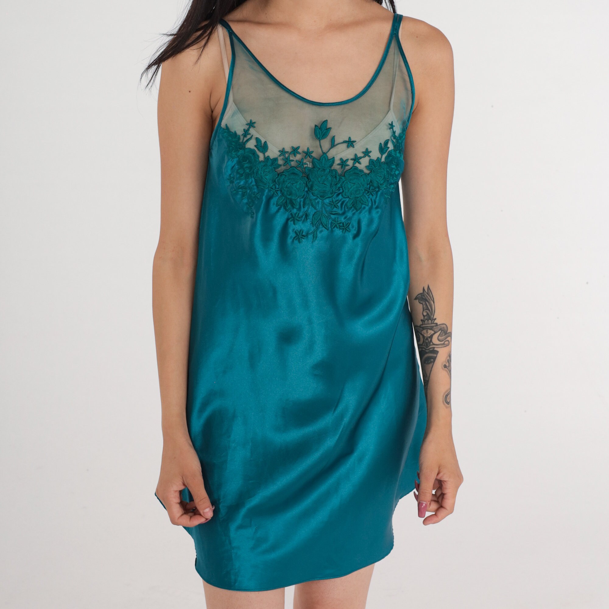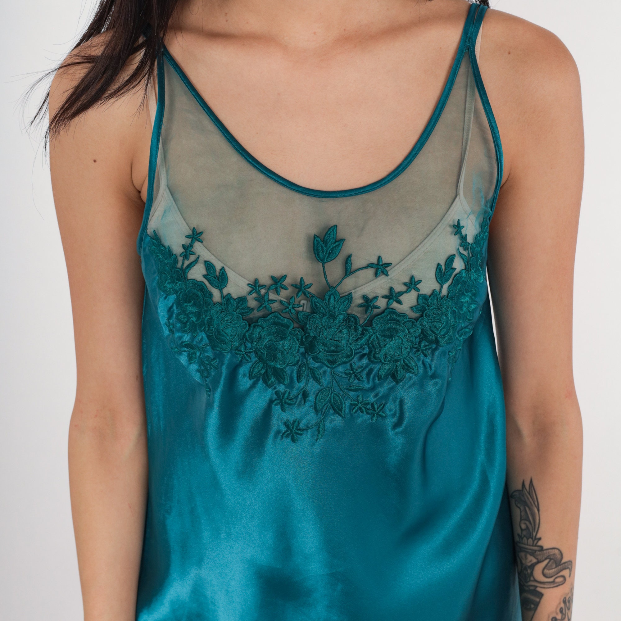 Vintage 90s slip dress in teal blue with floral mesh trim at the yoke. Sleeveless with spaghetti straps; Mini length.
