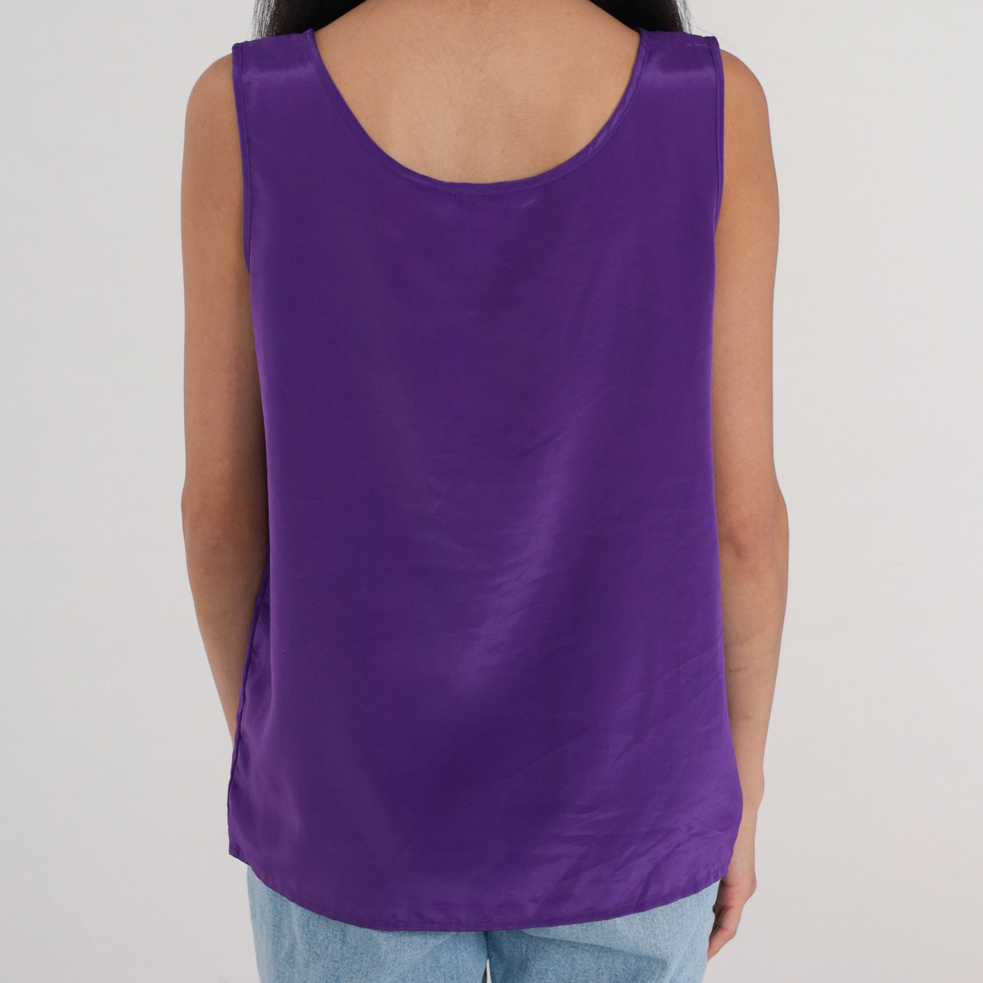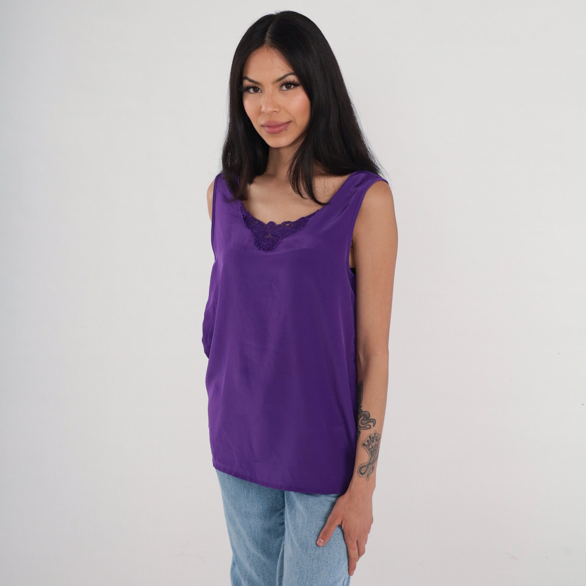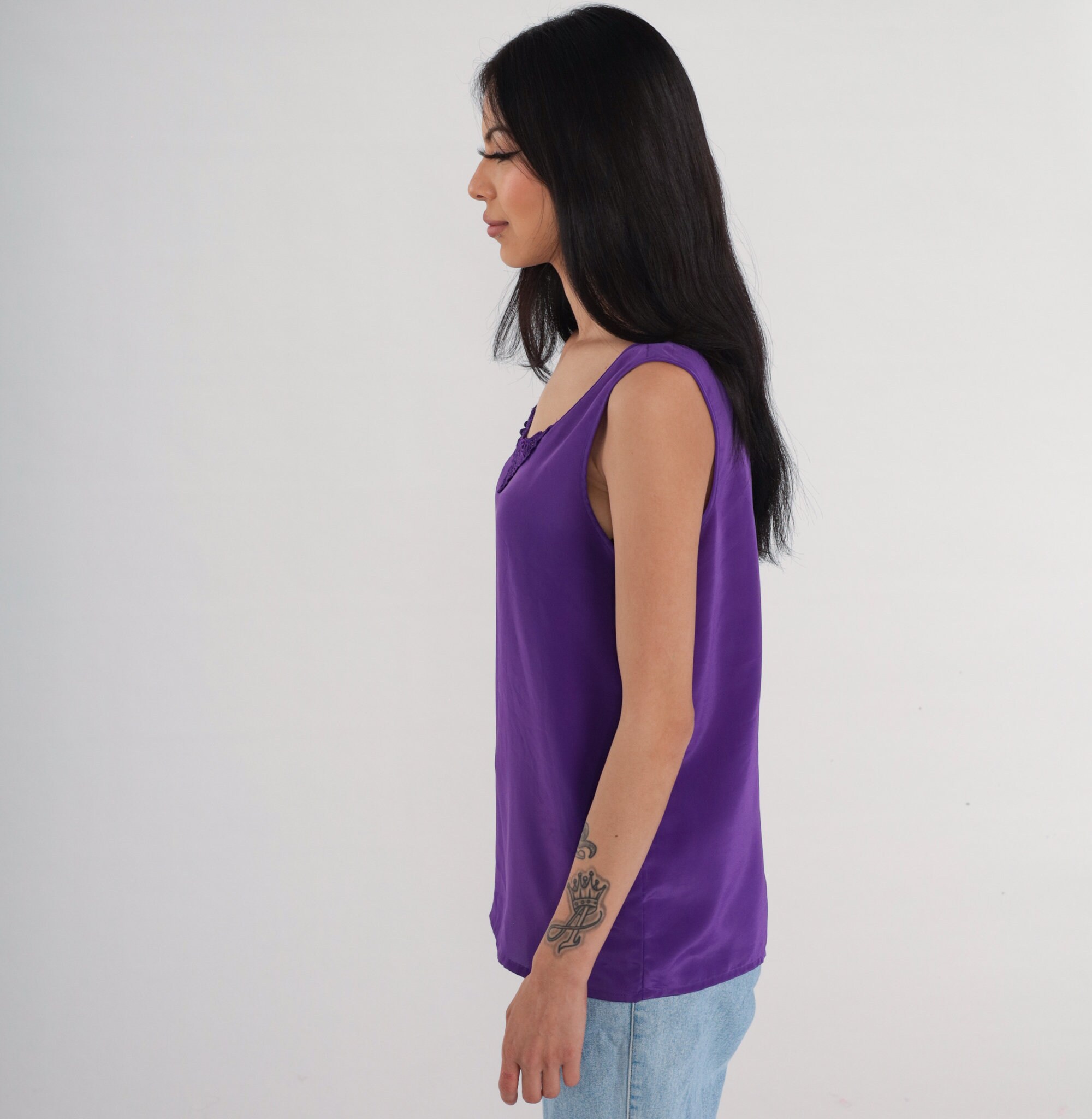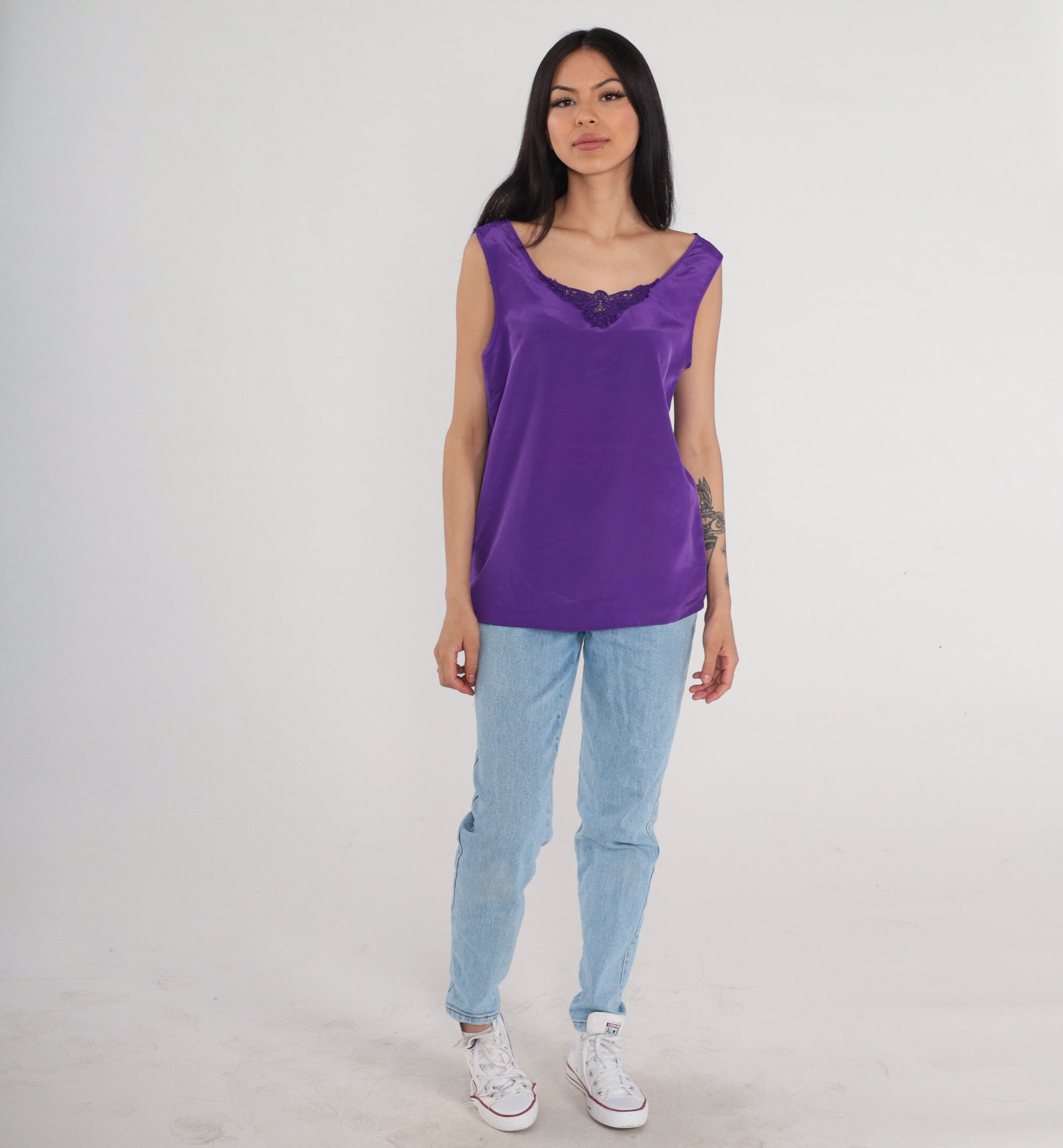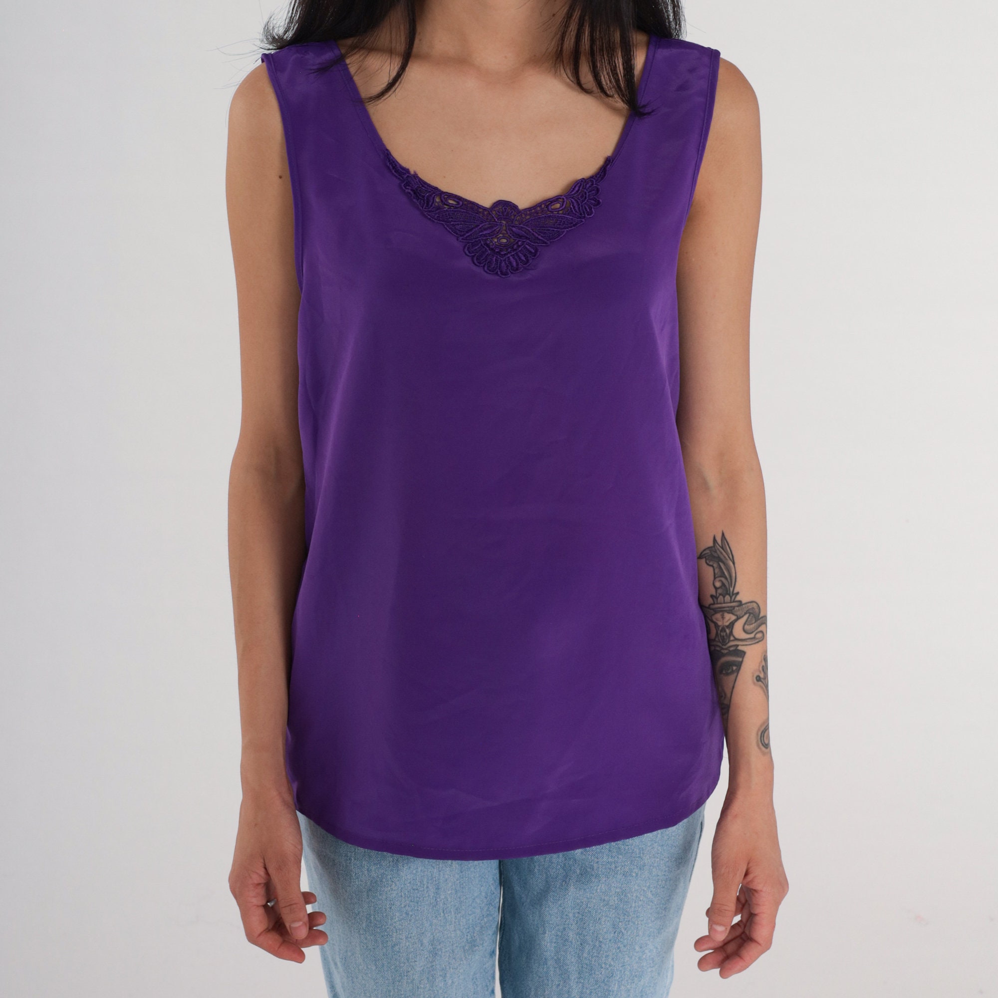 Vintage 90s camisole tank top in purple with a floral applique at the neckline.