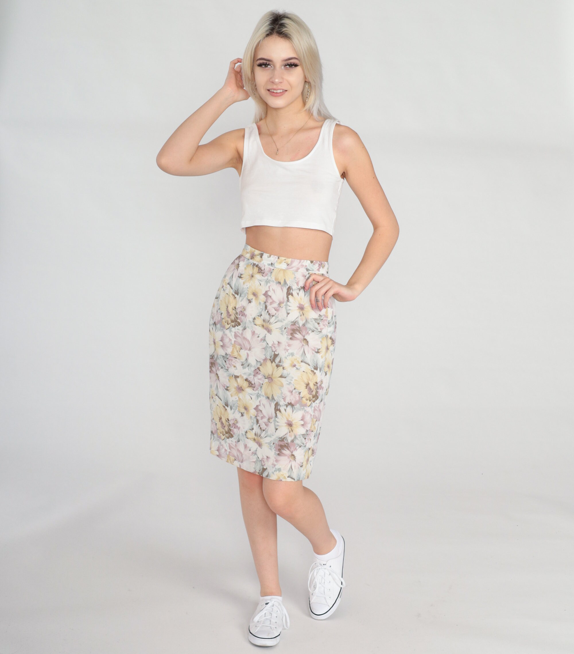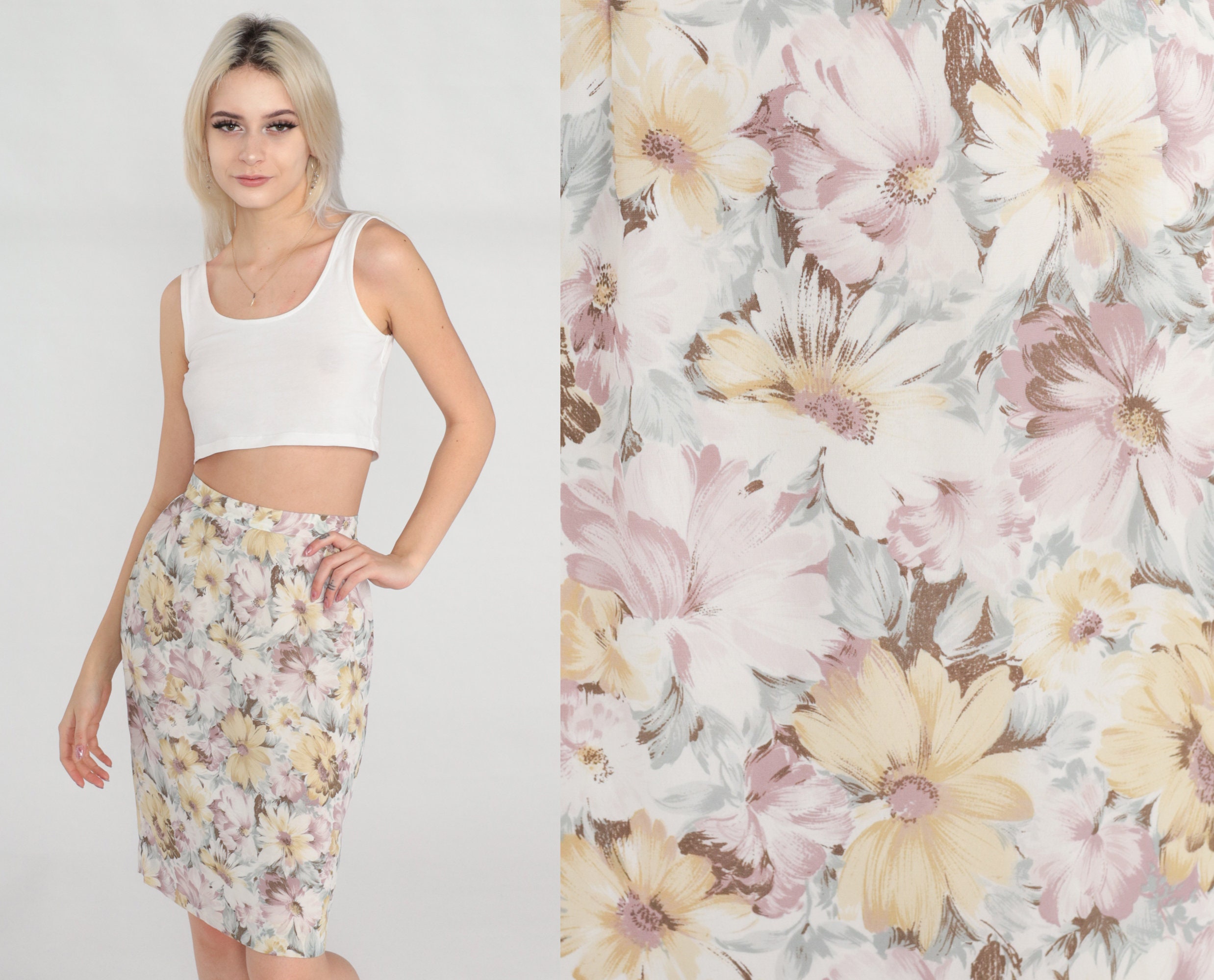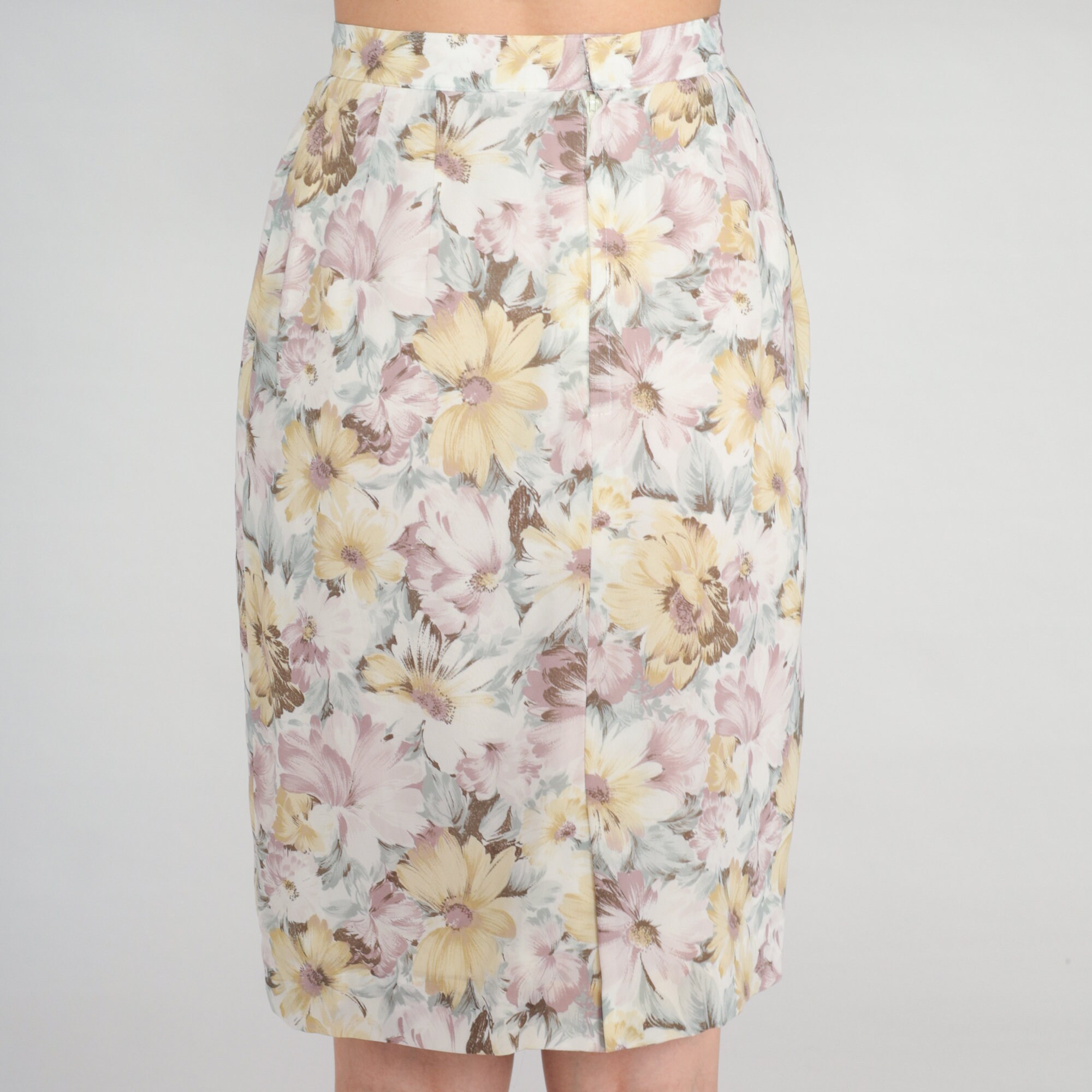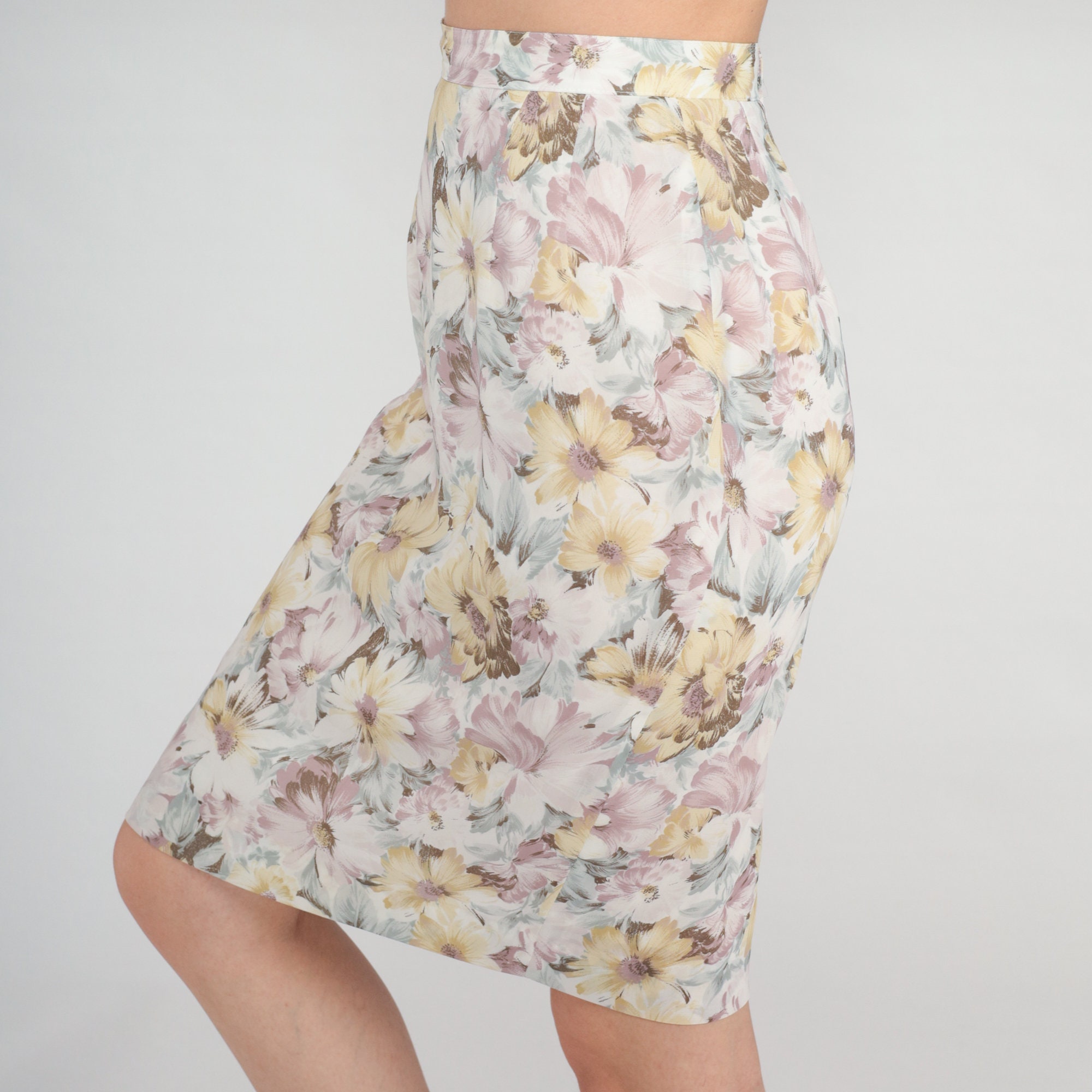 Vintage 80s skirt in a floral print. High waisted with a pencil cut. Knee length.