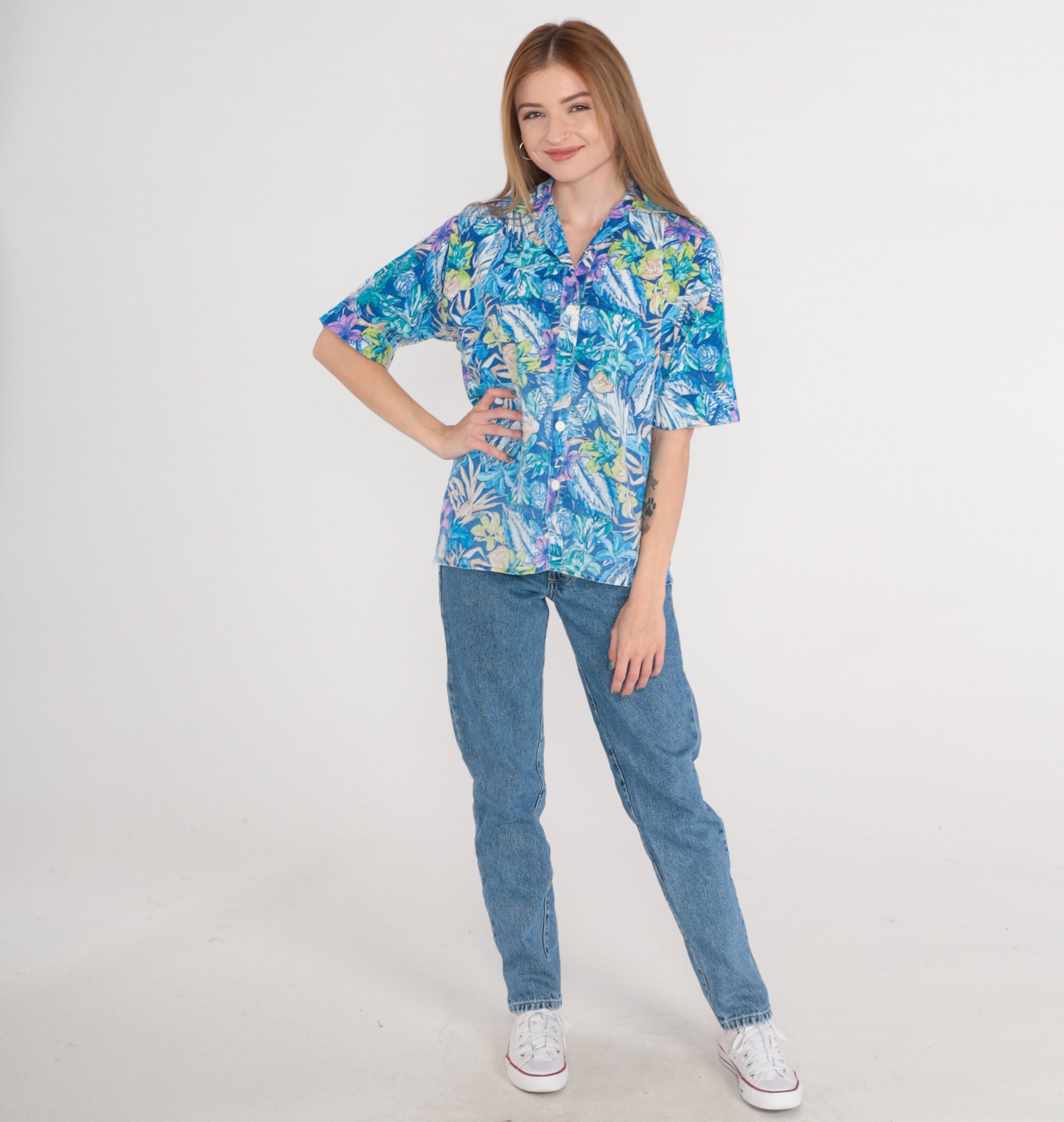 Vintage 90s shirt with a floral print. It has short cuffed sleeves and buttons up the front.