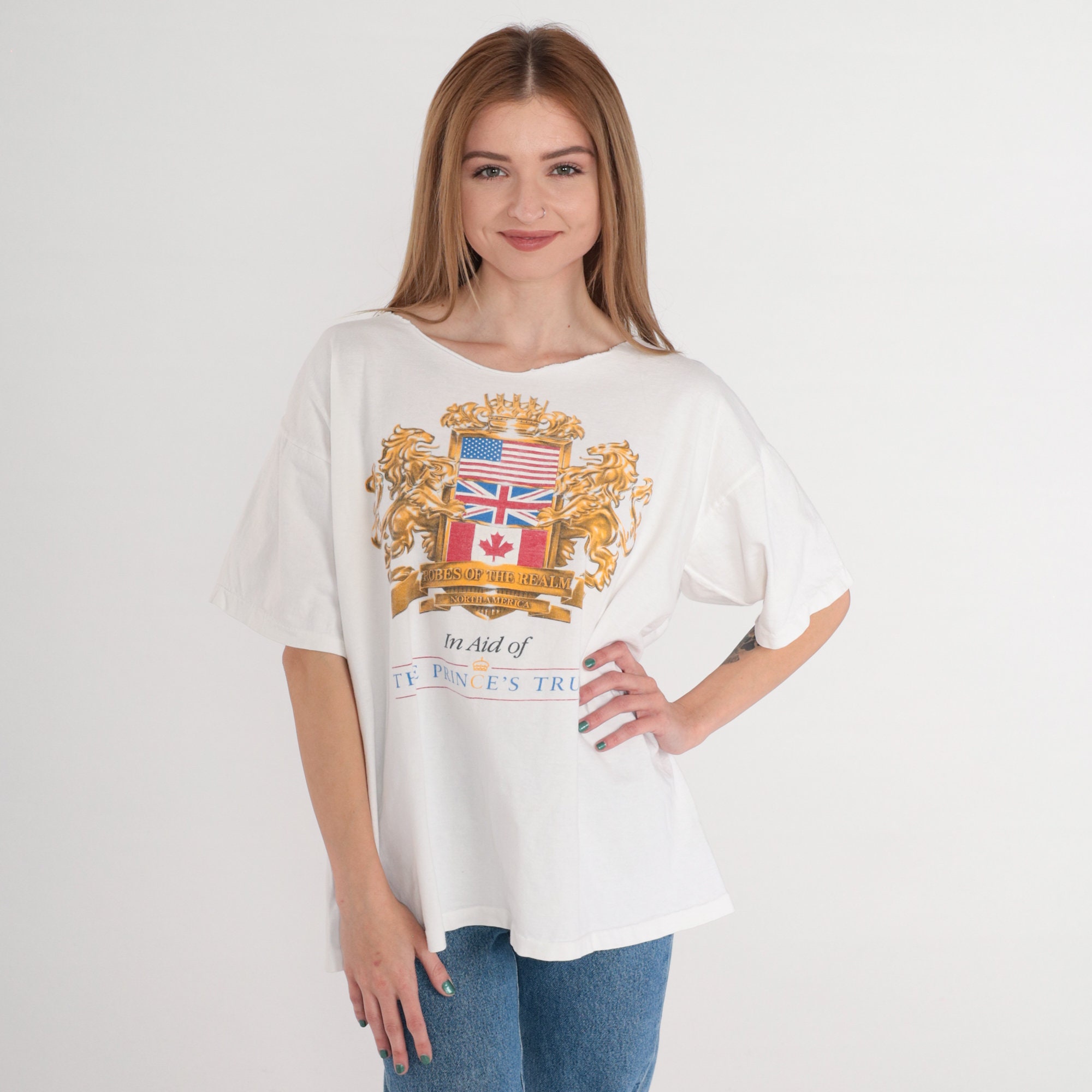 Vintage 90s t shirt in white with a Robes of the Realm North America Graphic and "In Aid of the Prince's Trust" on the front.
