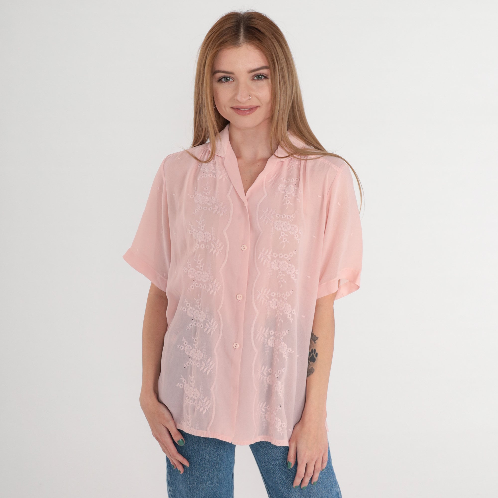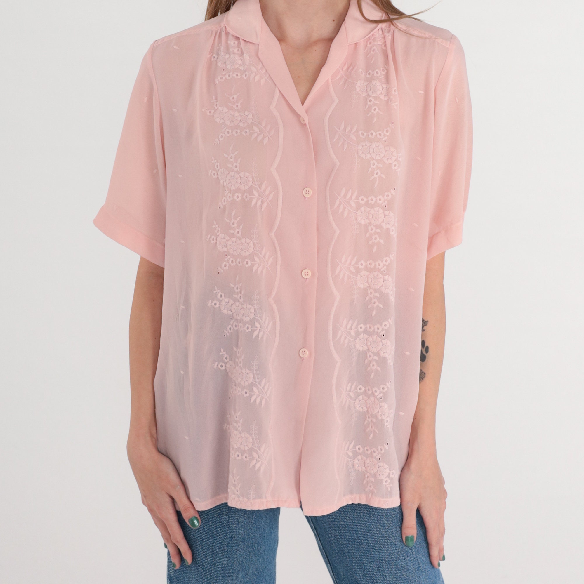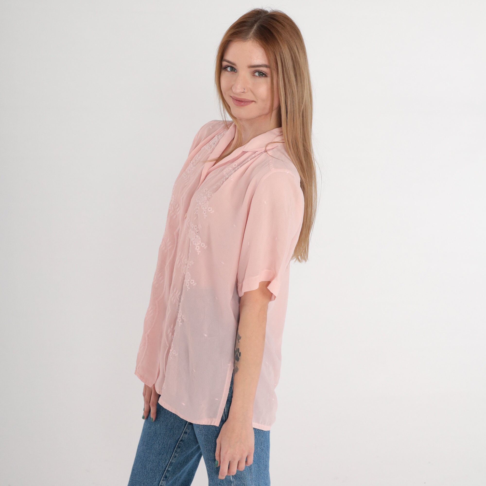 Vintage 80s blouse in Semi-Sheer pink with floral embroidery. Short puff sleeves and buttons up the front.