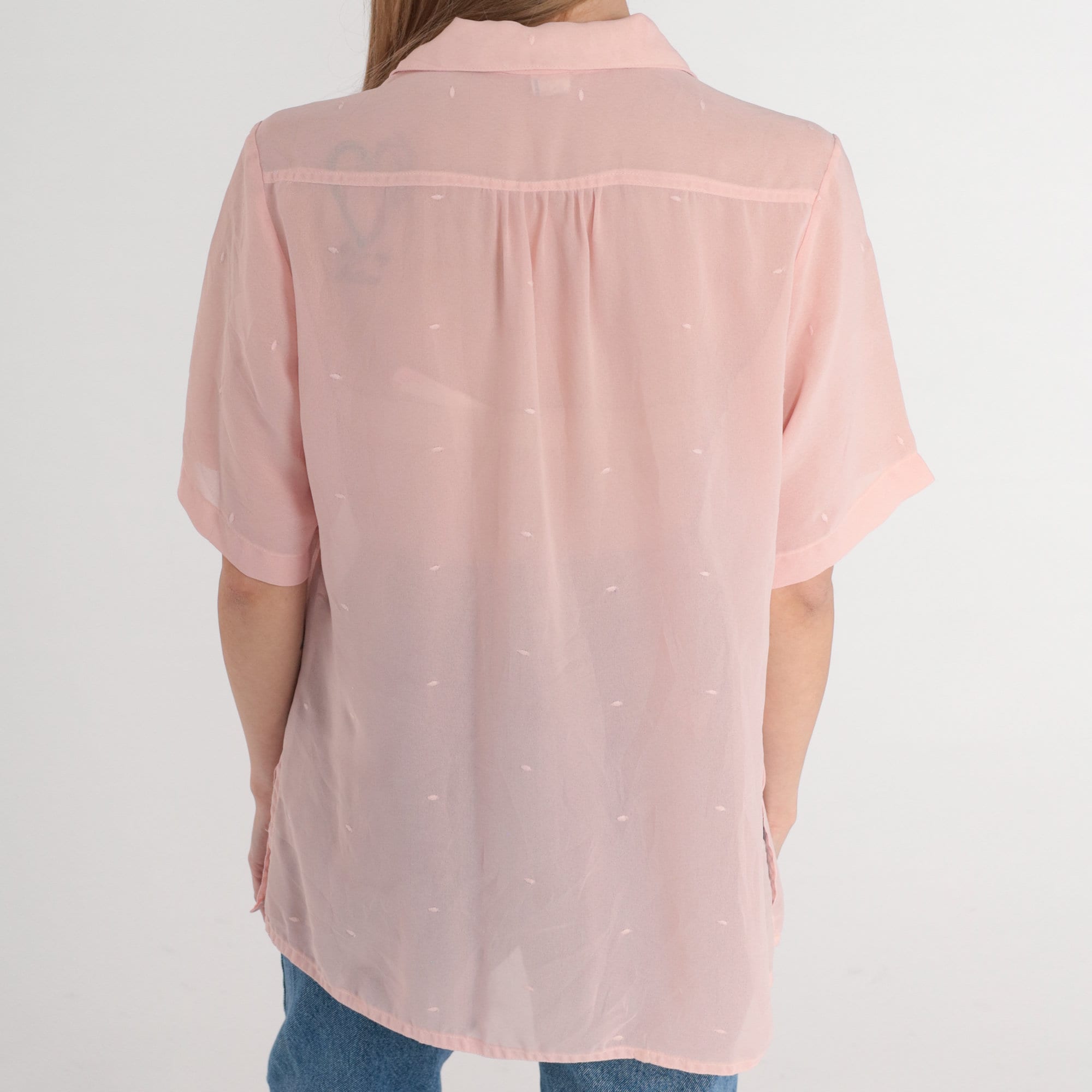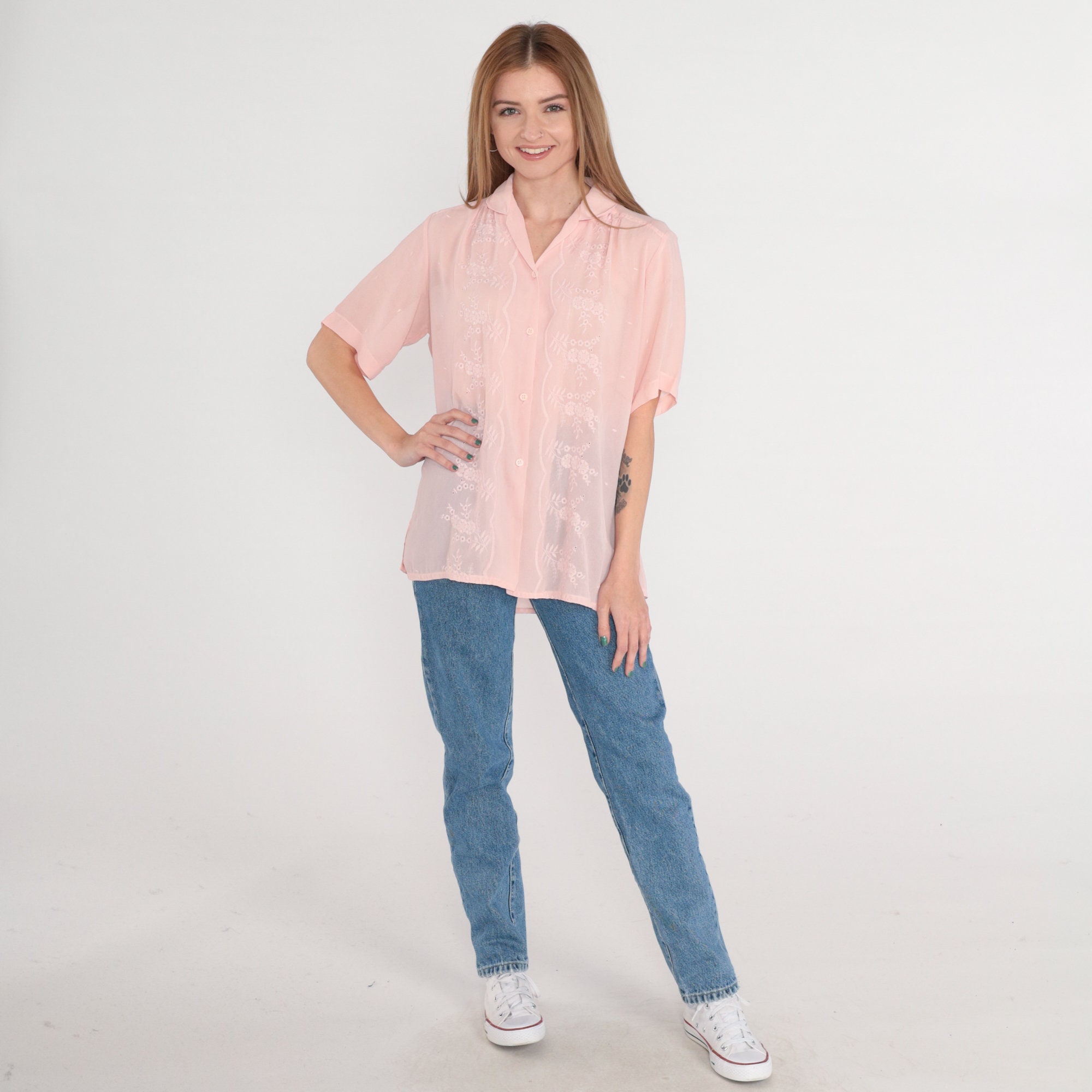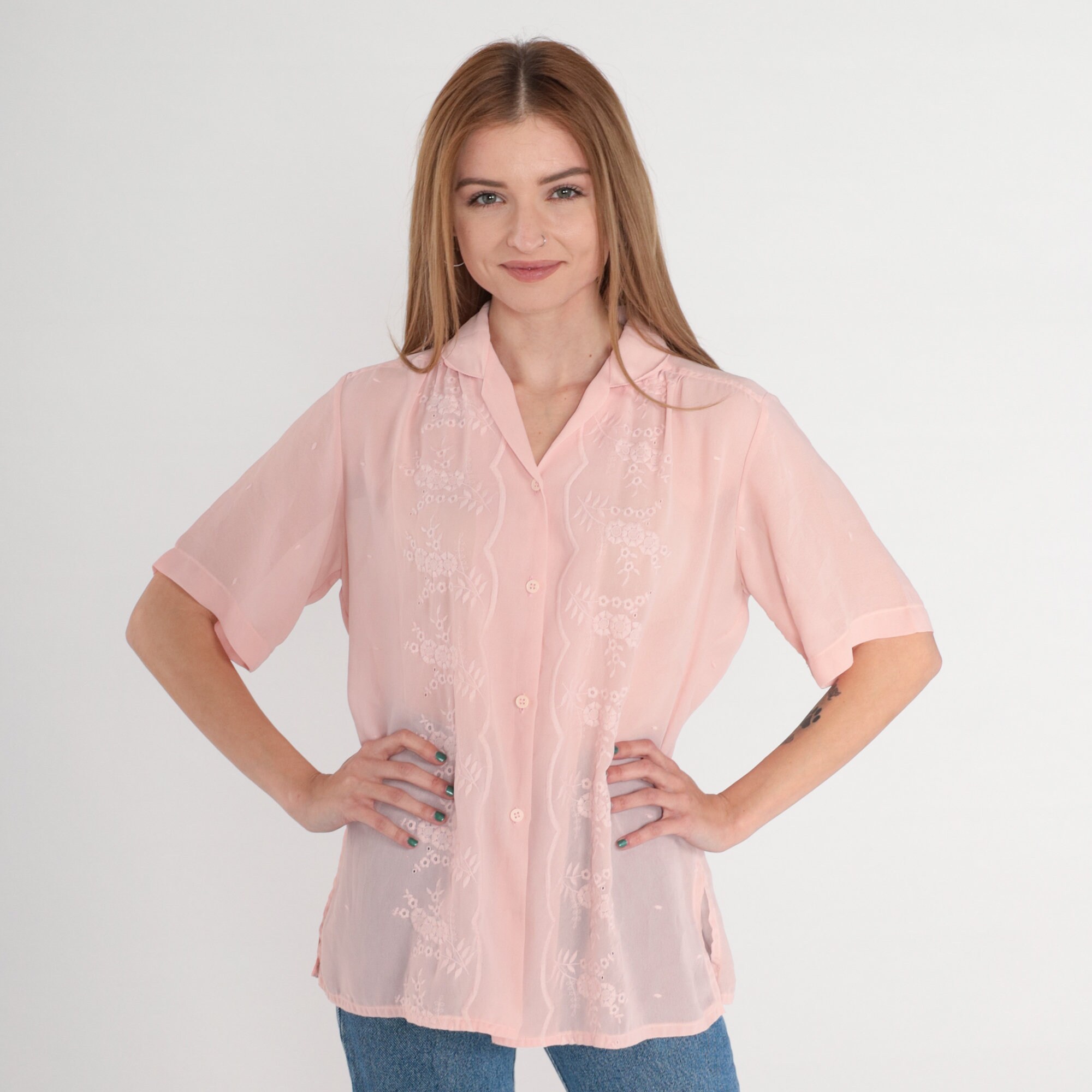 Vintage 80s blouse in Semi-Sheer pink with floral embroidery. Short puff sleeves and buttons up the front.