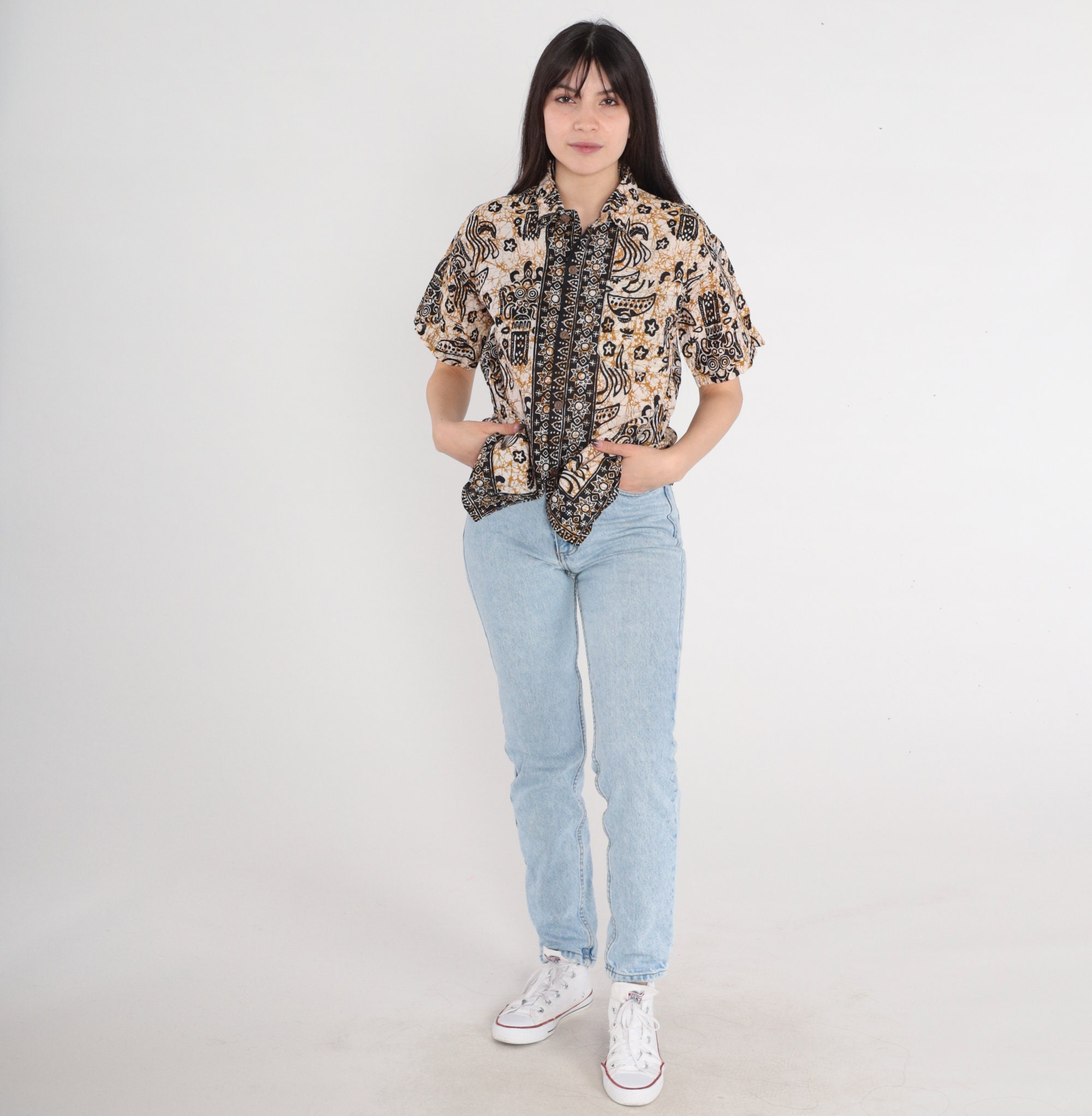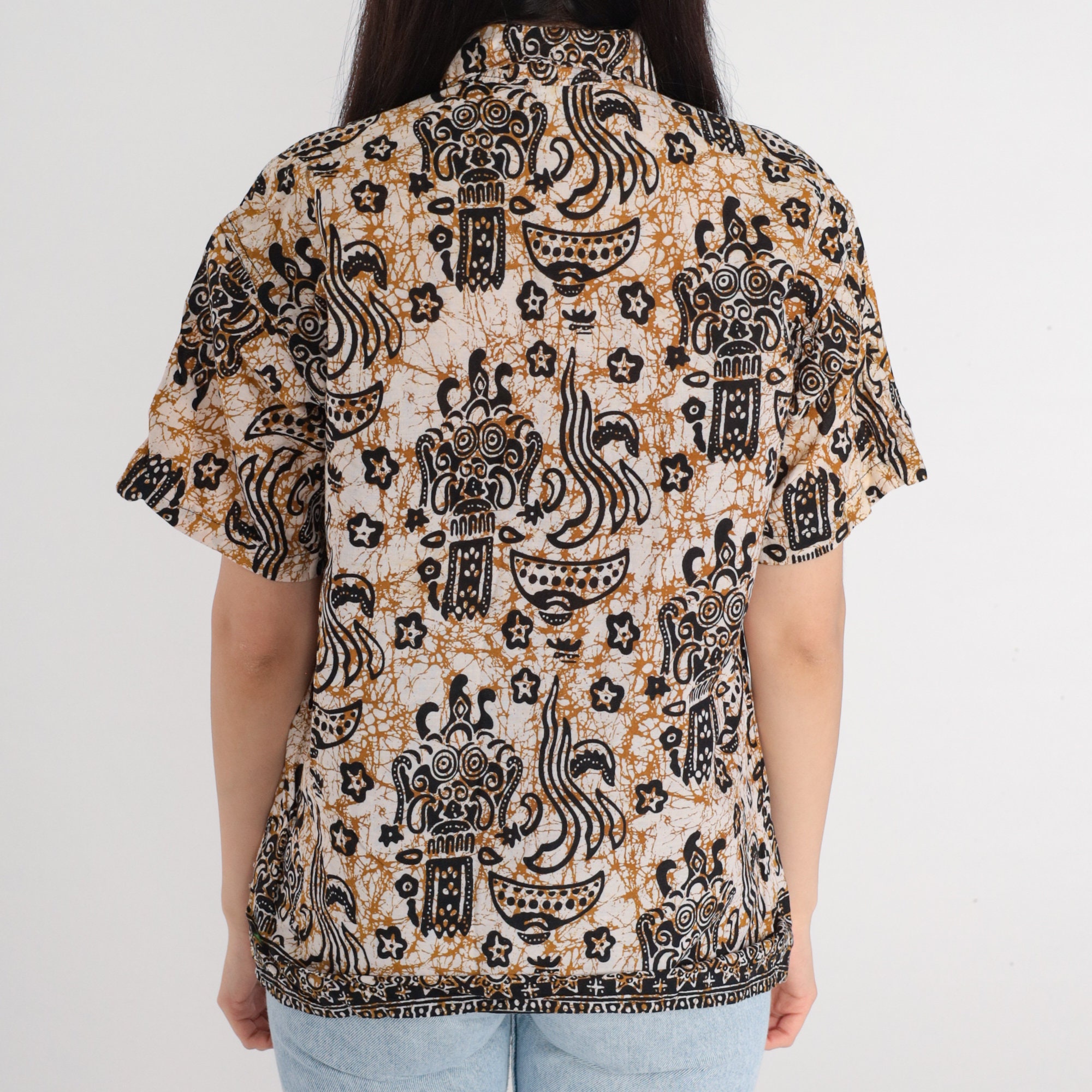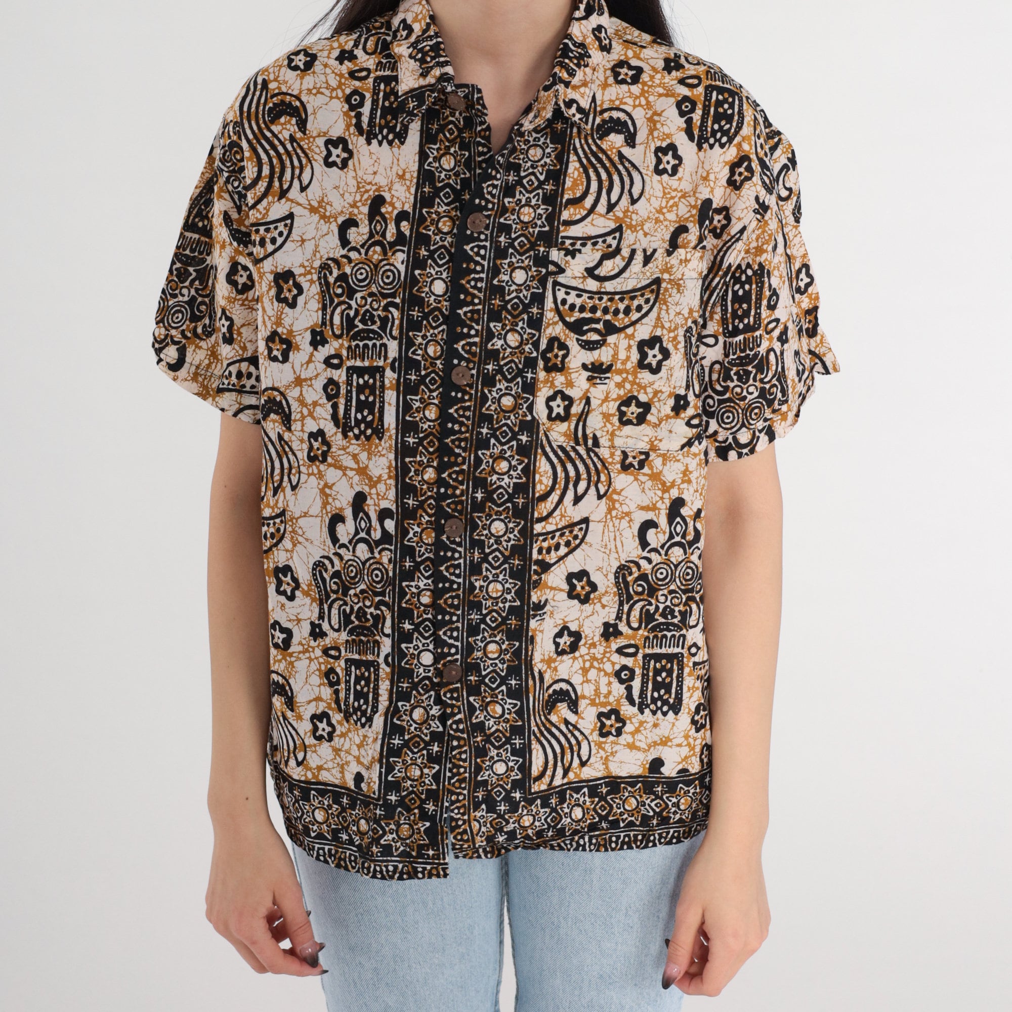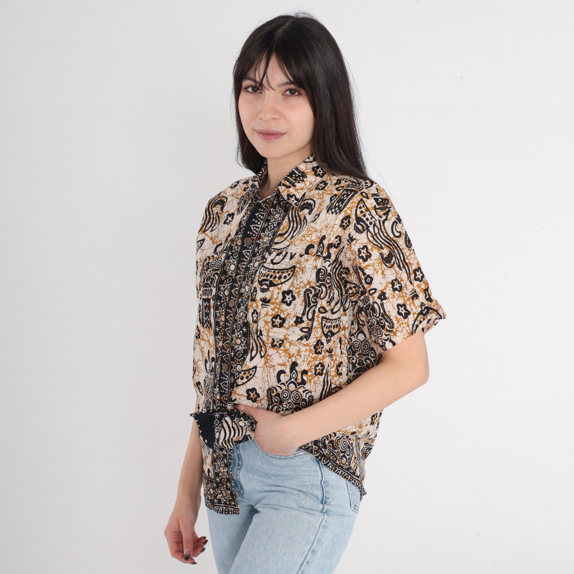 Vintage Y2K shirt in an Indonesian batik print with short sleeves and buttons up the front.