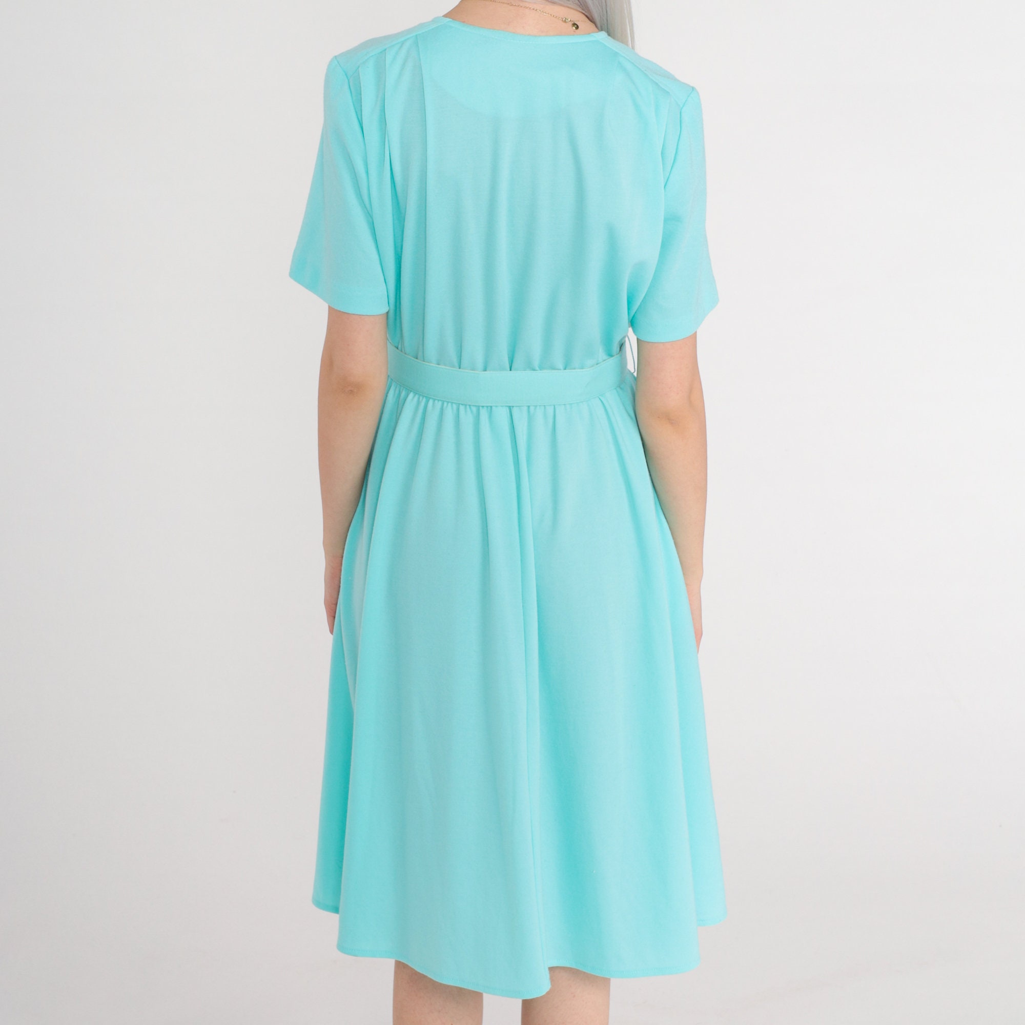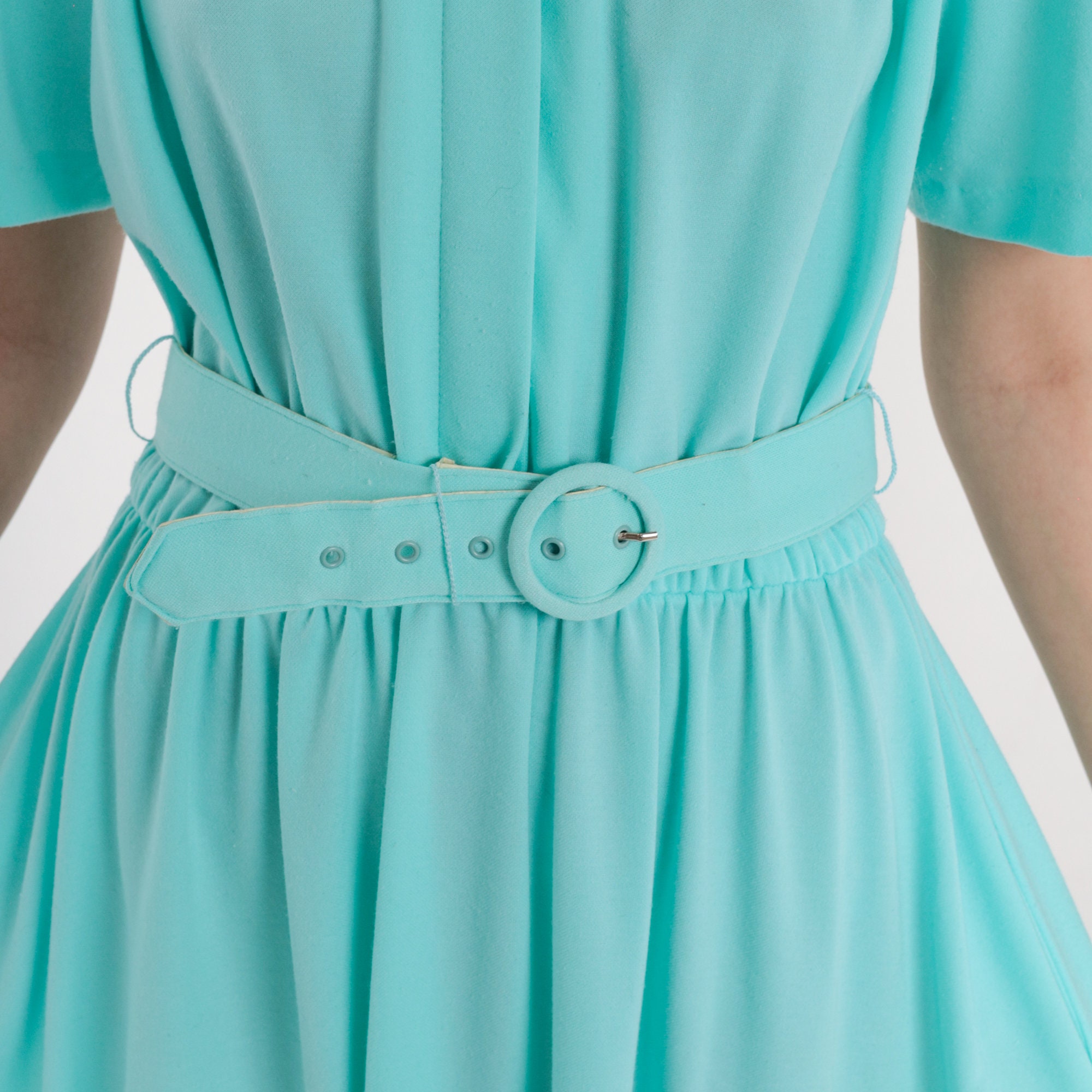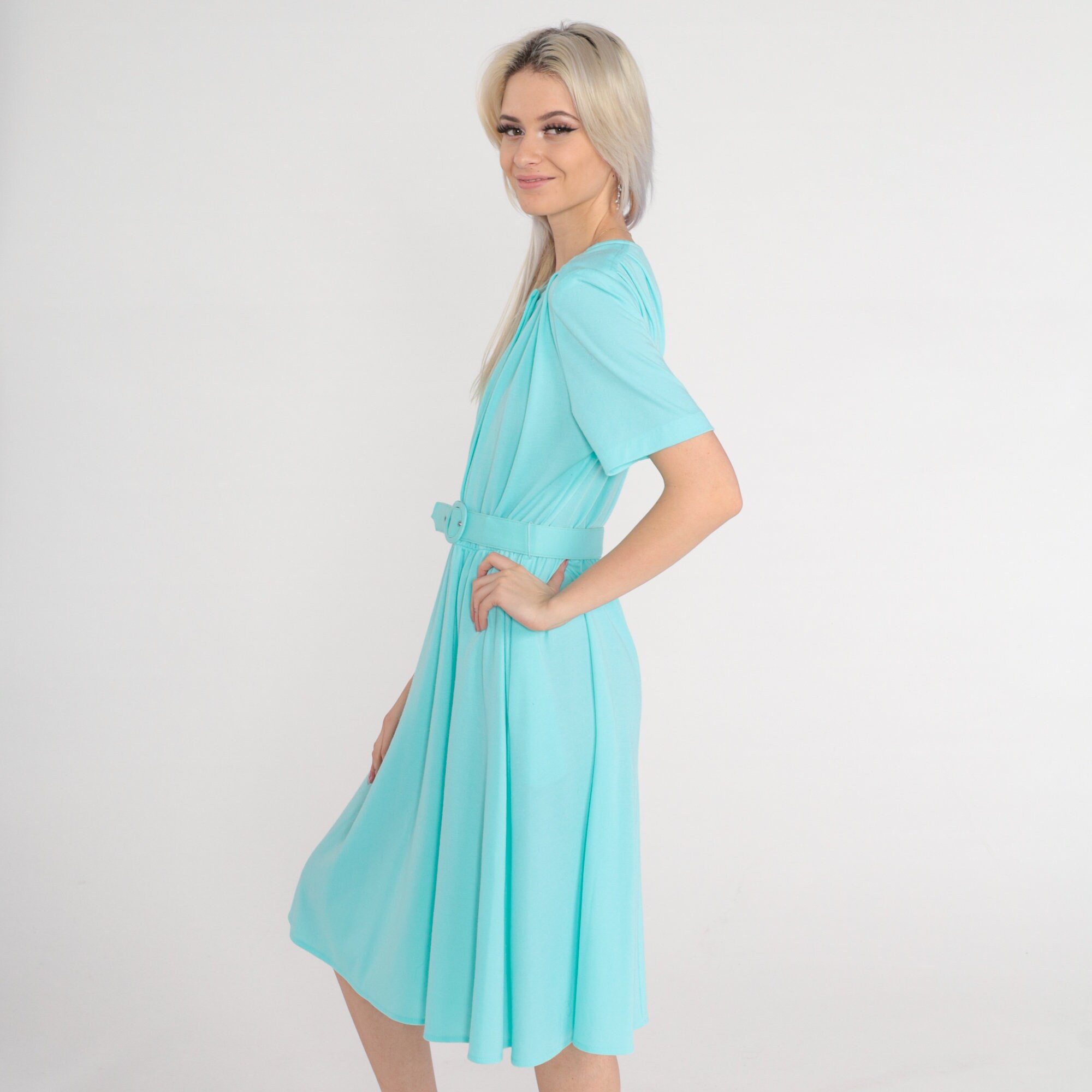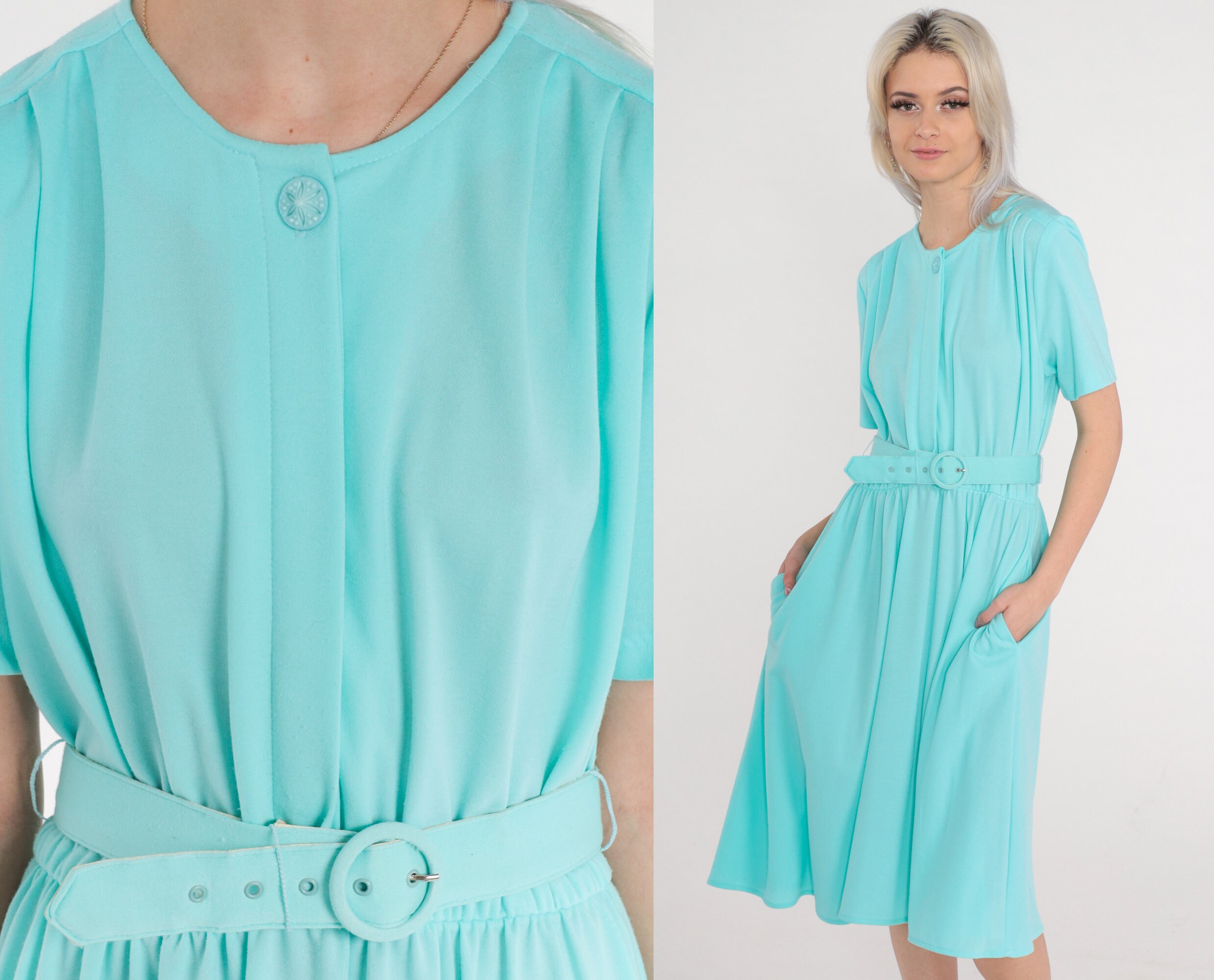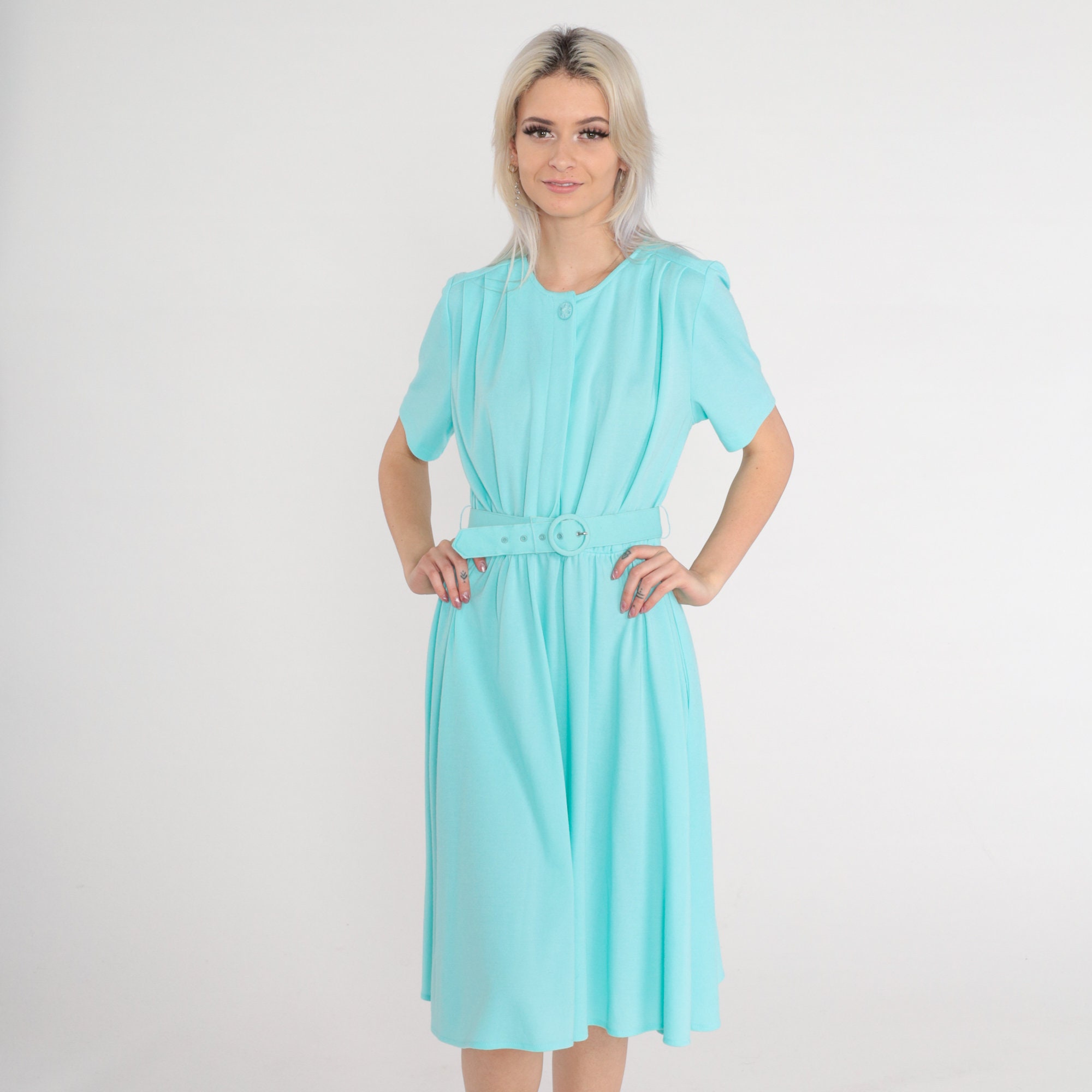 Vintage 80s dress in minty blue with short sleeves and hidden buttons up the chest. High waisted with an attached belt. Midi length.