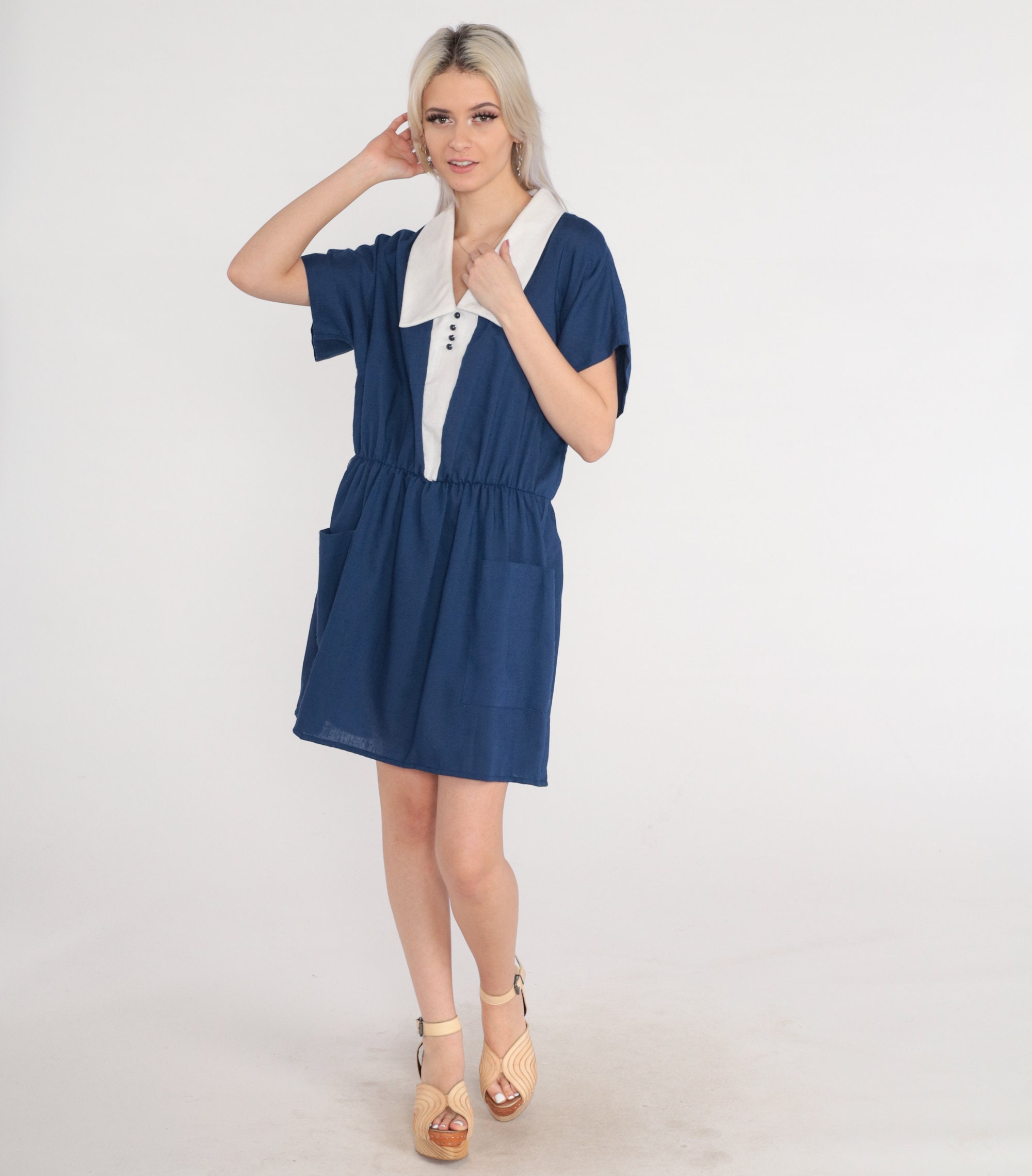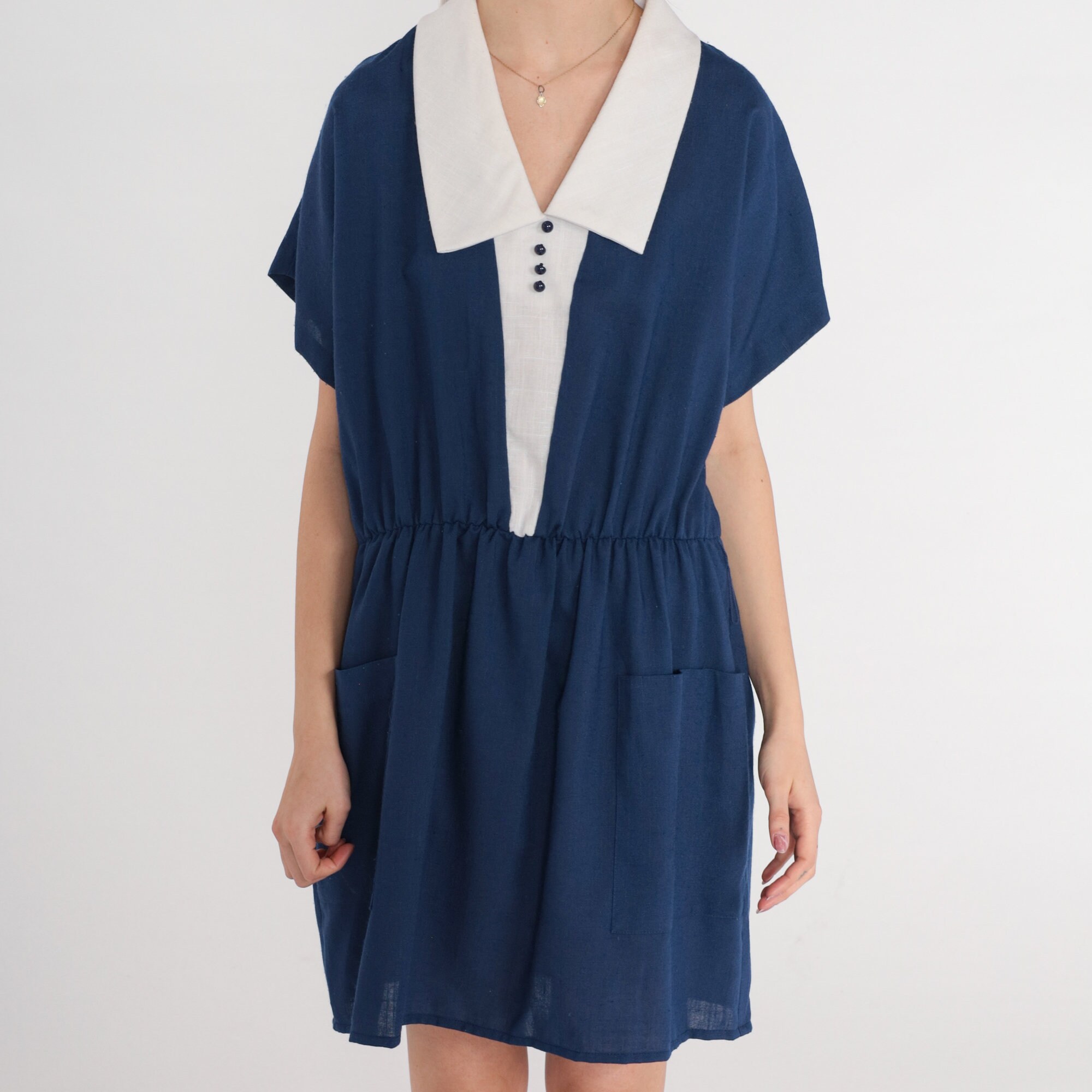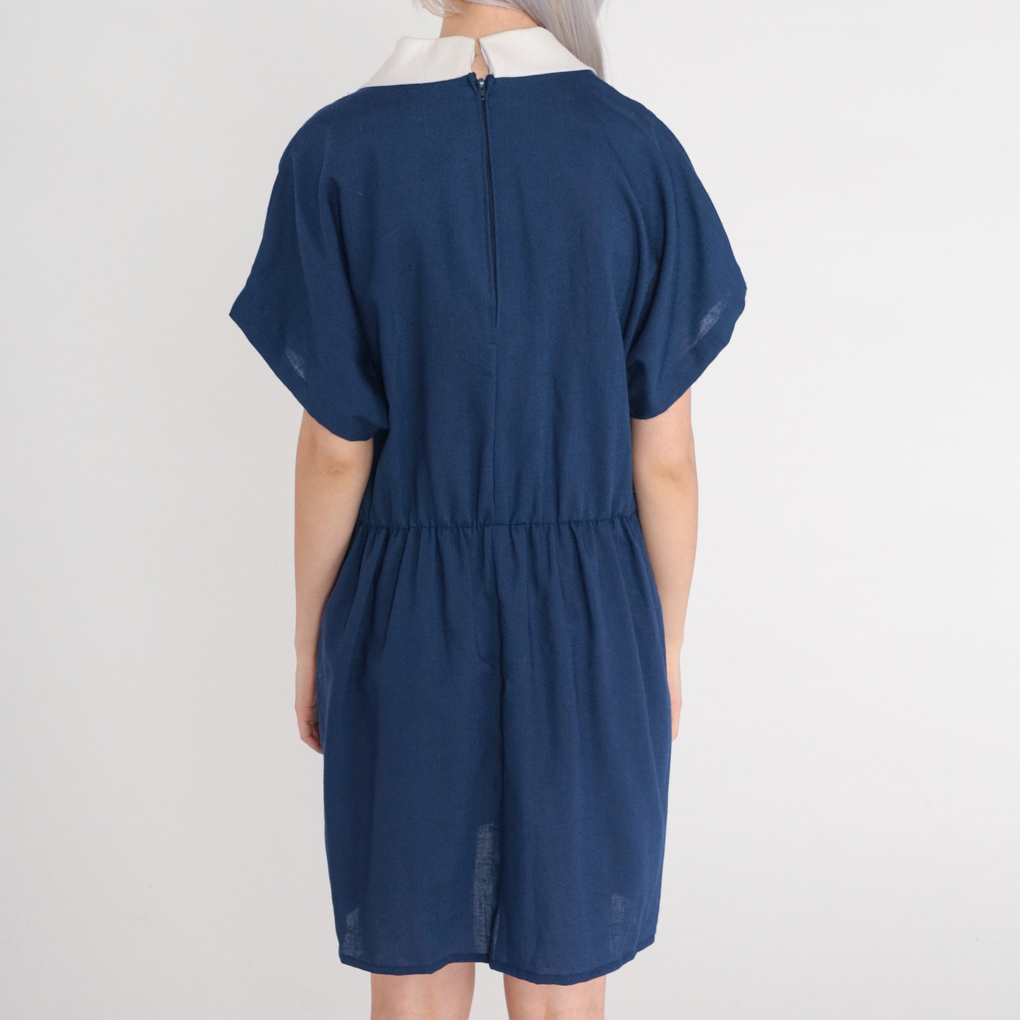 Vintage 80s dress in blue with white trim and a white chelsea collar. High waisted with short sleeves and decorative buttons on the chest. Mini length with a rear zipper and pockets.