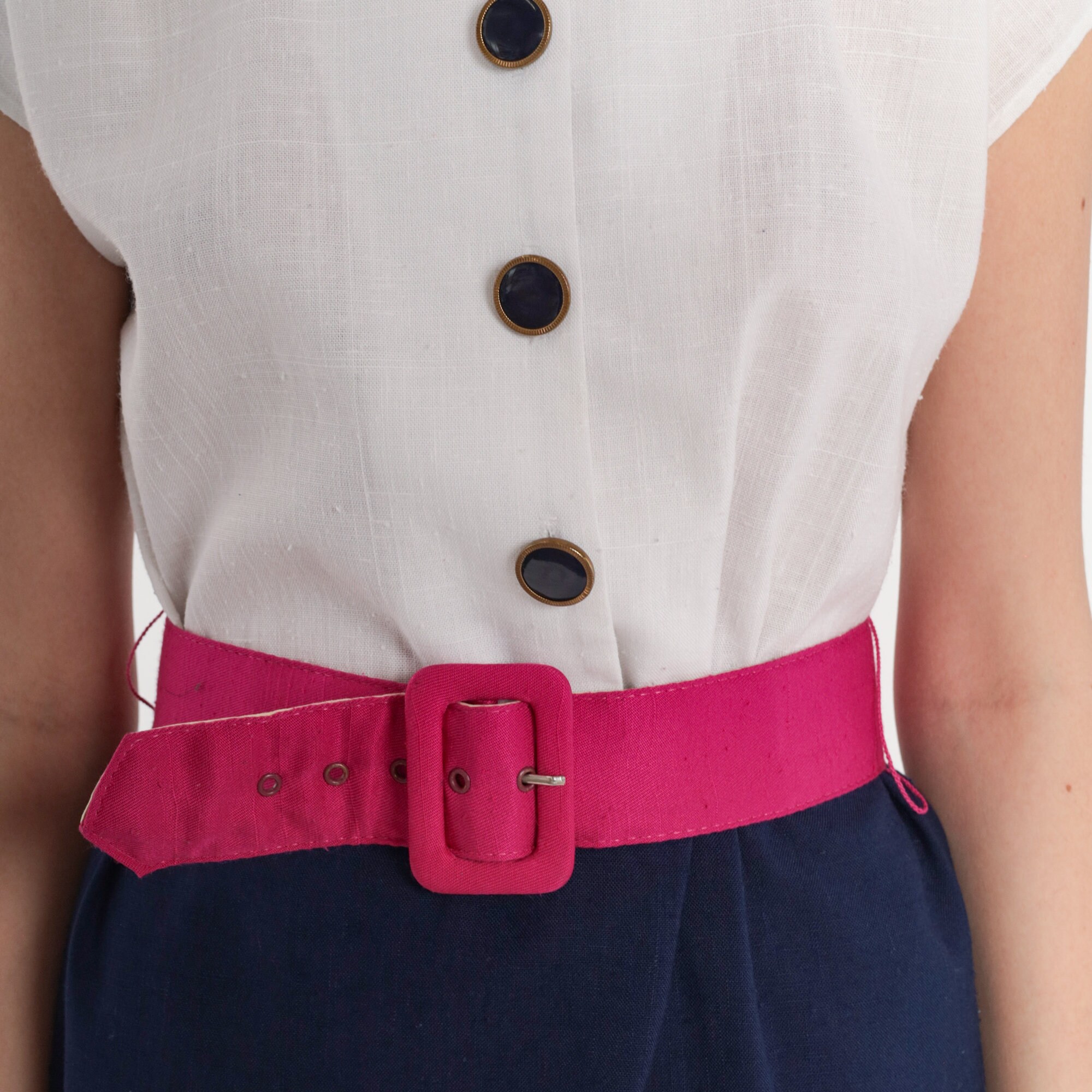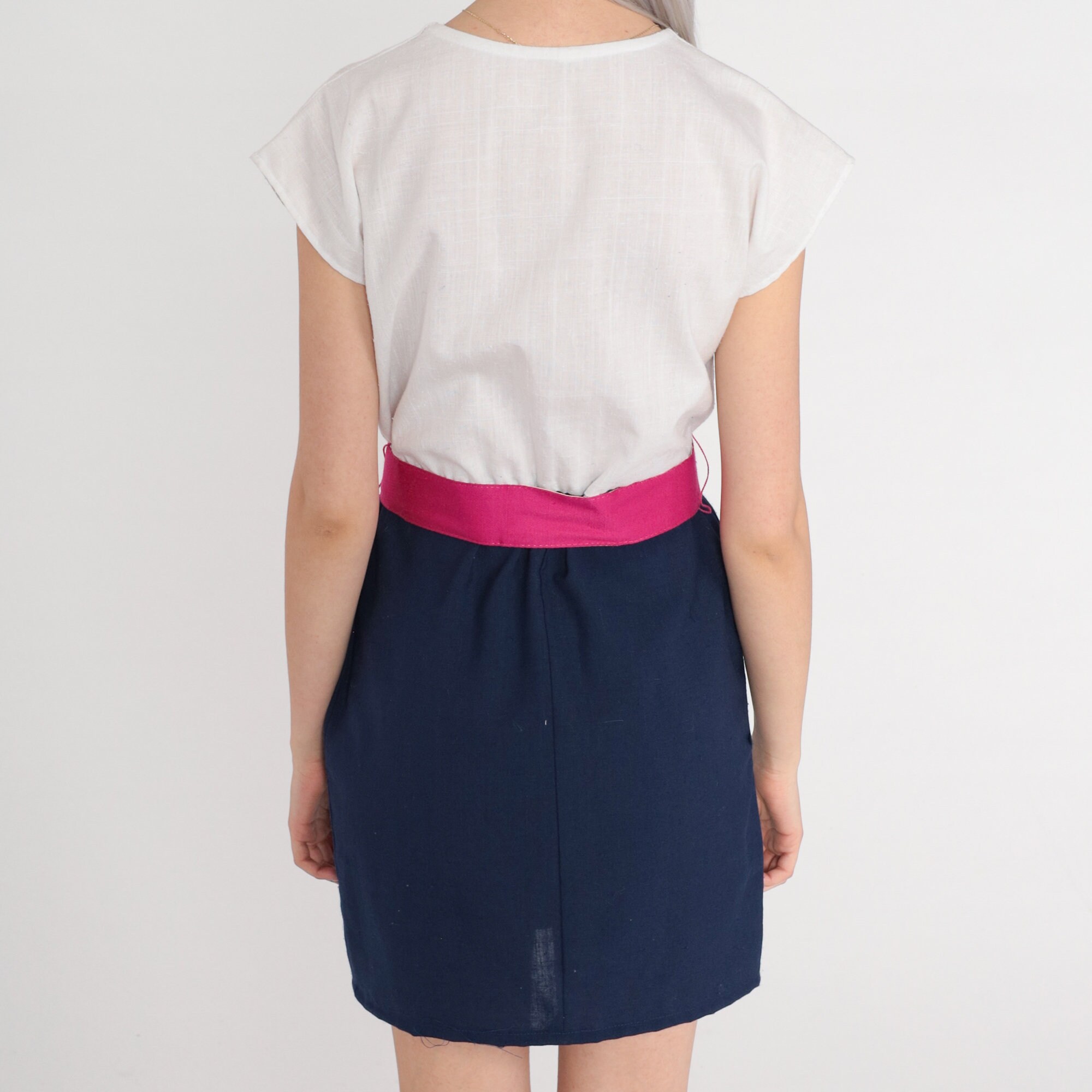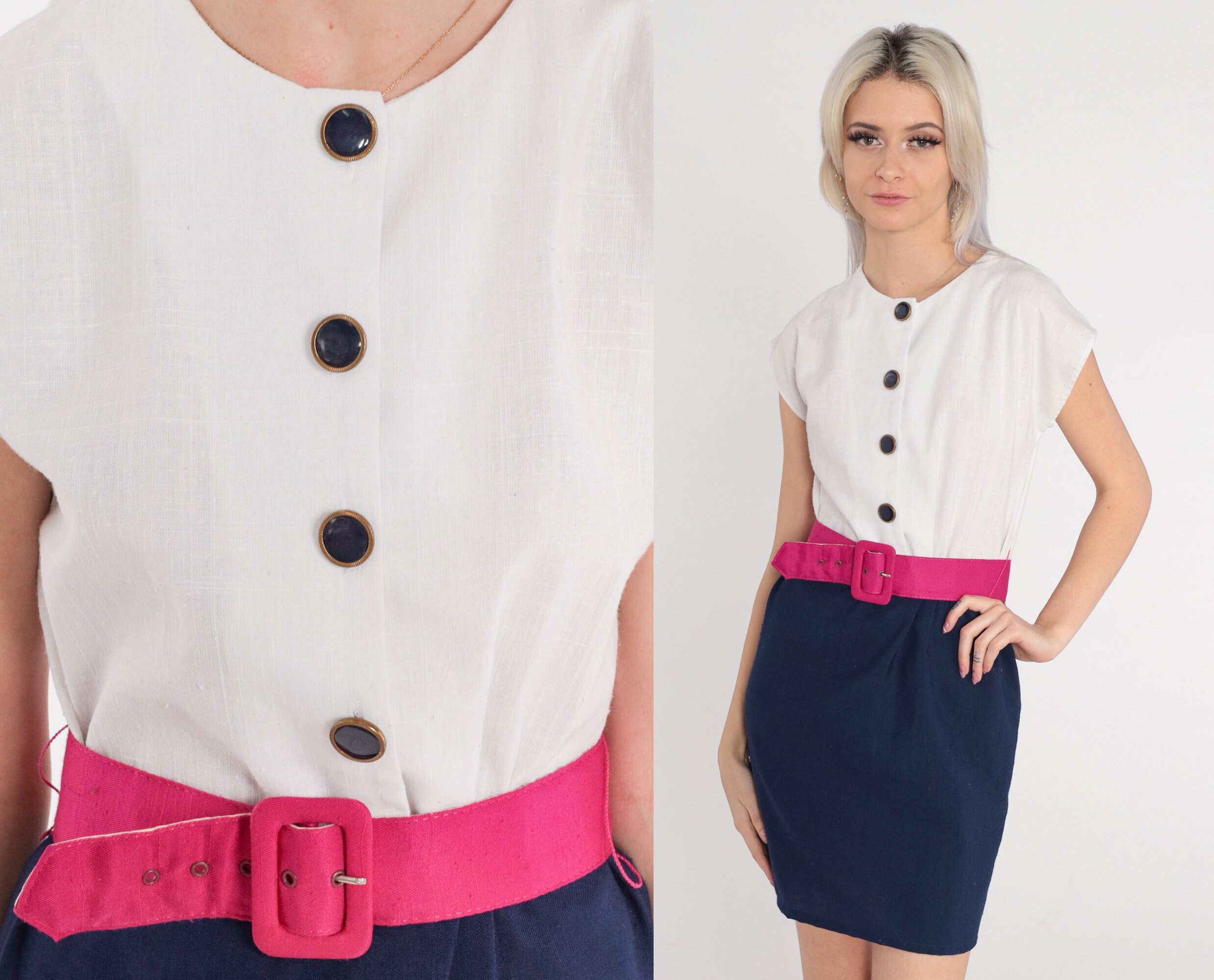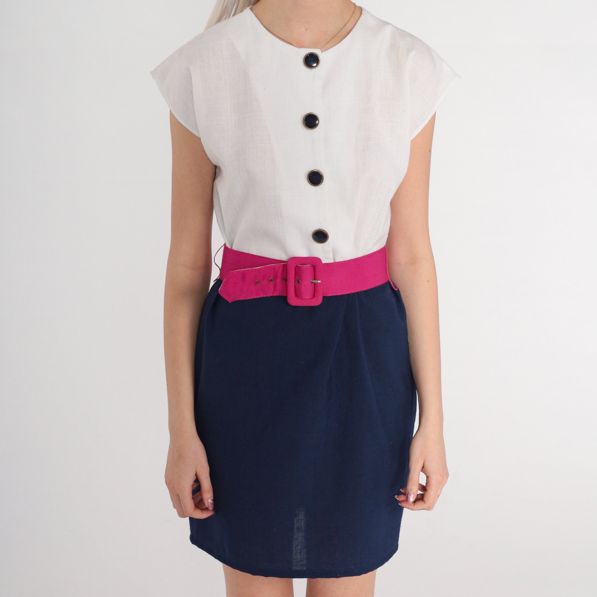 Vintage 80s dress with a white bodice, a navy blue skirt, and a pink belt. High waisted with cap sleeves, a pencil cut, and buttons up the chest. Mini length.