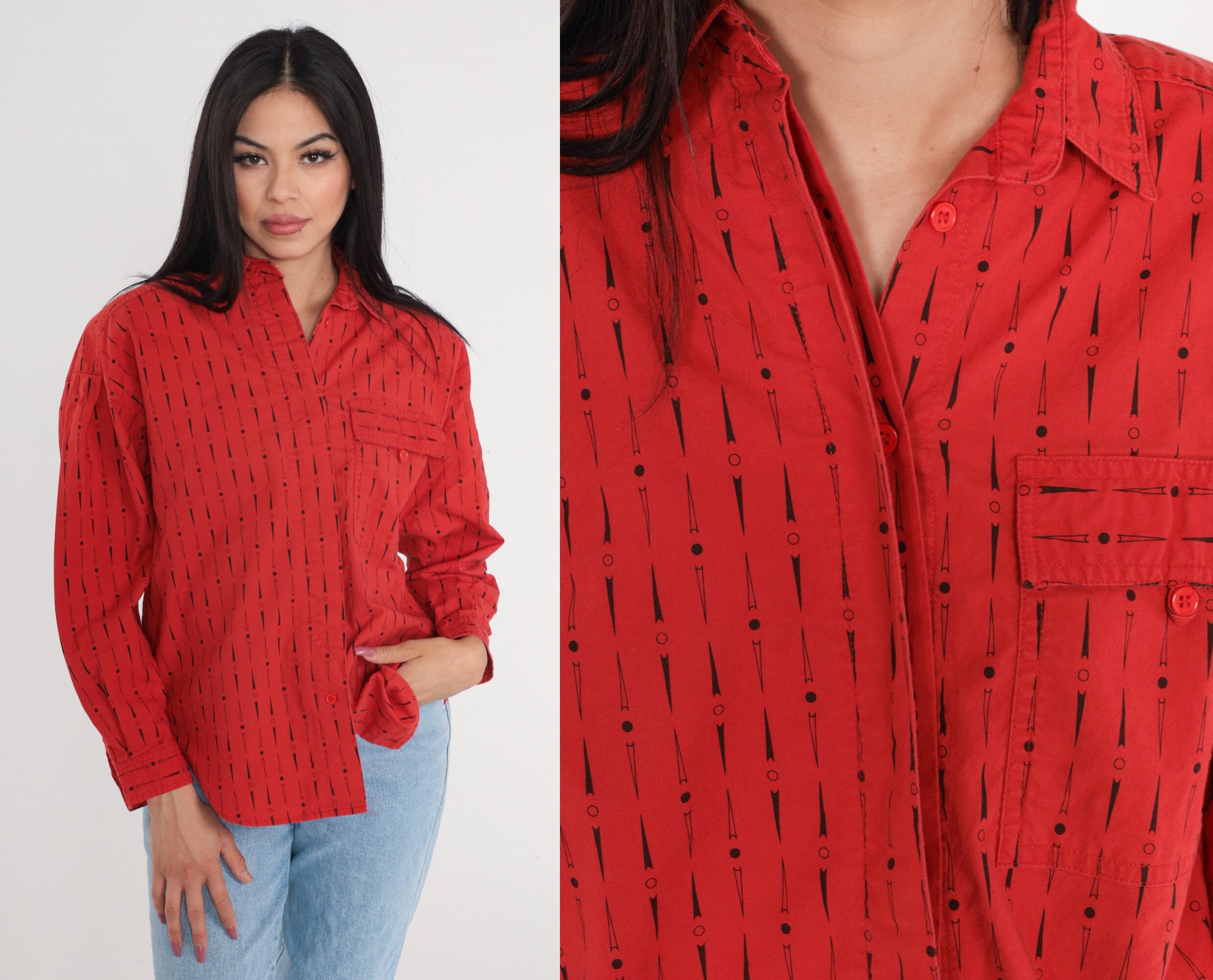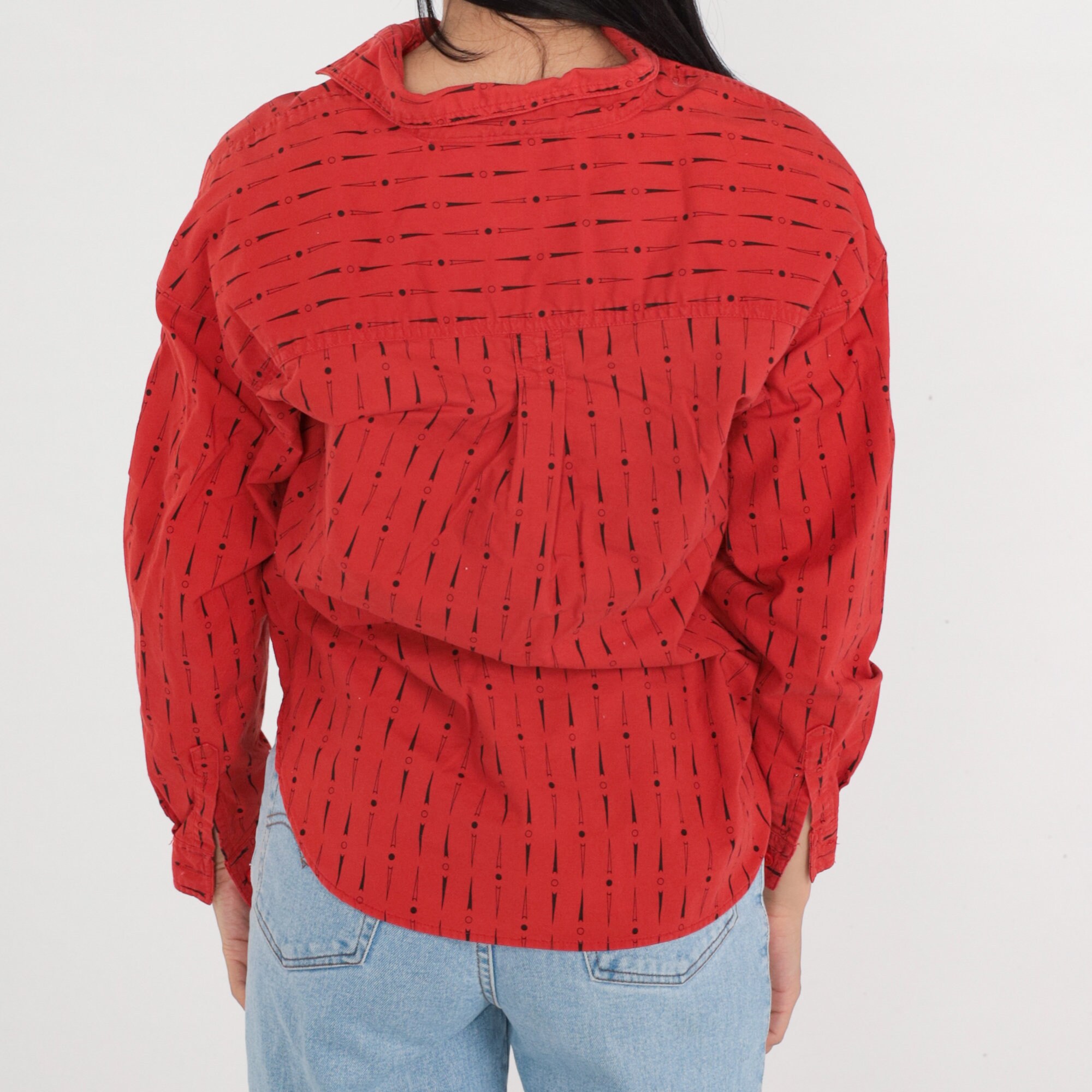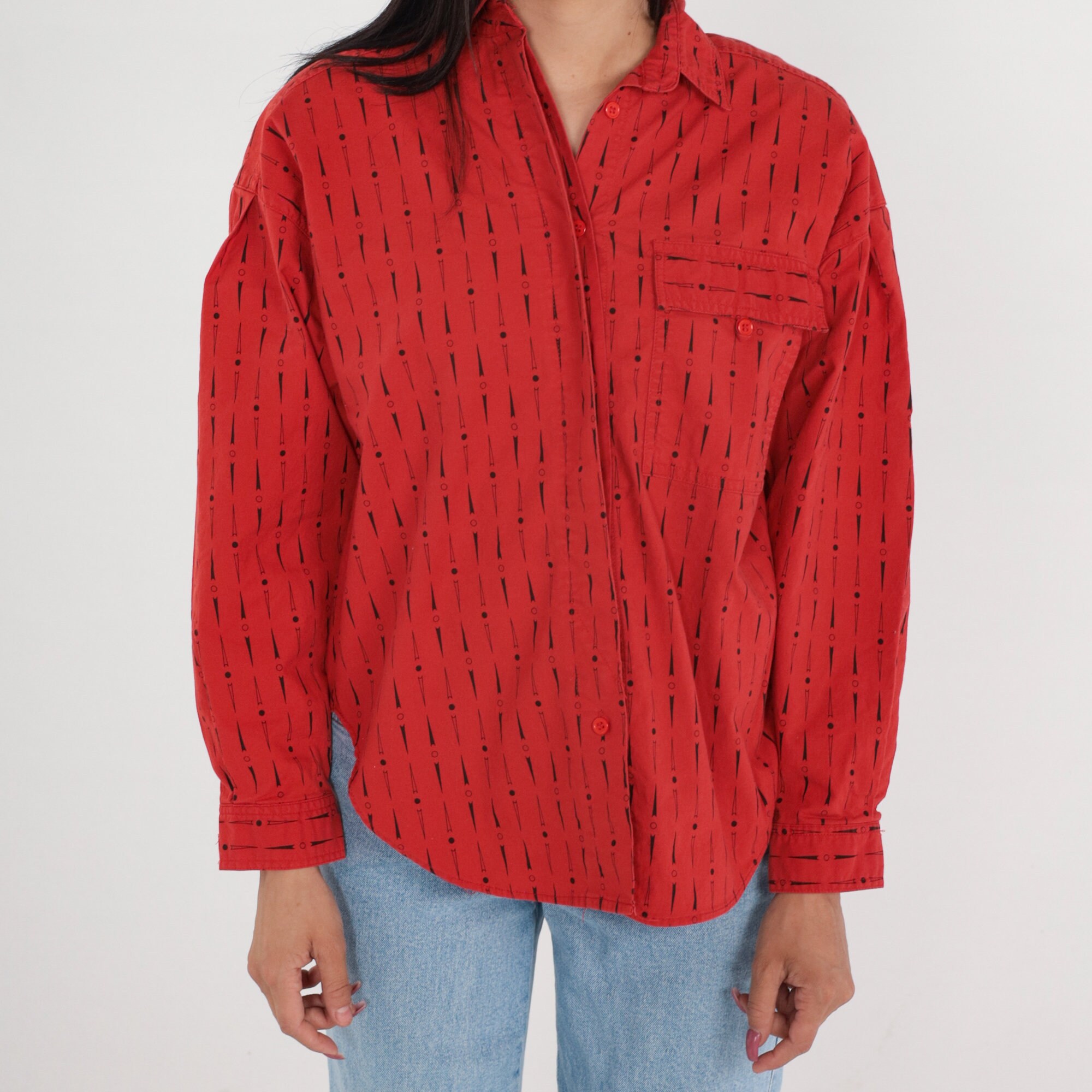 Vintage 90s shirt in red with a dot and arrow print. Long sleeves, buttons up the front.