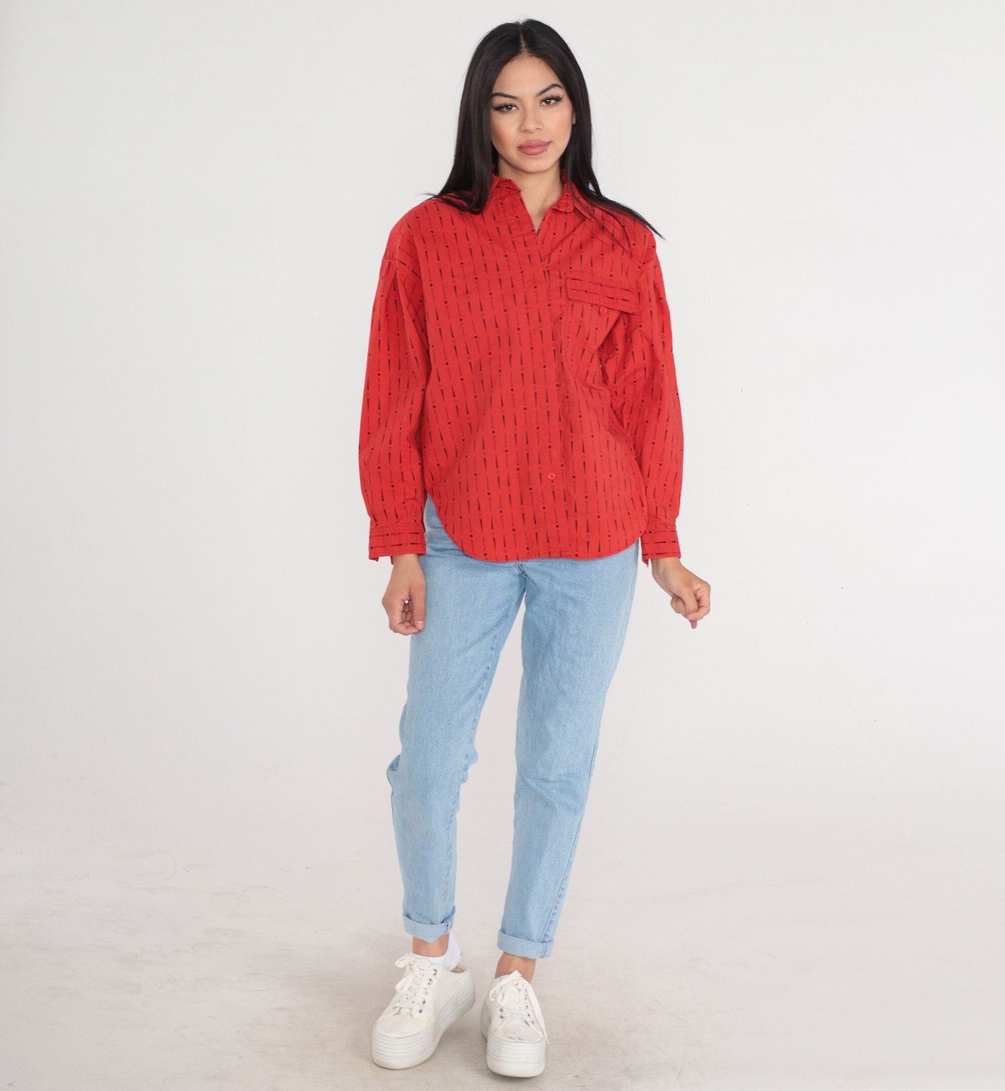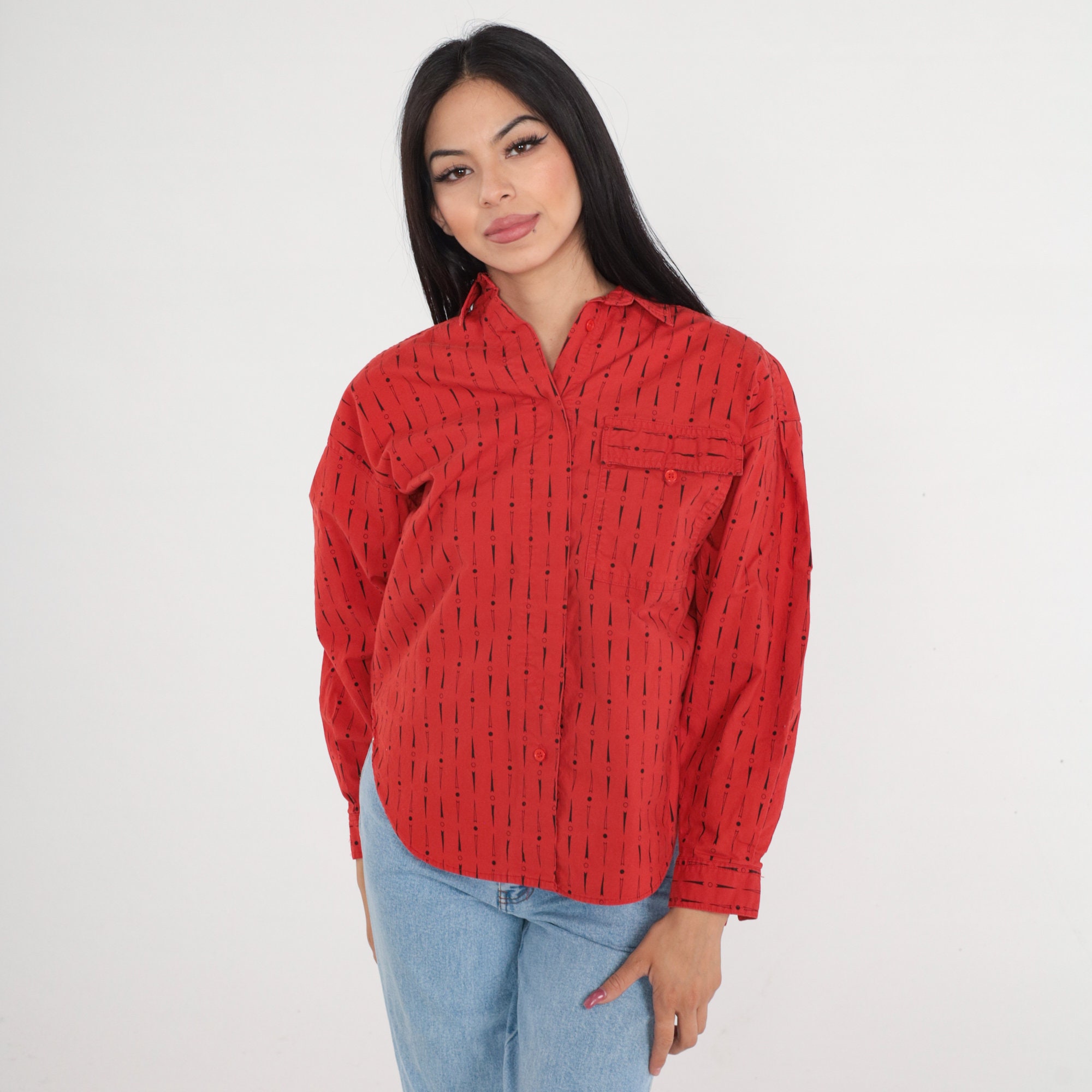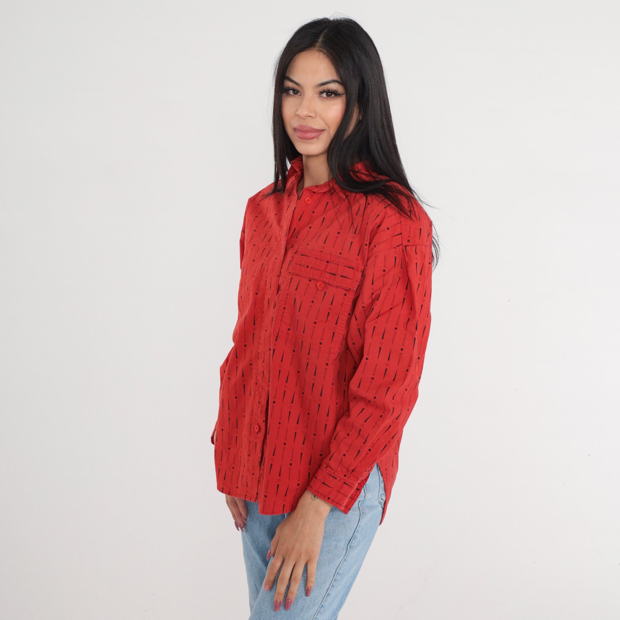 Vintage 90s shirt in red with a dot and arrow print. Long sleeves, buttons up the front.