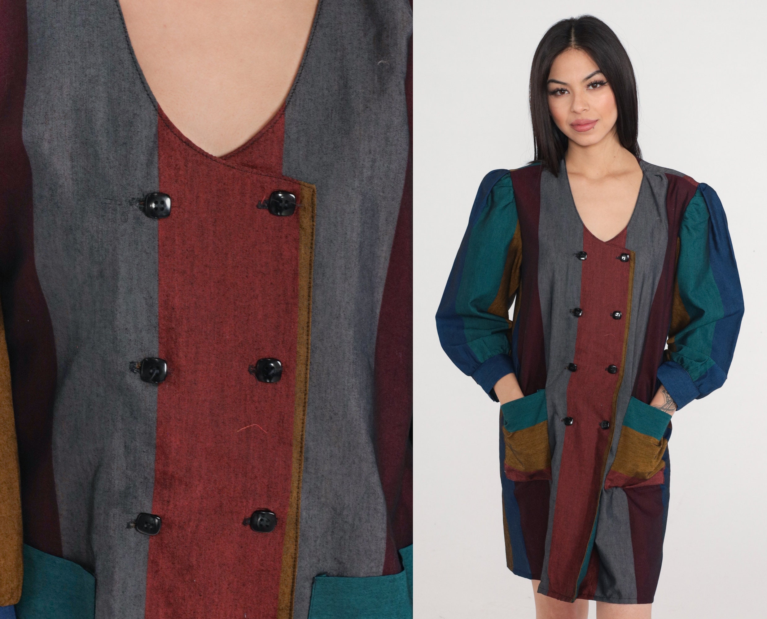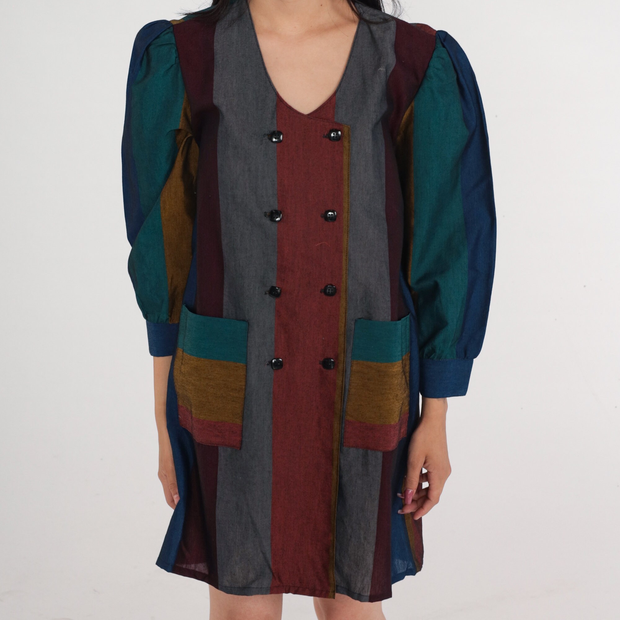 Vintage 80s dress in a striped print. It has a shift cut with puff sleeves and double breasted buttons down the front. Mini length.