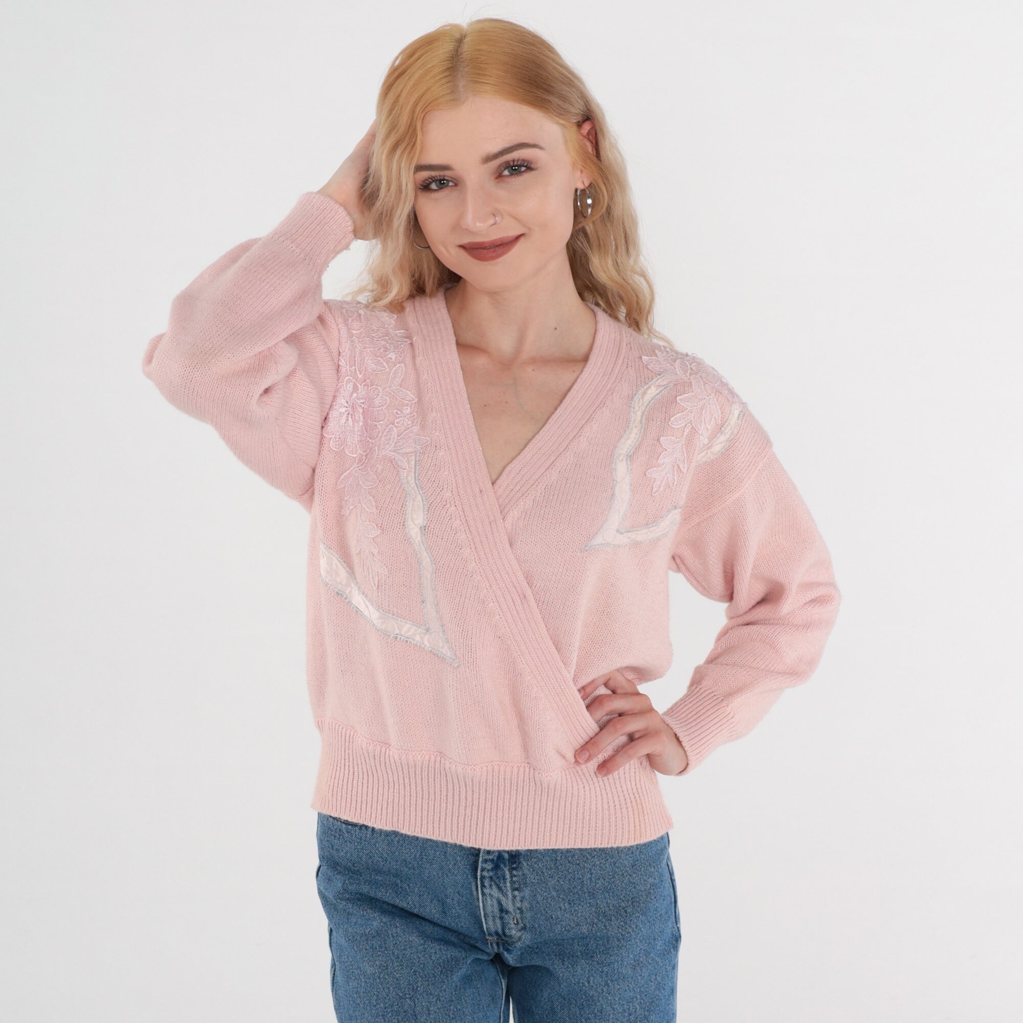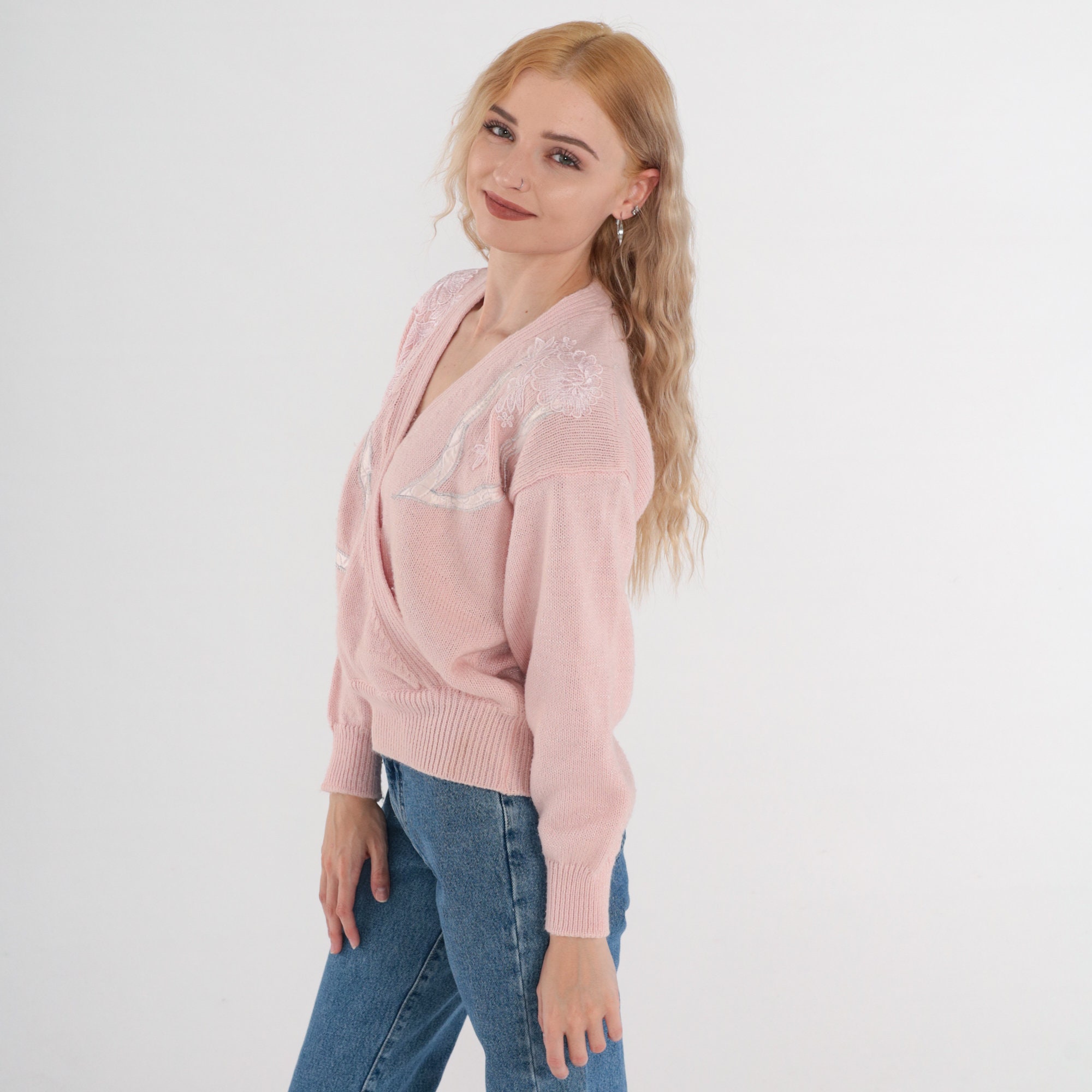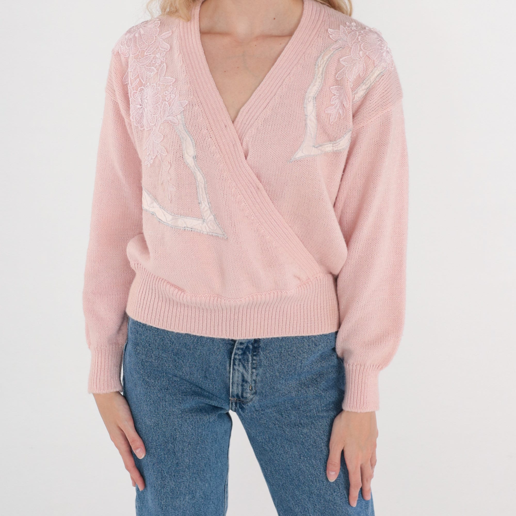 Vintage 80s 90s sweater in pink with a floral applique and embroidered design. Faux wrap cut with a slouchy fit and a v neck.