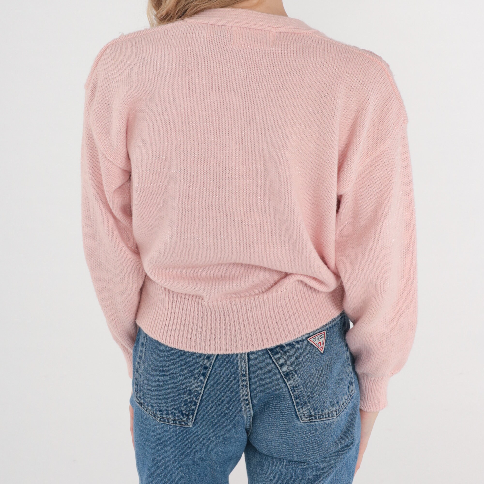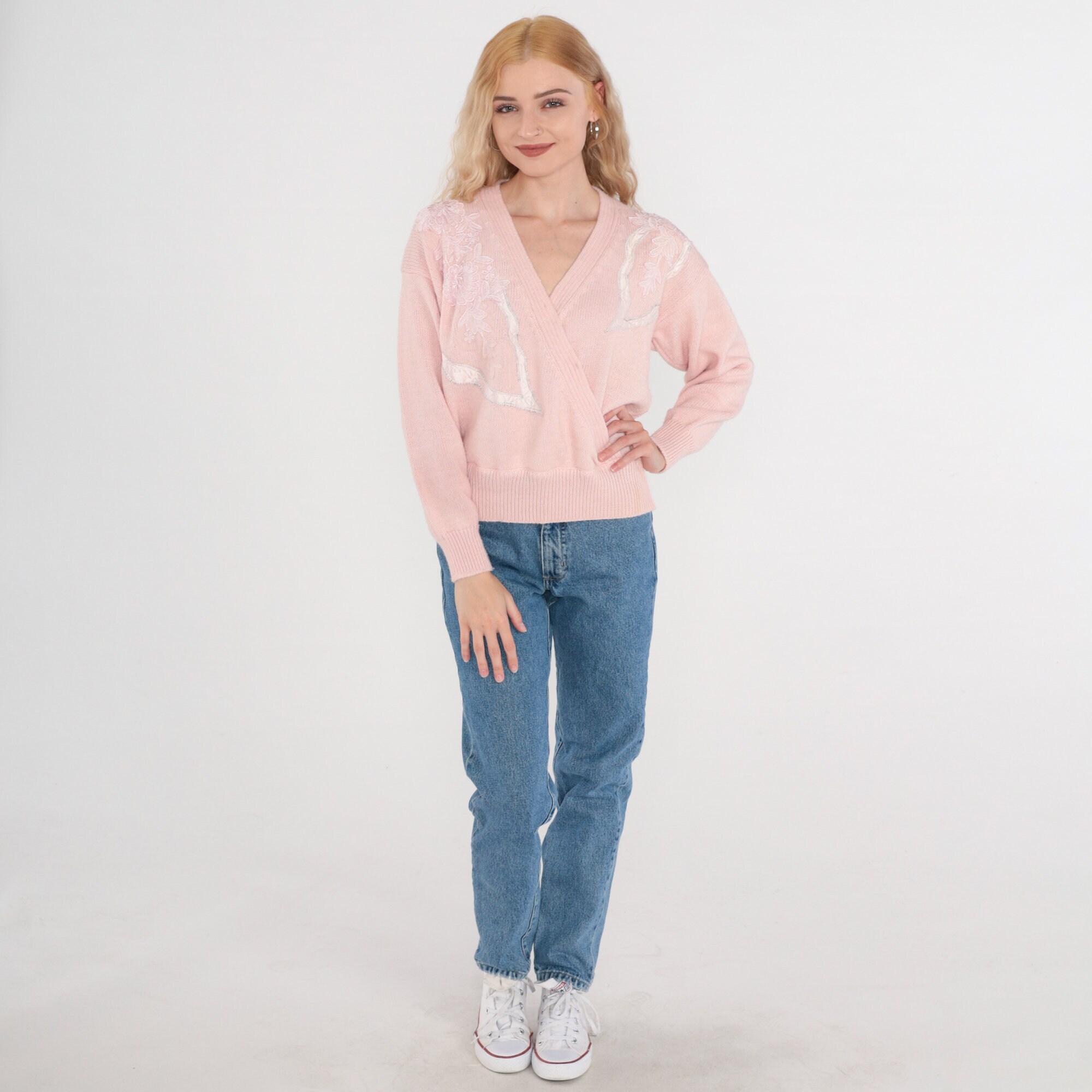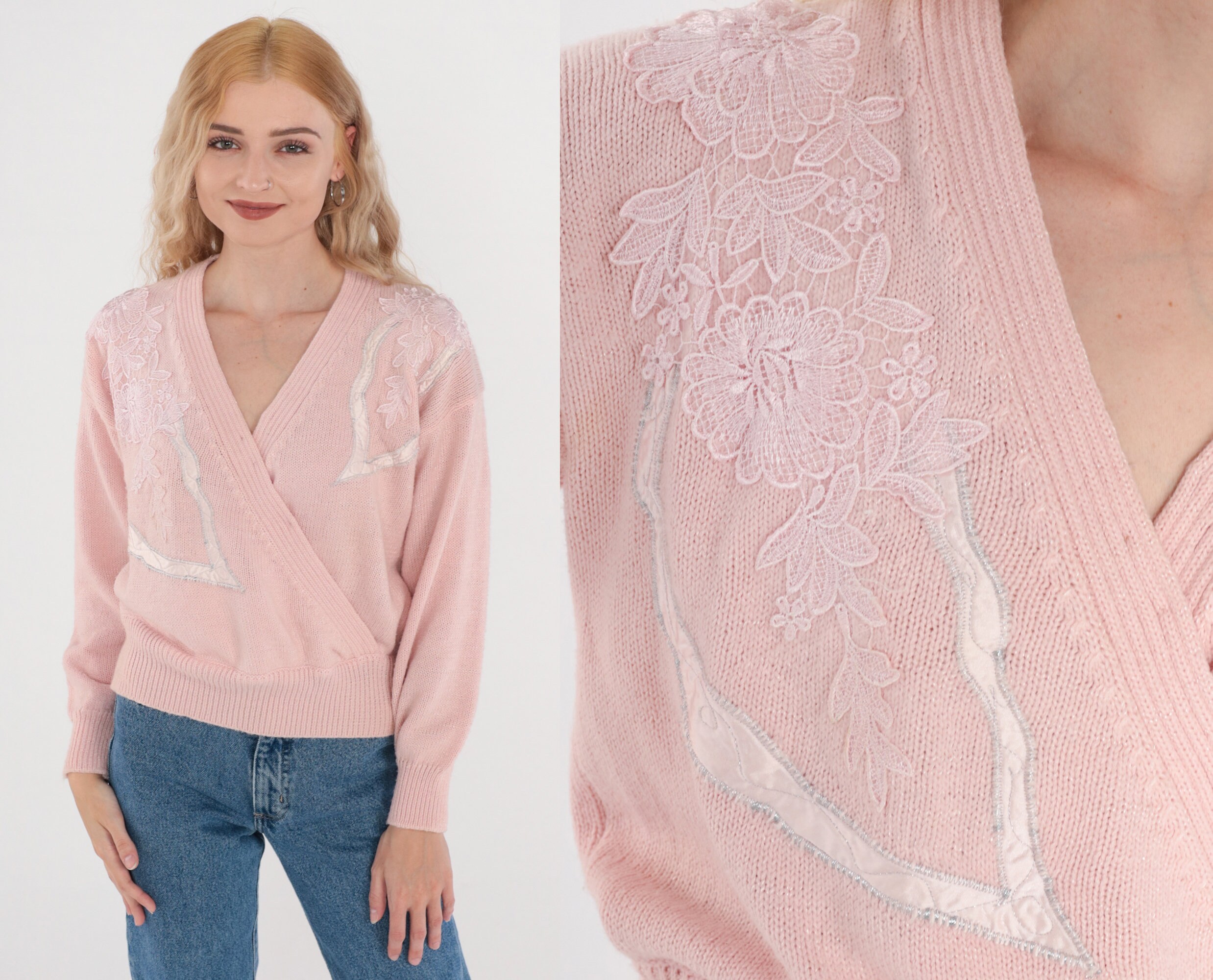 Vintage 80s 90s sweater in pink with a floral applique and embroidered design. Faux wrap cut with a slouchy fit and a v neck.