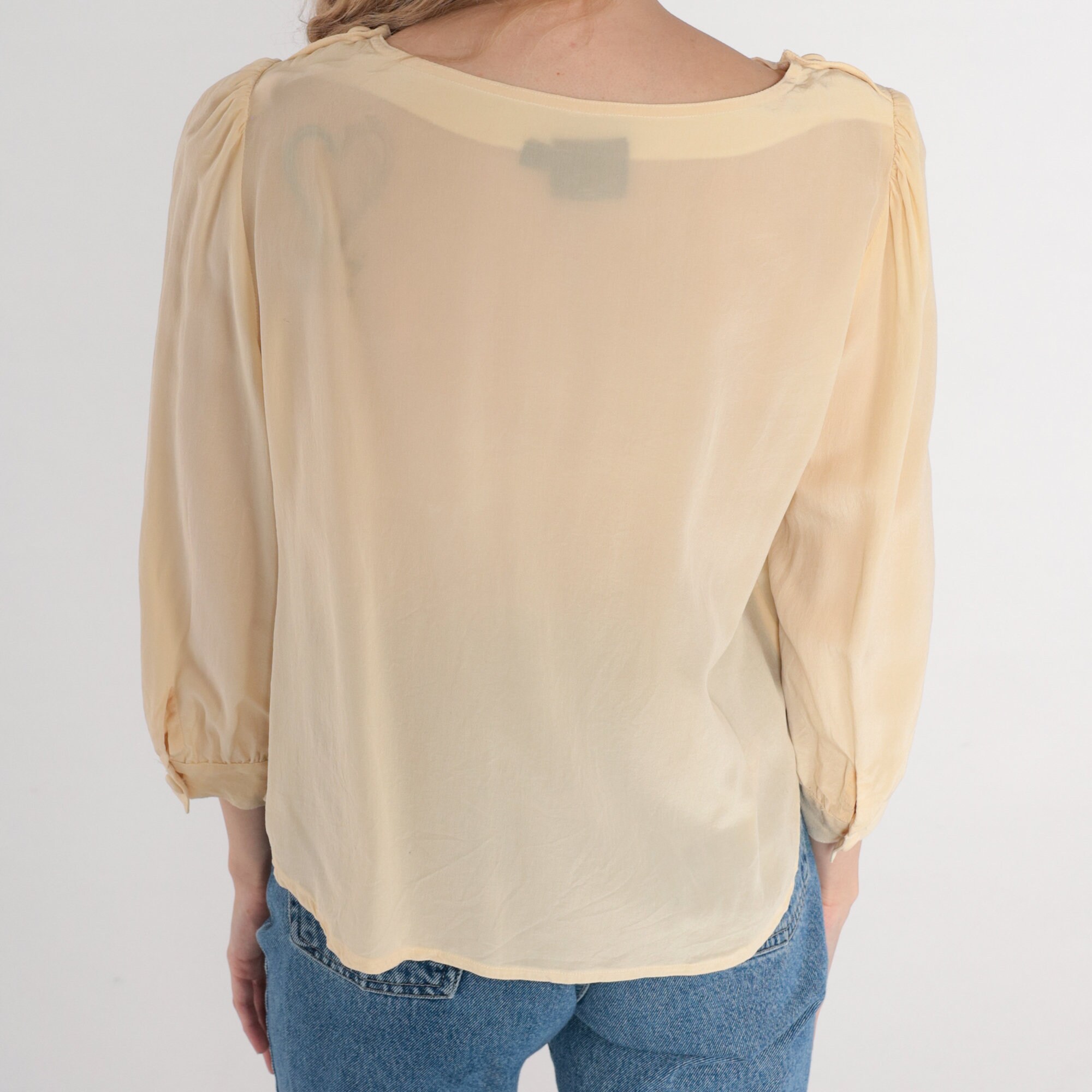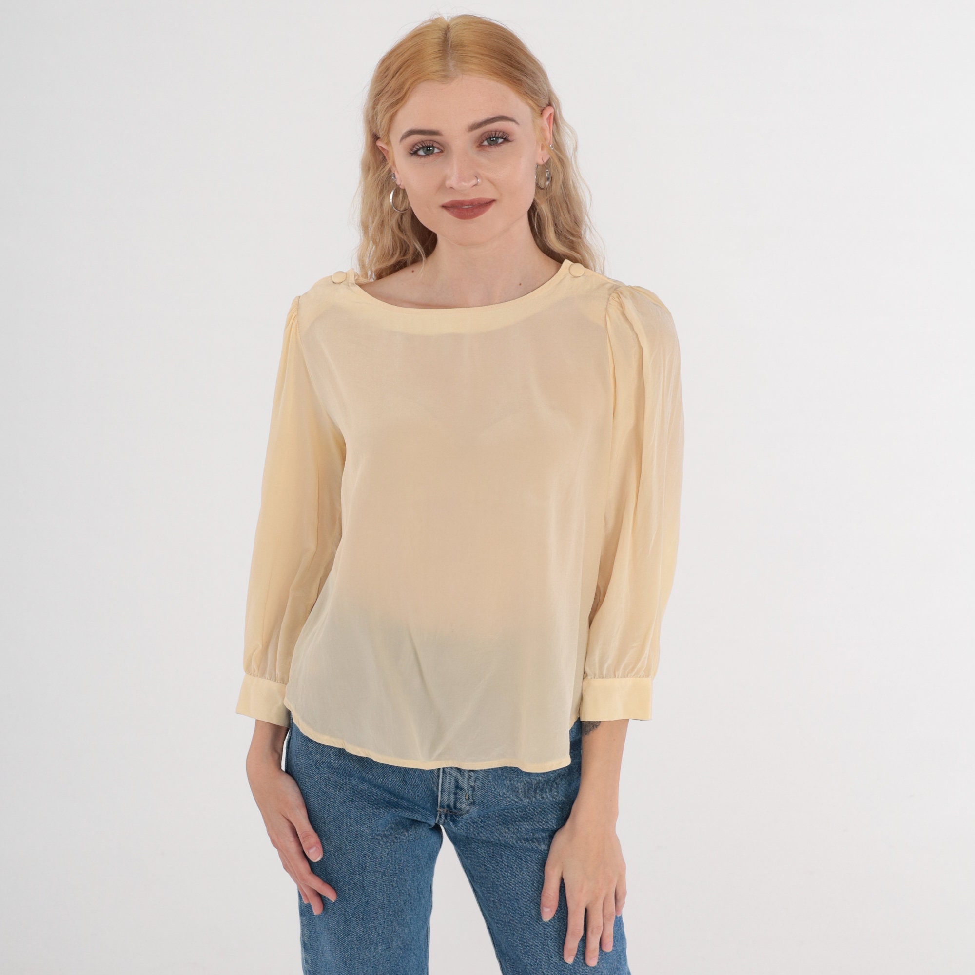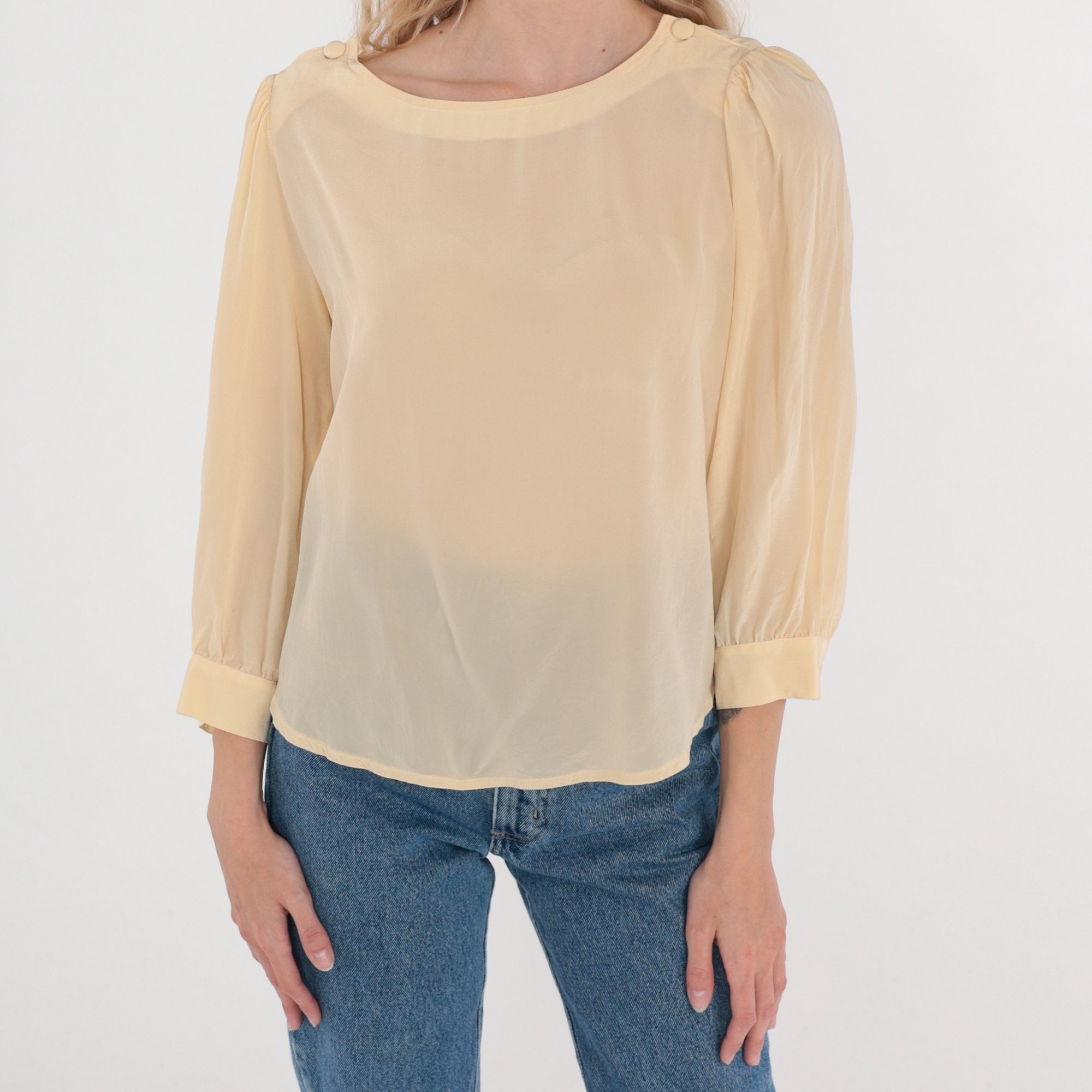 Vintage 80s shirt in Semi-Sheer cream silk with 3/4 puff sleeves and button shoulders.