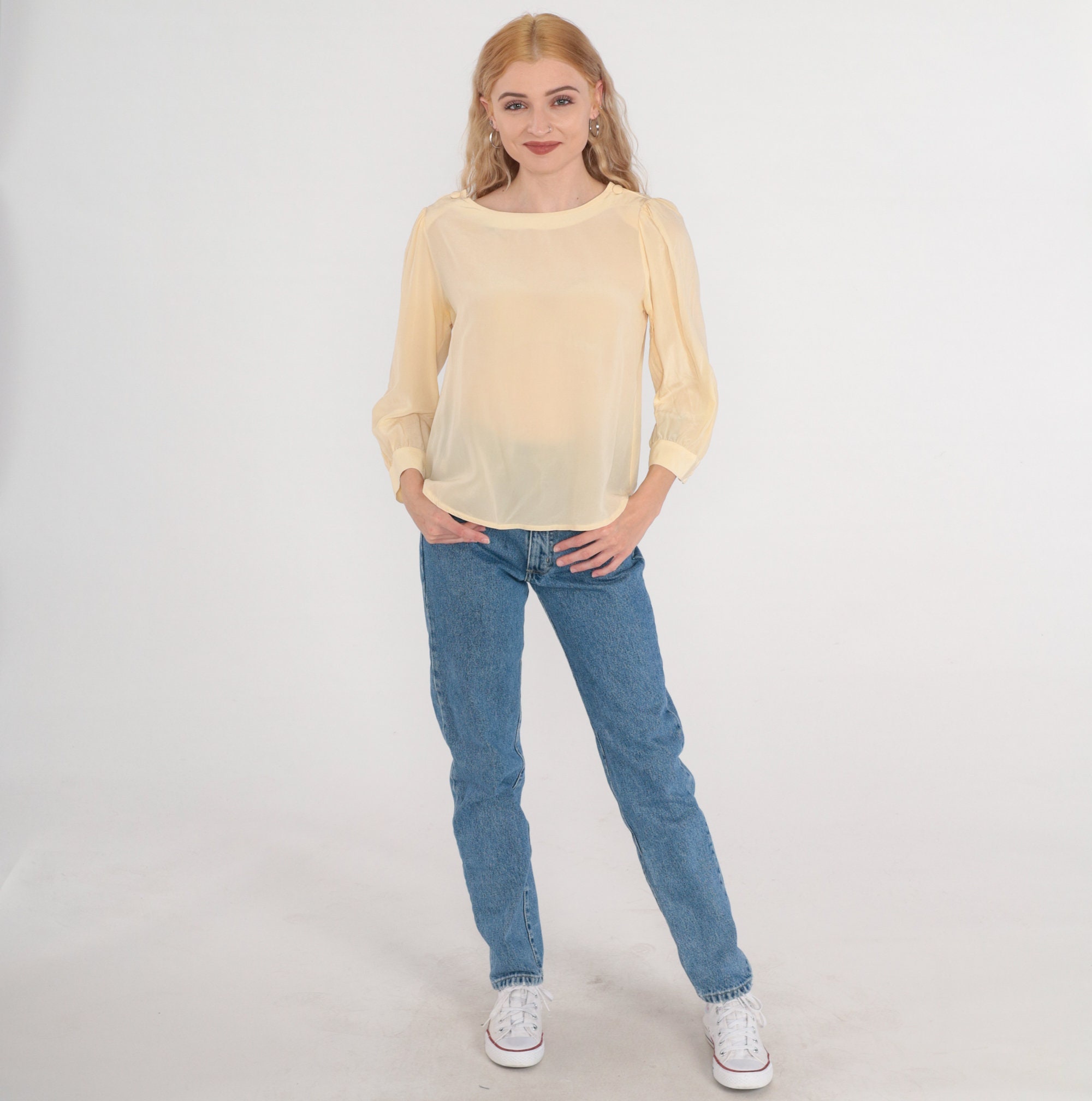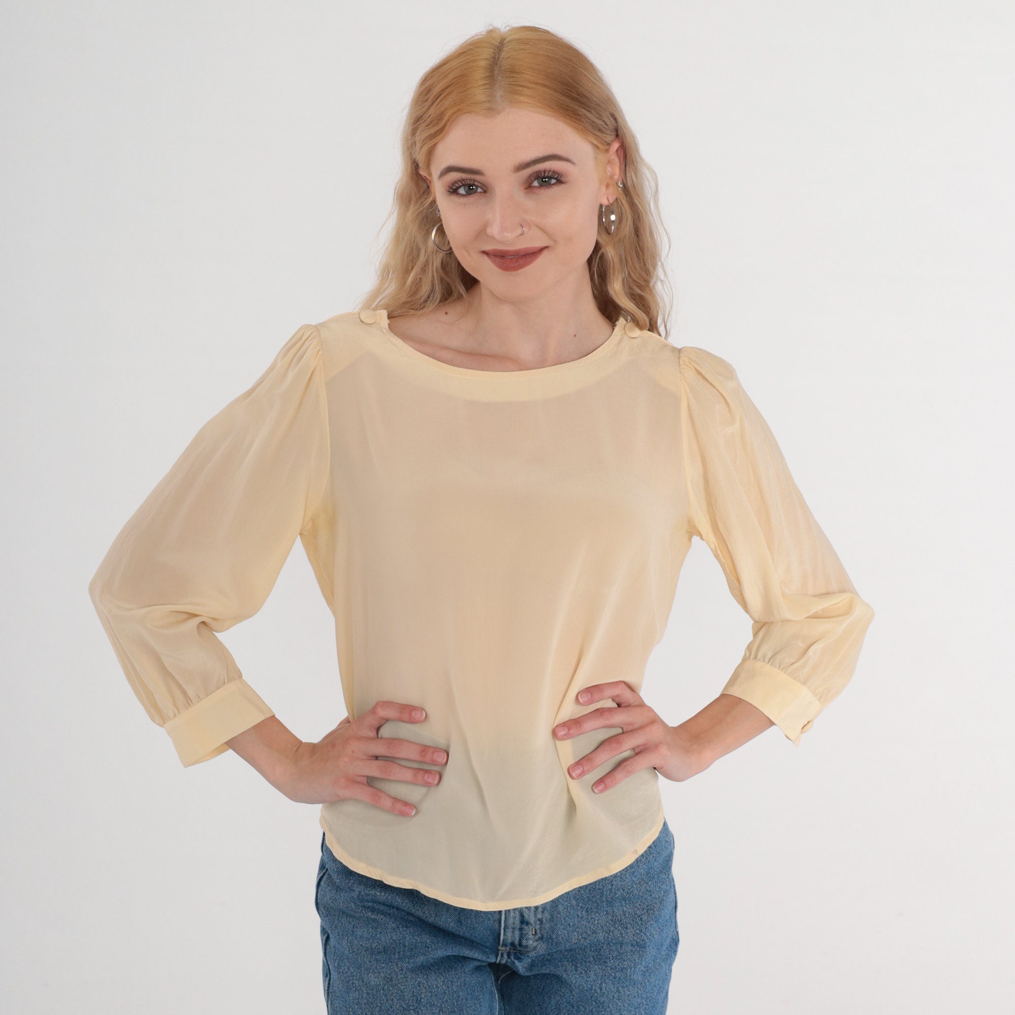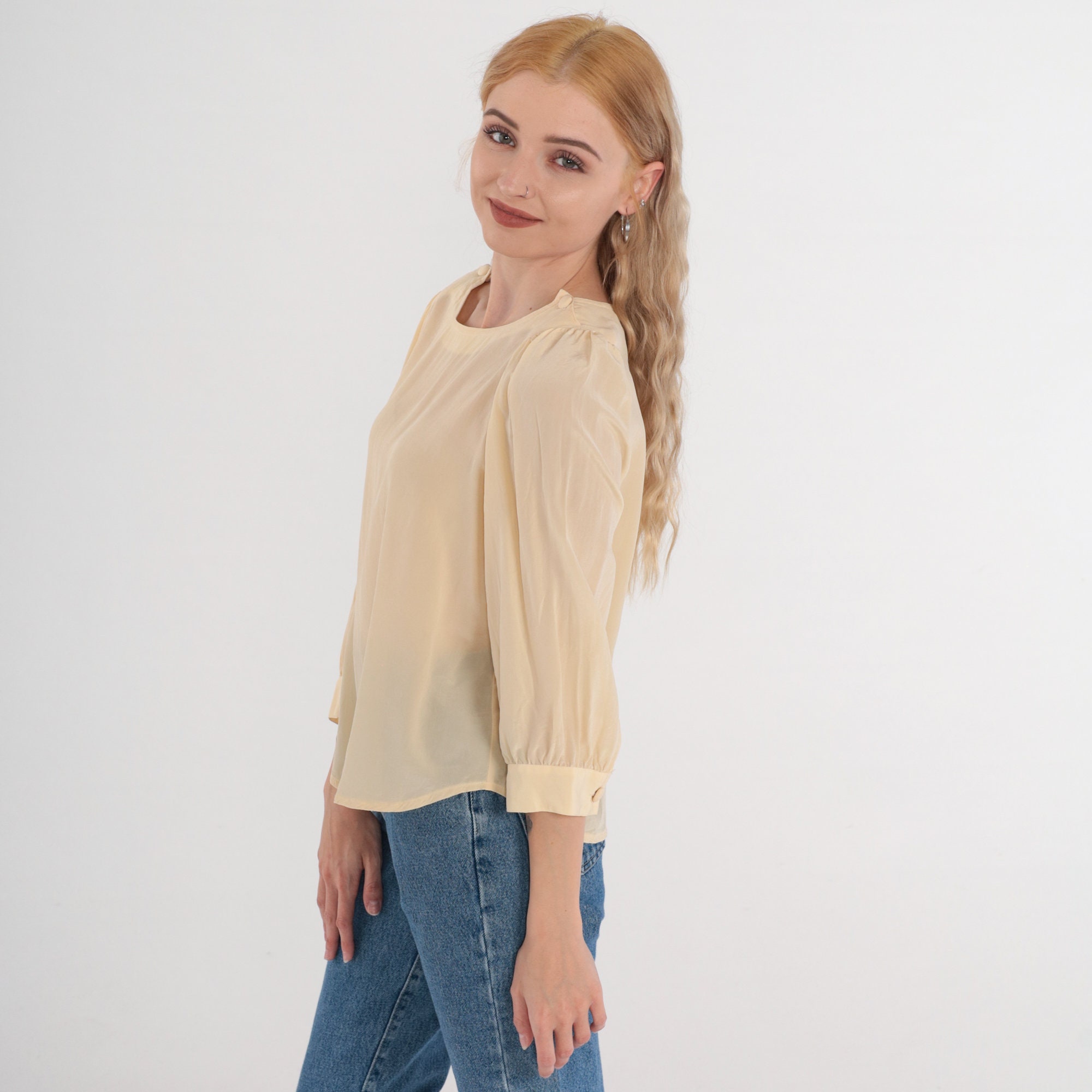 Vintage 80s shirt in Semi-Sheer cream silk with 3/4 puff sleeves and button shoulders.