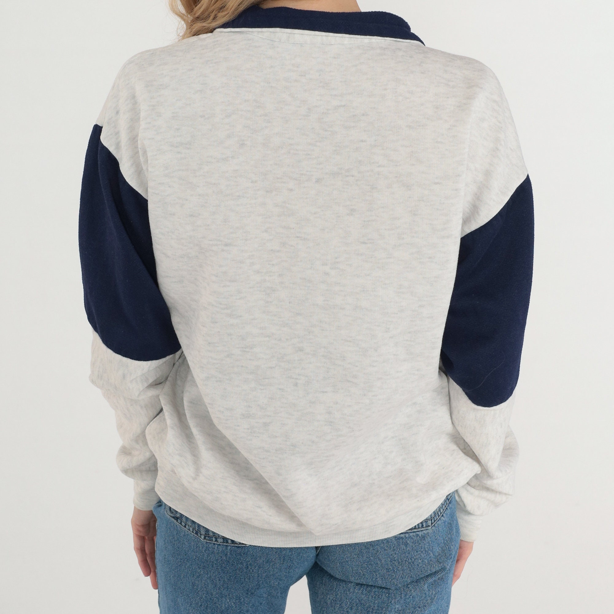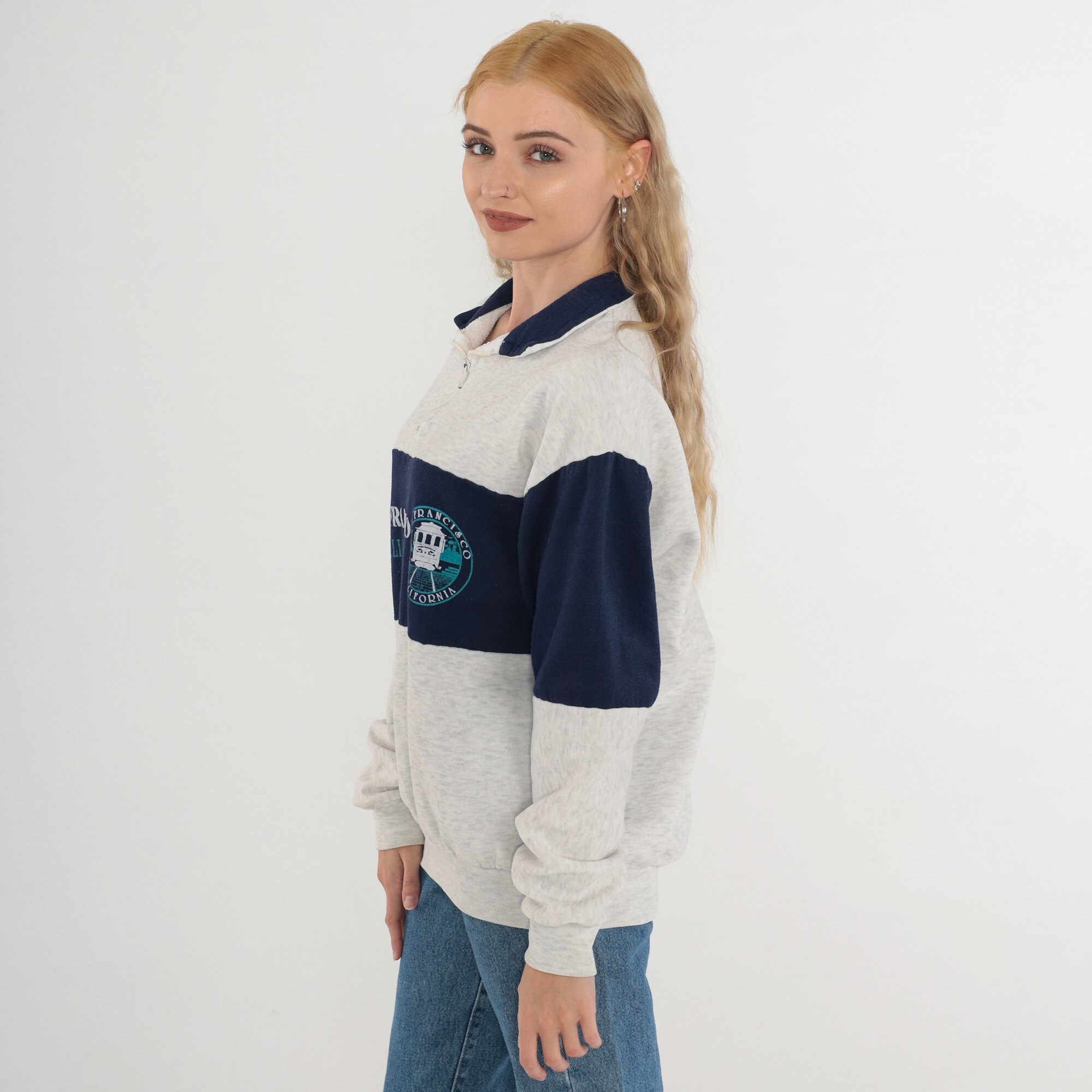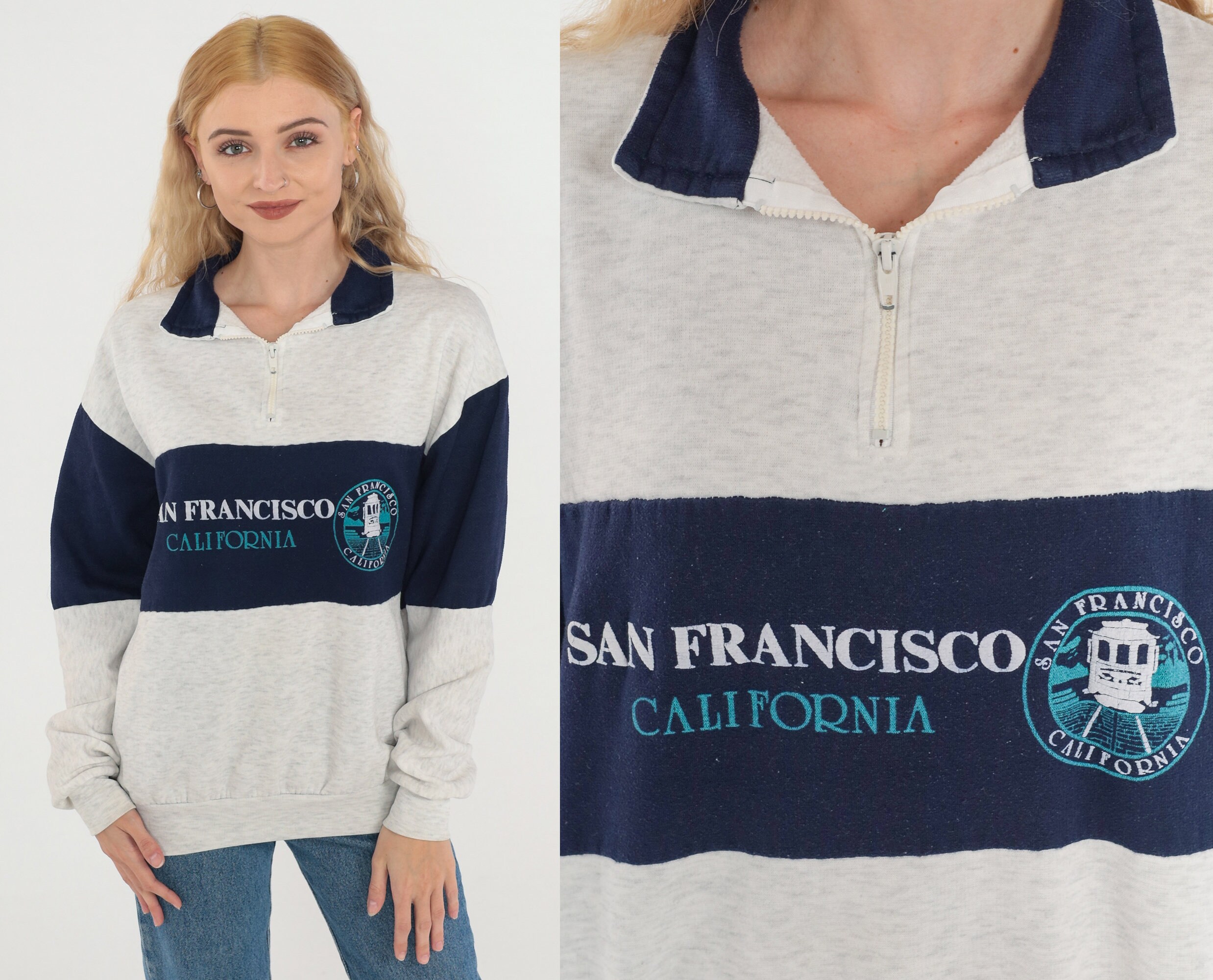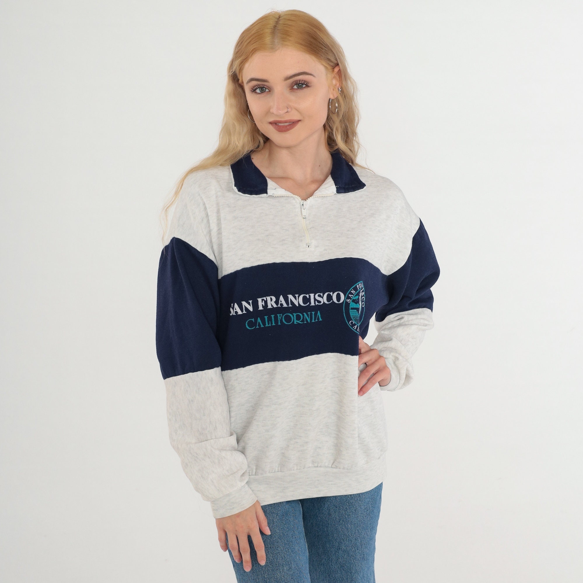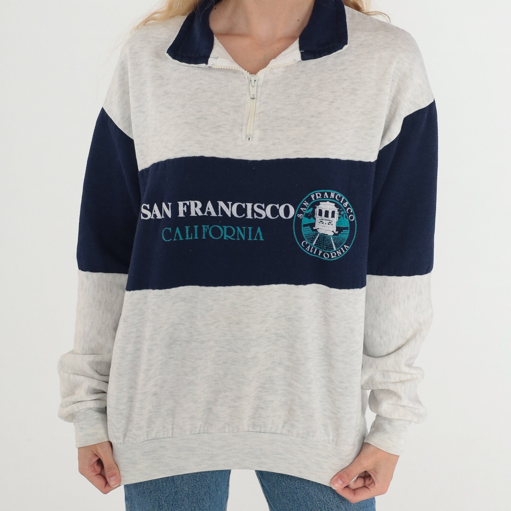 Vintage 90s sweatshirt in heather grey with a San Francisco, California logo on the chest. Blue stripes and a quarter zip.