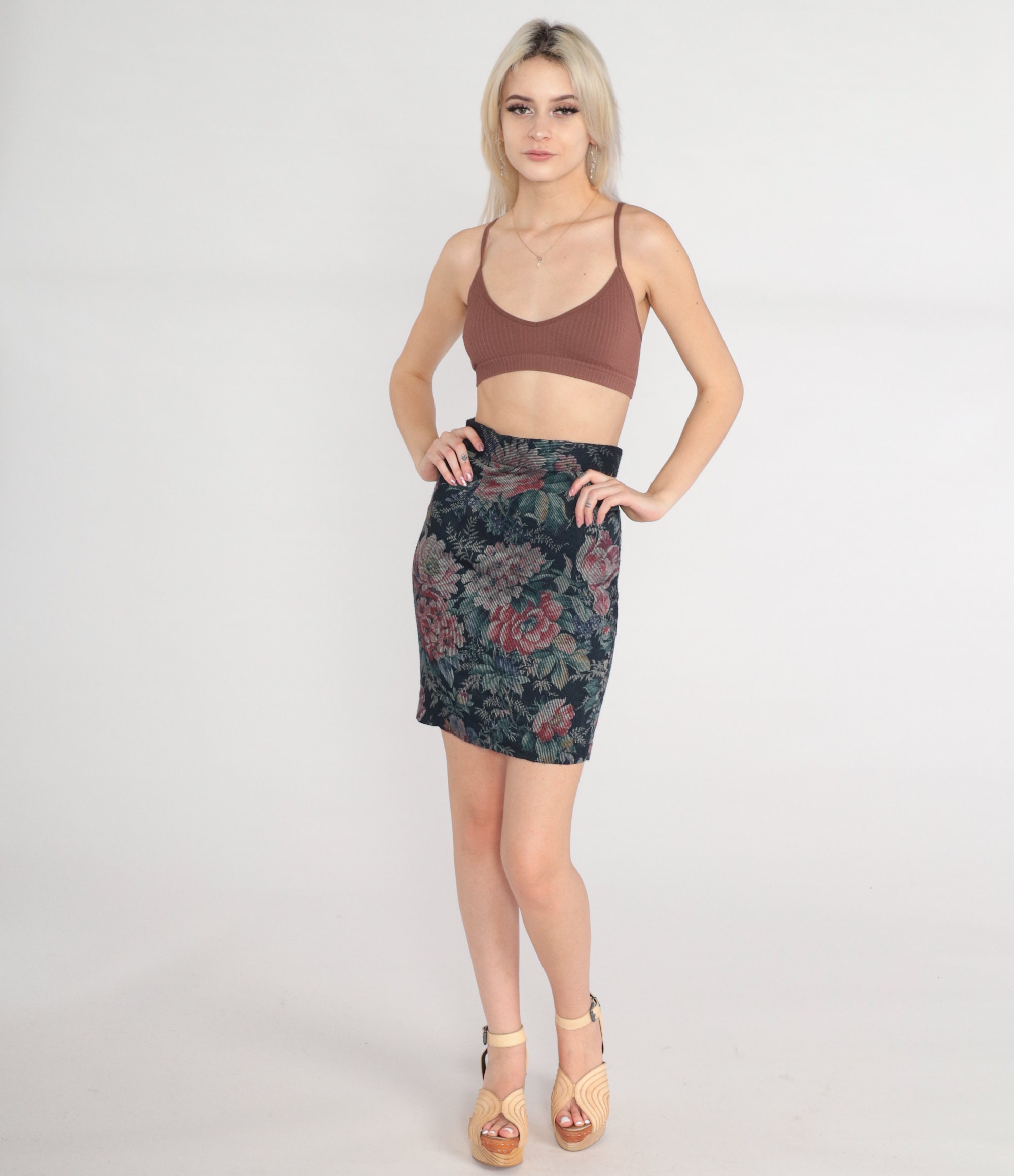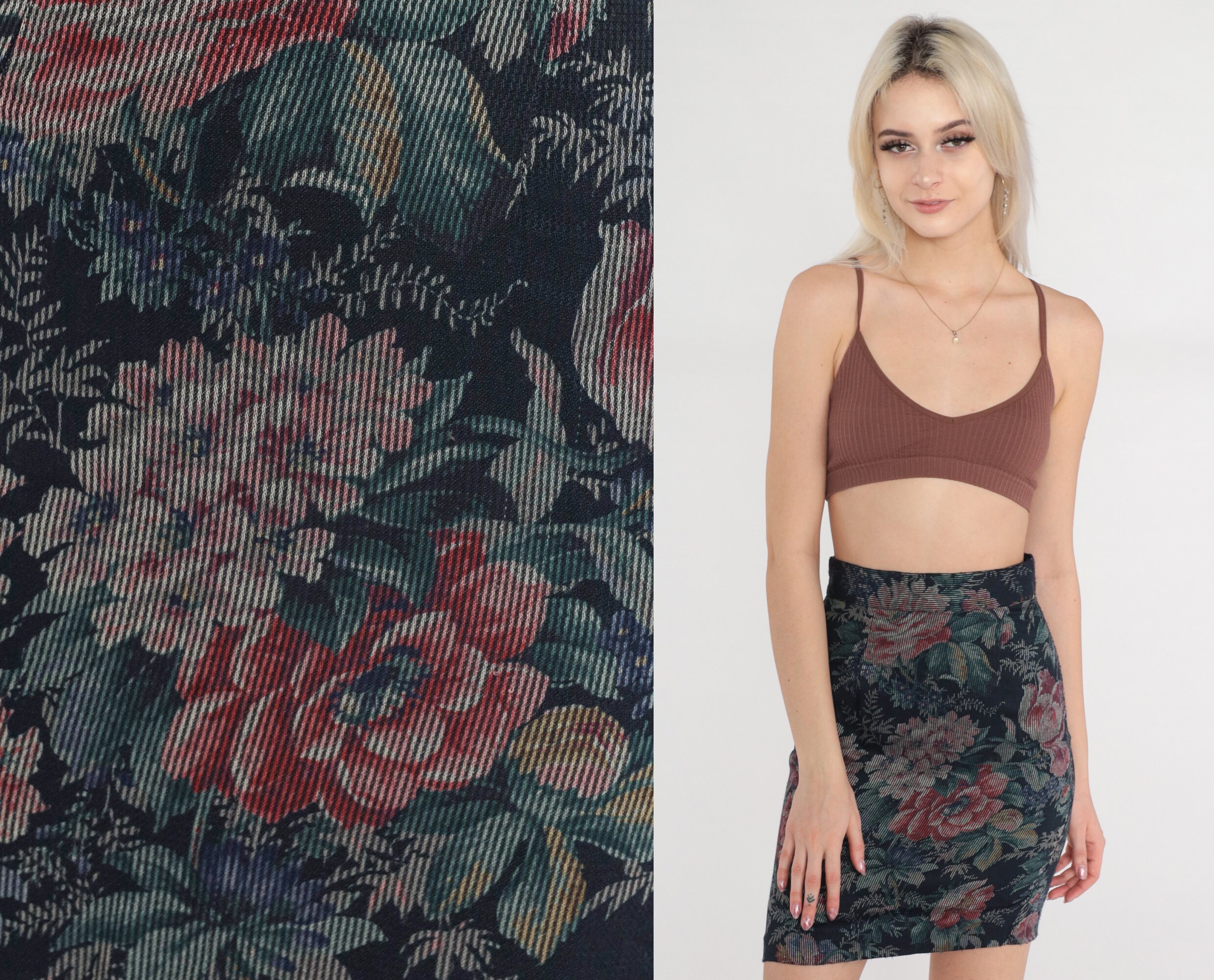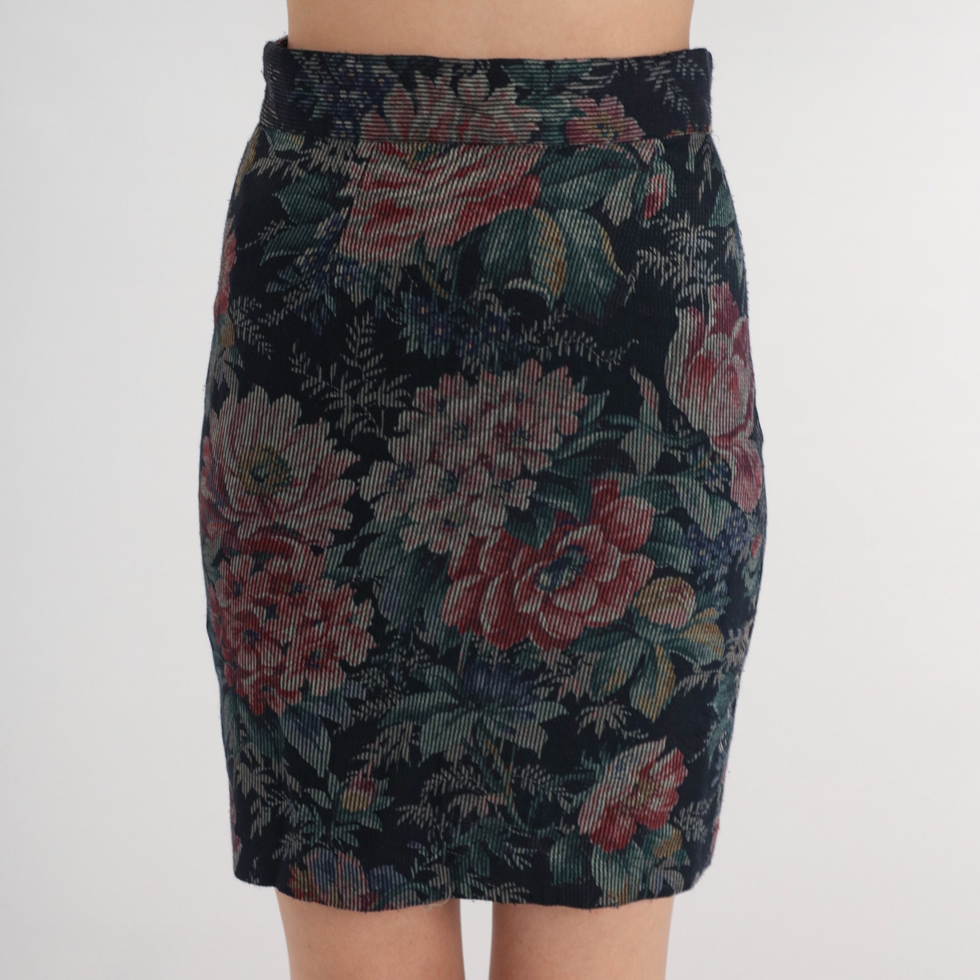 Vintage 80s skirt in navy blue corduroy with a floral print. High waisted with a pencil cut. Mini length.