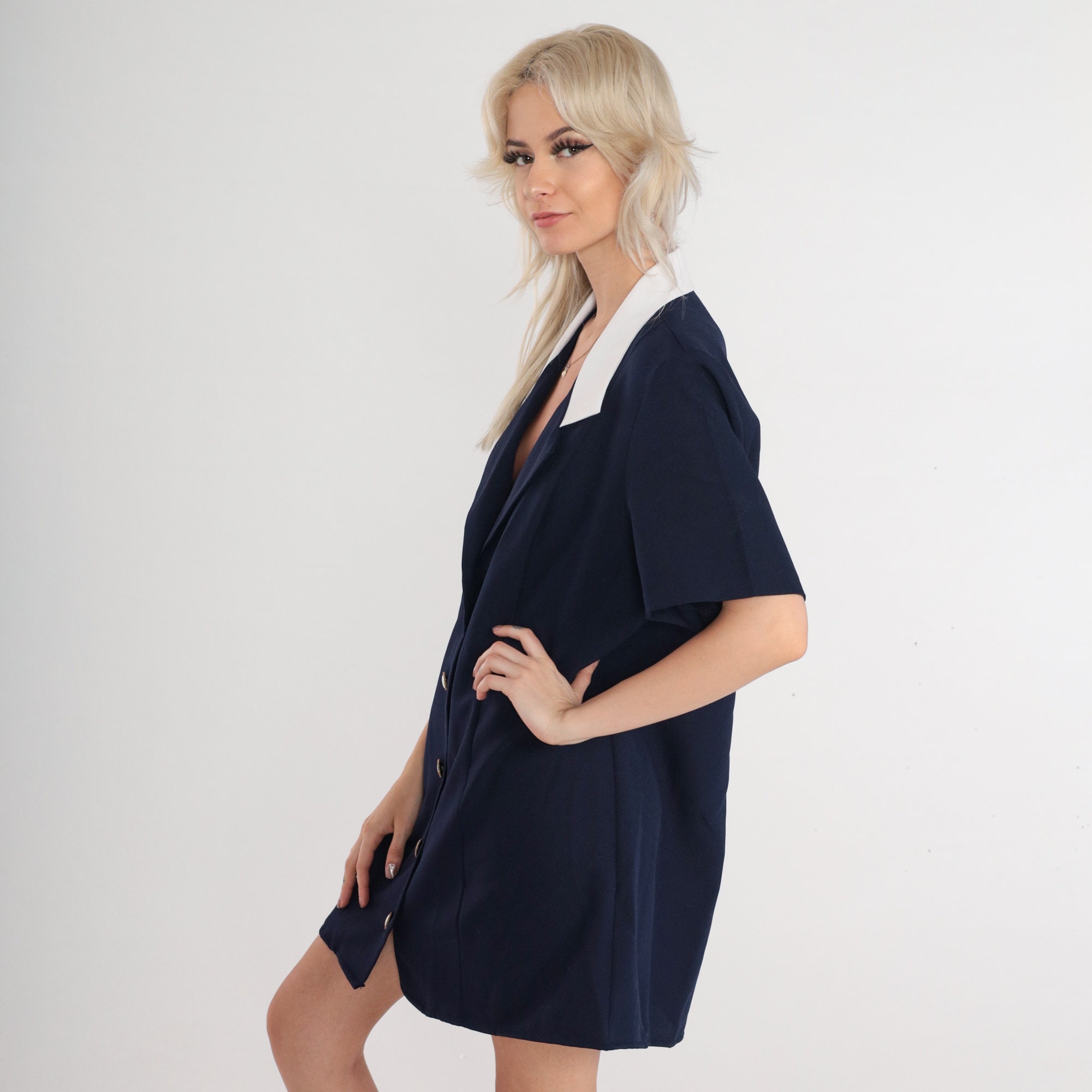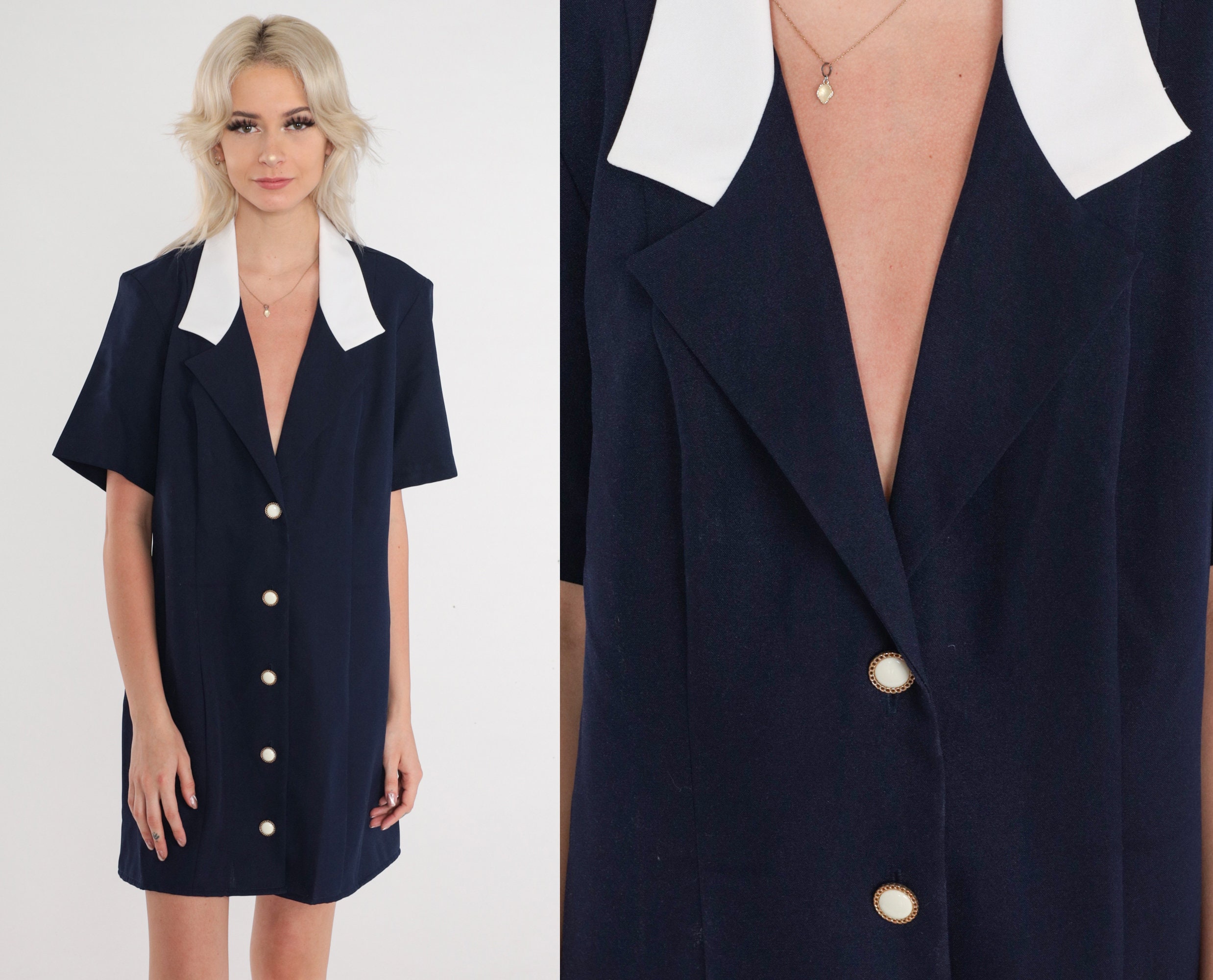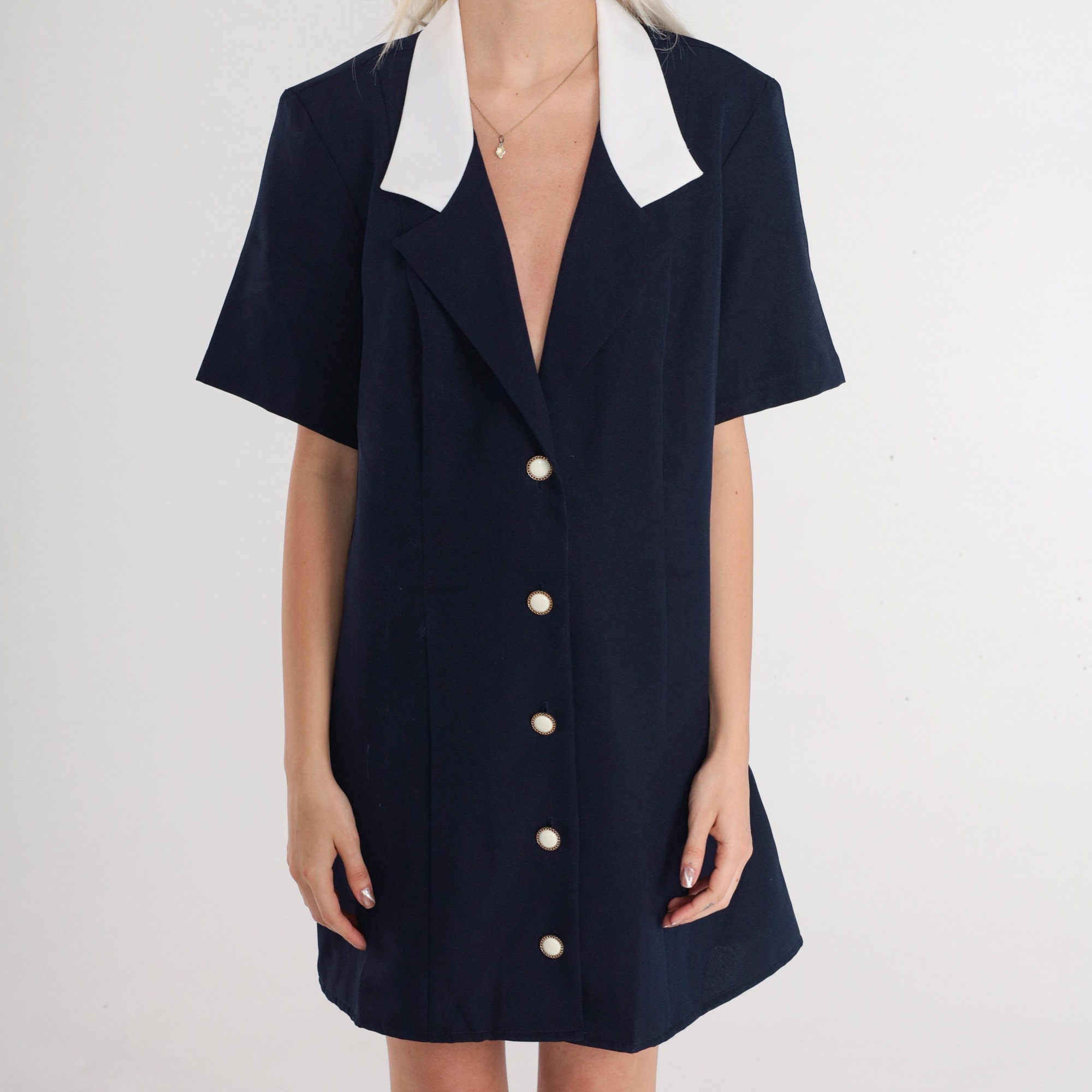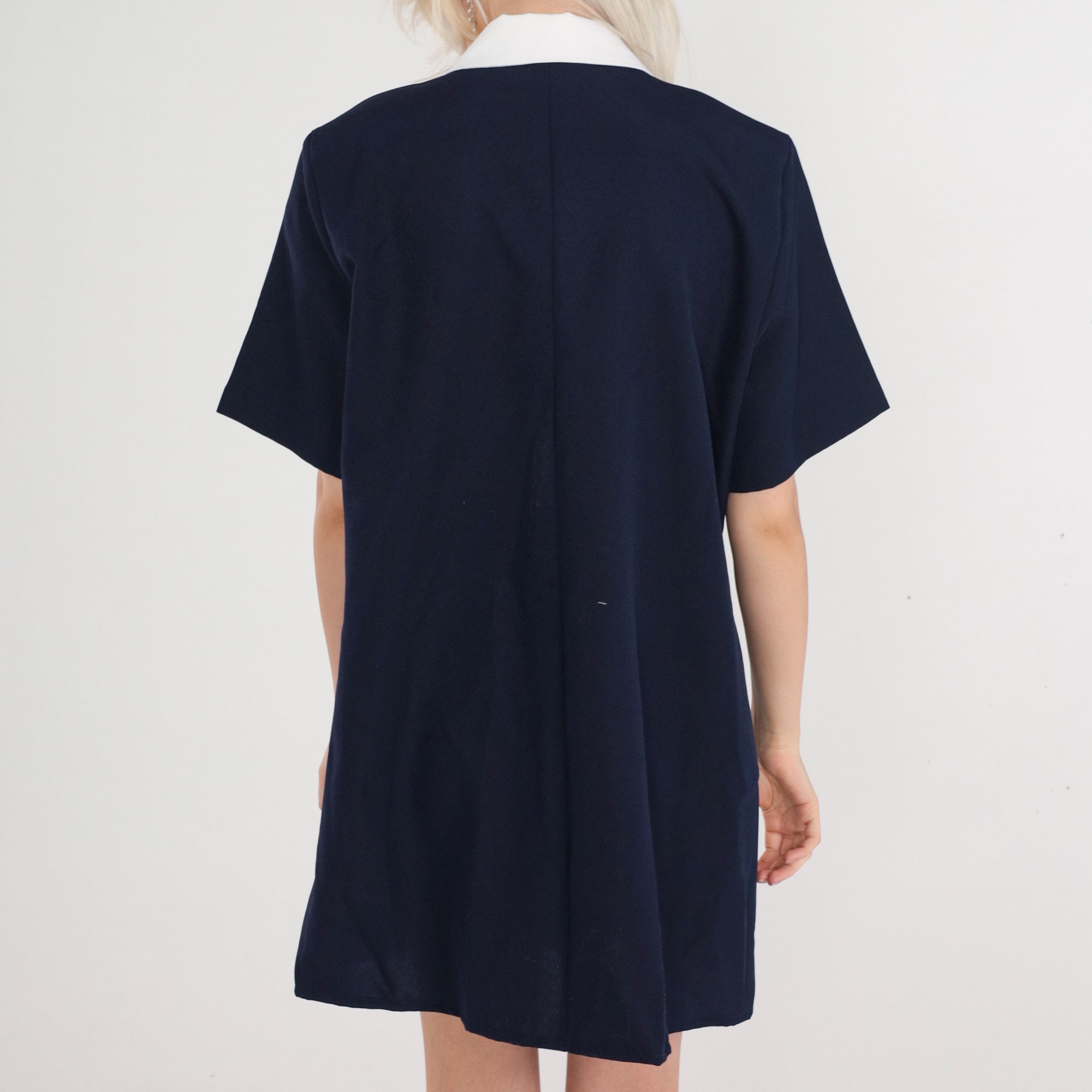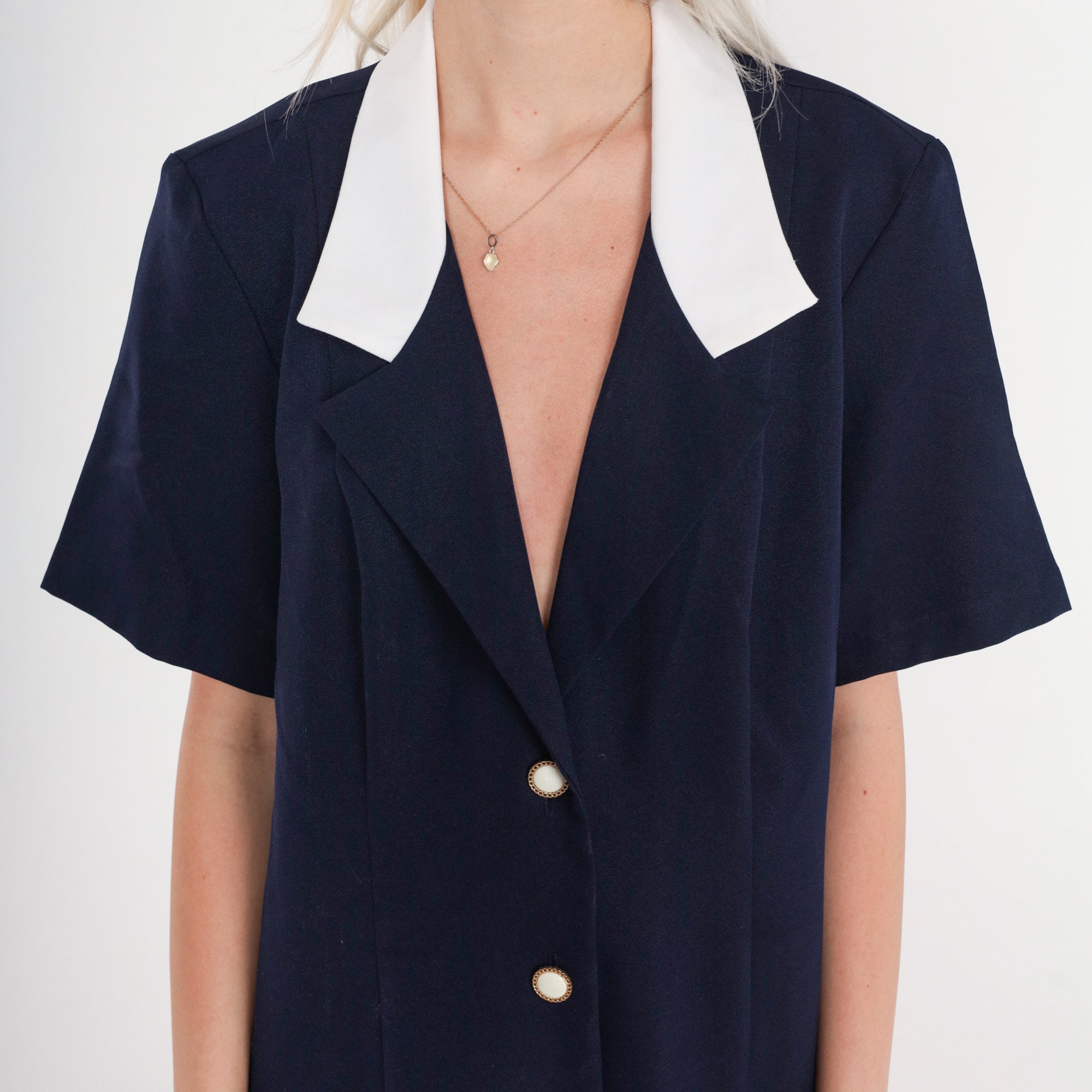 Vintage 80s dress in navy blue with white trim. Short sleeves with a collar and buttons up the front.