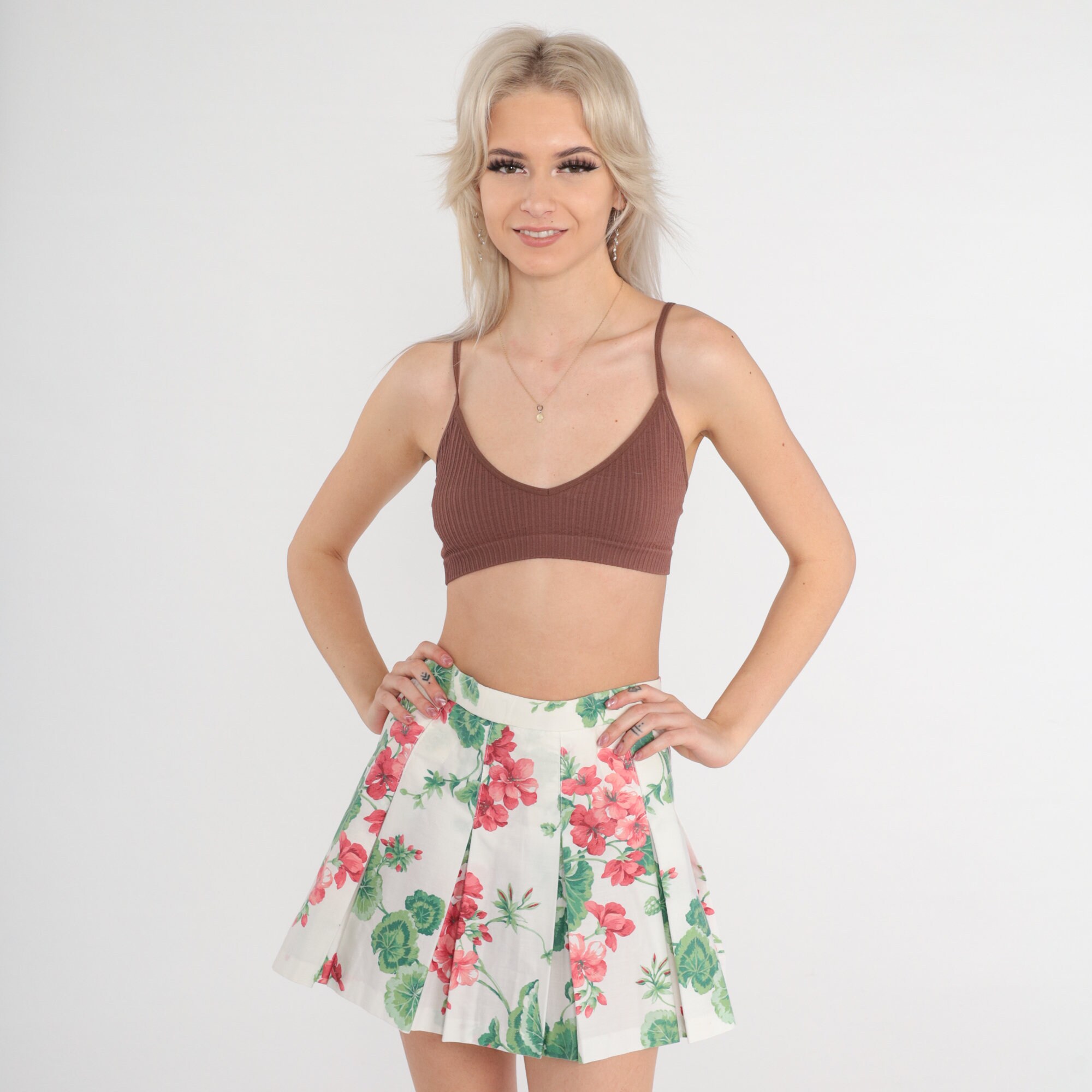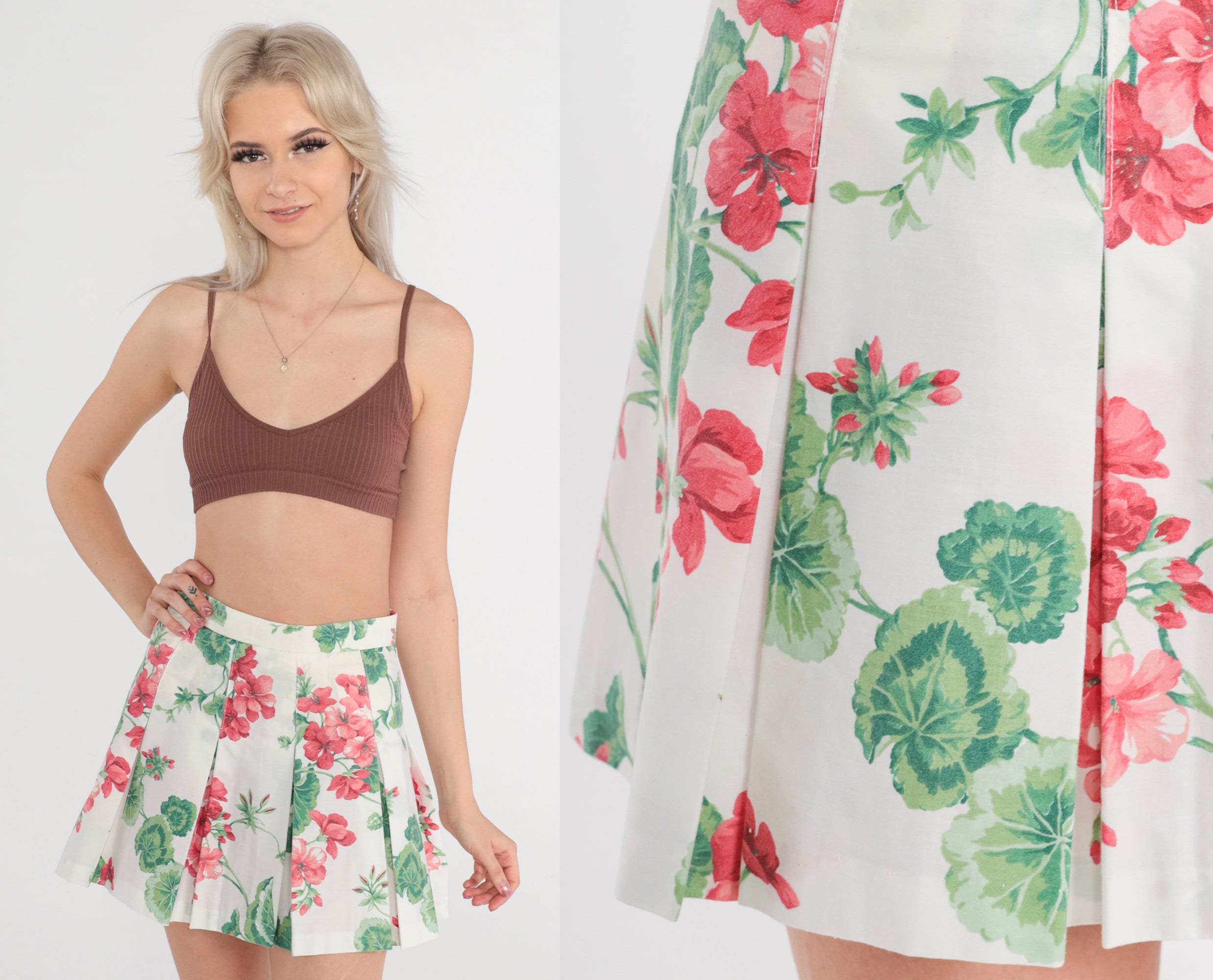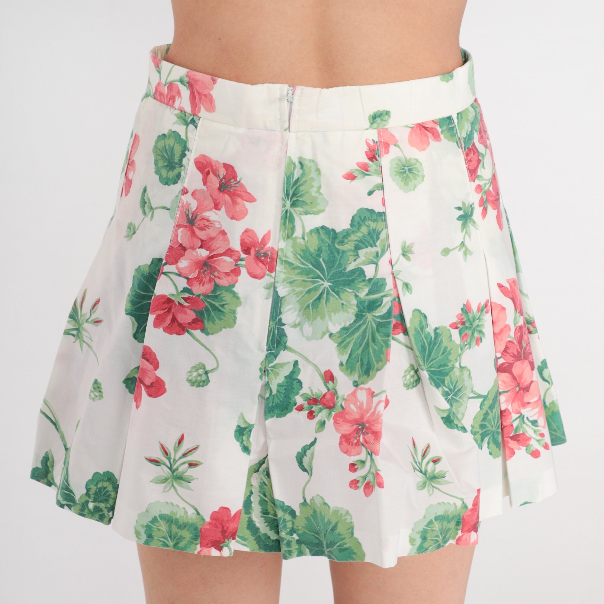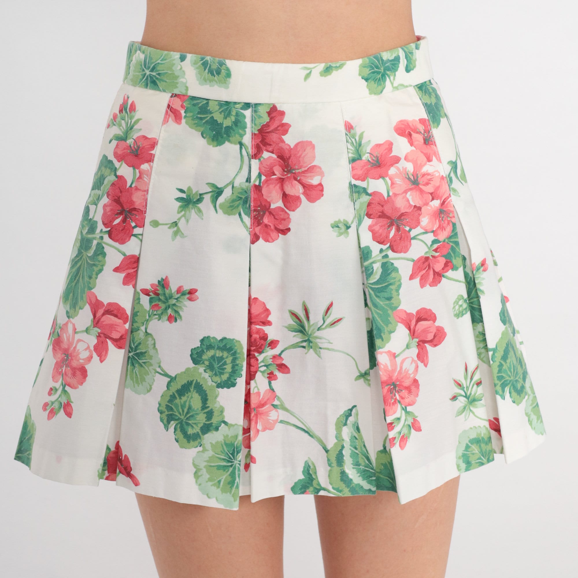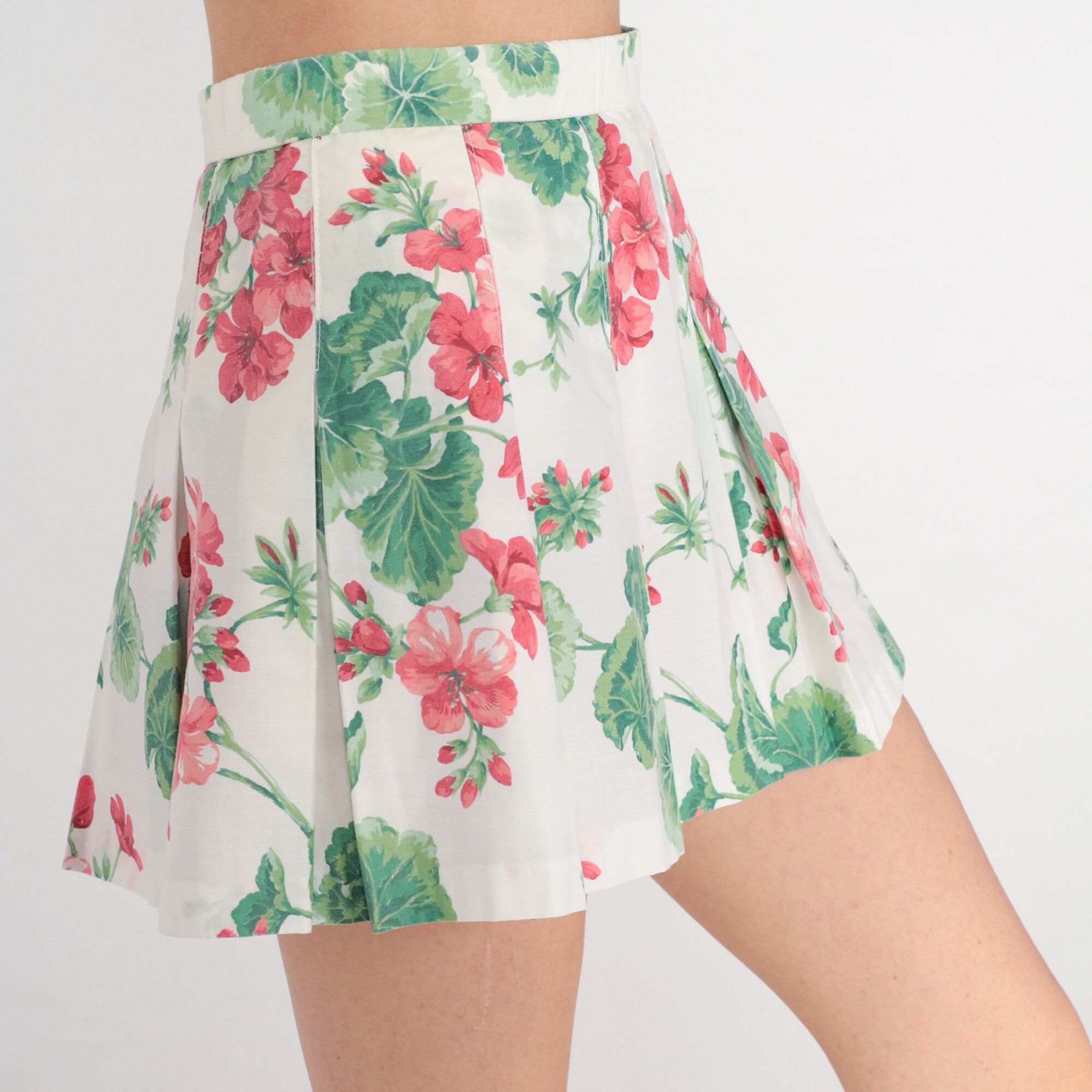 Vintage 80s skirt dress with a floral print with a high waist and pleats. Mini length.