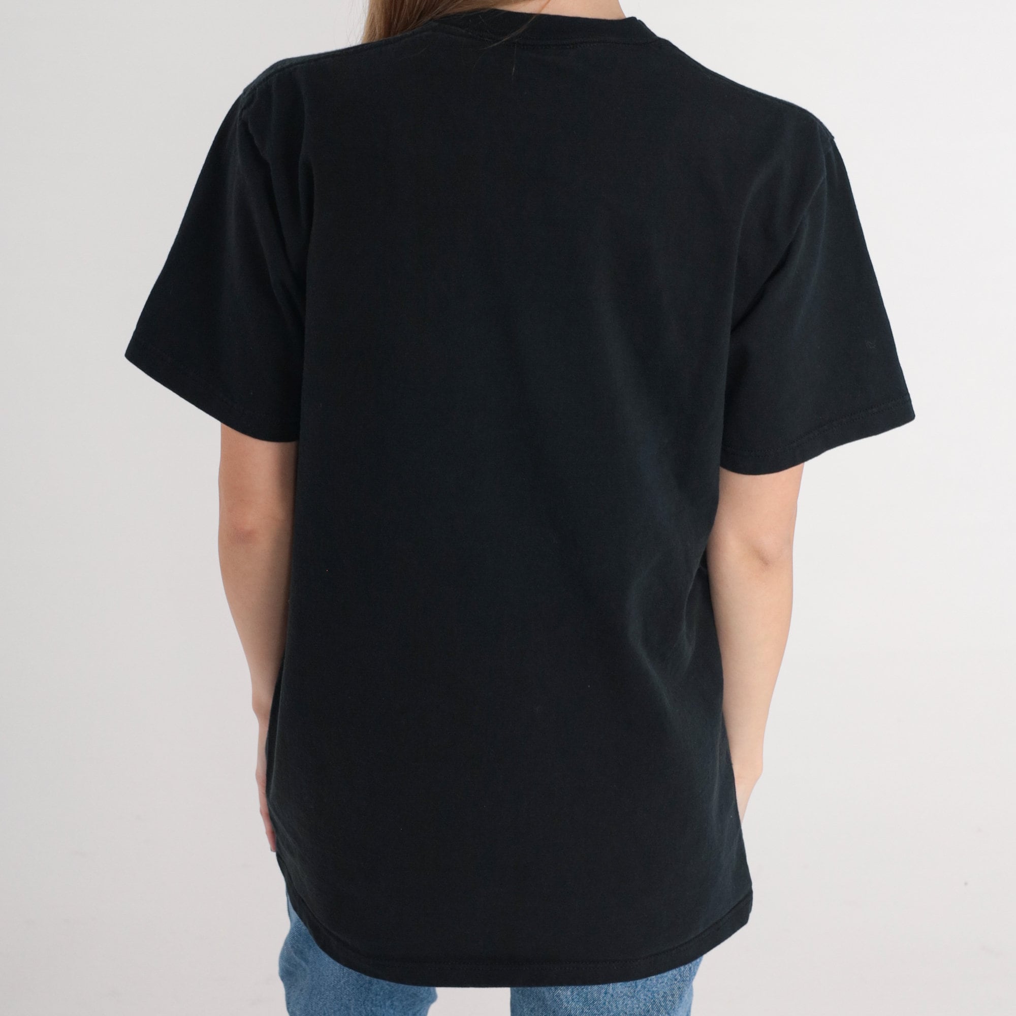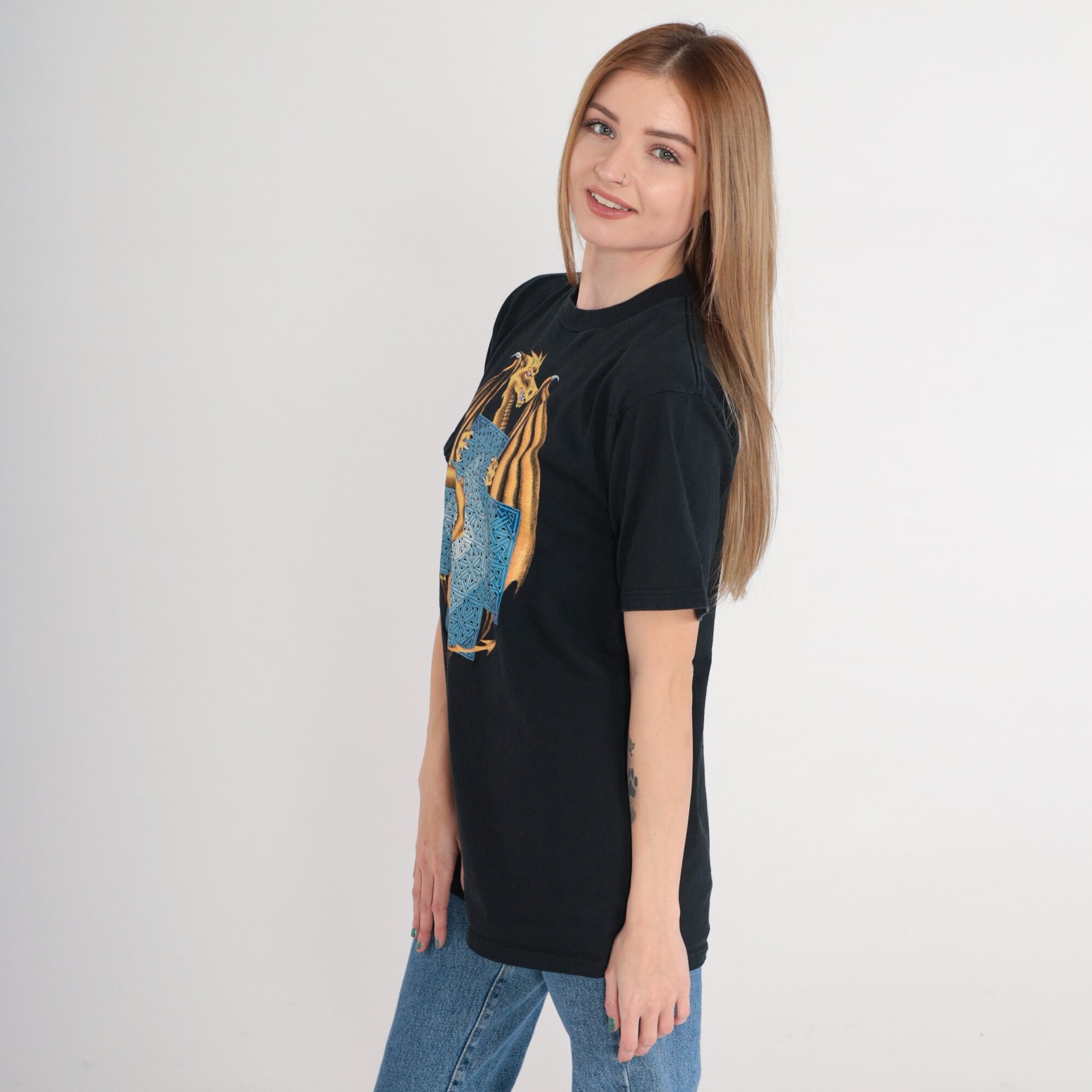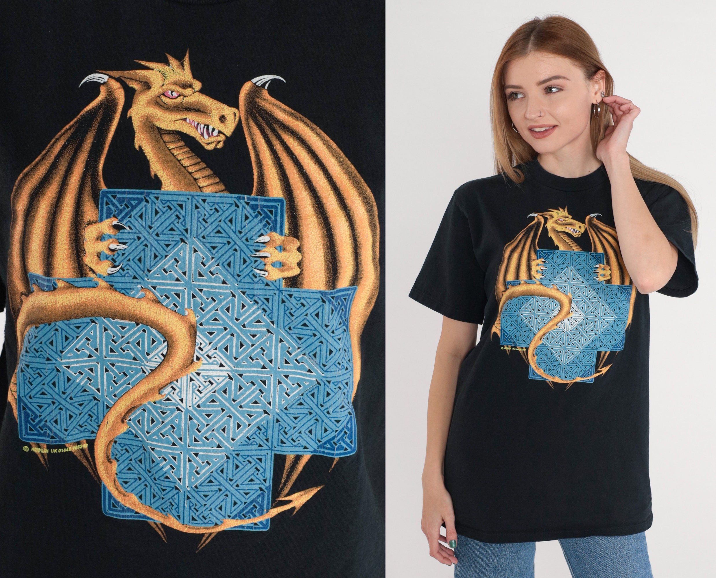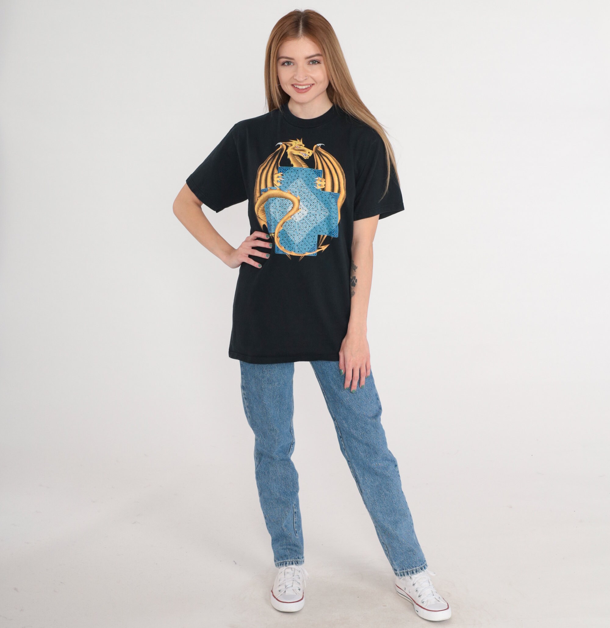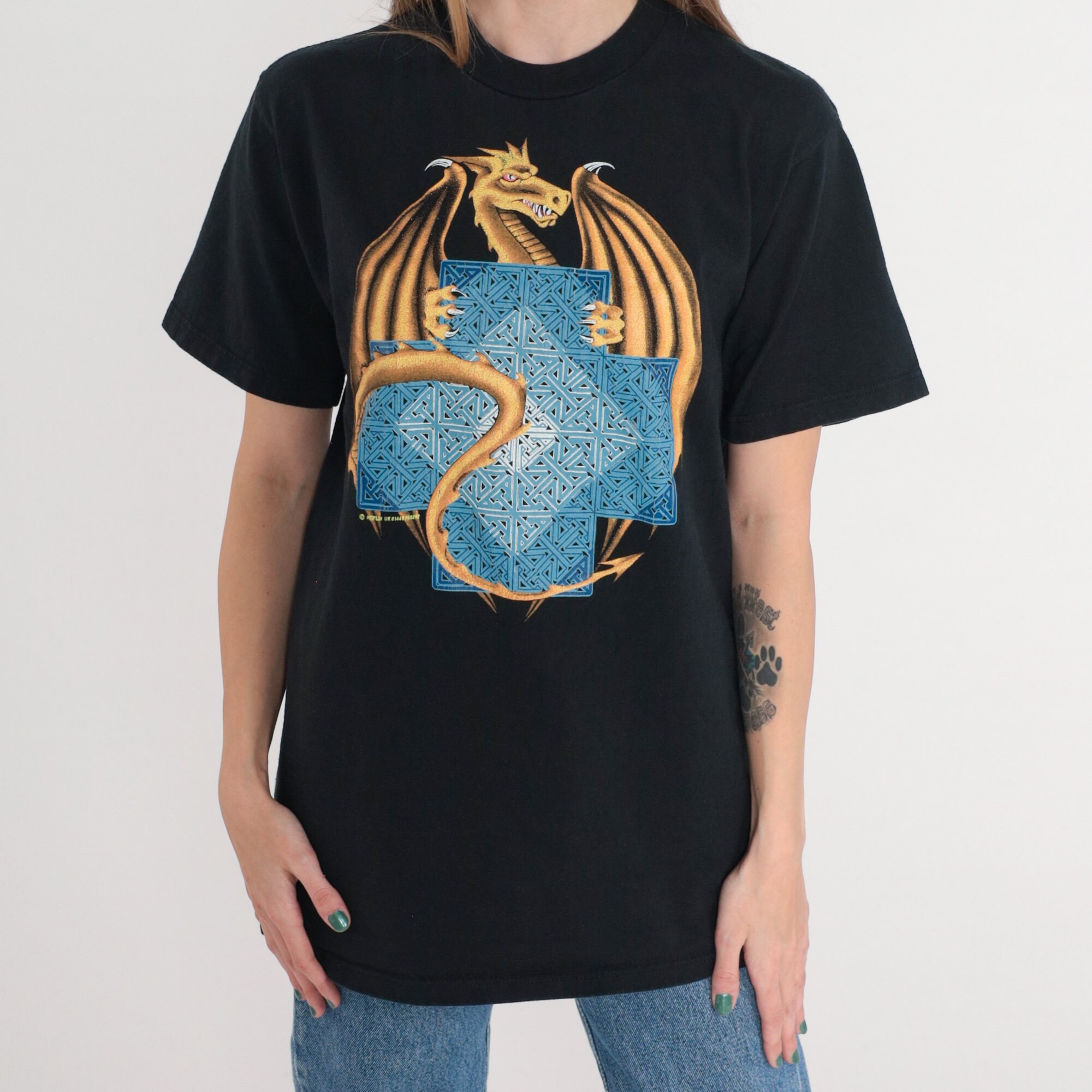 Vintage 90s t shirt in black with a sacred geometry and dragon print.