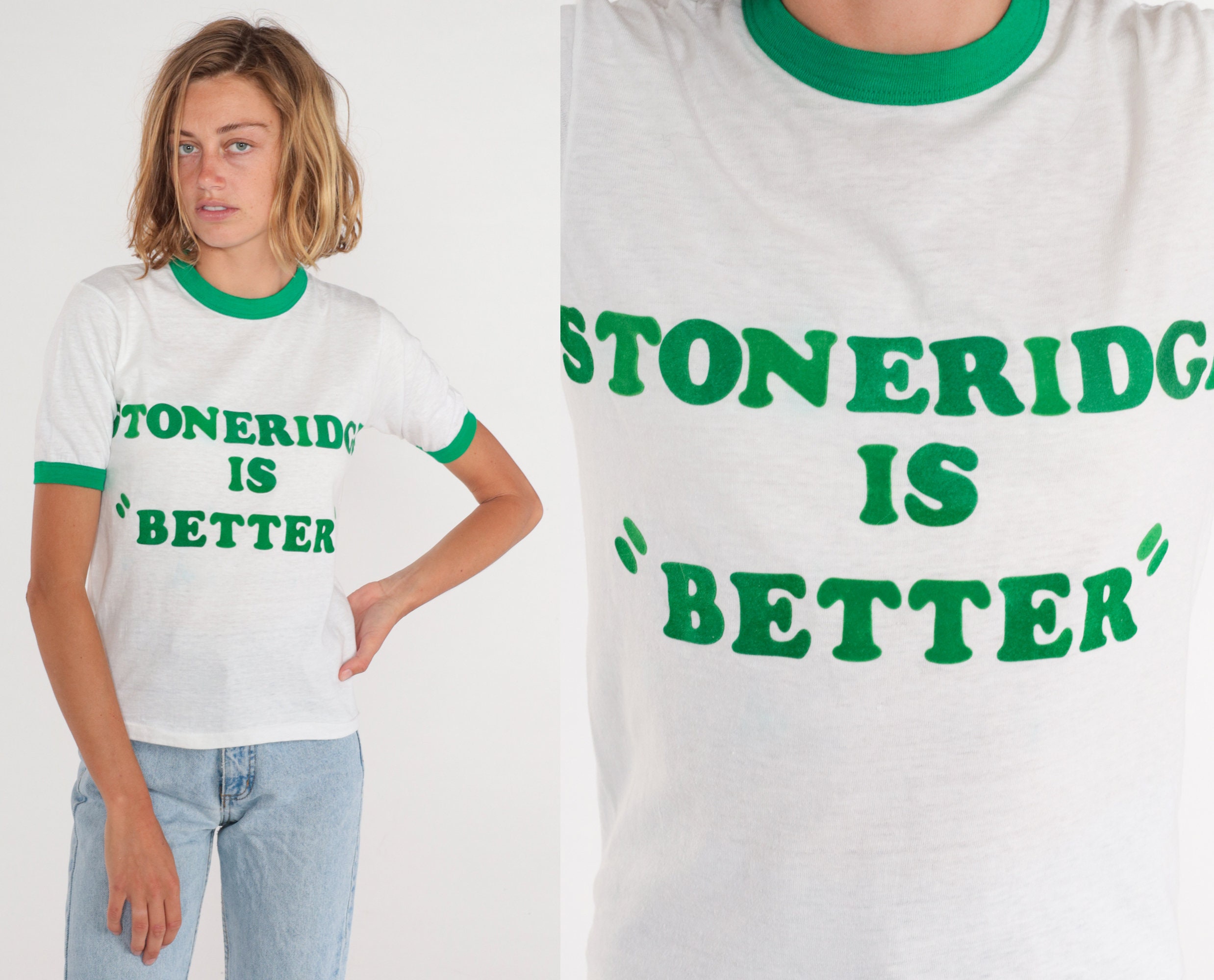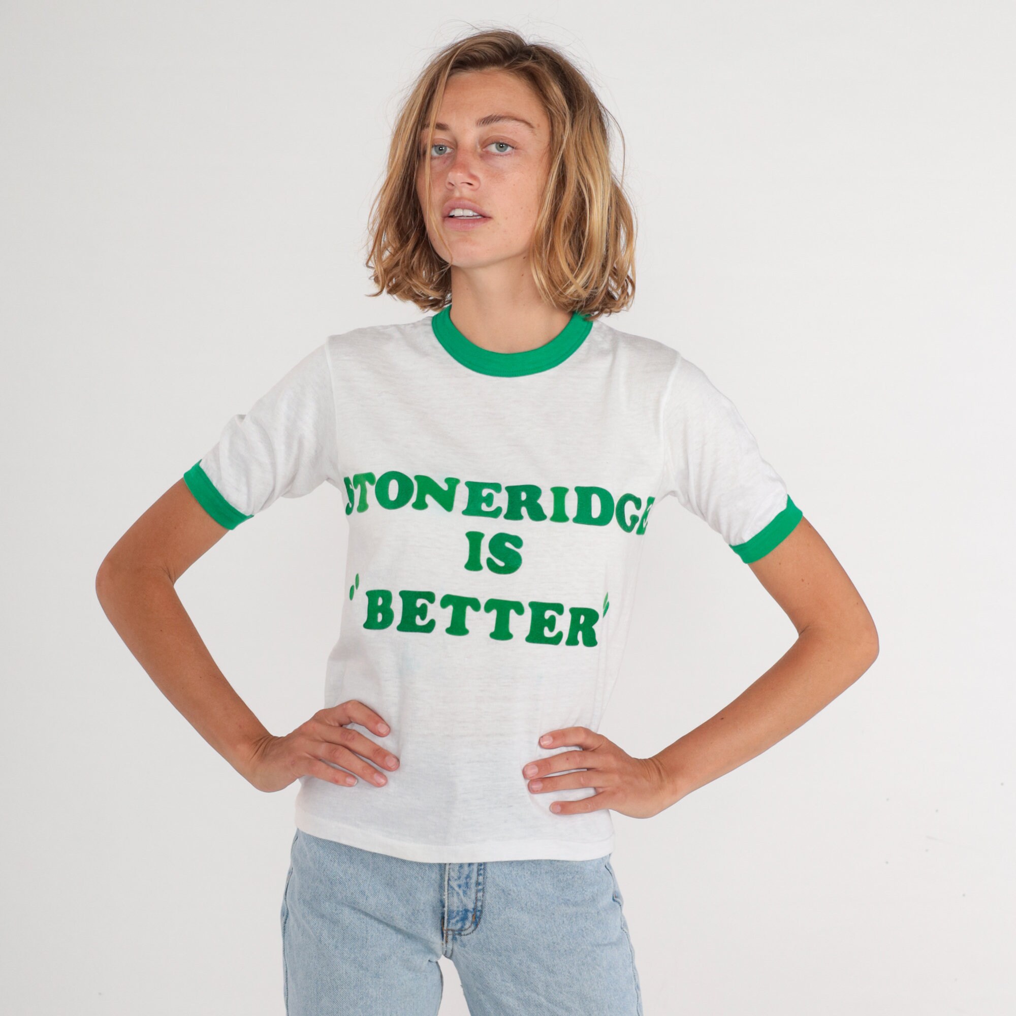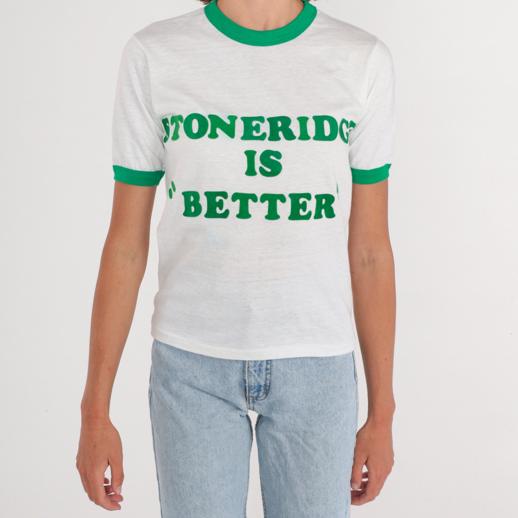 Vintage 80s t shirt in white with green ringer trim and Stoneridge is "Better" in velvety lettering on the front.