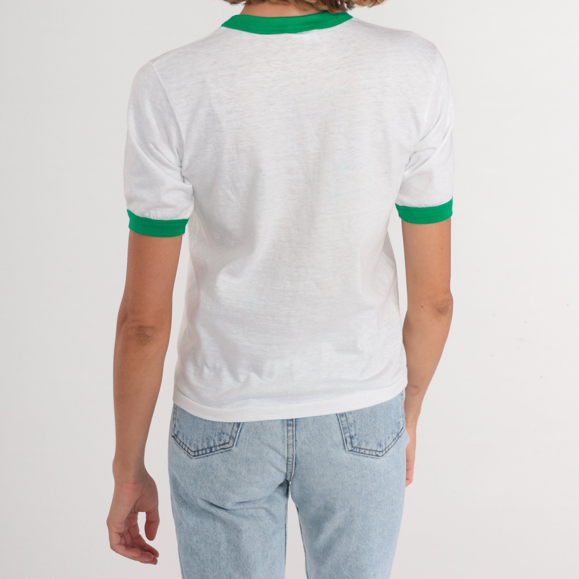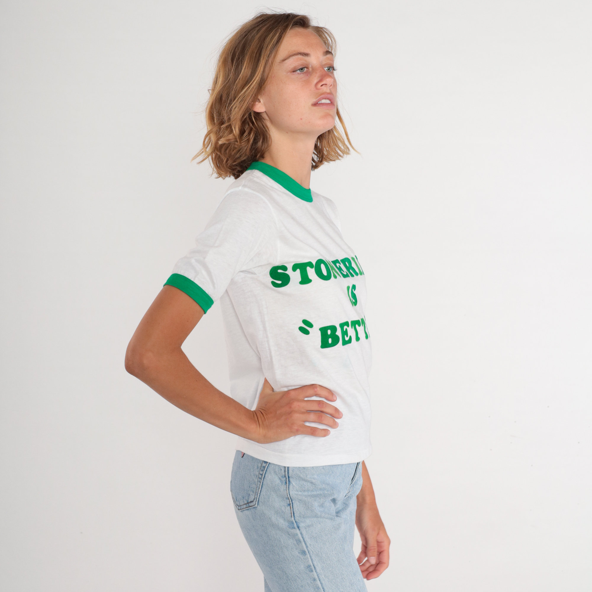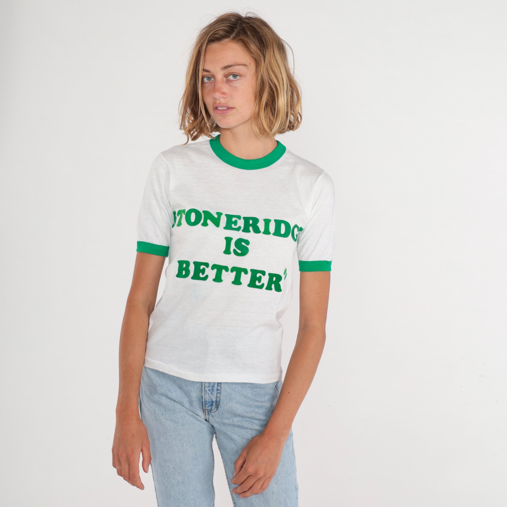 Vintage 80s t shirt in white with green ringer trim and Stoneridge is "Better" in velvety lettering on the front.