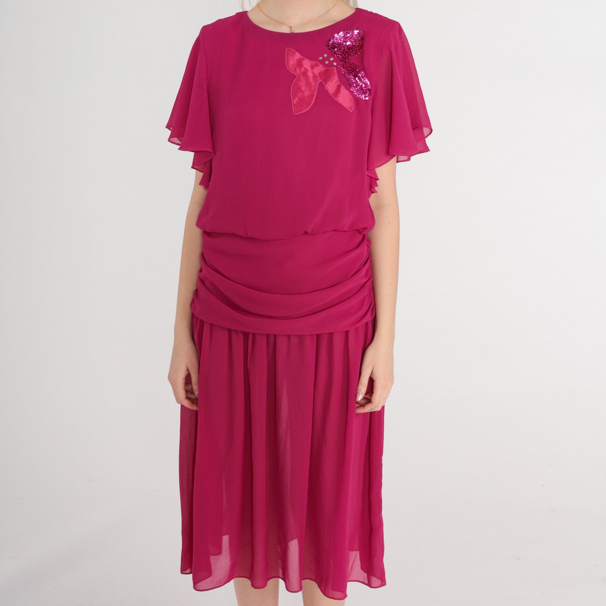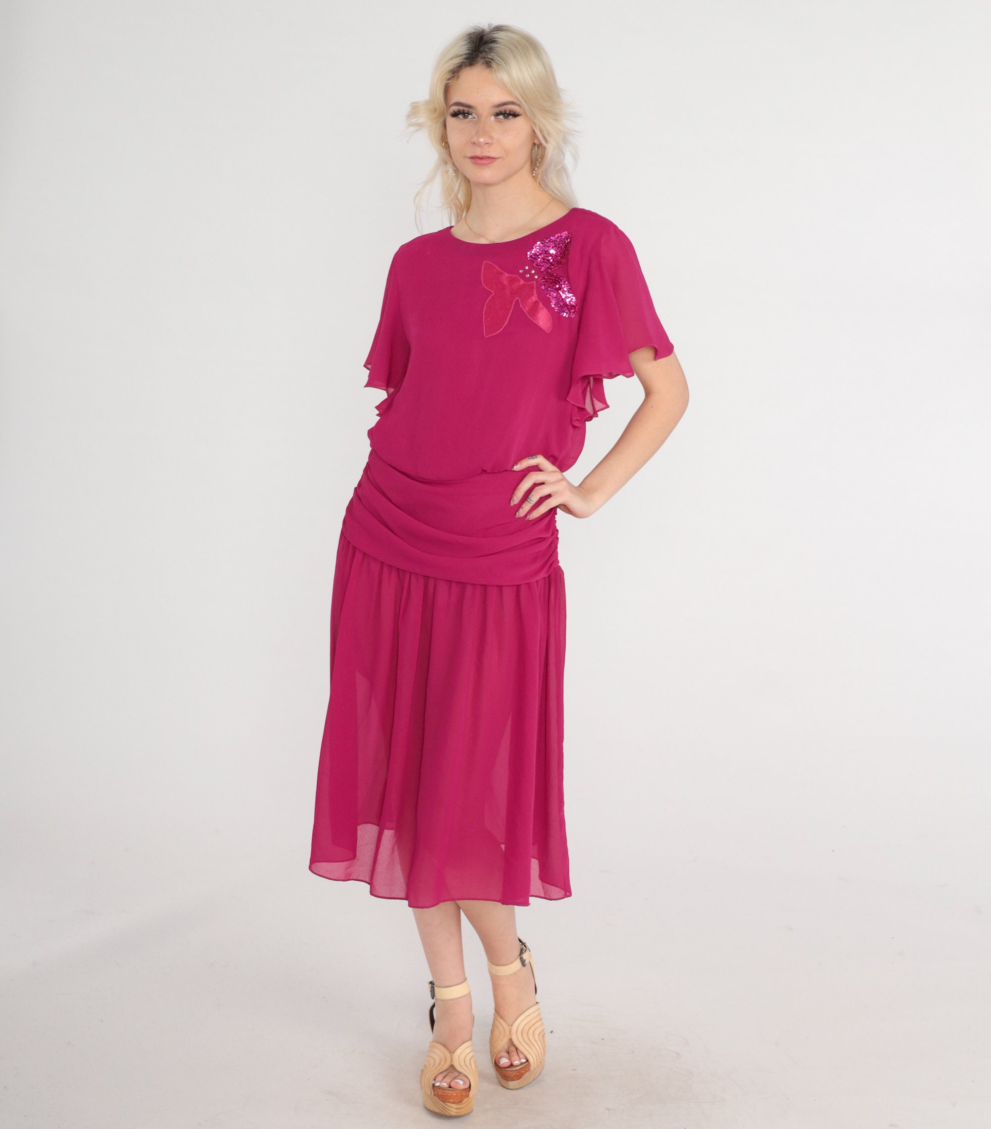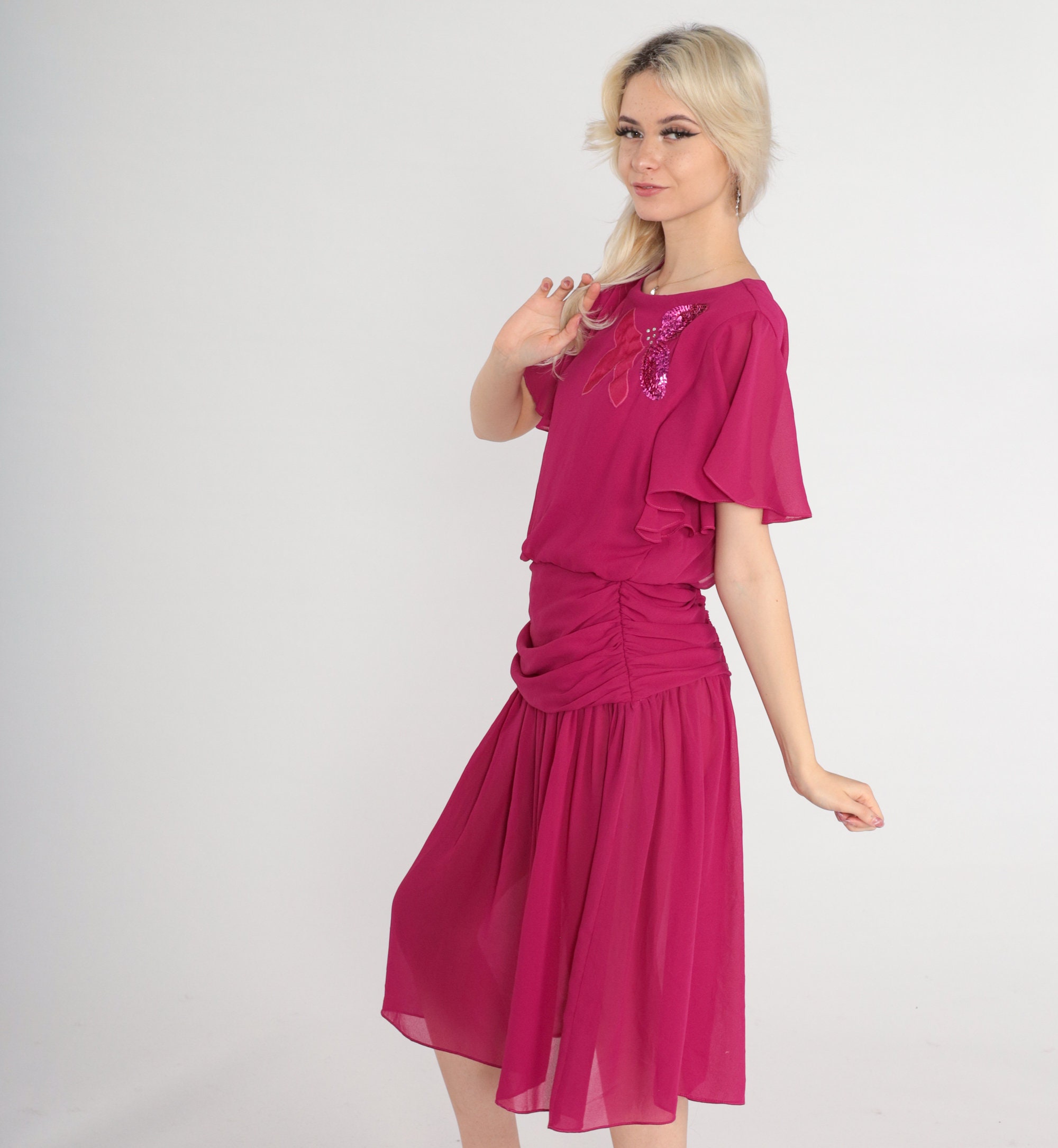 Vintage 80s dress in magenta chiffon with rhinestones and sequins on the bodice. It has flutter sleeves and and a drop waist.