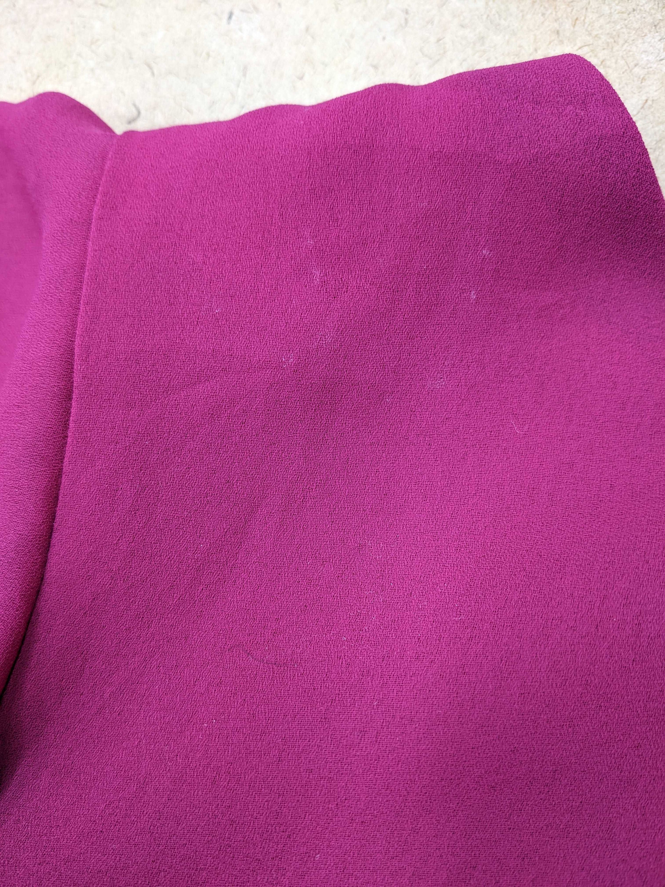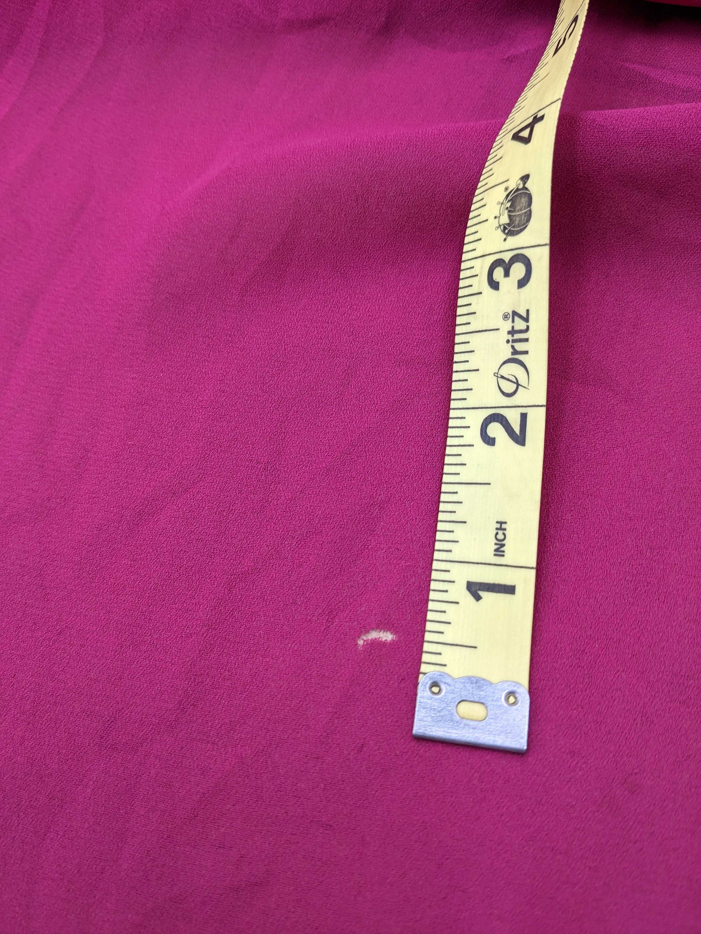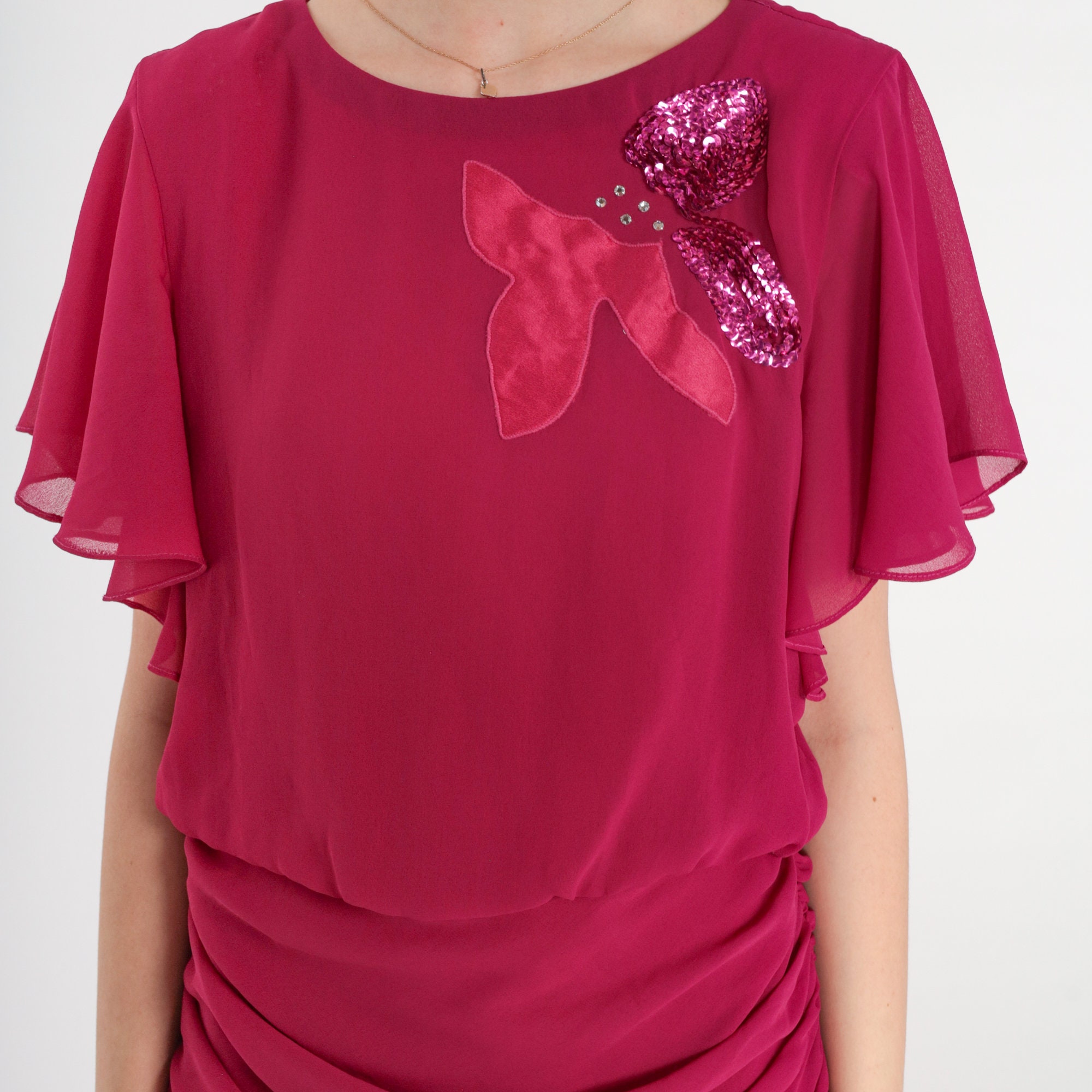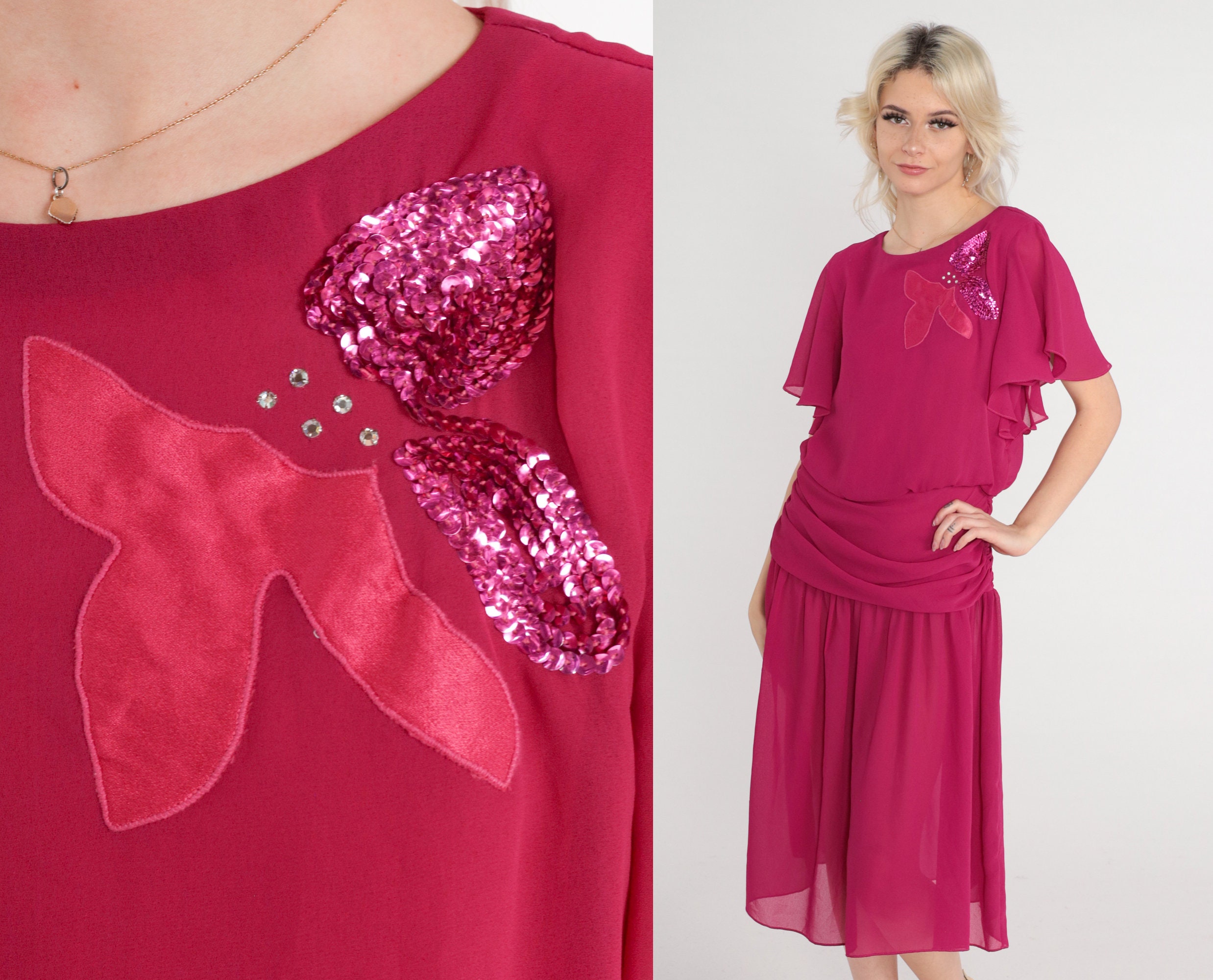 Vintage 80s dress in magenta chiffon with rhinestones and sequins on the bodice. It has flutter sleeves and and a drop waist.