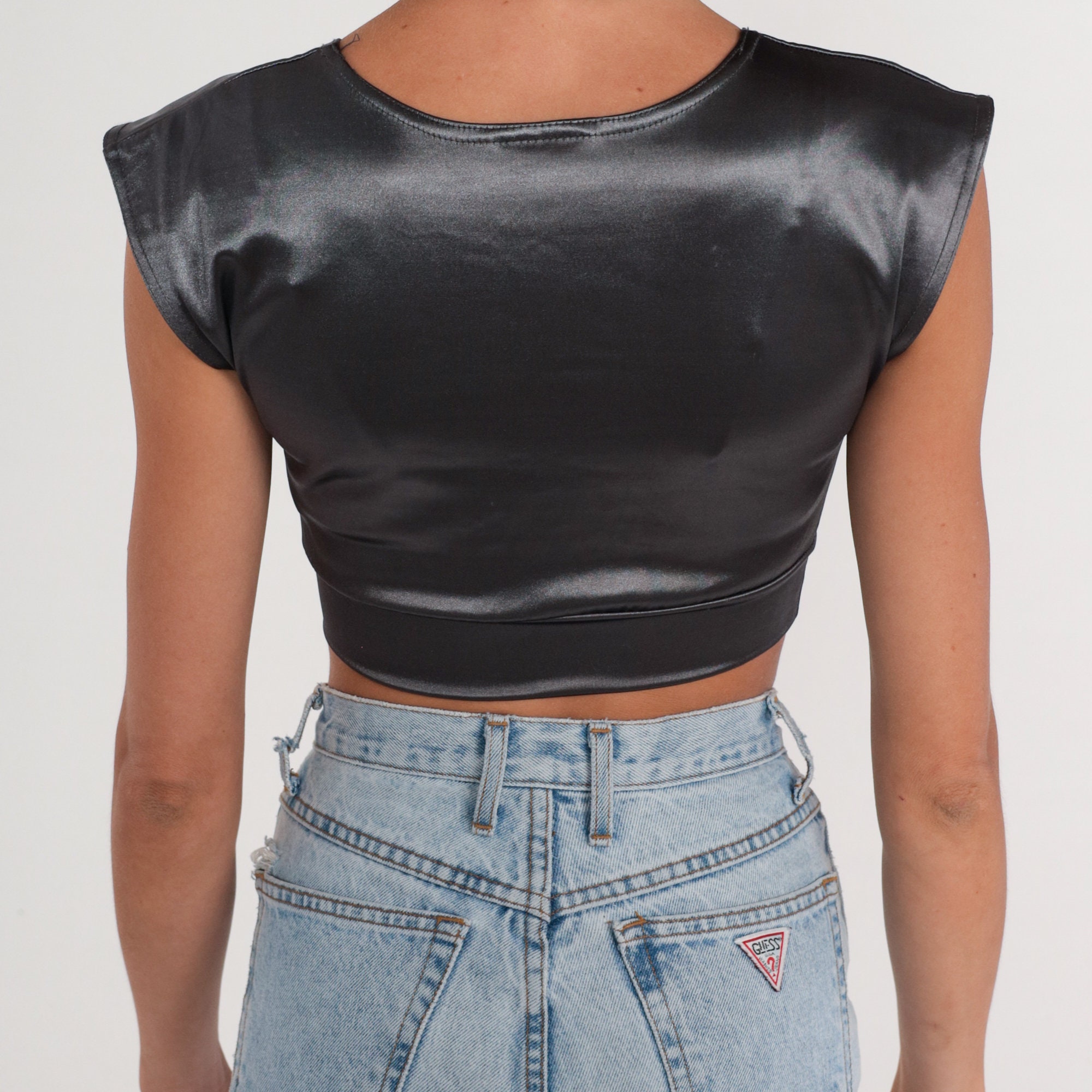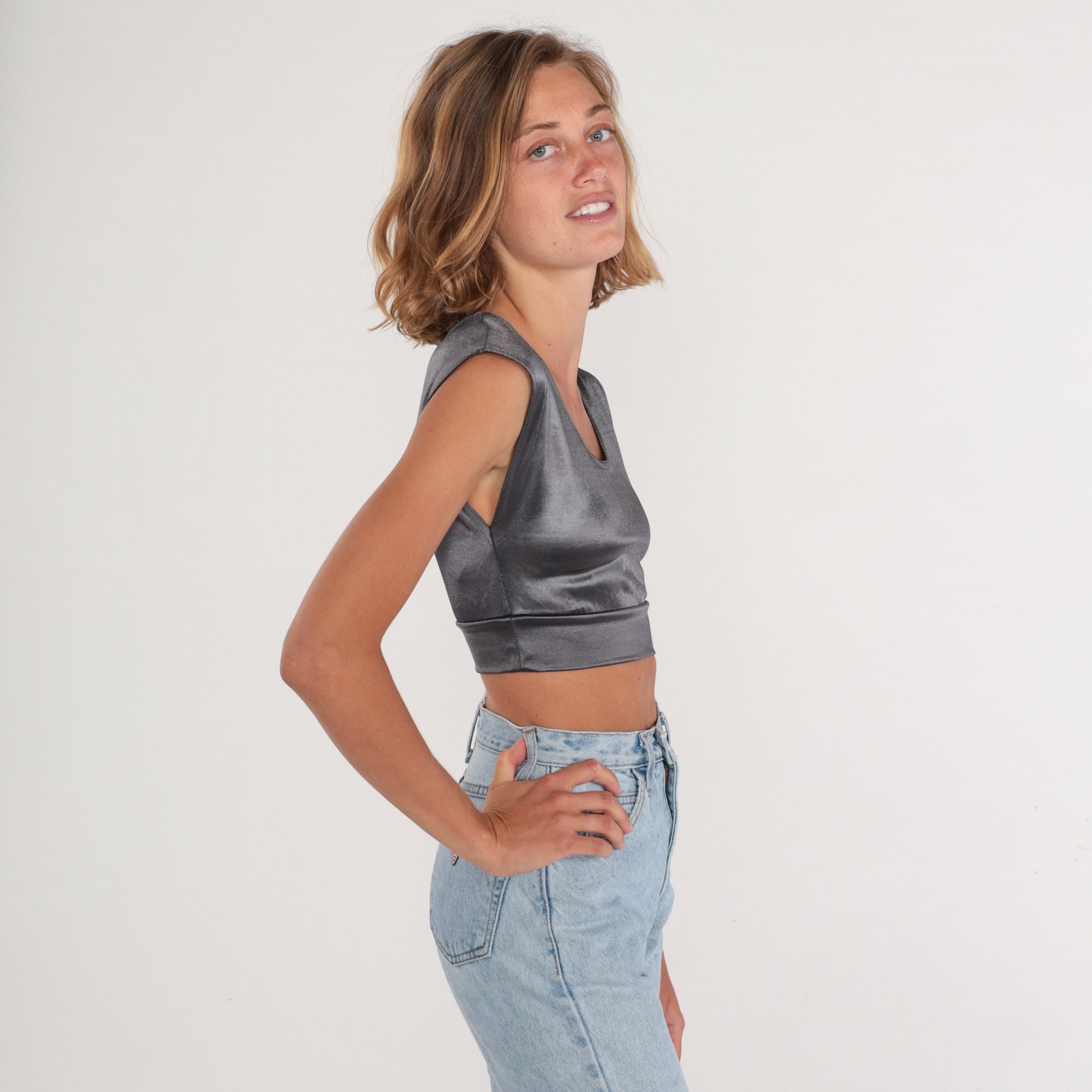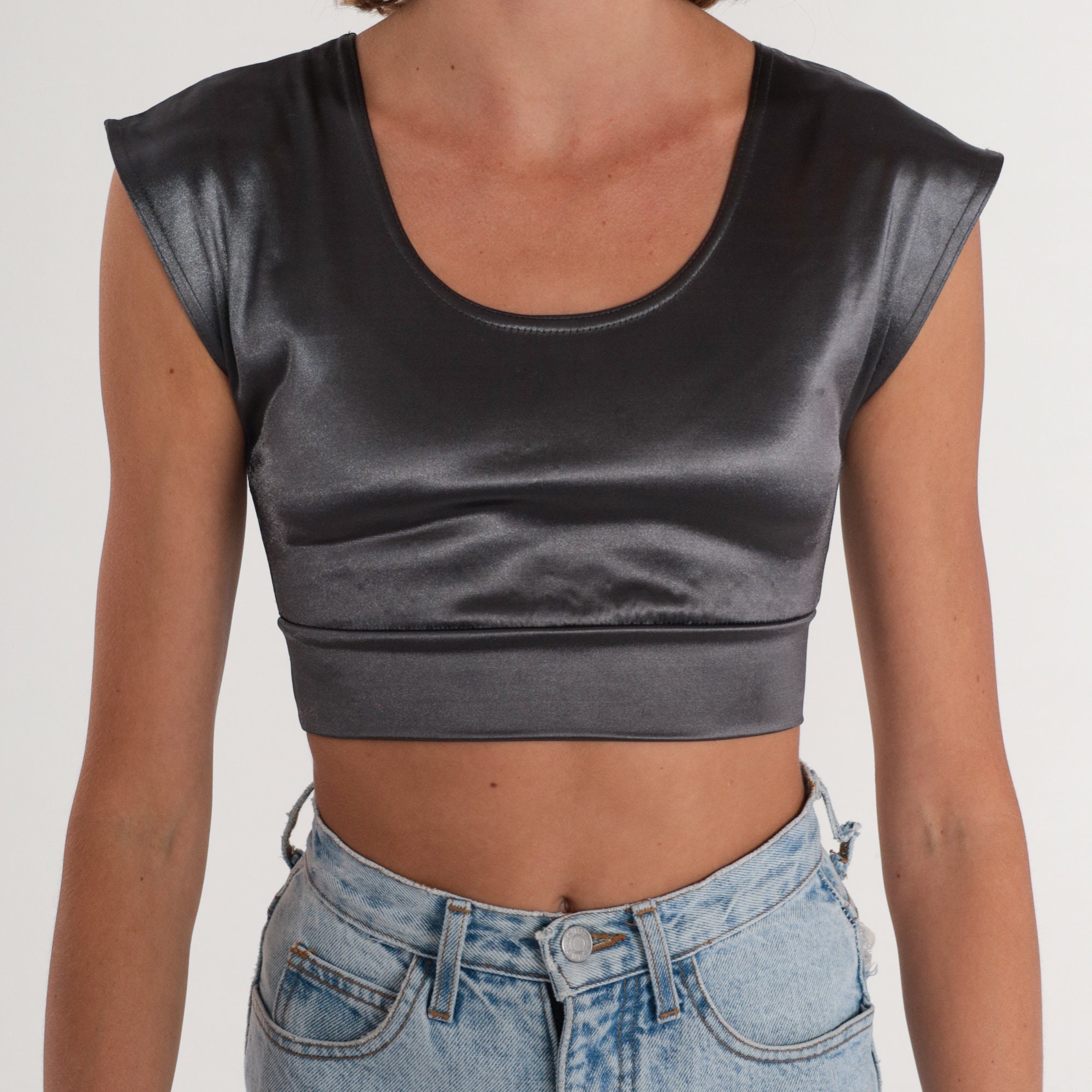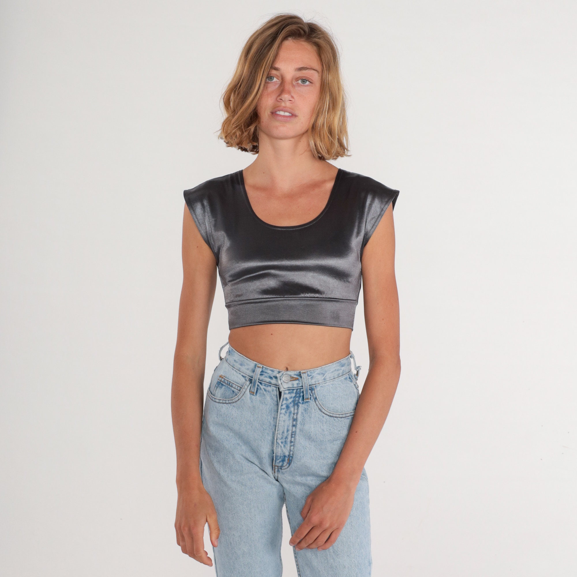 Vintage 90s shirt in metallic silver with cap sleeves and a cropped hem.