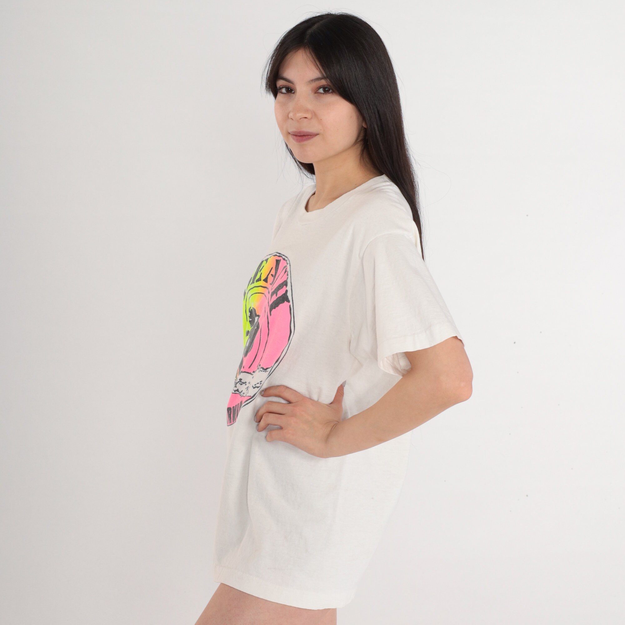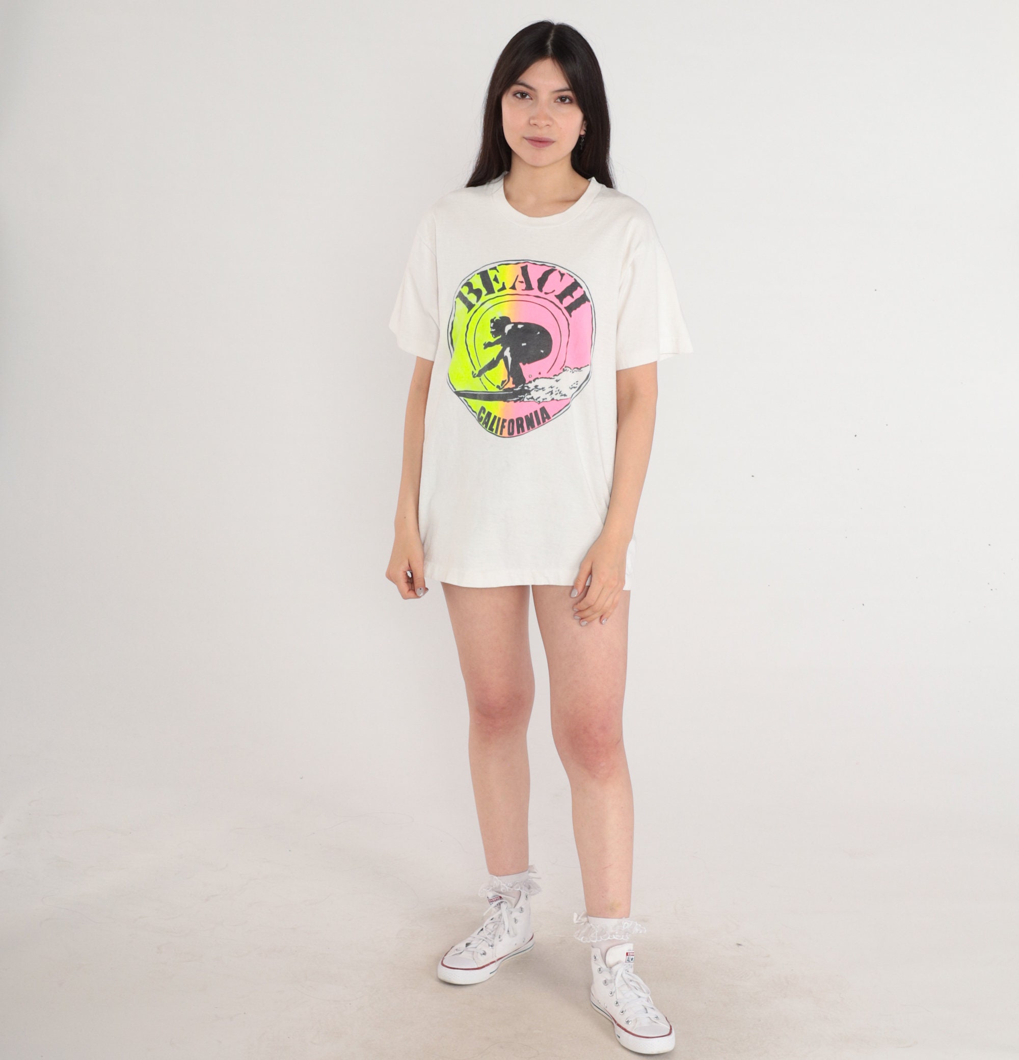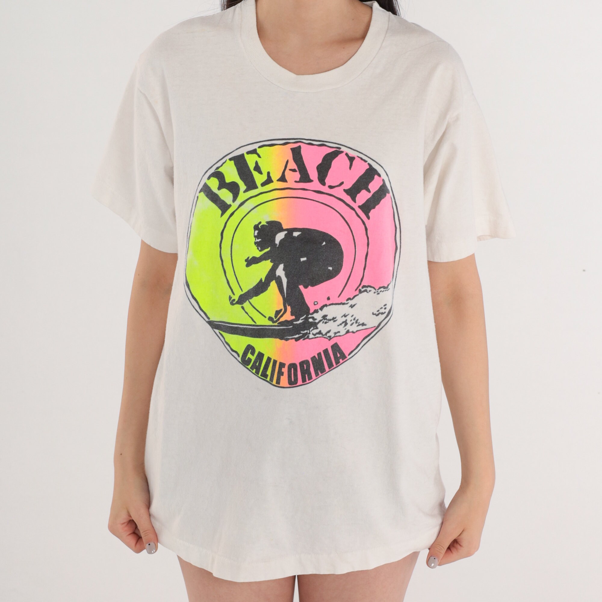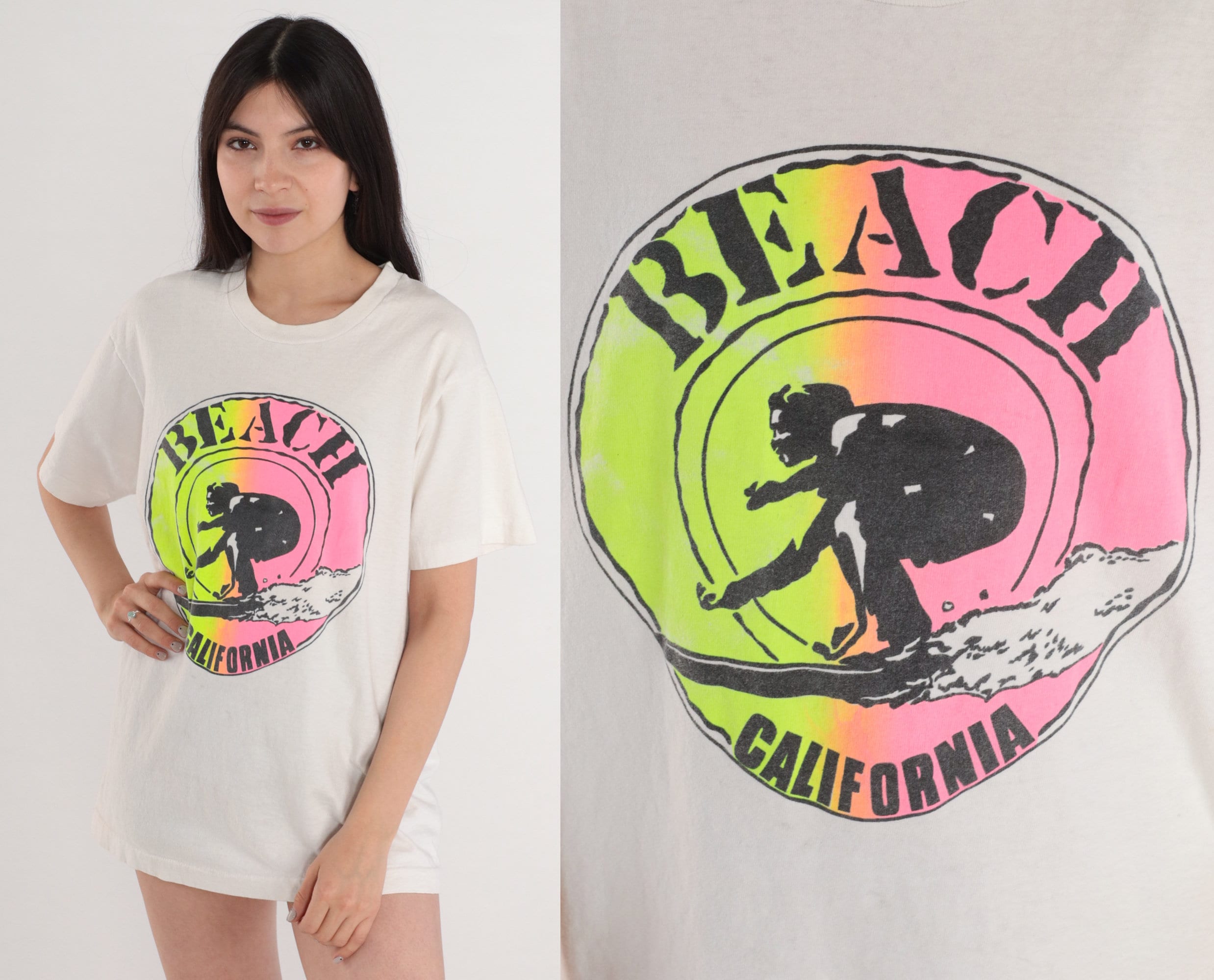 Vintage 90s shirt in white with a surfer graphic and "Beach California" on the front.