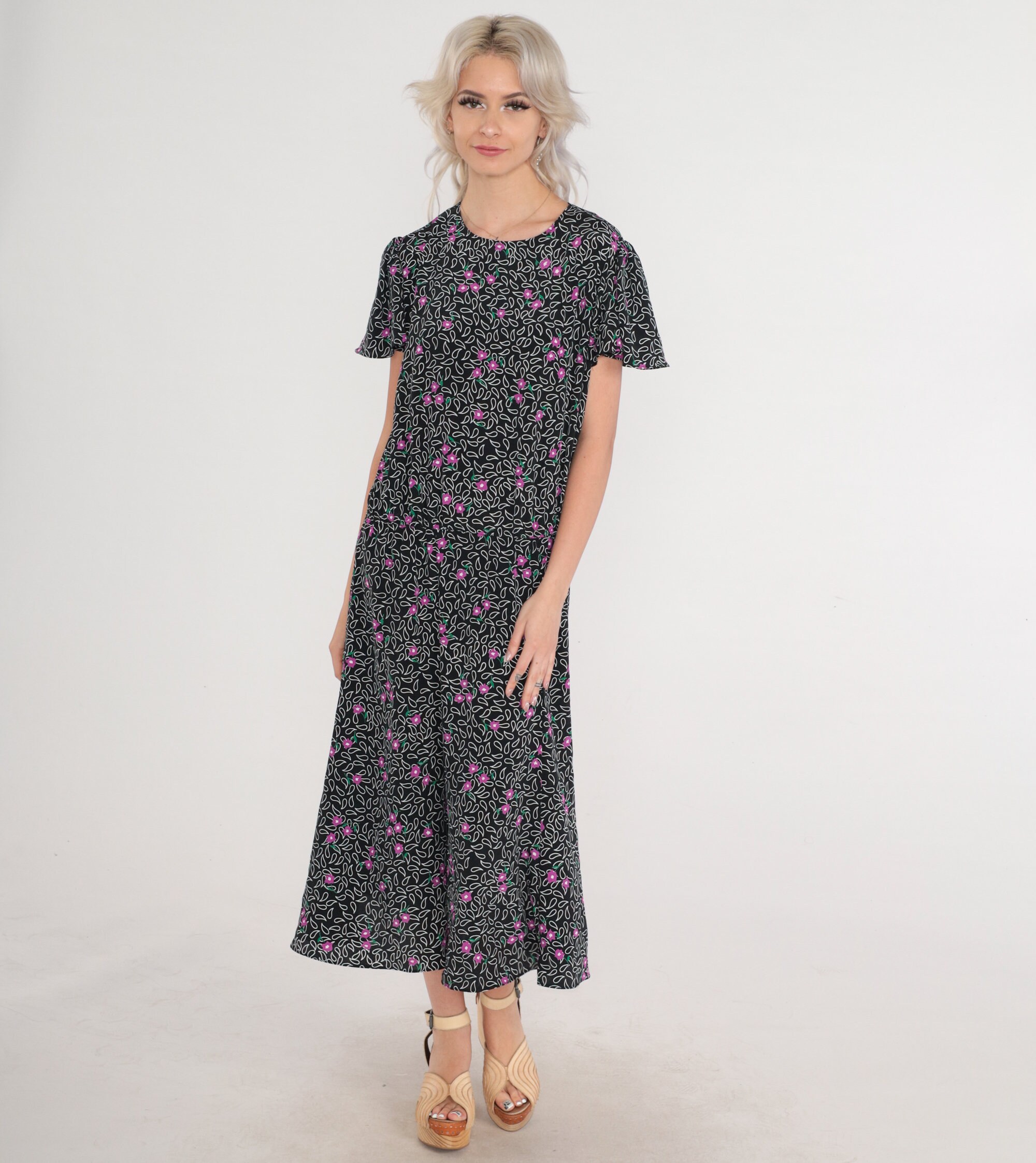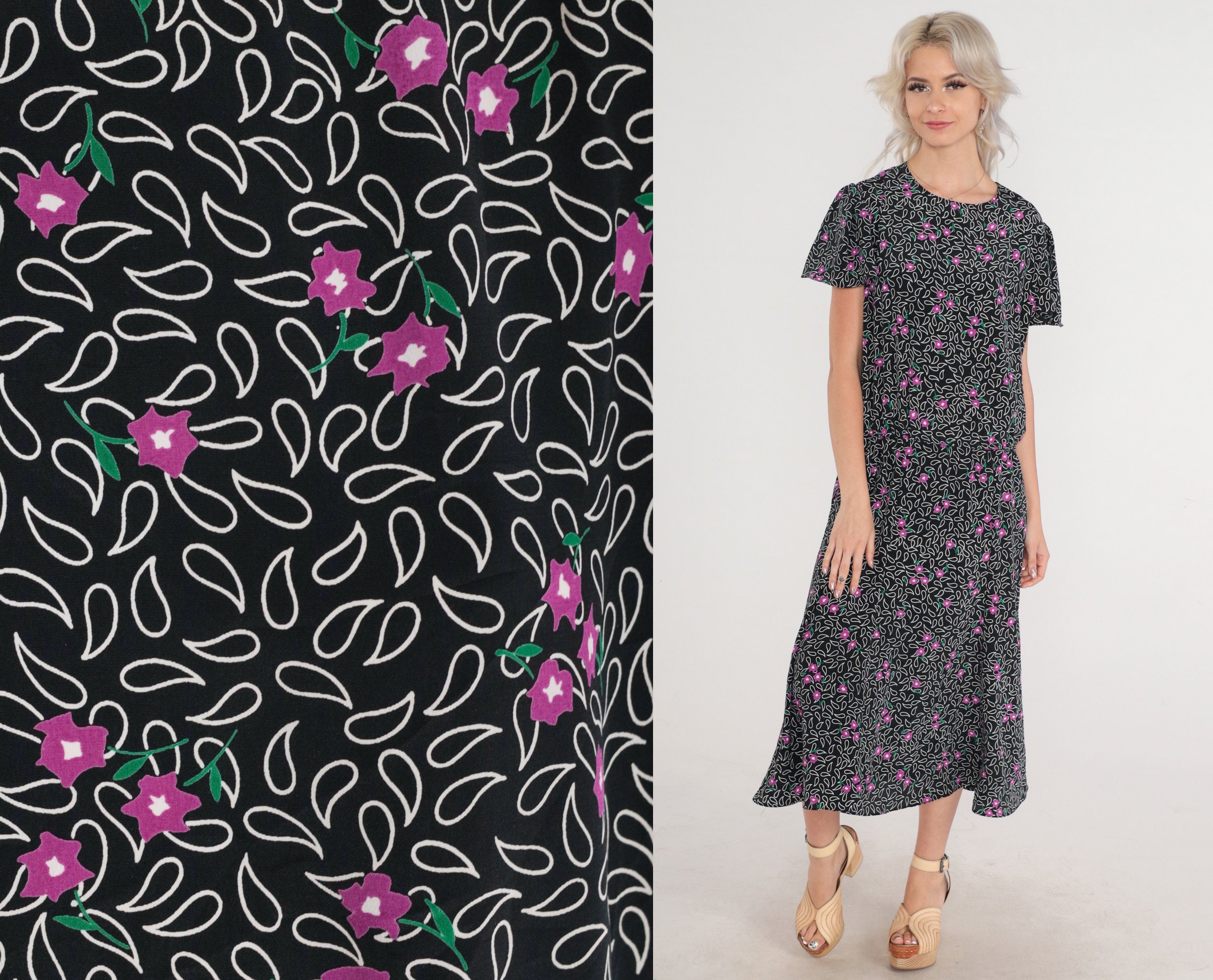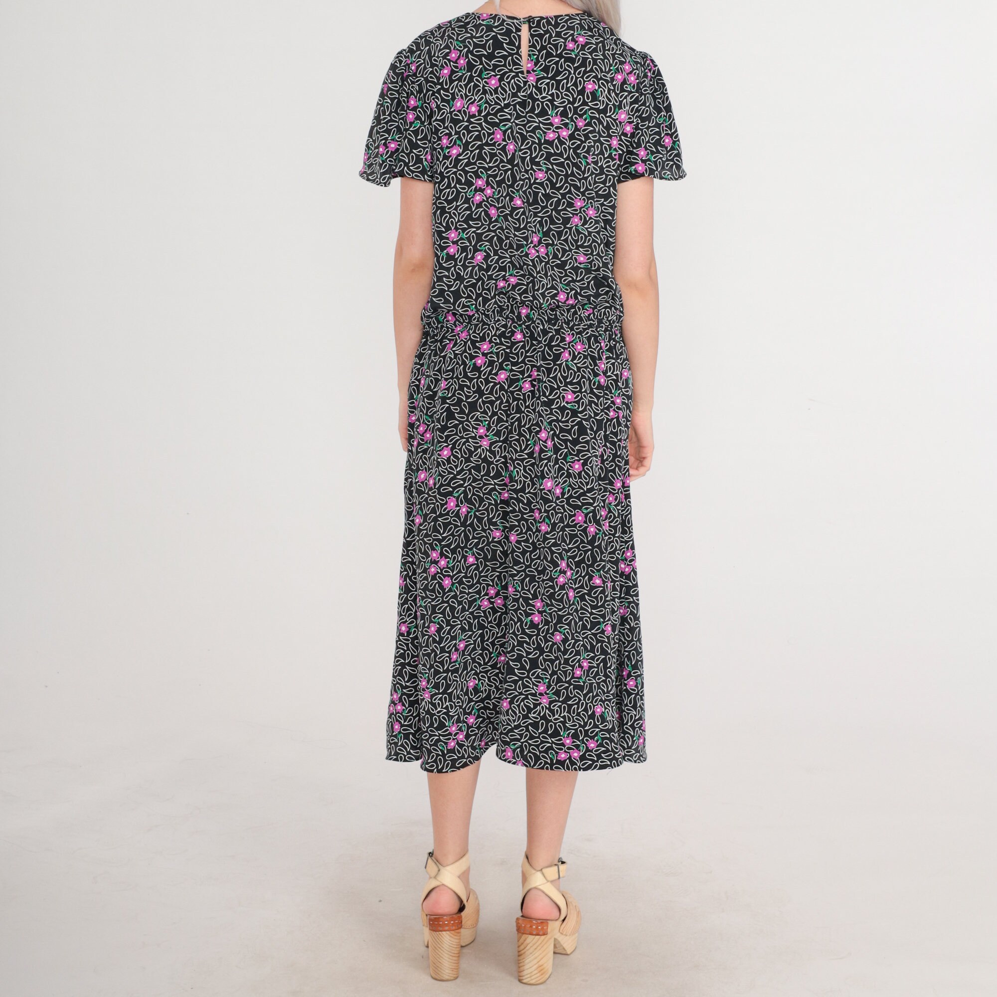Vintage 80s dress in black with a white paisley and purple floral print. Midi length with short flutter sleeves and a keyhole button in the back.