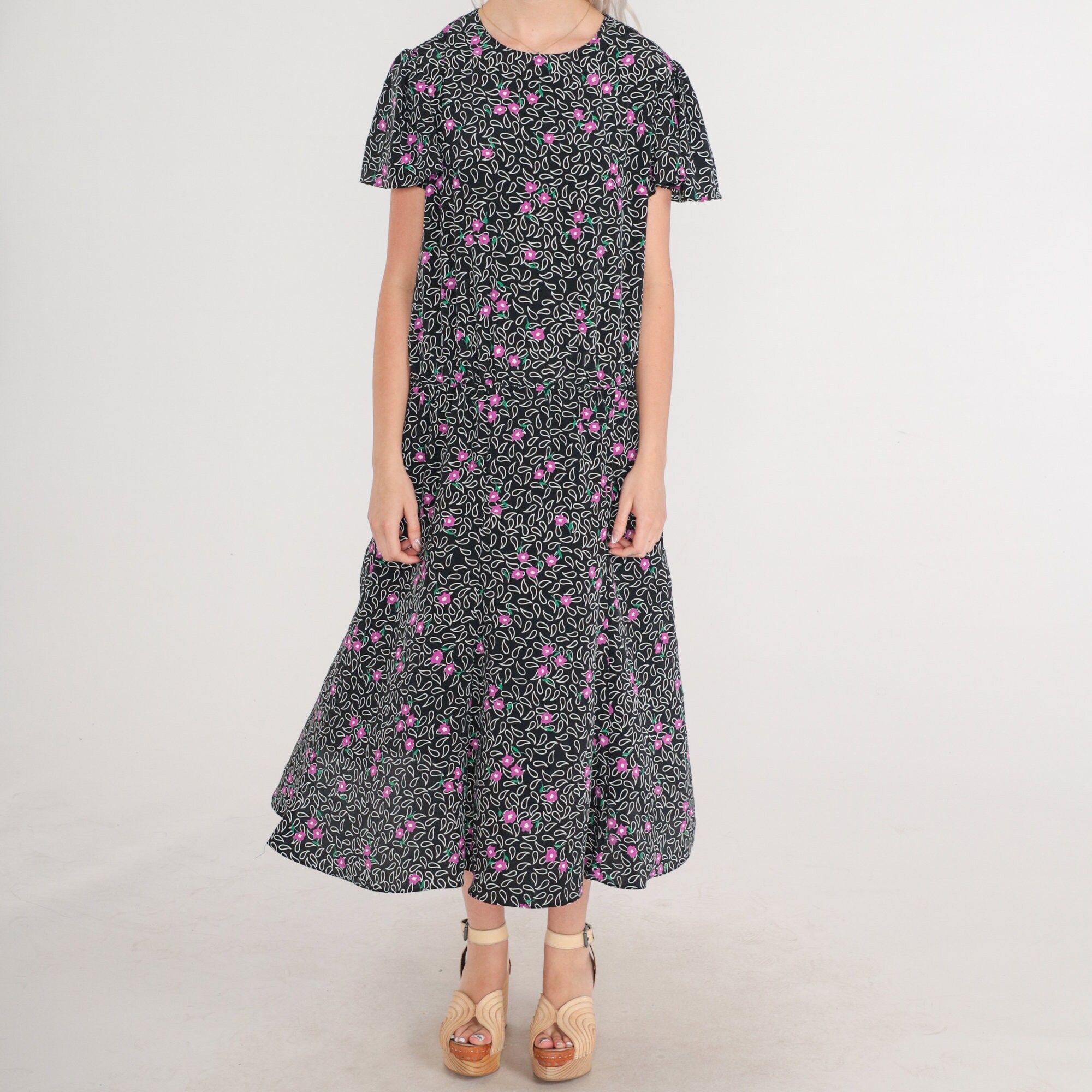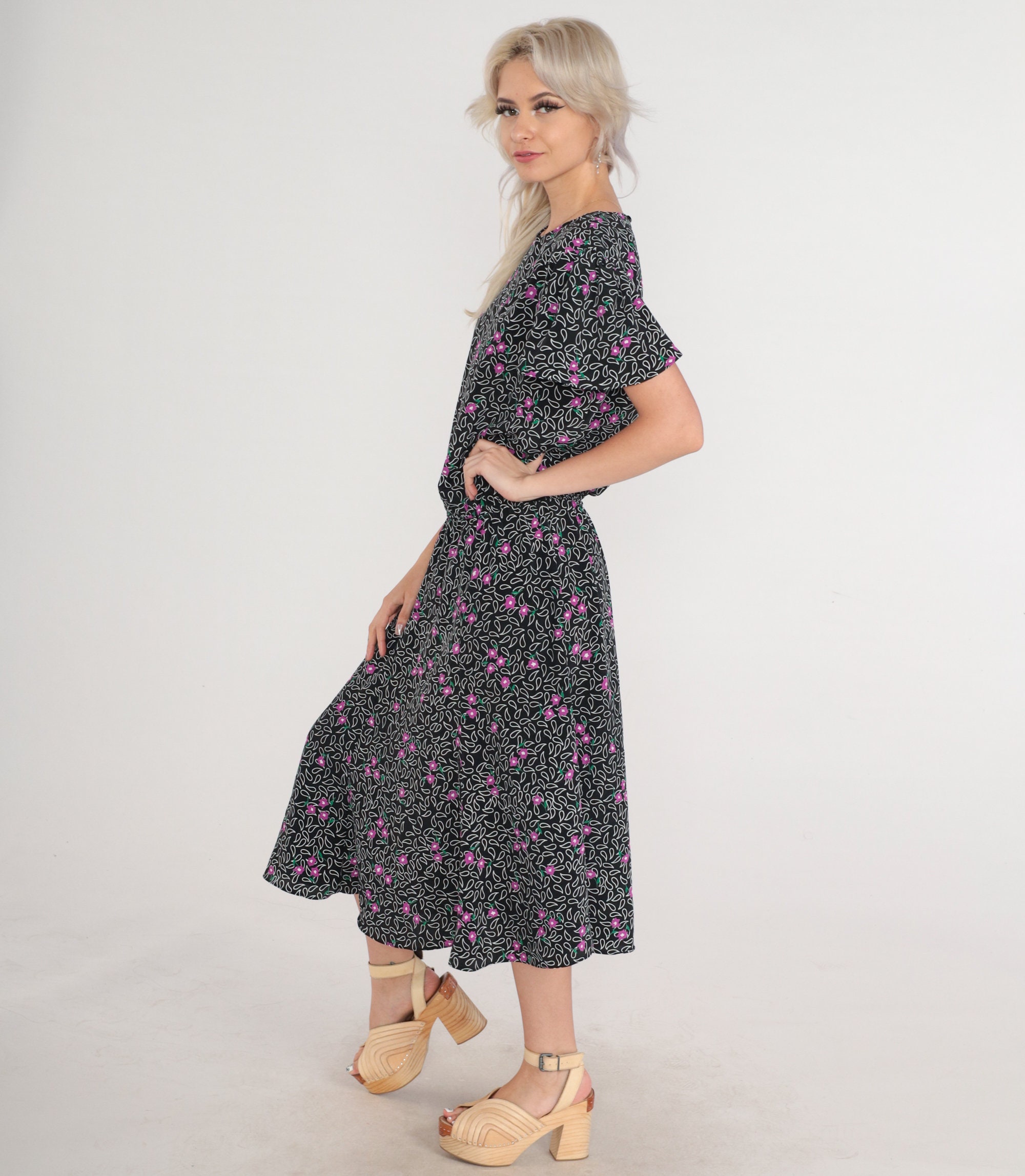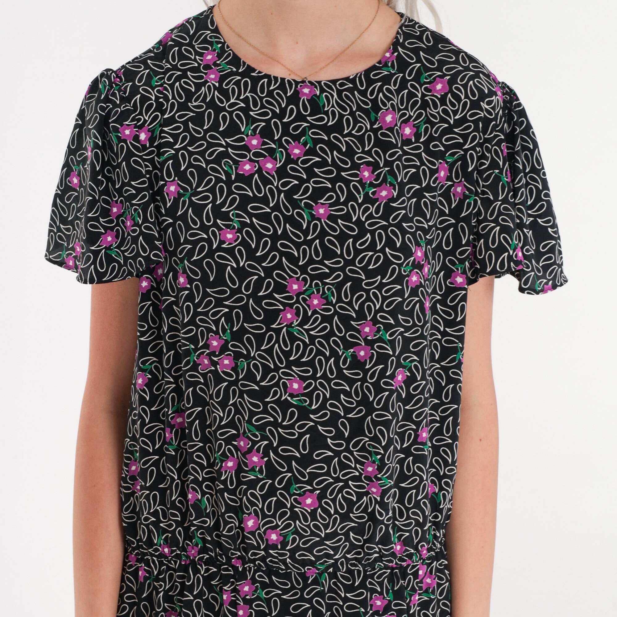 Vintage 80s dress in black with a white paisley and purple floral print. Midi length with short flutter sleeves and a keyhole button in the back.