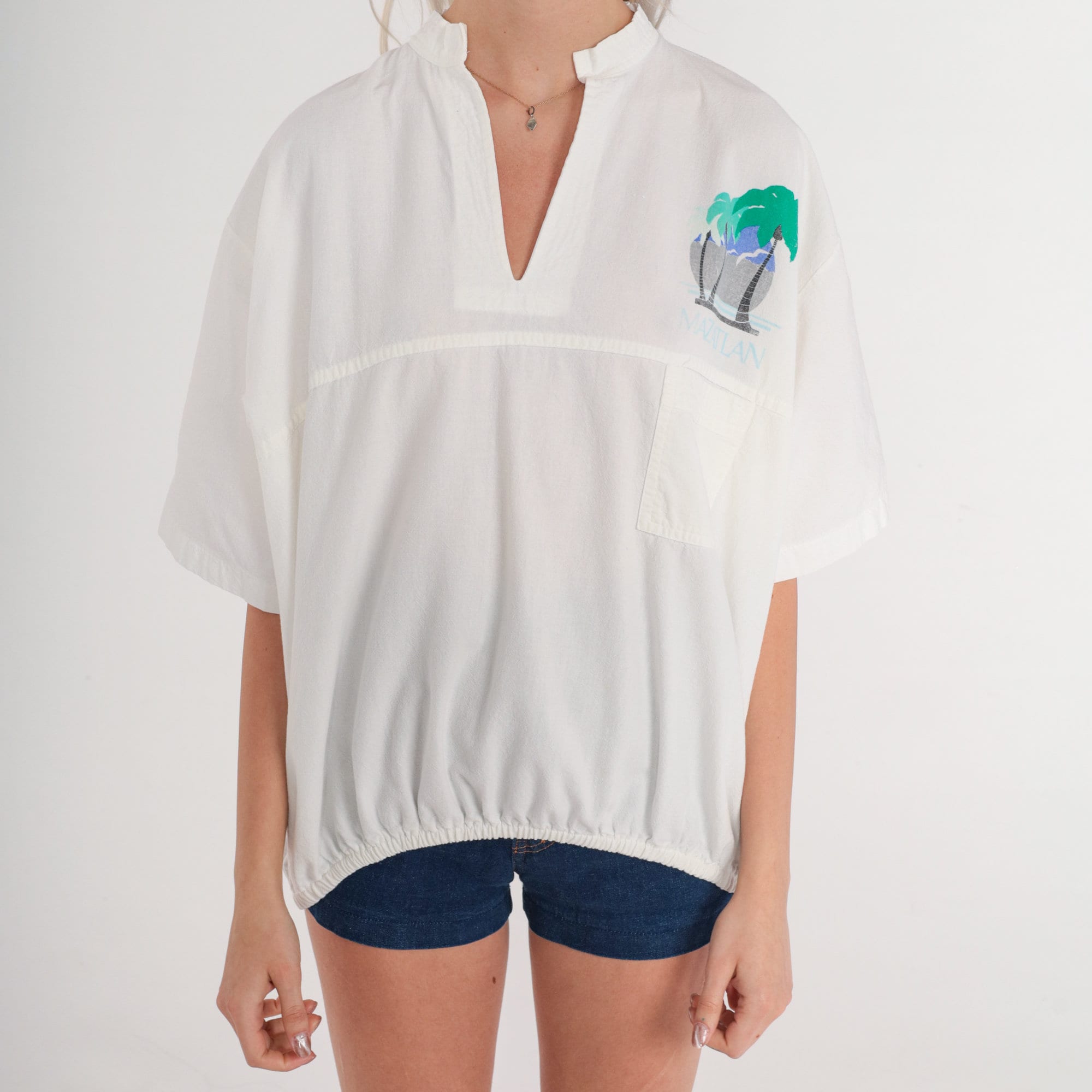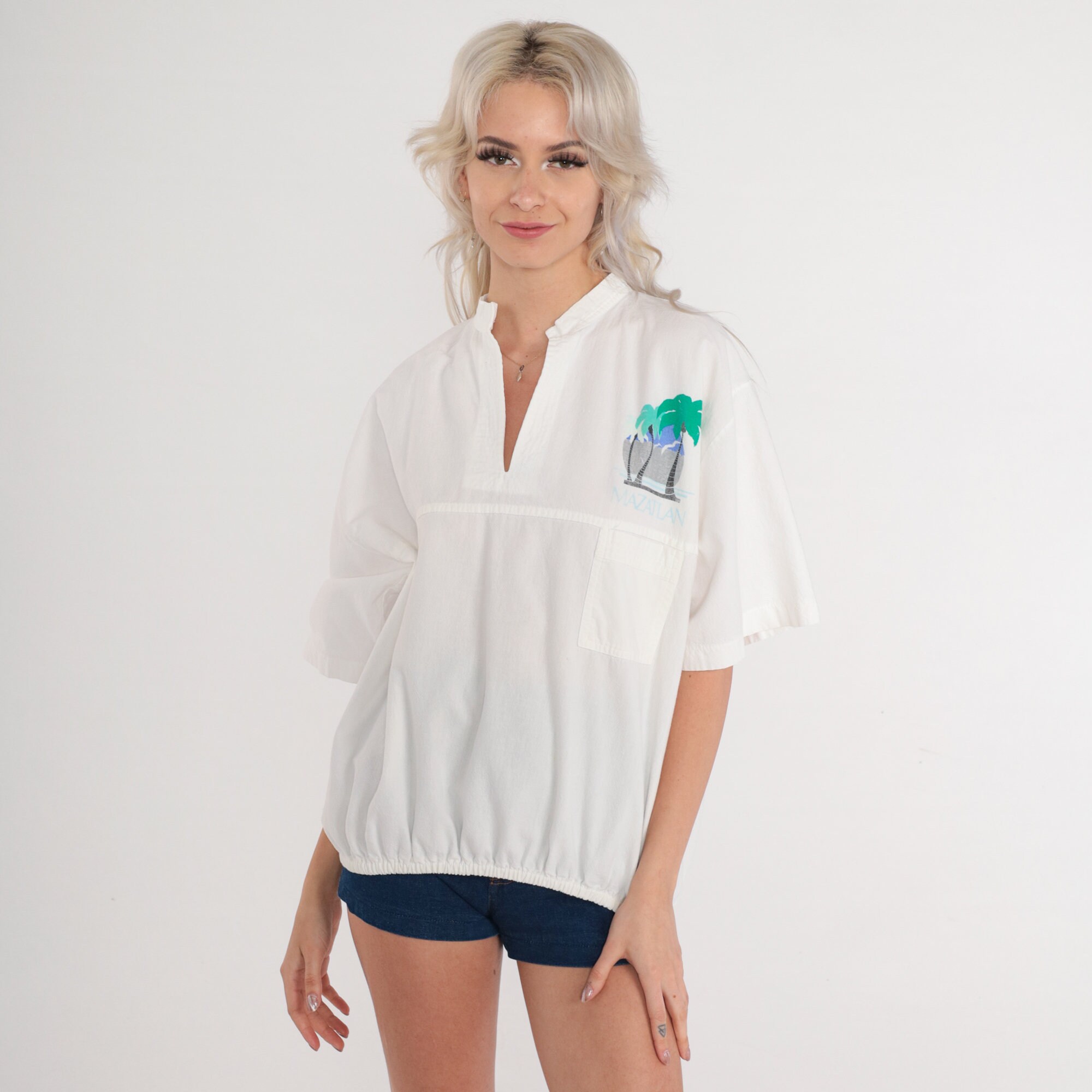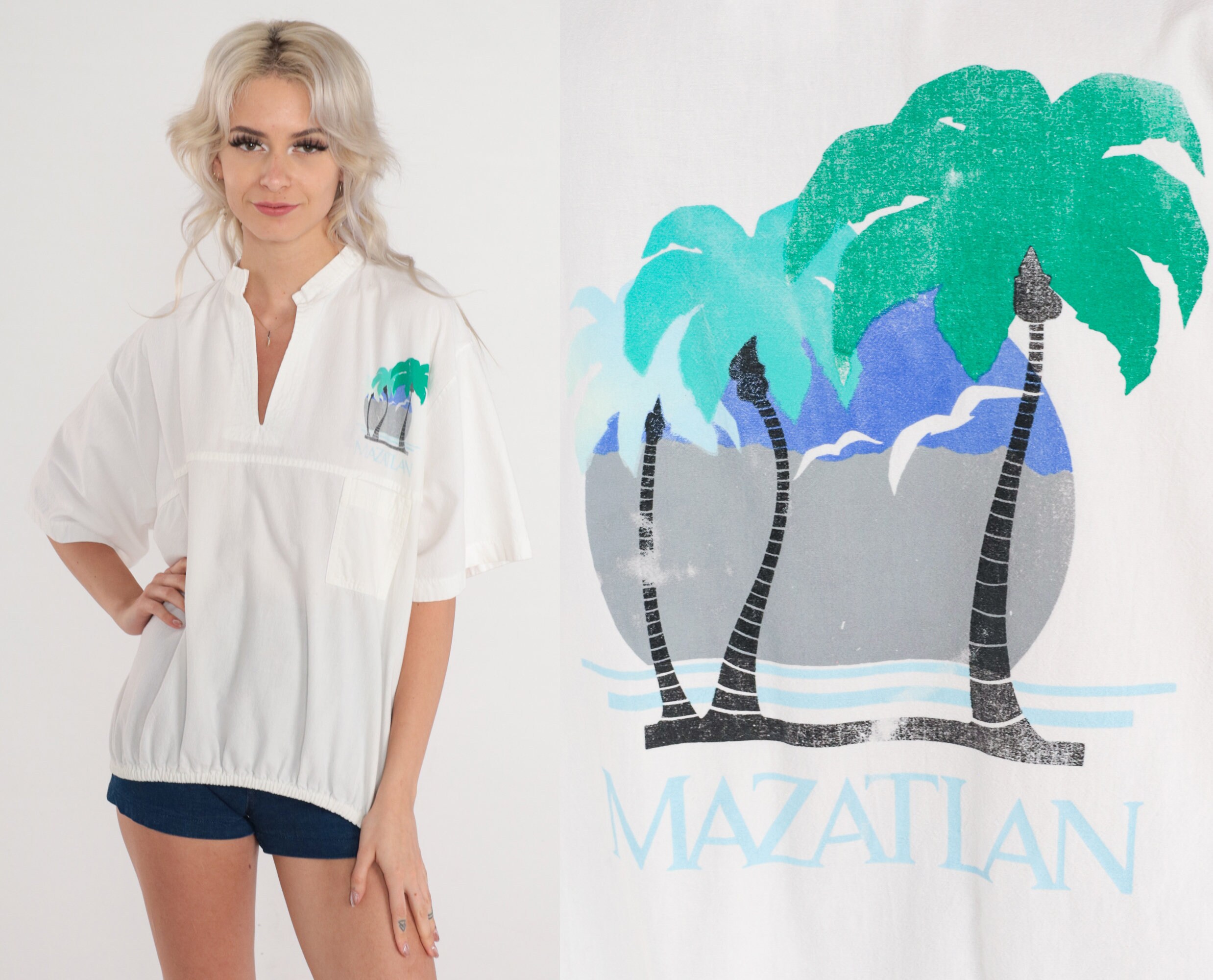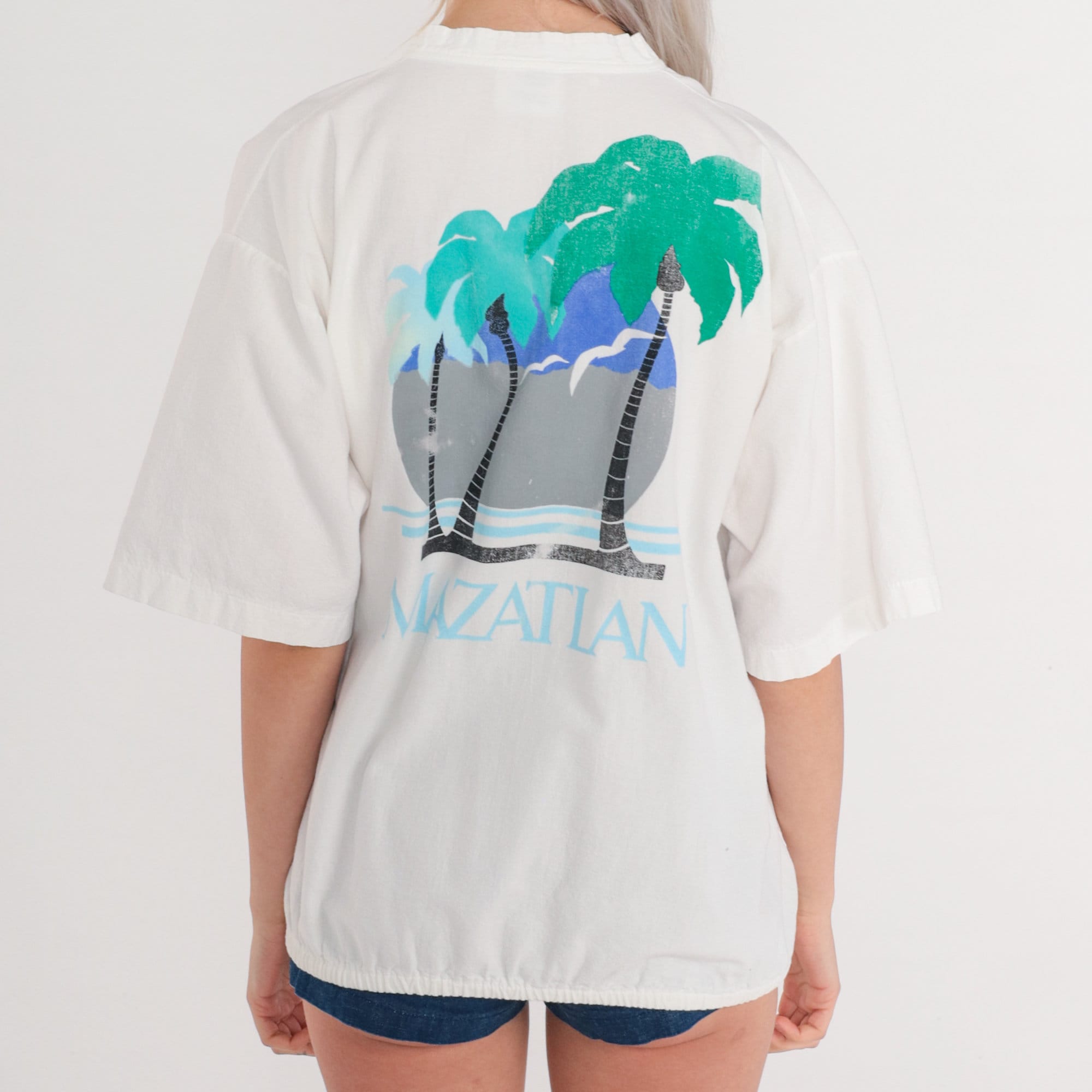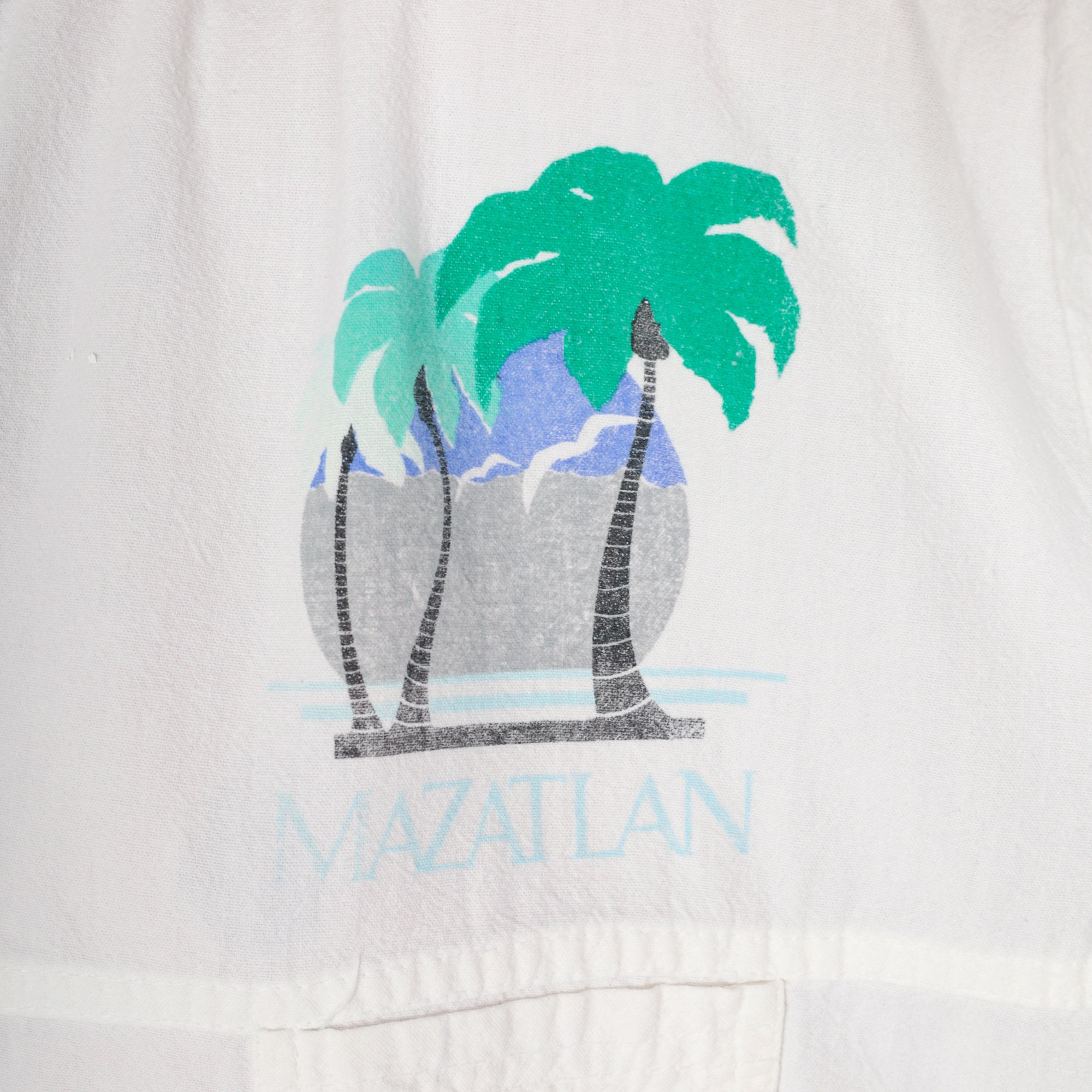 Vintage 90s in white with a palm tree graphic on the chest and back and "Mazatlan" on the chest. Short sleeves, a v neck, and a banded hem.