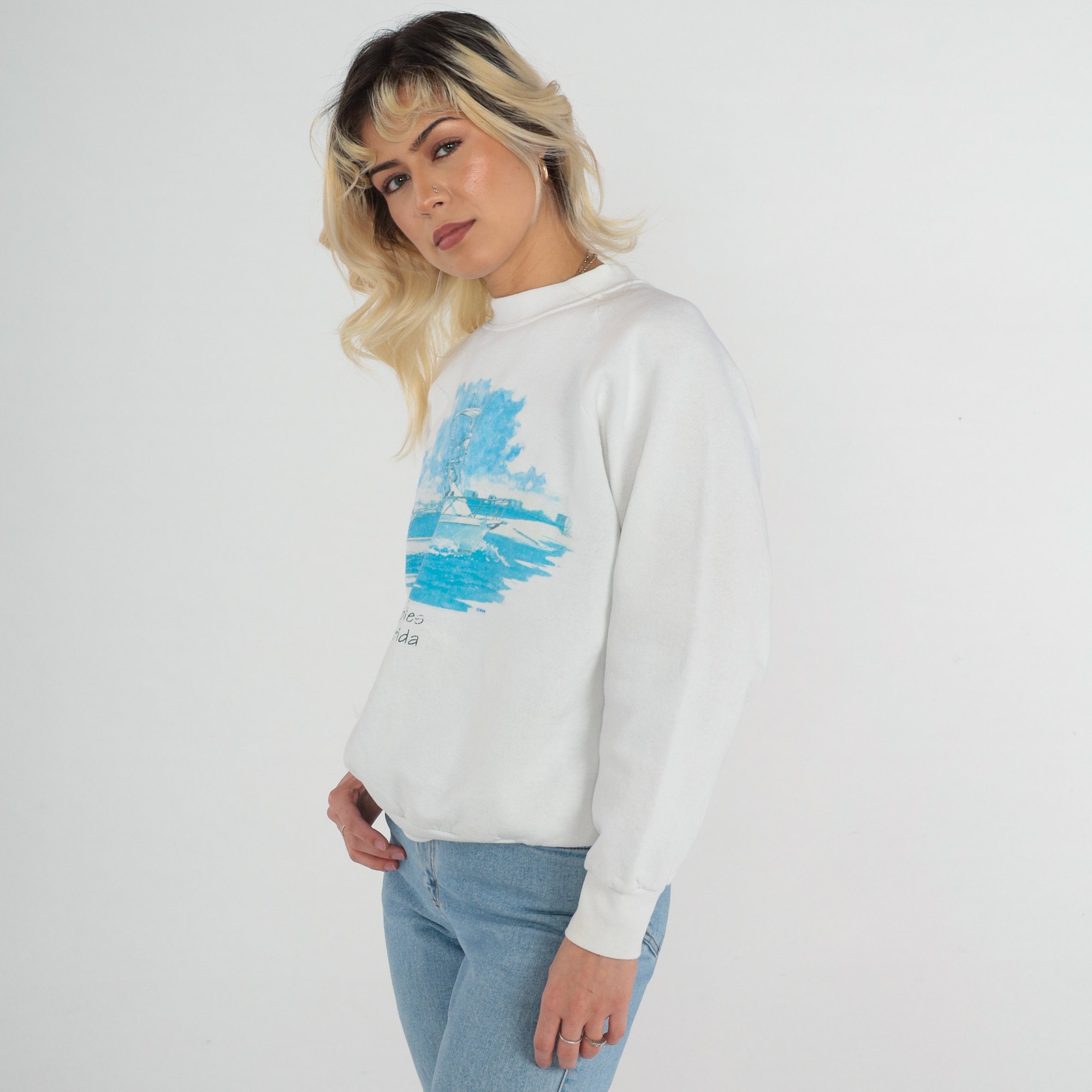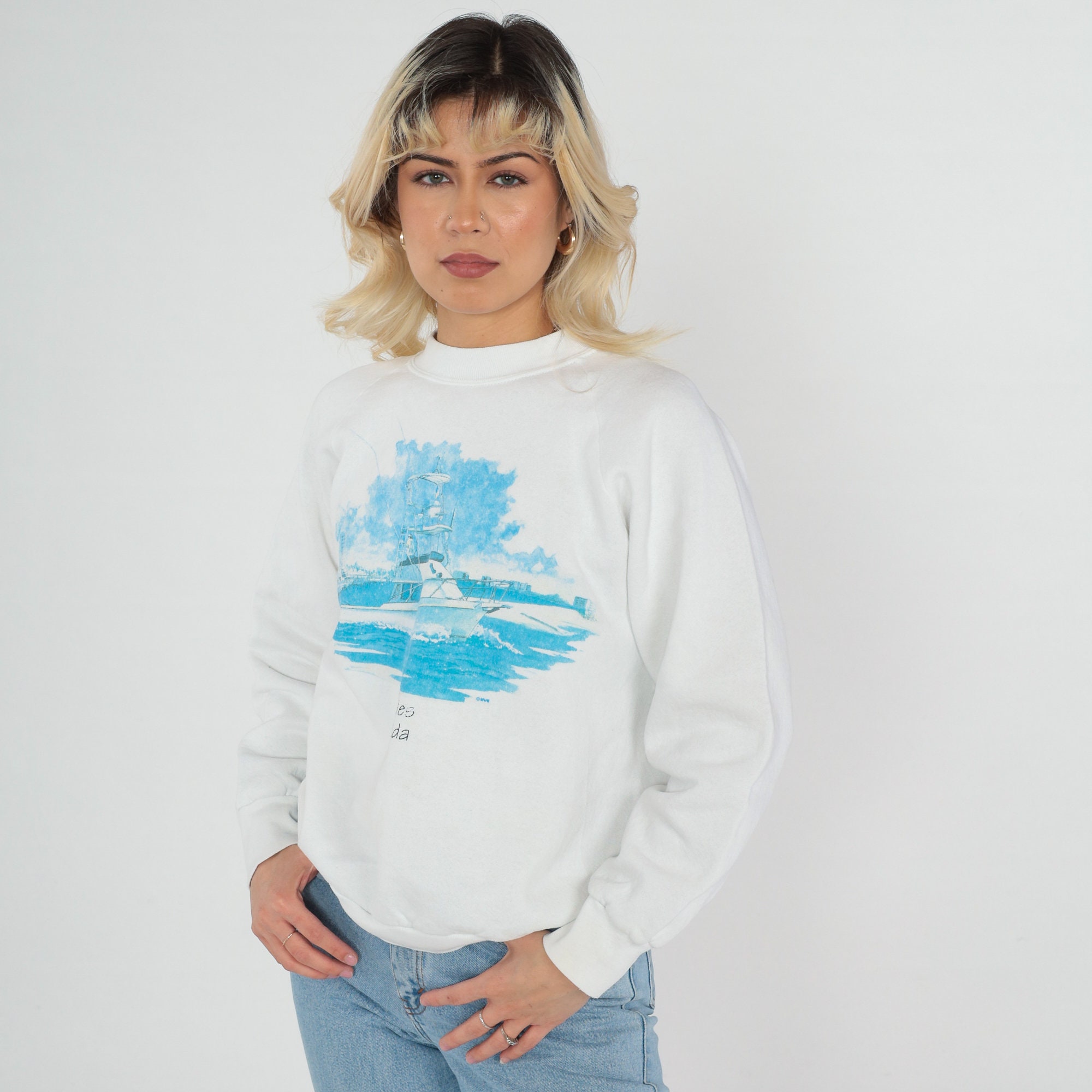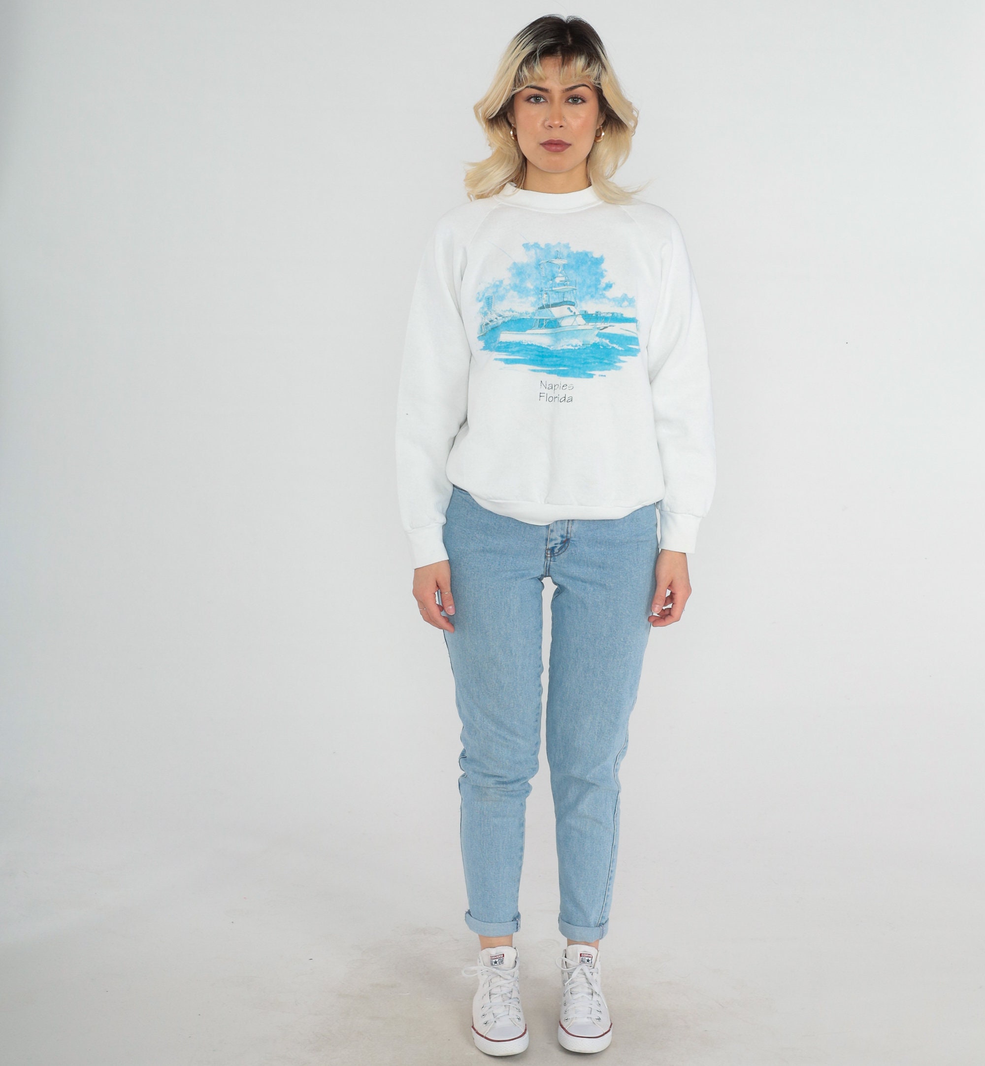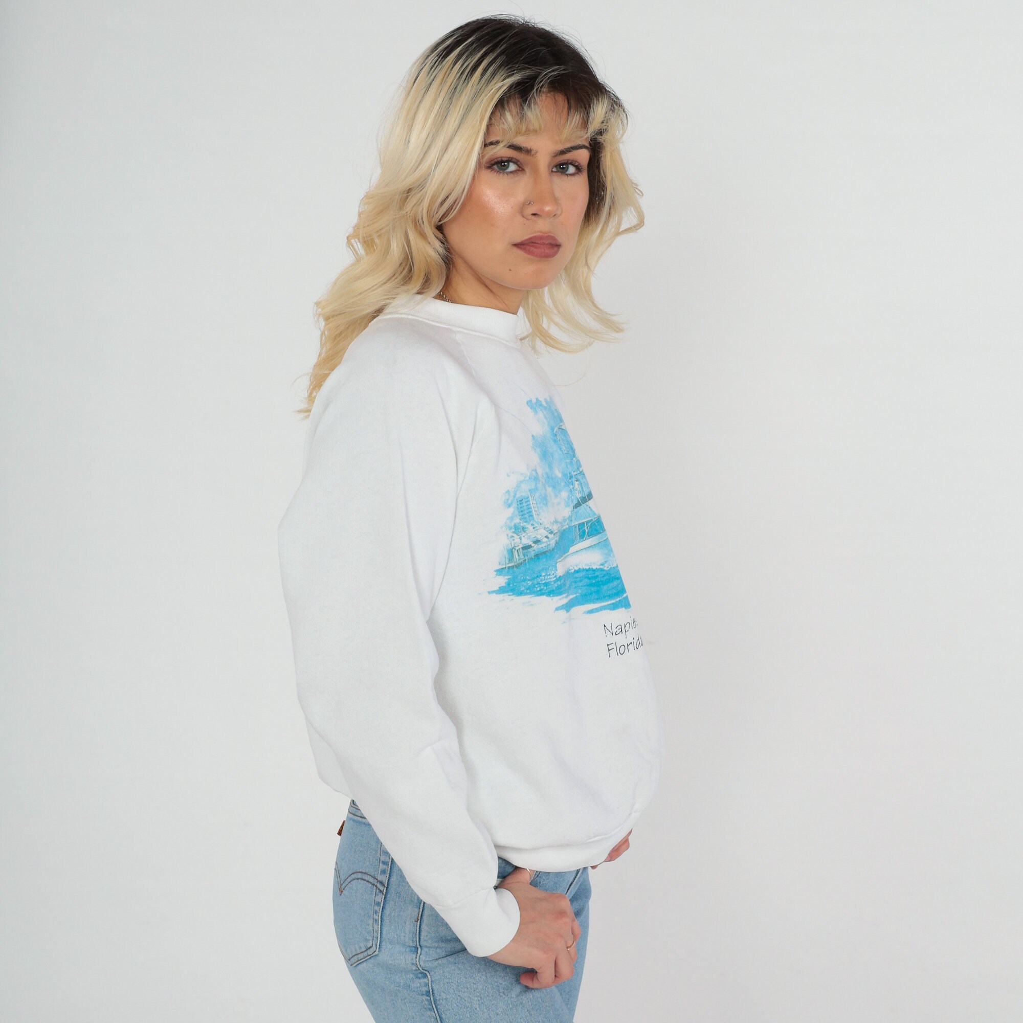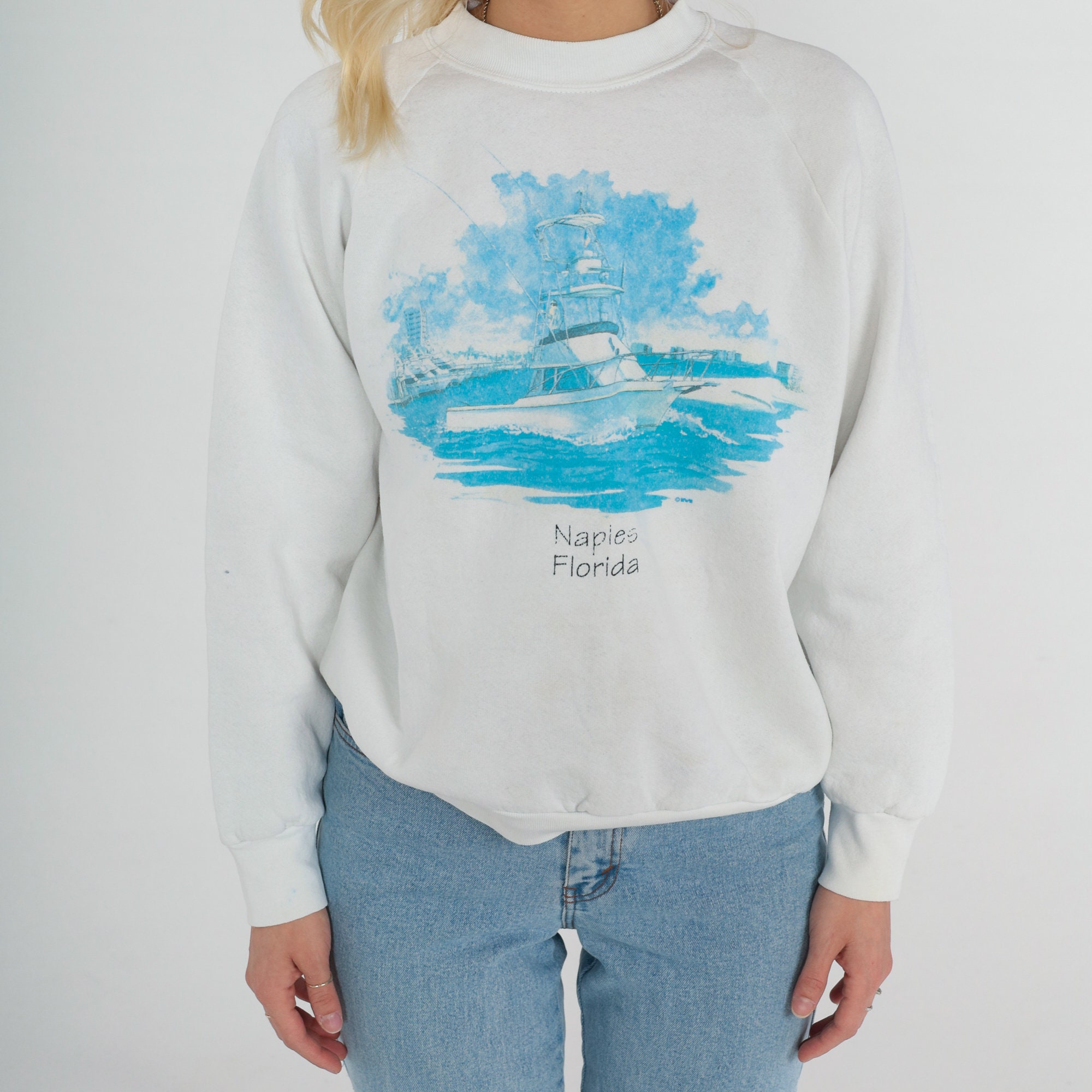 Vintage 90s sweatshirt in white with a boat print and "Naples Florida" on the front. Slouchy fit with raglan sleeves.