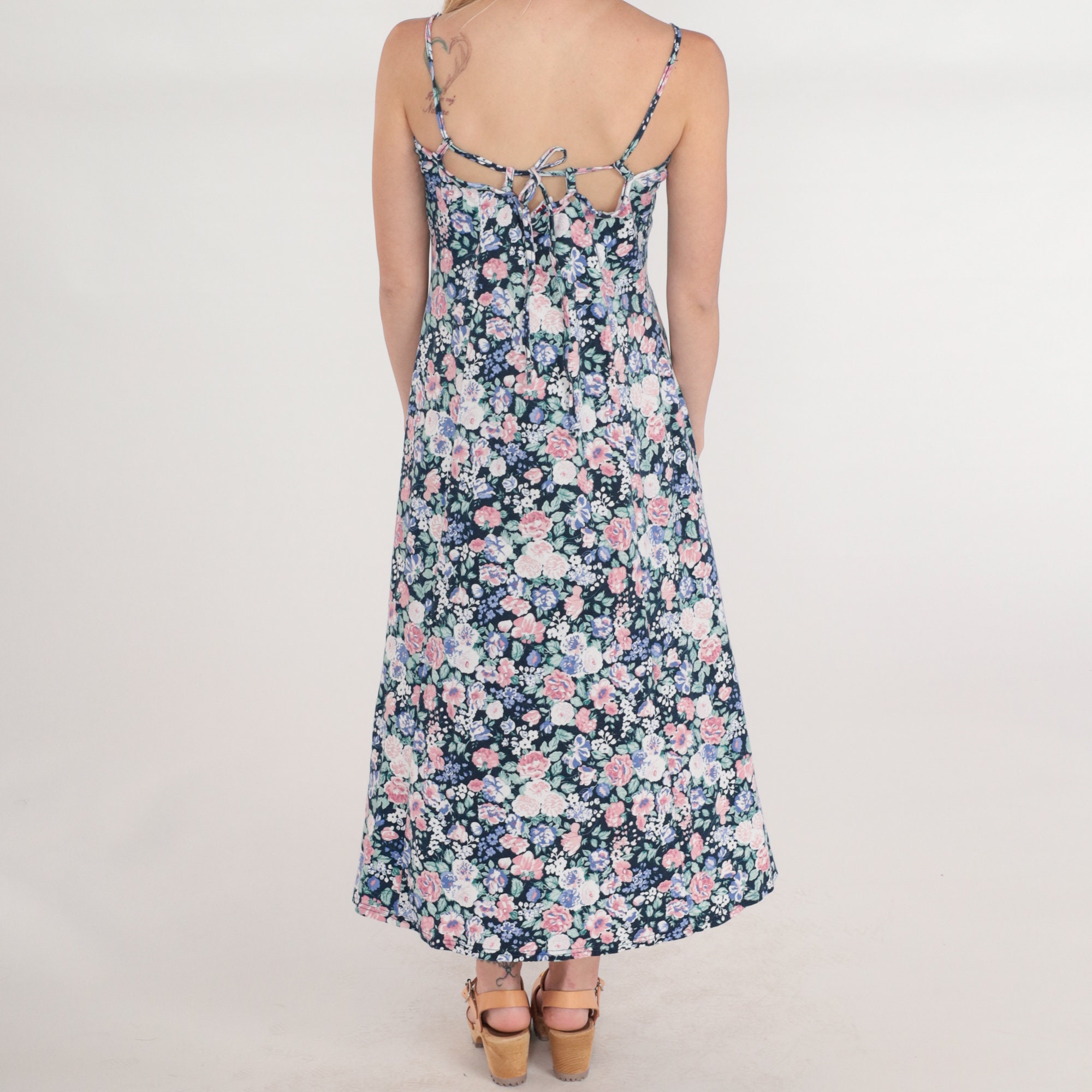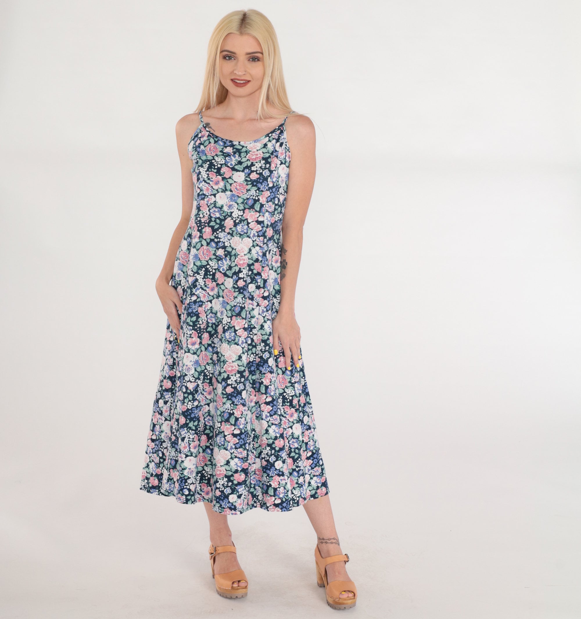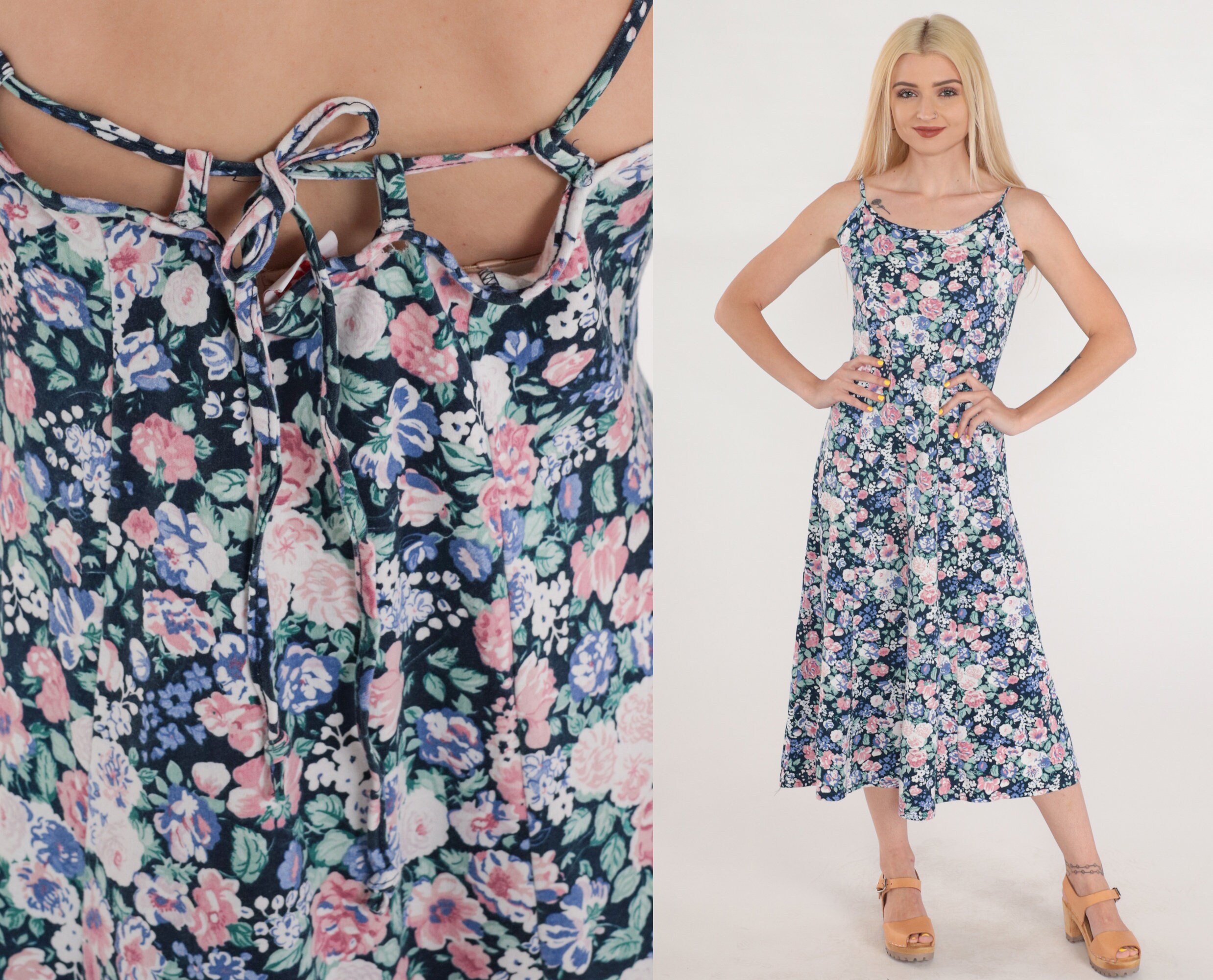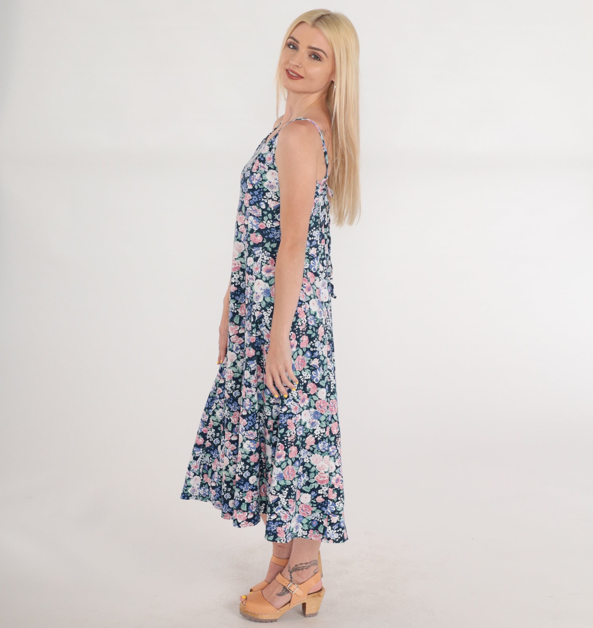 Vintage 90s dress in a floral print. Sleeveless with an empire waist and a tie in the back; midi length.