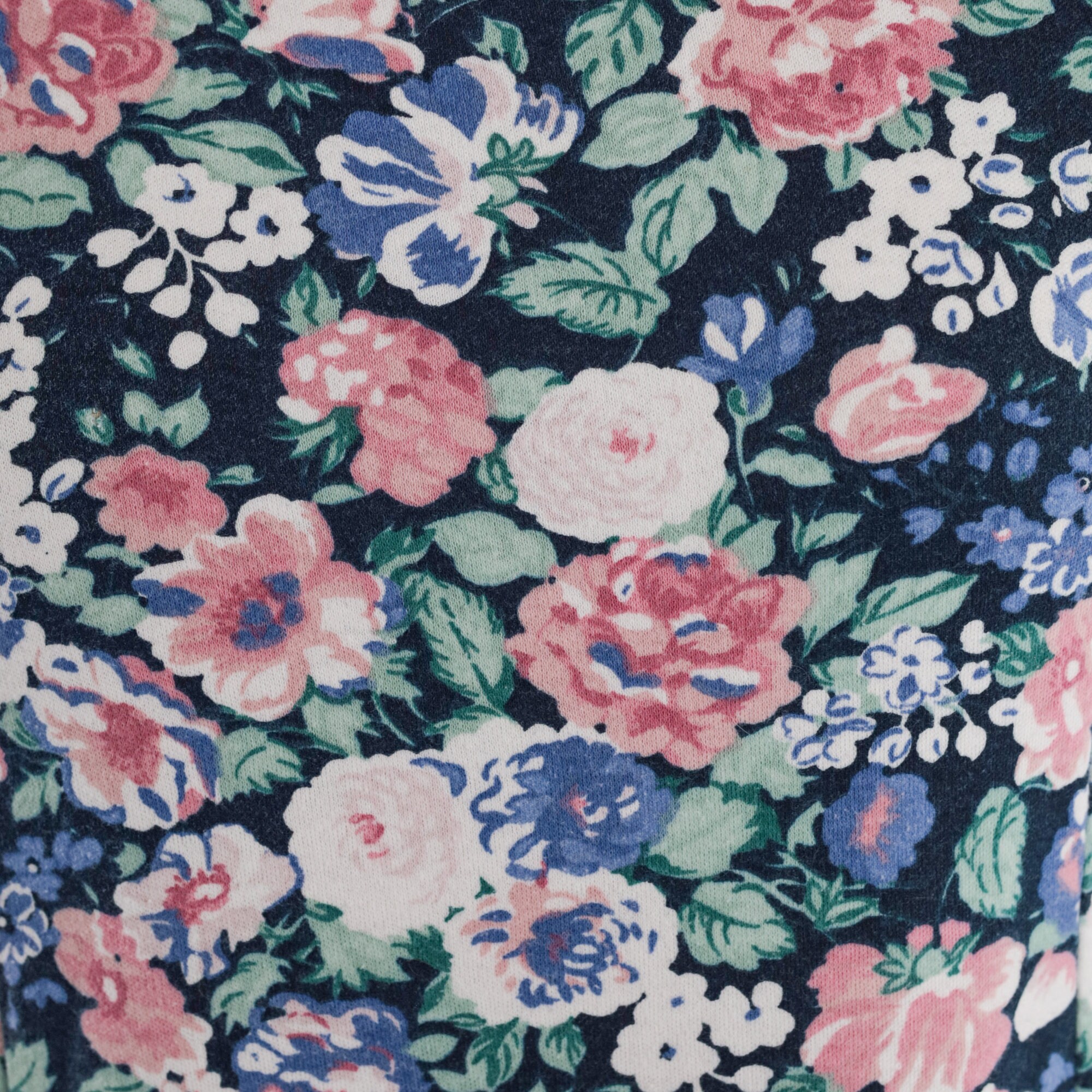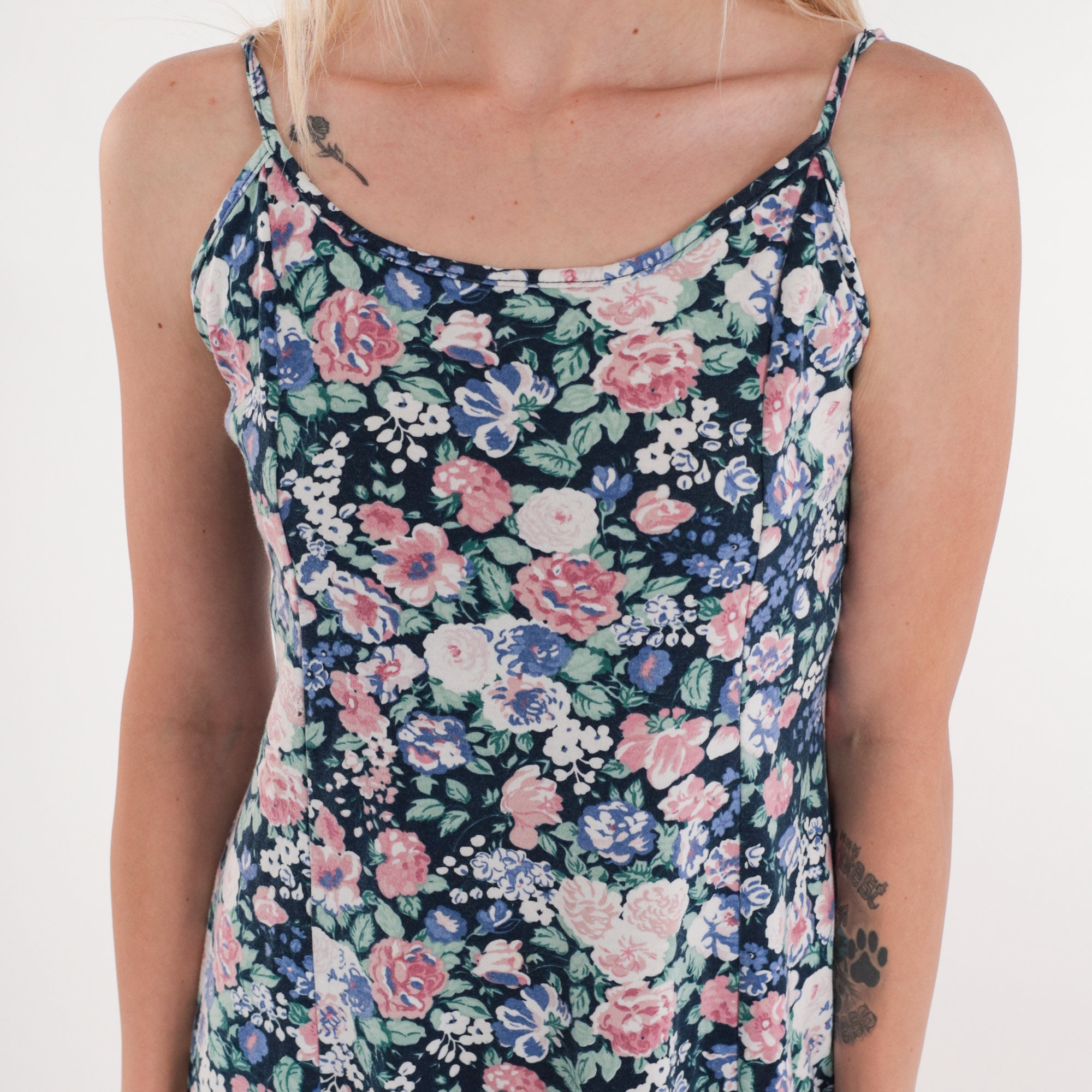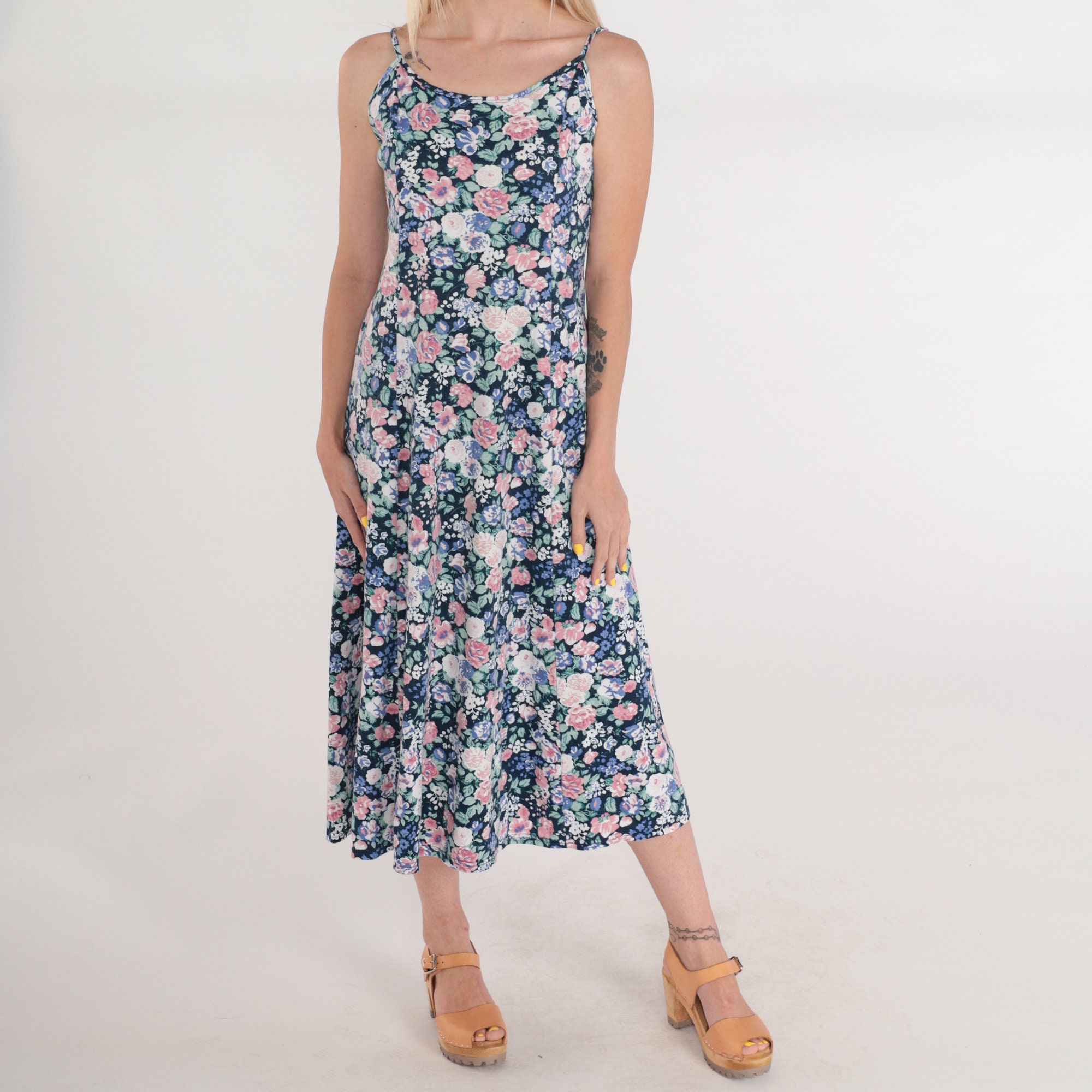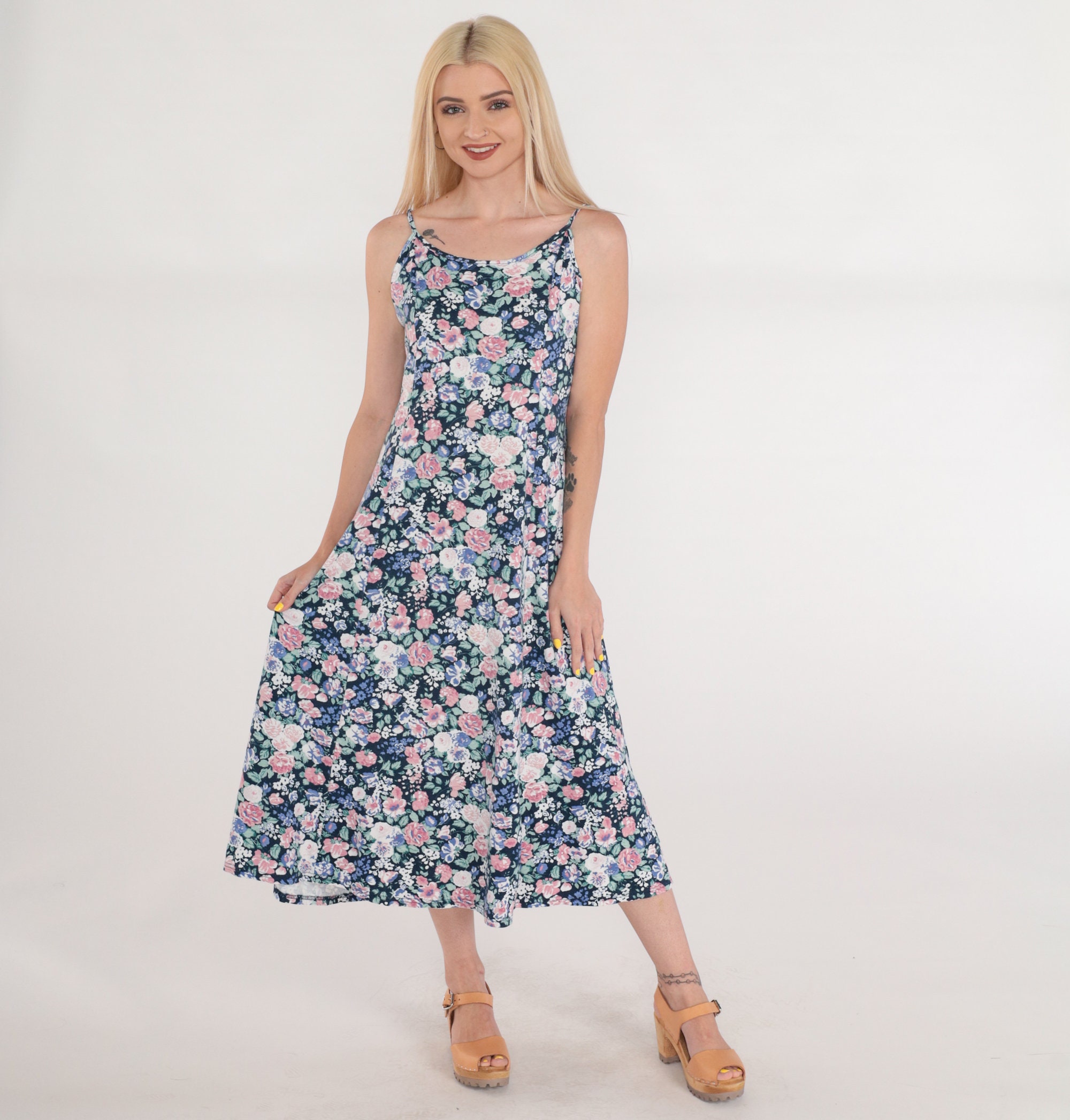 Vintage 90s dress in a floral print. Sleeveless with an empire waist and a tie in the back; midi length.
