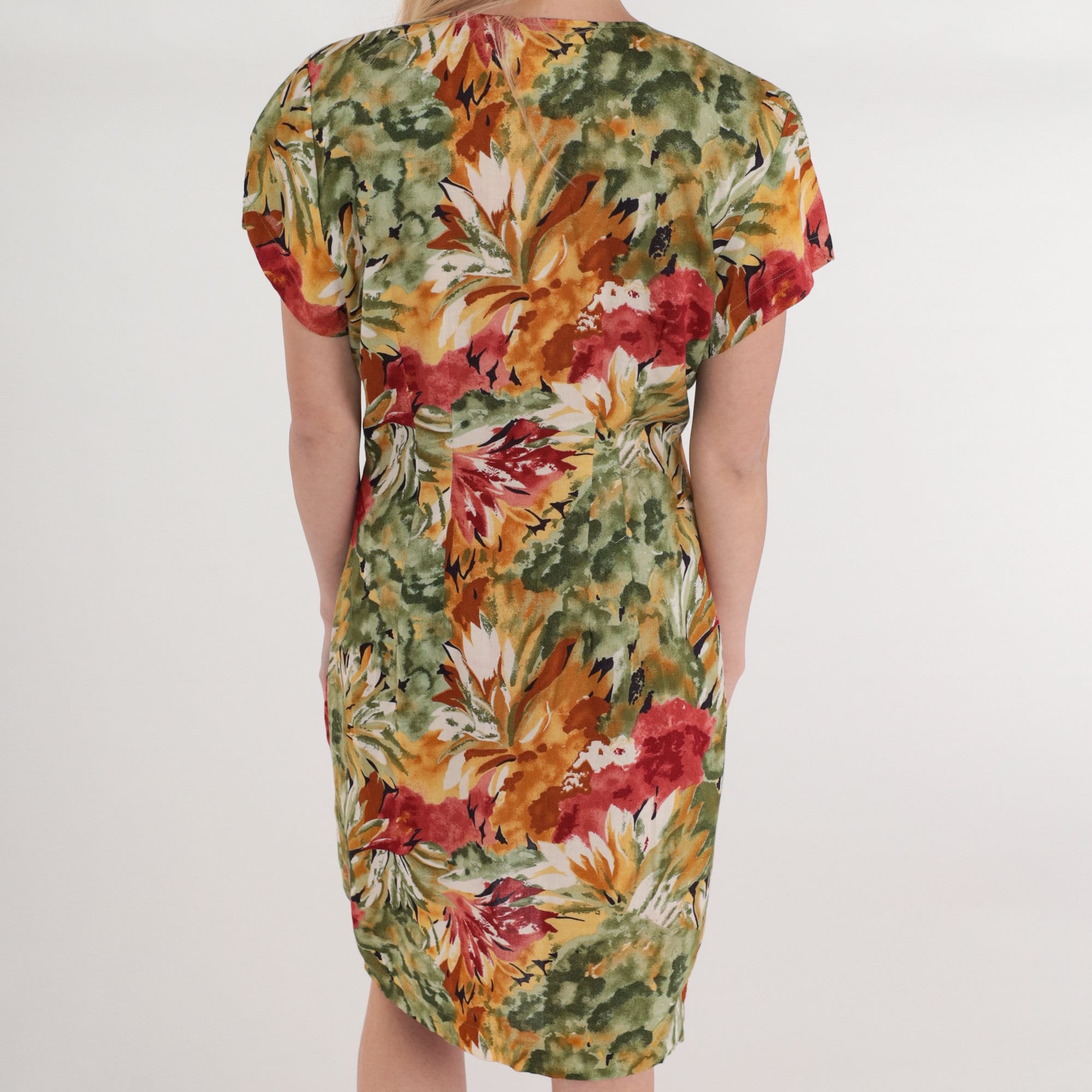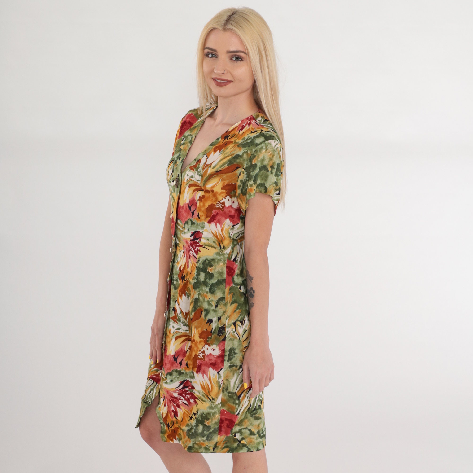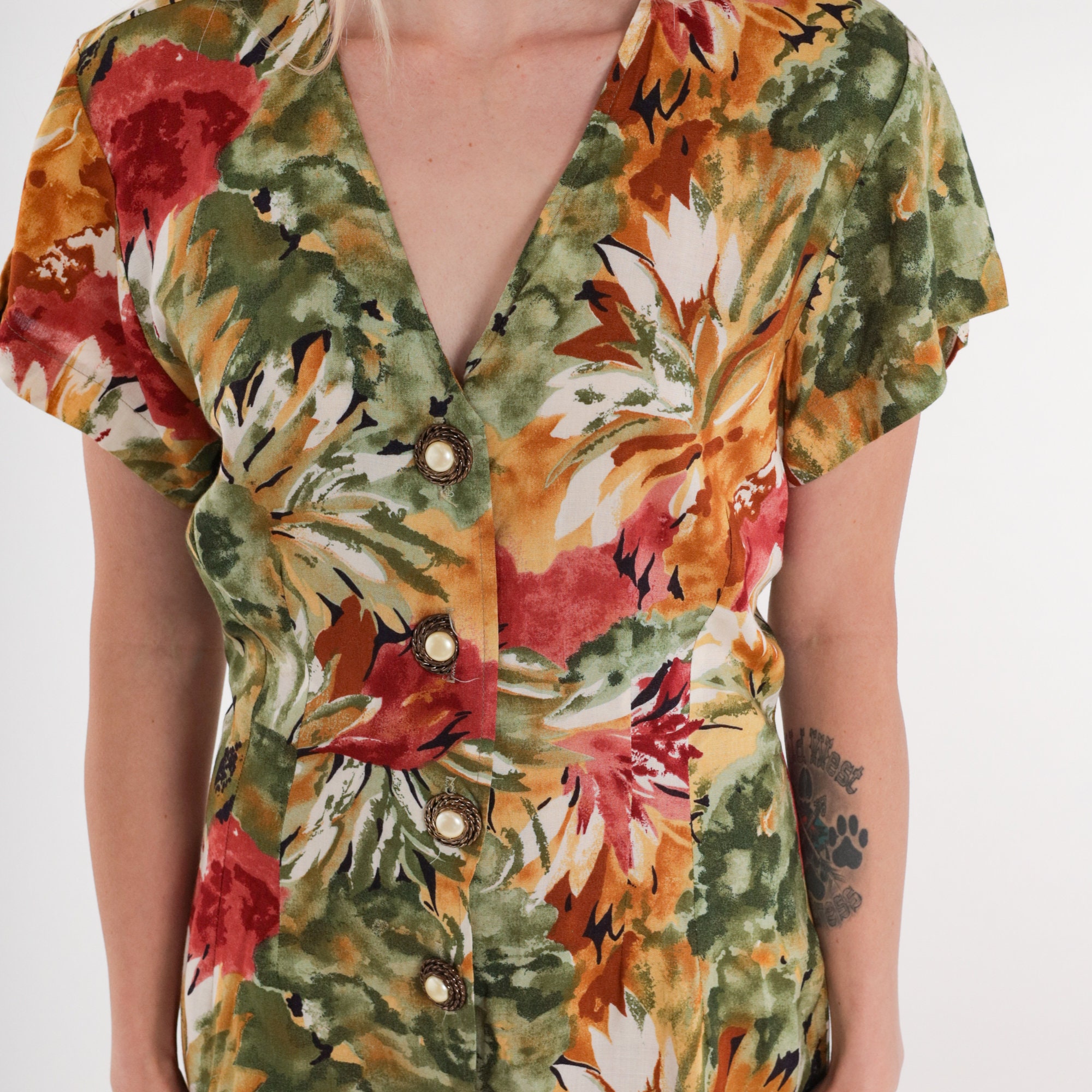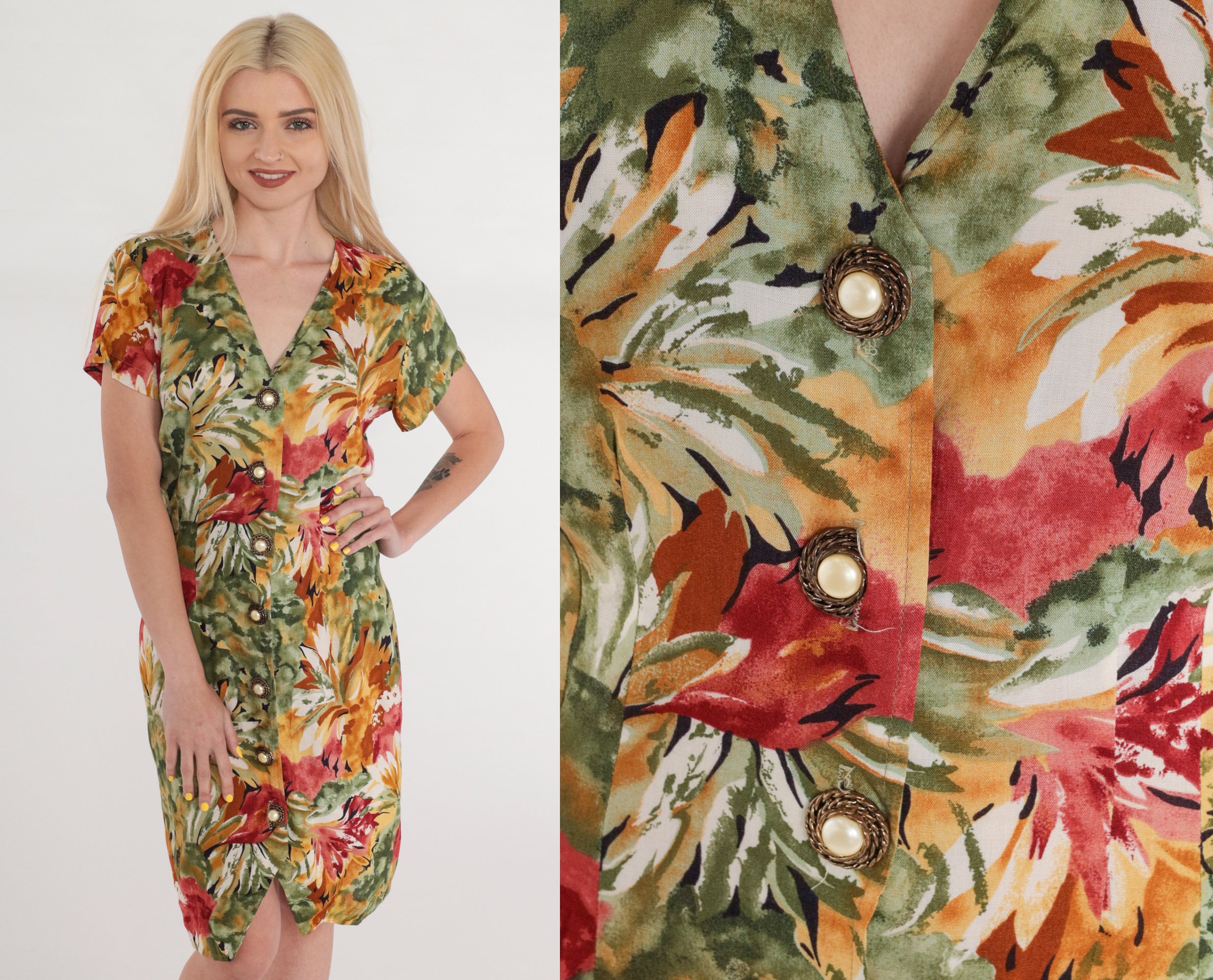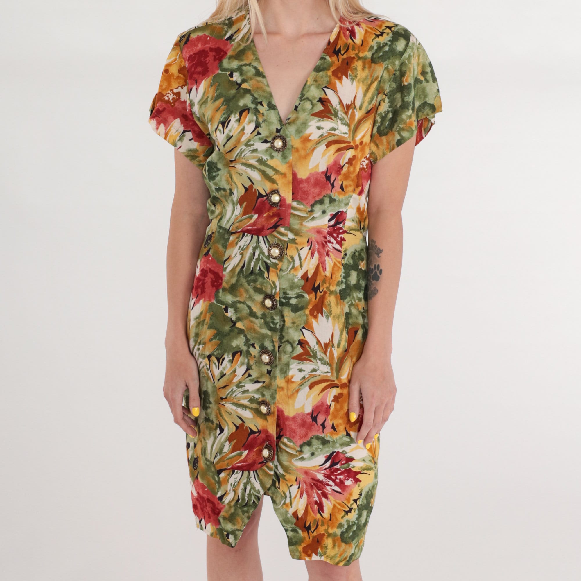 Vintage 90s dress in a floral print. It has short sleeves, a v neck, buttons down the front, and a sheath cut. Mini length.