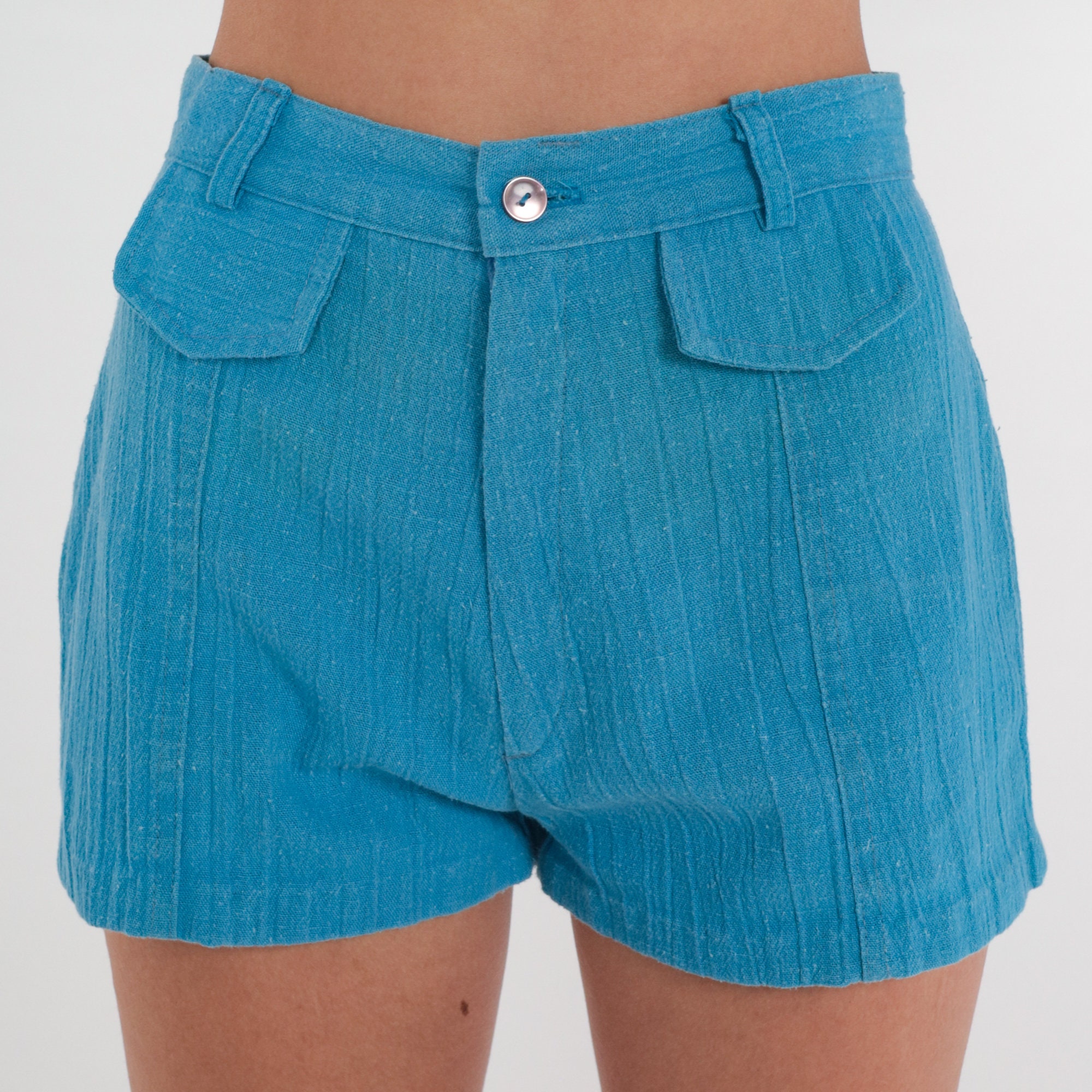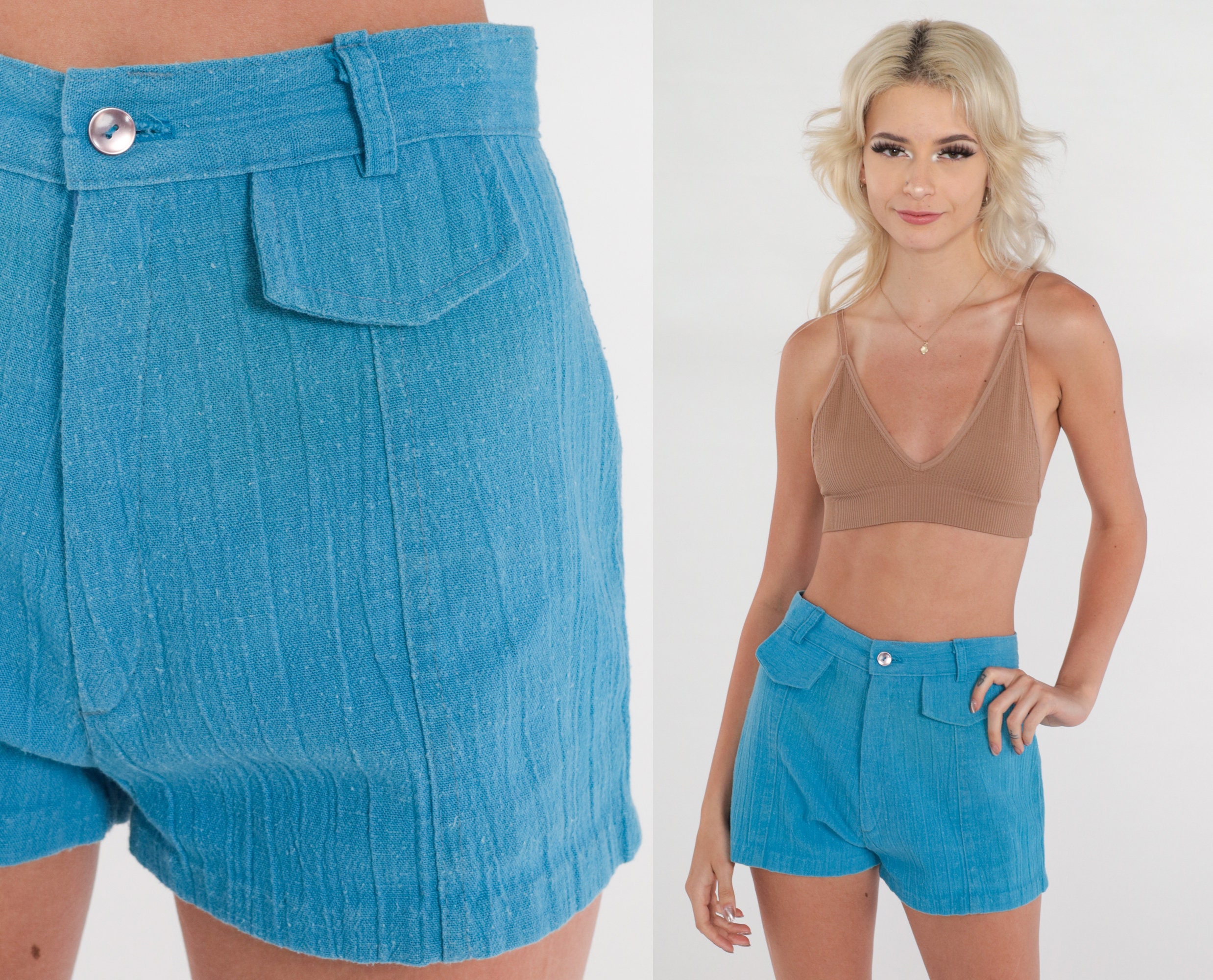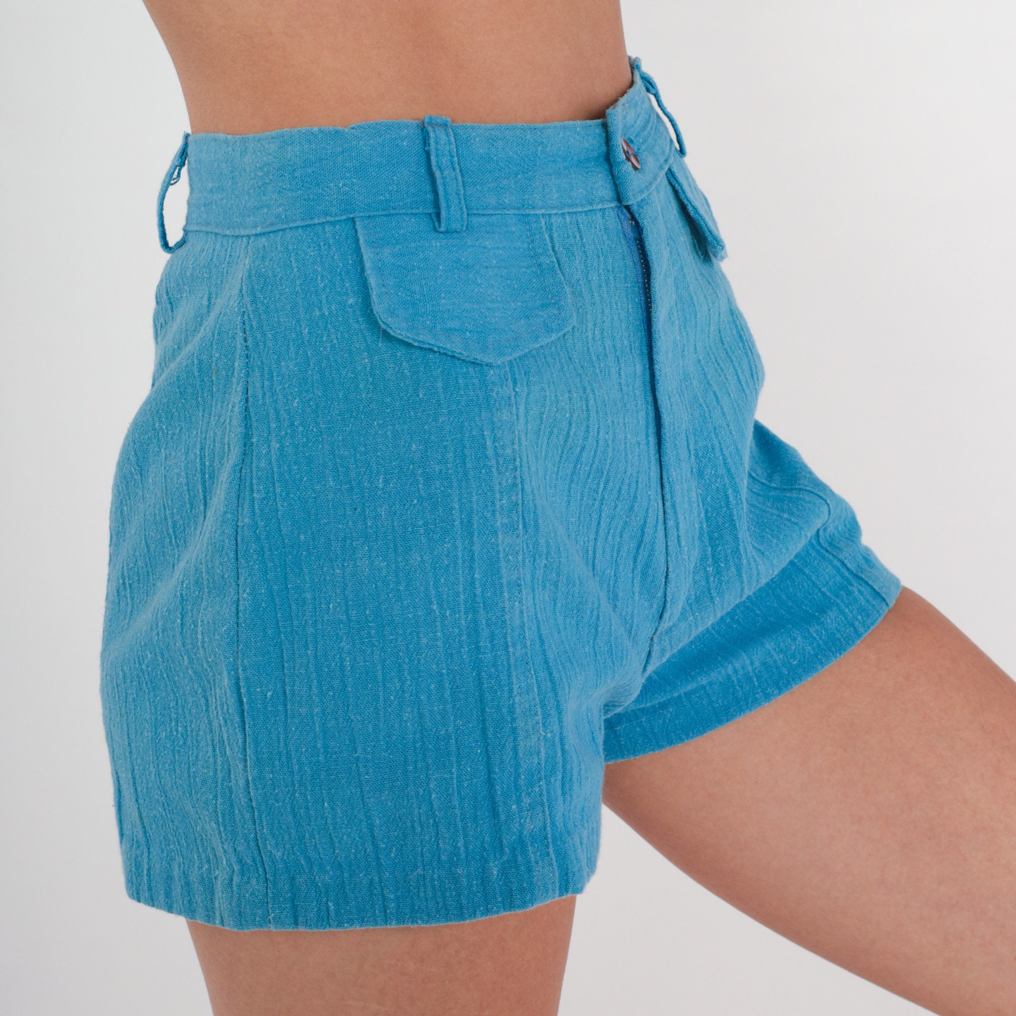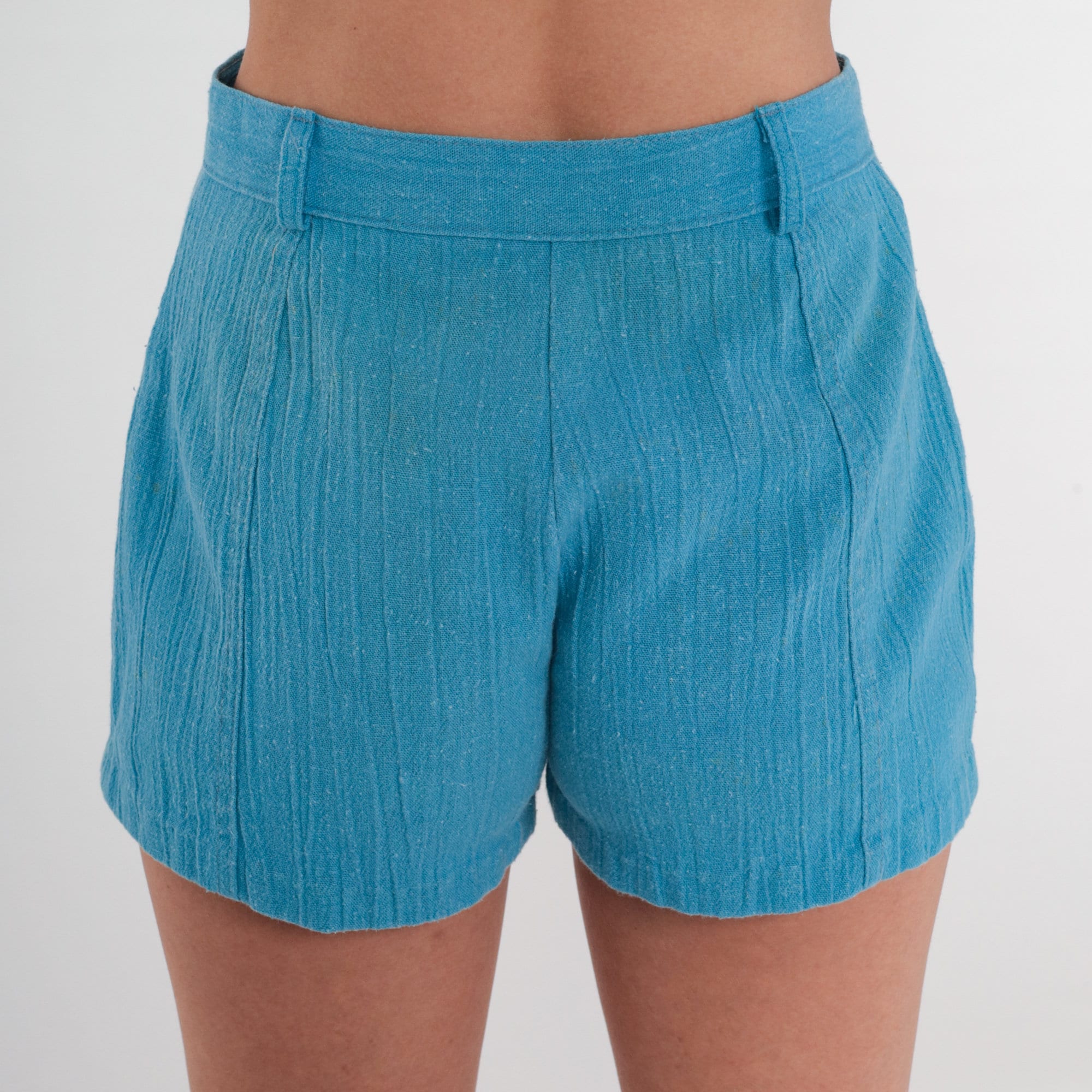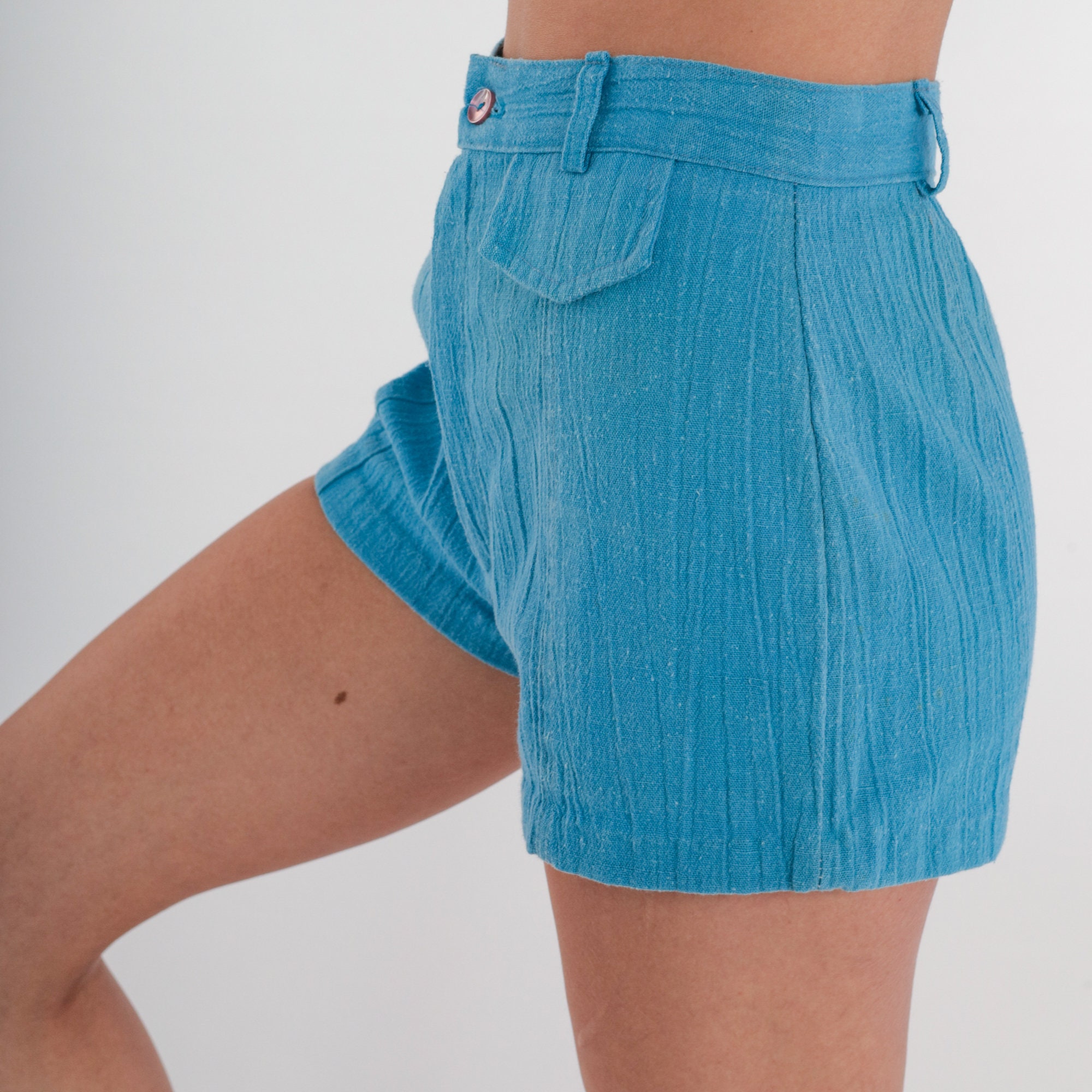 Vintage 70s shorts in crinkled blue with a high rise and pockets.