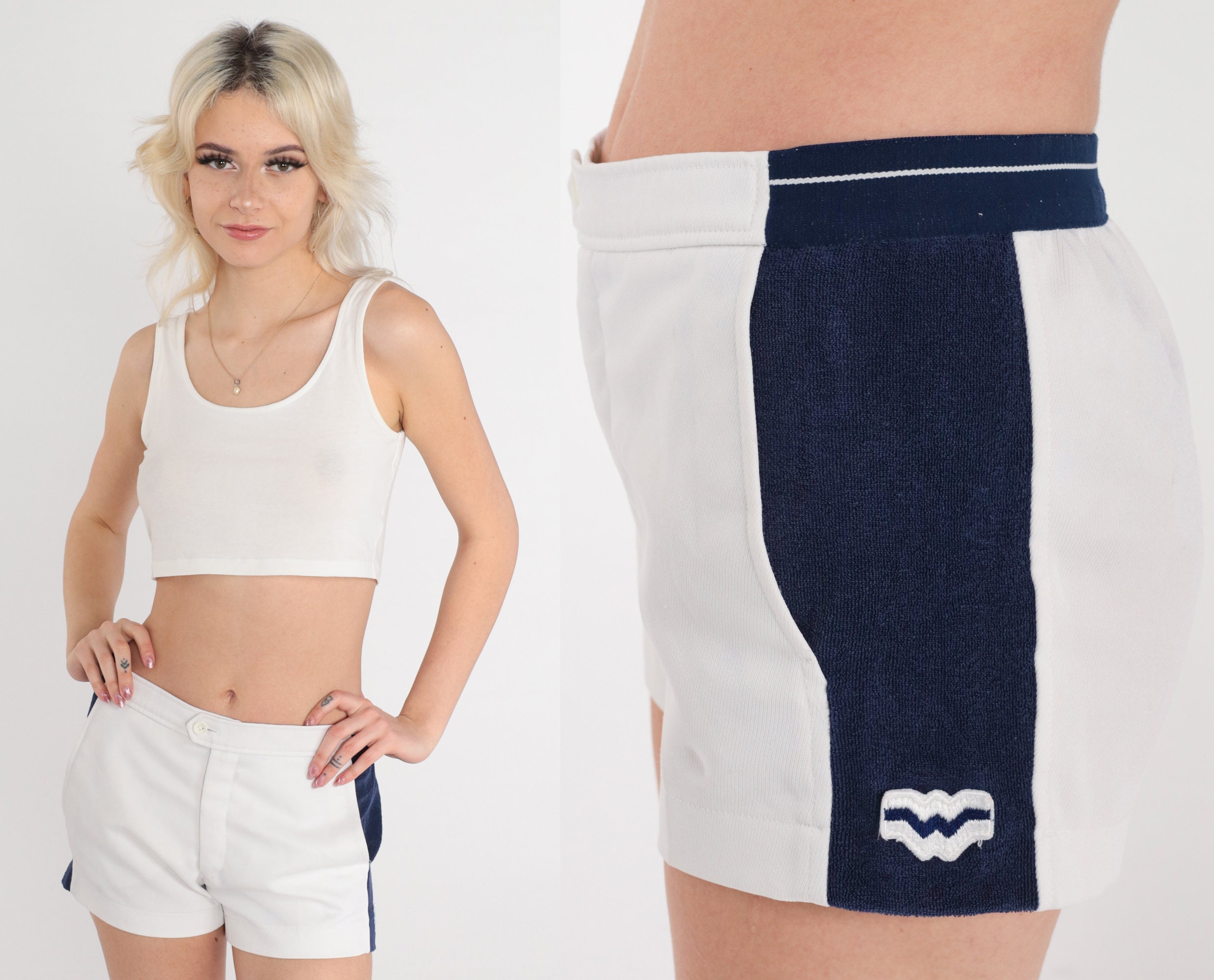 Vintage 80s tennis shorts by in white with navy blue stripes on the sides. Mid rise.