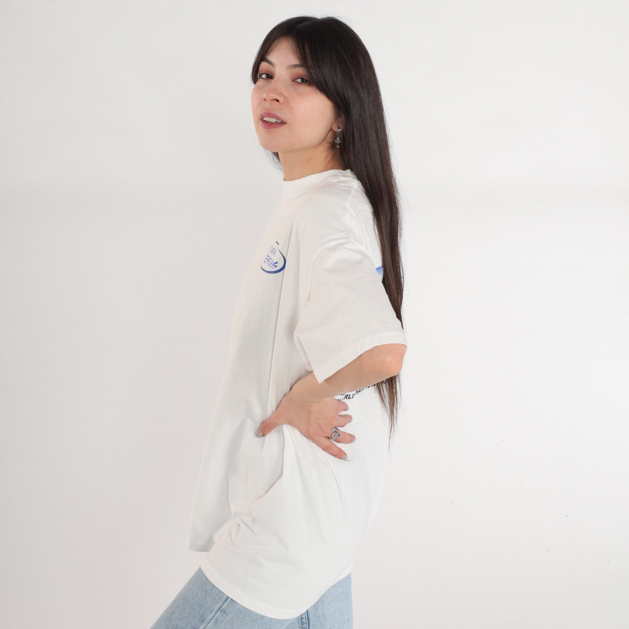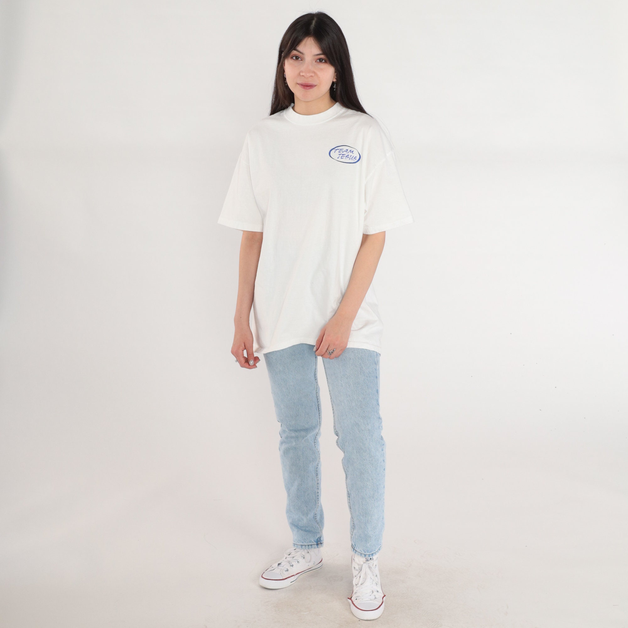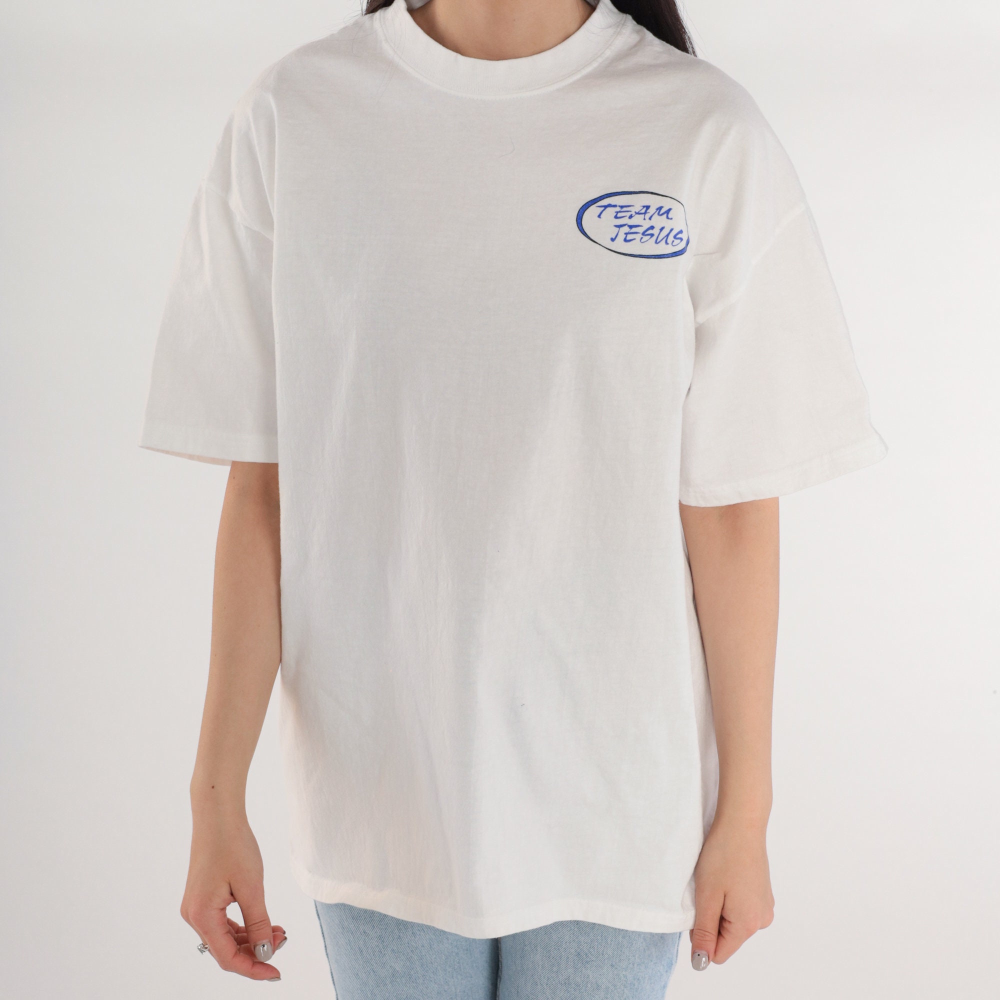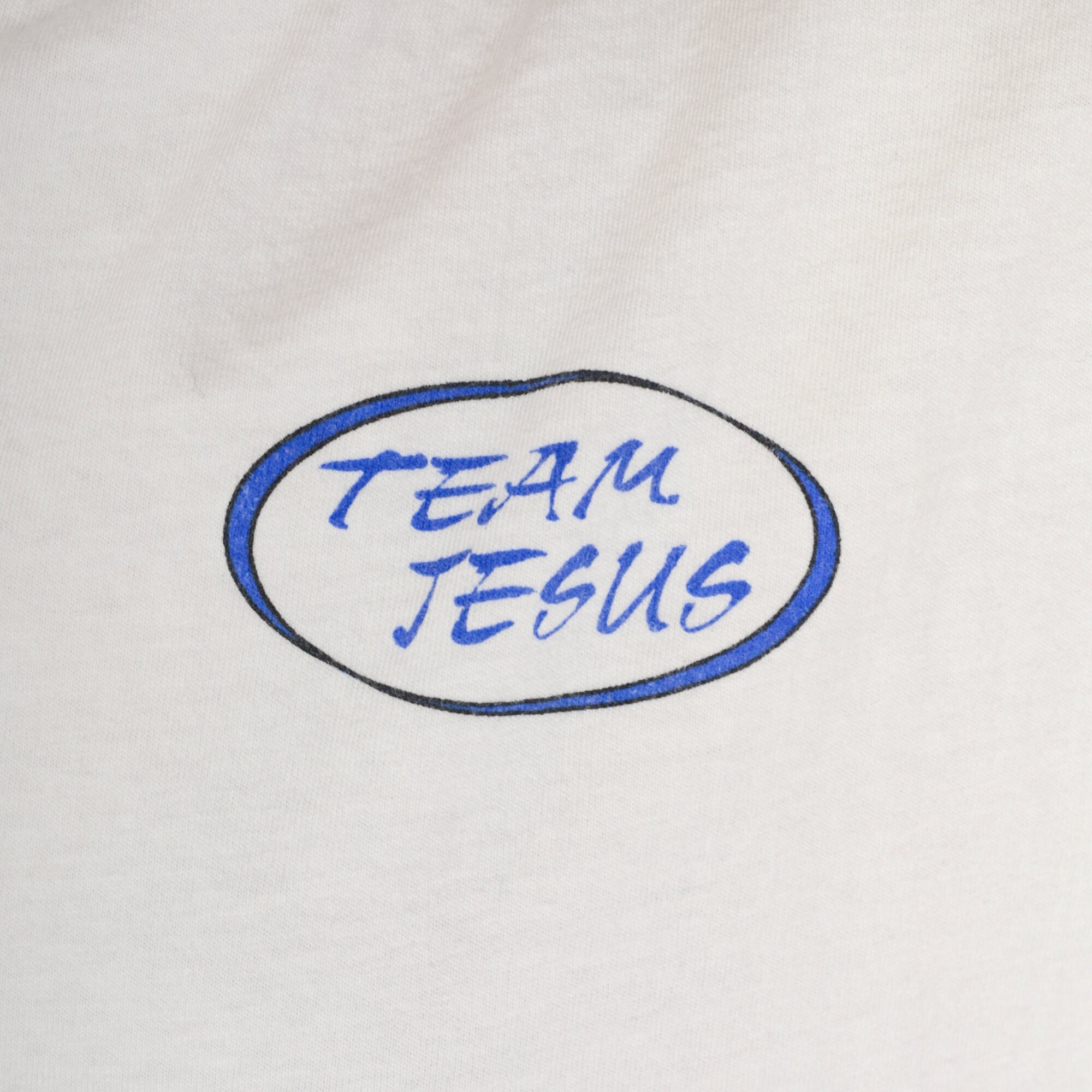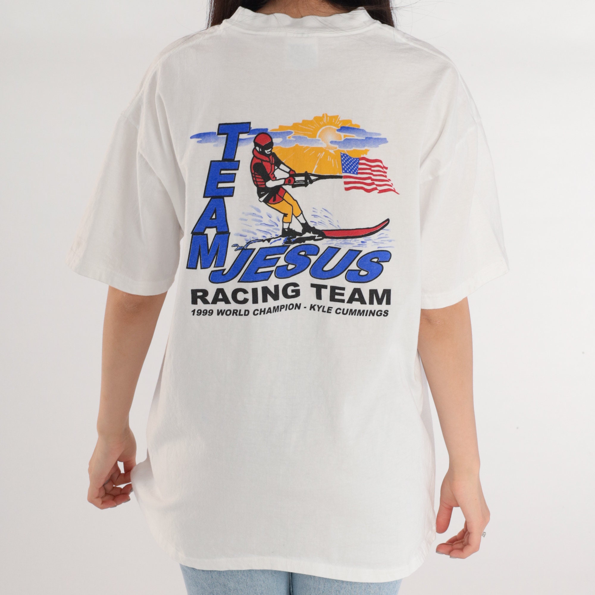 Vintage 90s t-shirt in white with a Team Jesus Water Skiing graphic on the chest and the back.