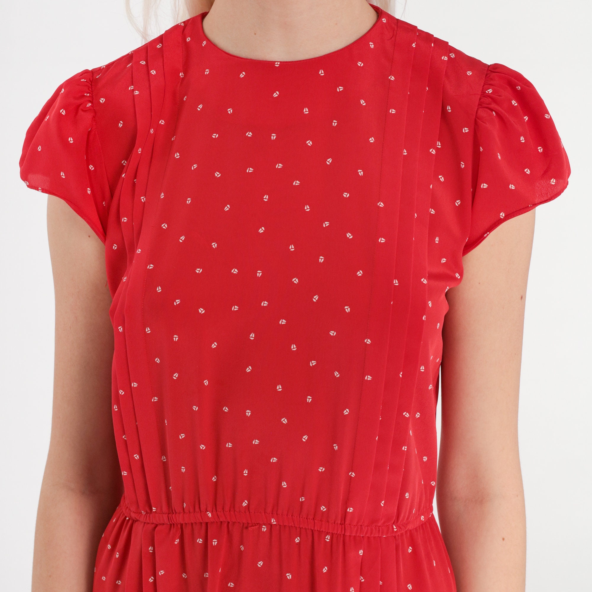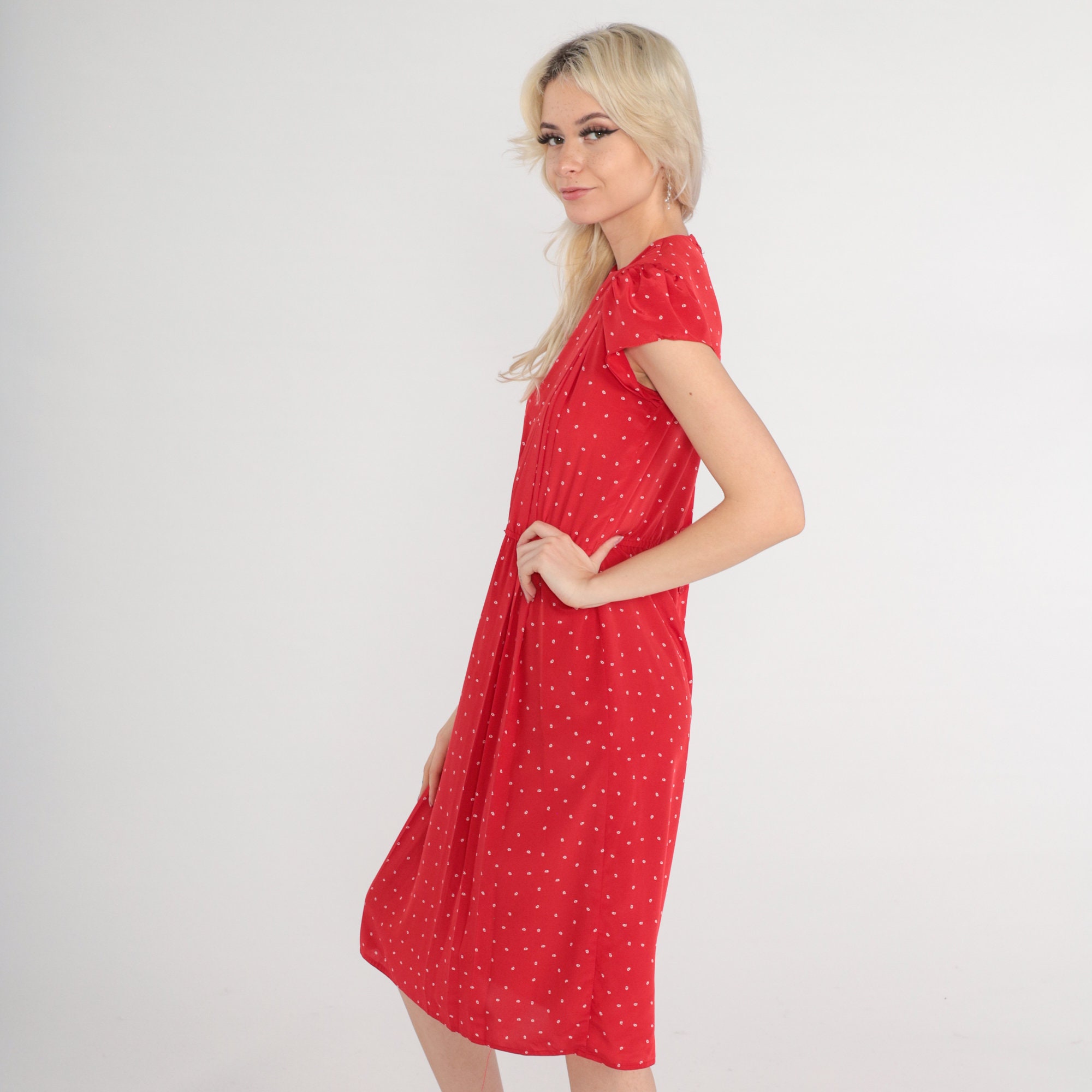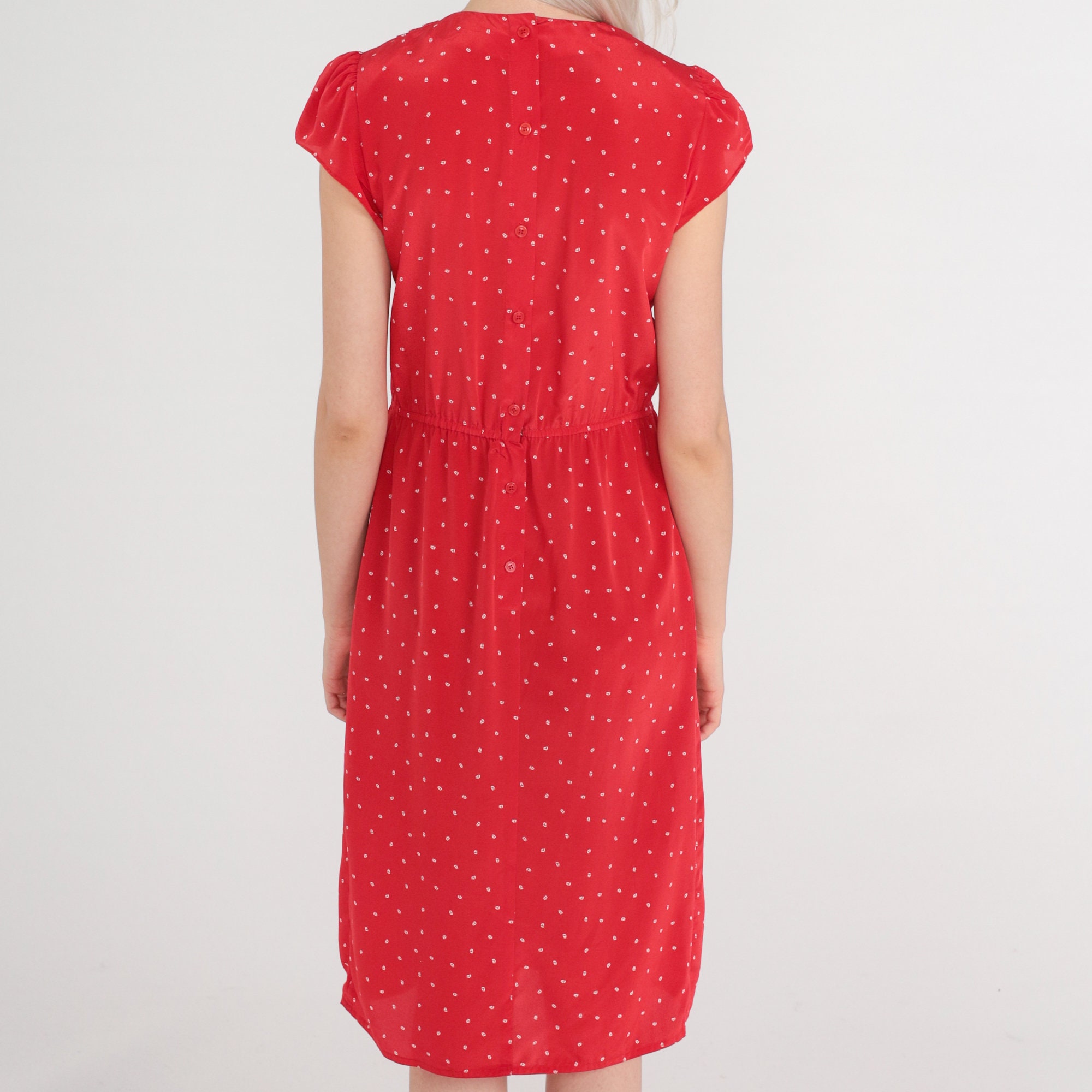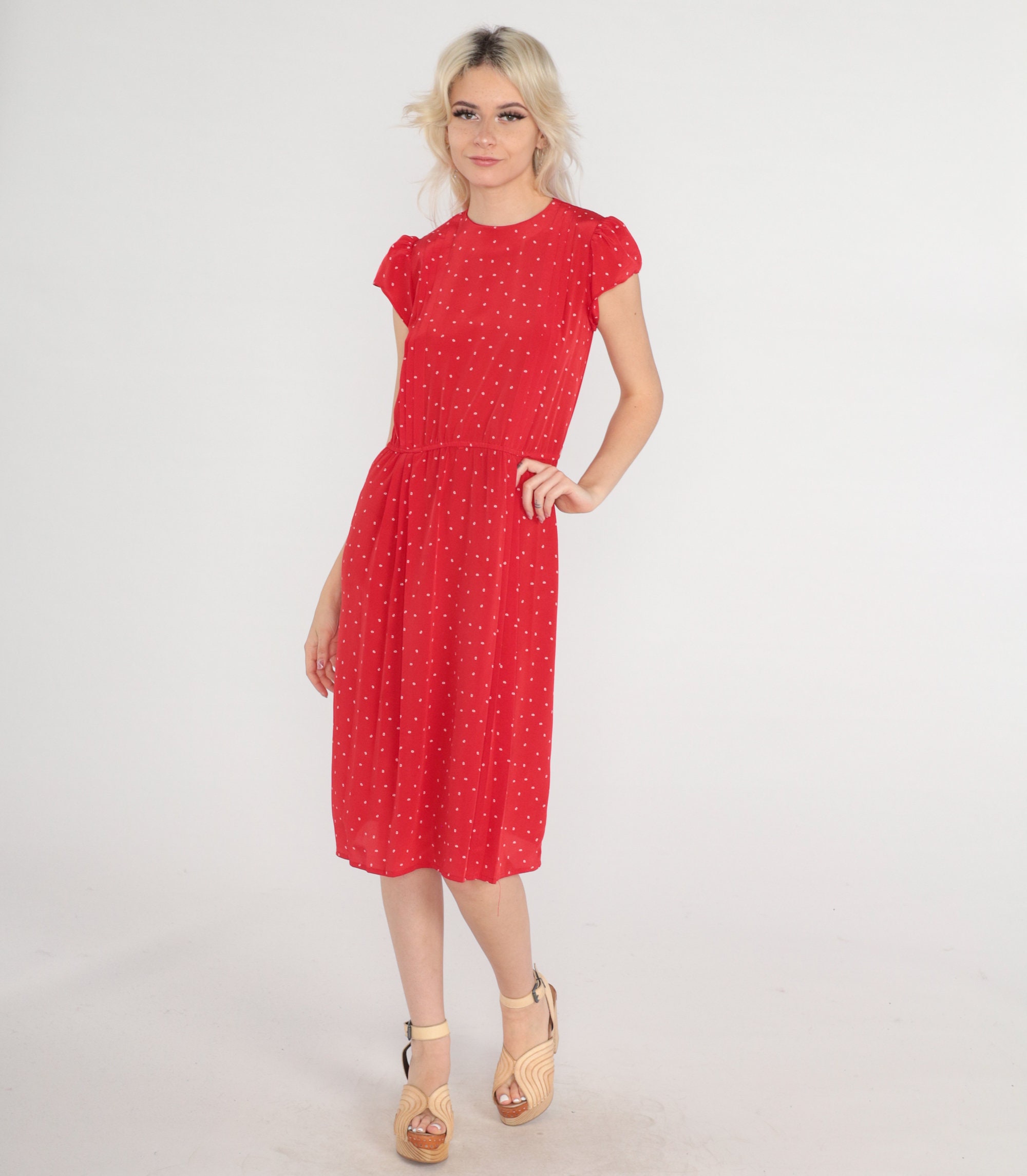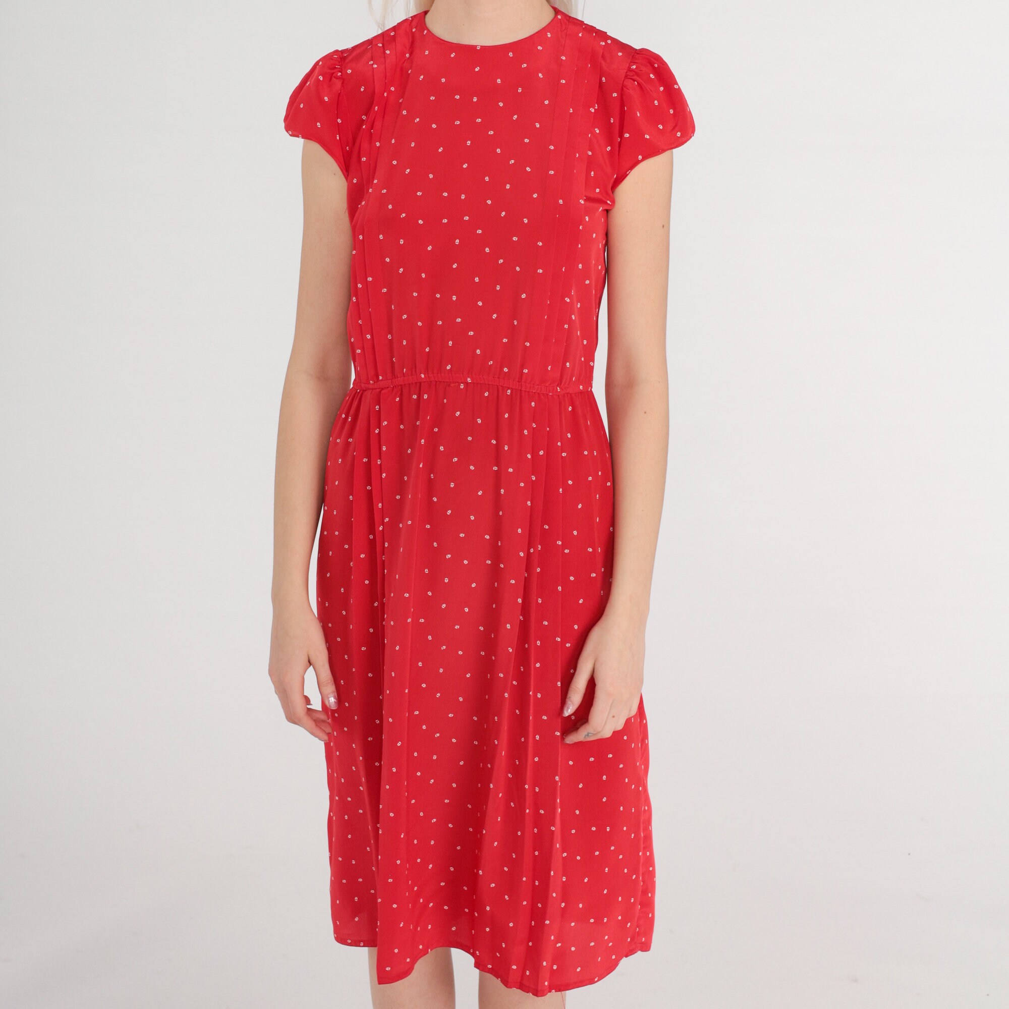 Vintage 80s dress in red with a tiny sailboat print. It has puffy cap sleeves and a high waist. Midi length.