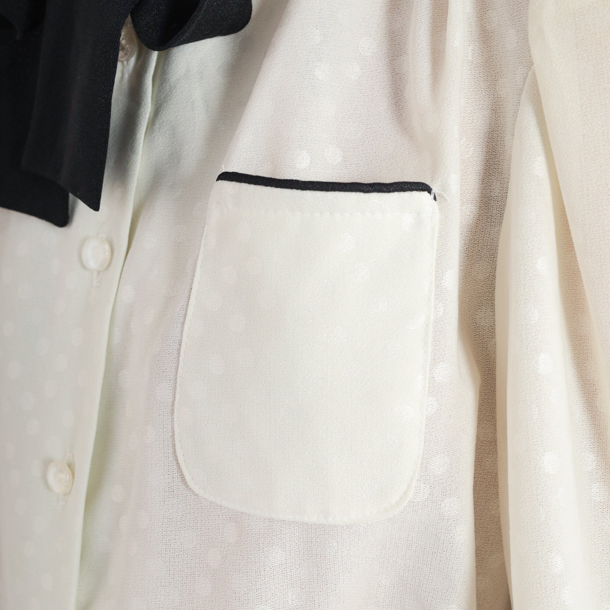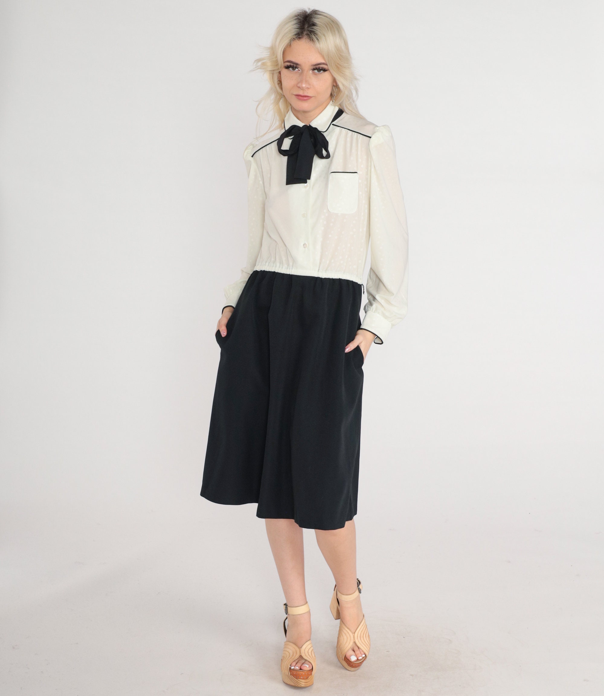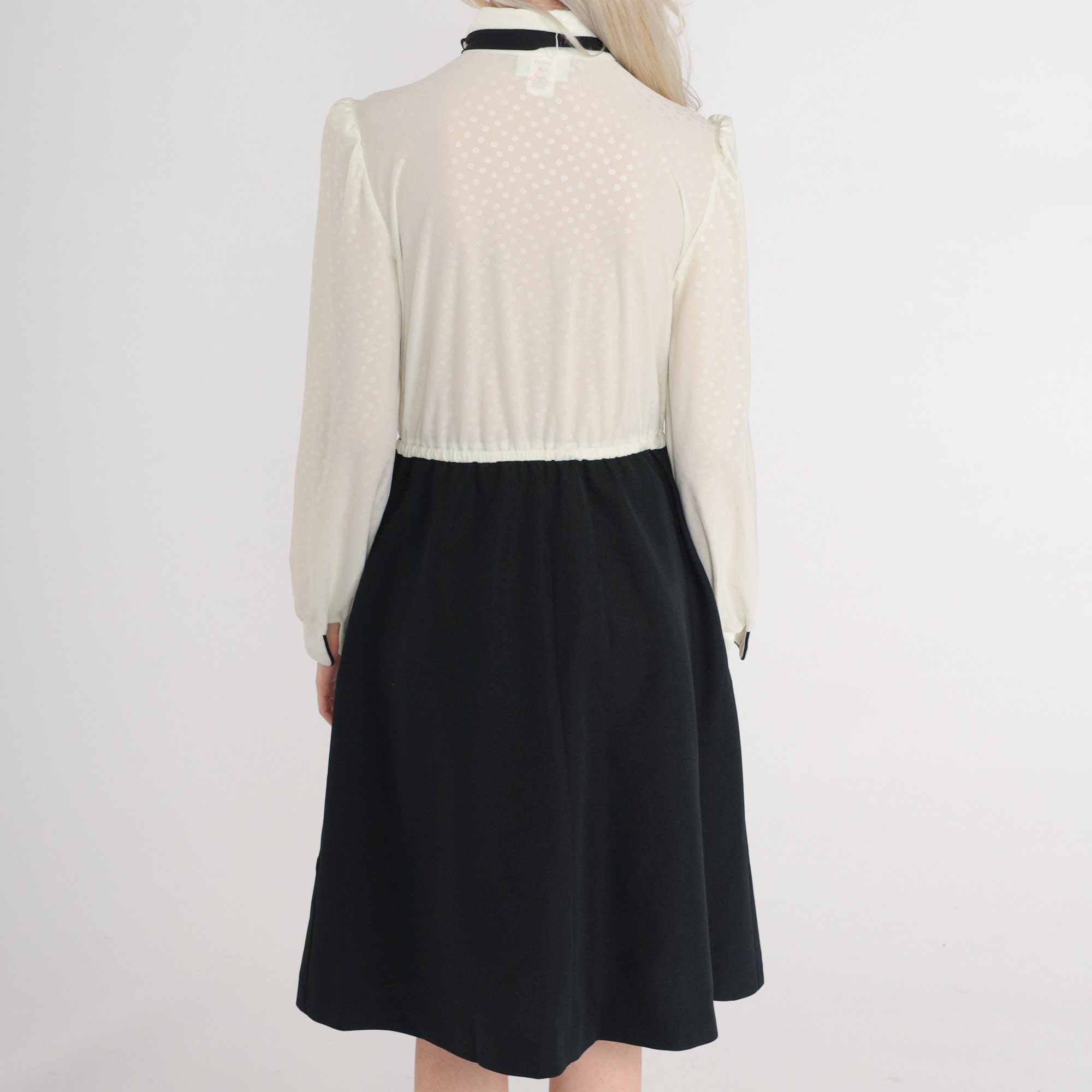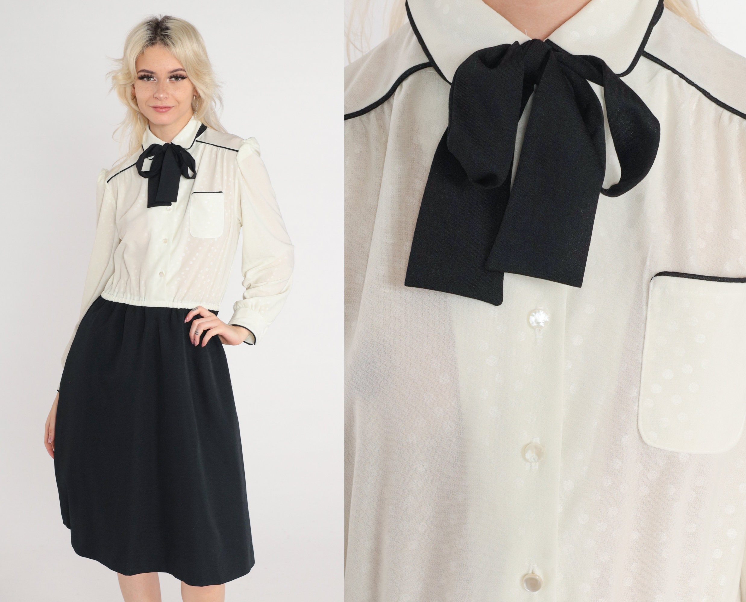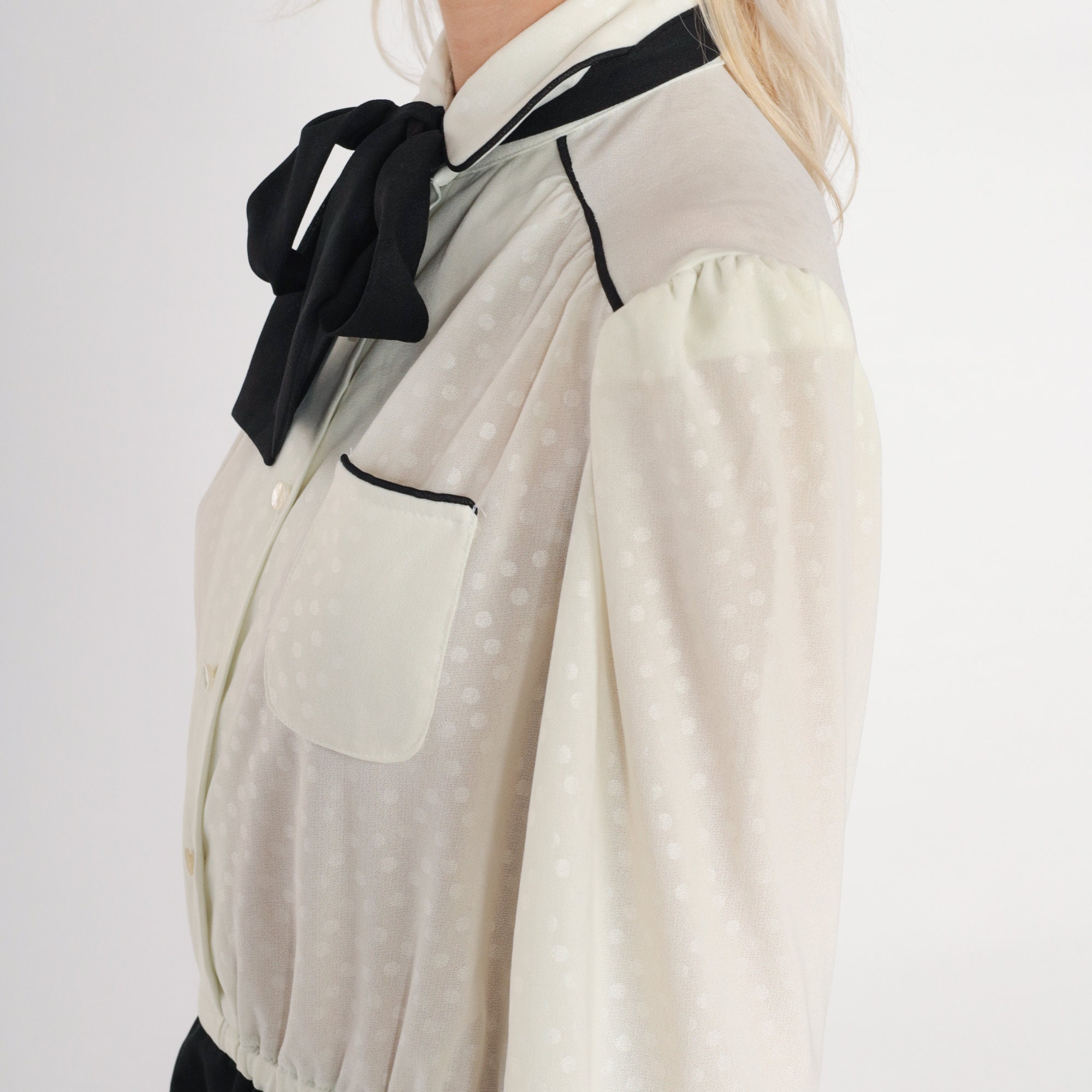 Vintage 80s dress with a black skirt and an embossed off-white bodice with a polka dot design. It has an ascot necktie, puff sleeves and a high waist. Mini length.