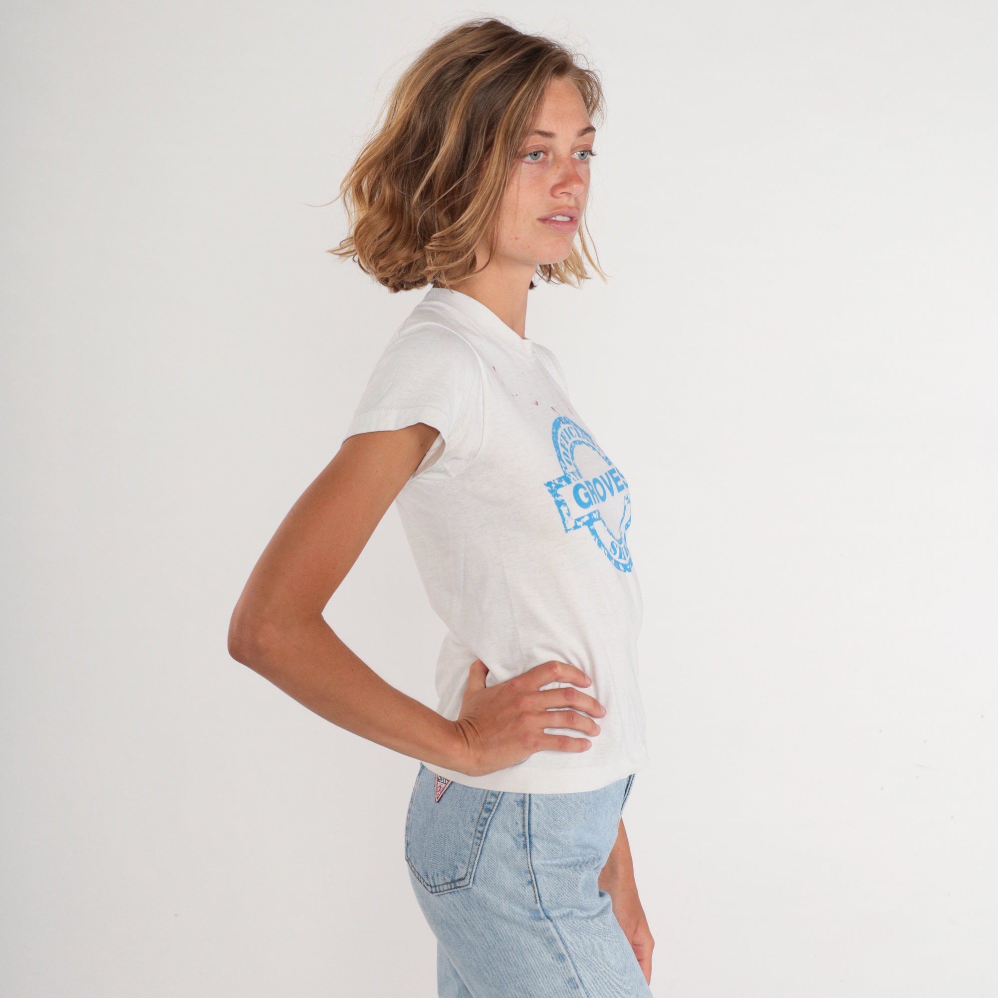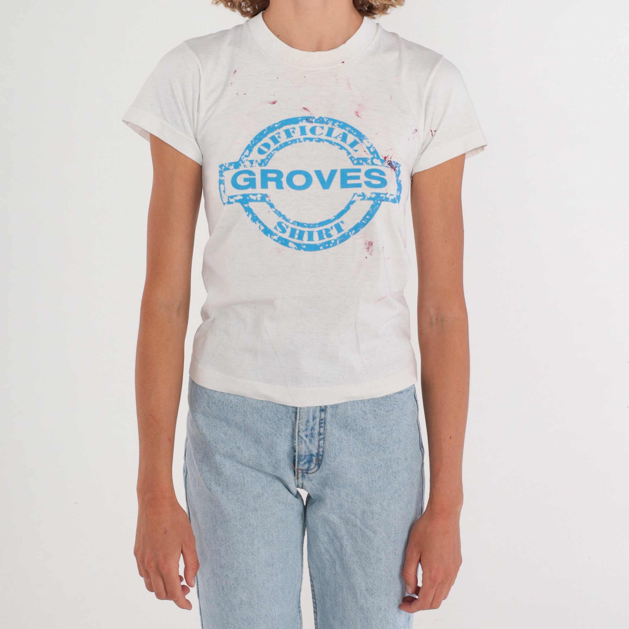 Vintage 90s t shirt in white with "Official Groves Shirt" on the front. Distressed with paint splatters.