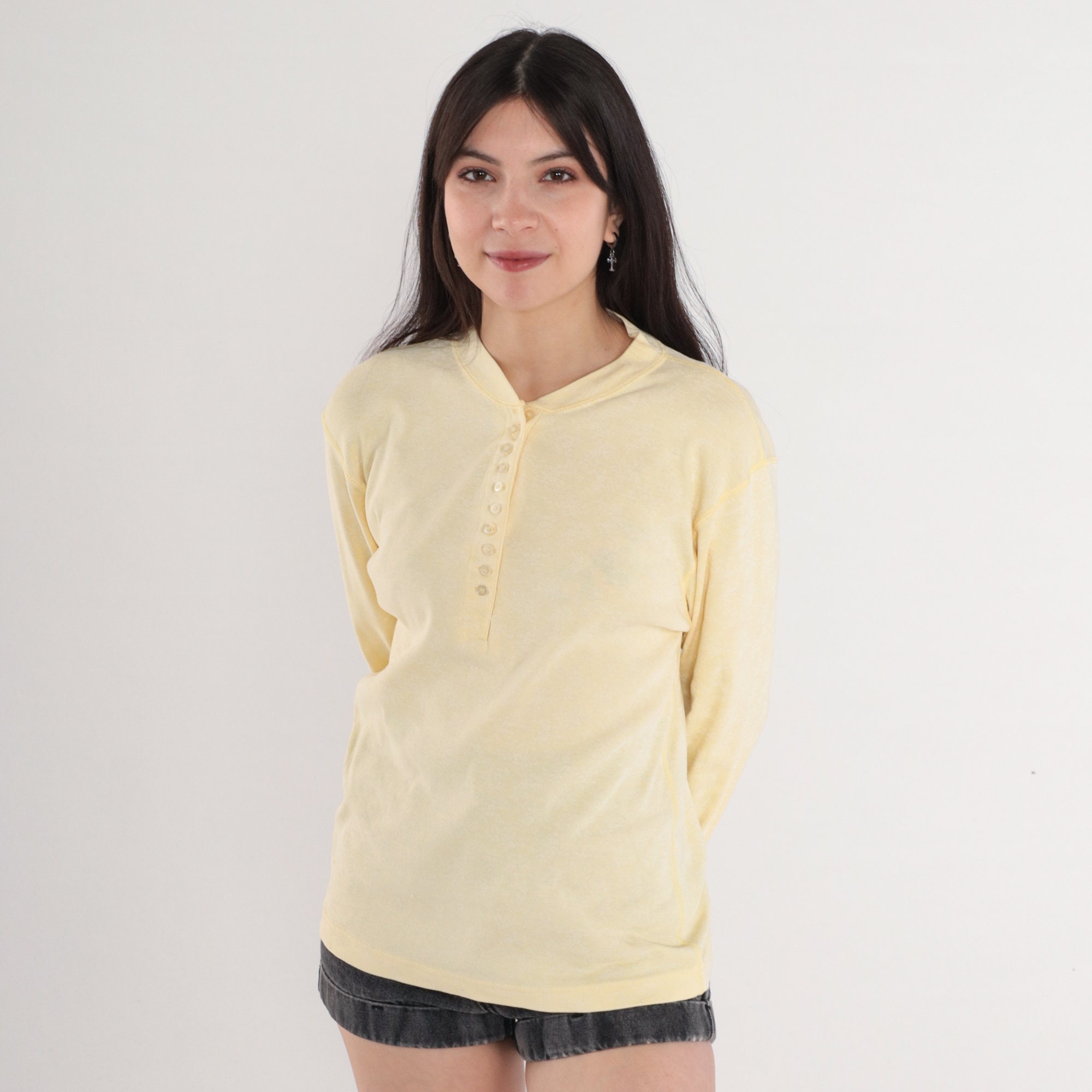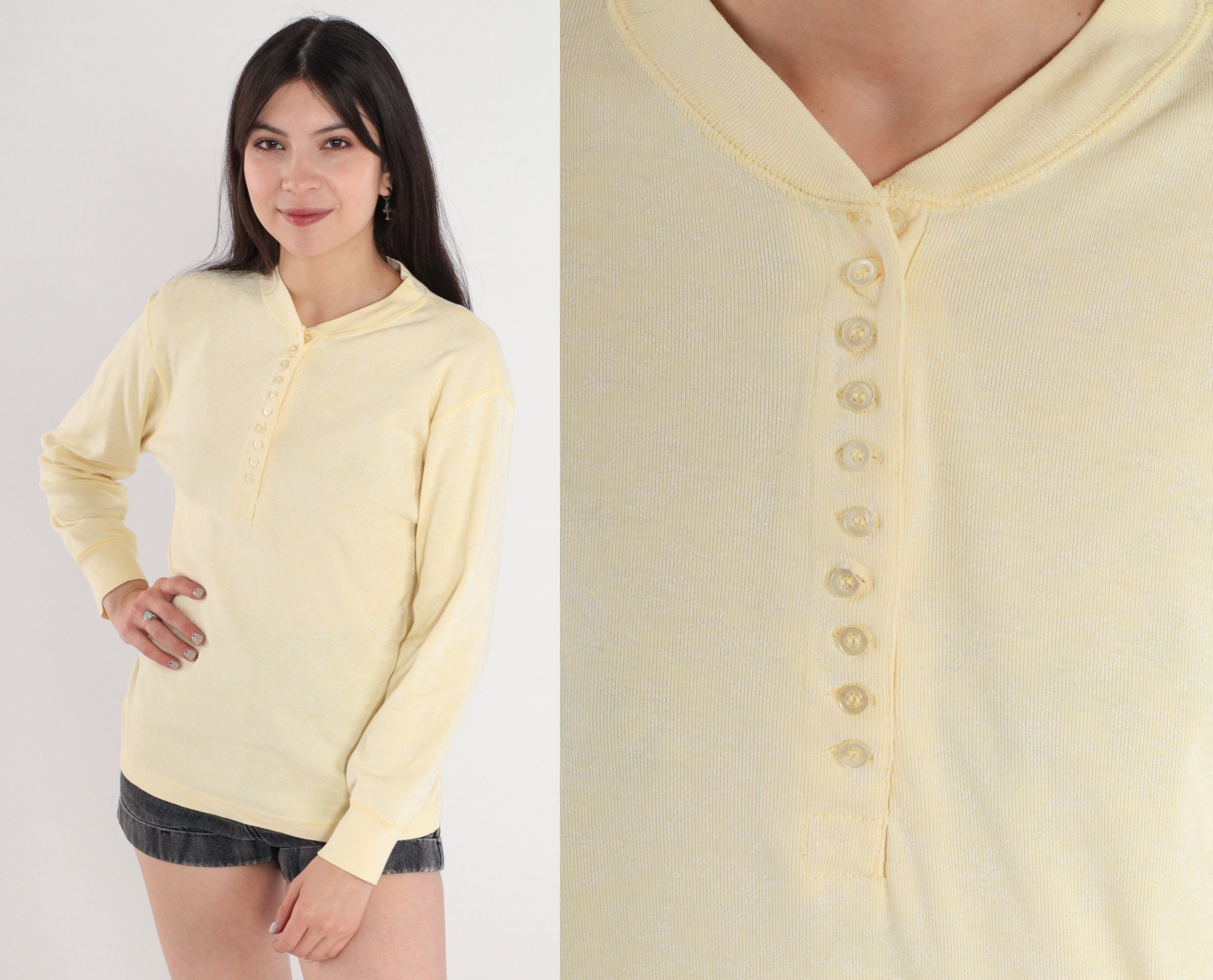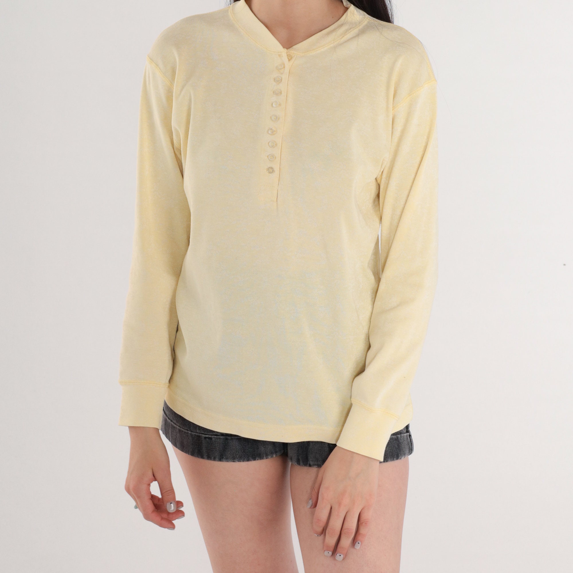 Vintage 80s henley shirt in pale yellow with a subtle floral print. Long sleeves and buttons up the chest.