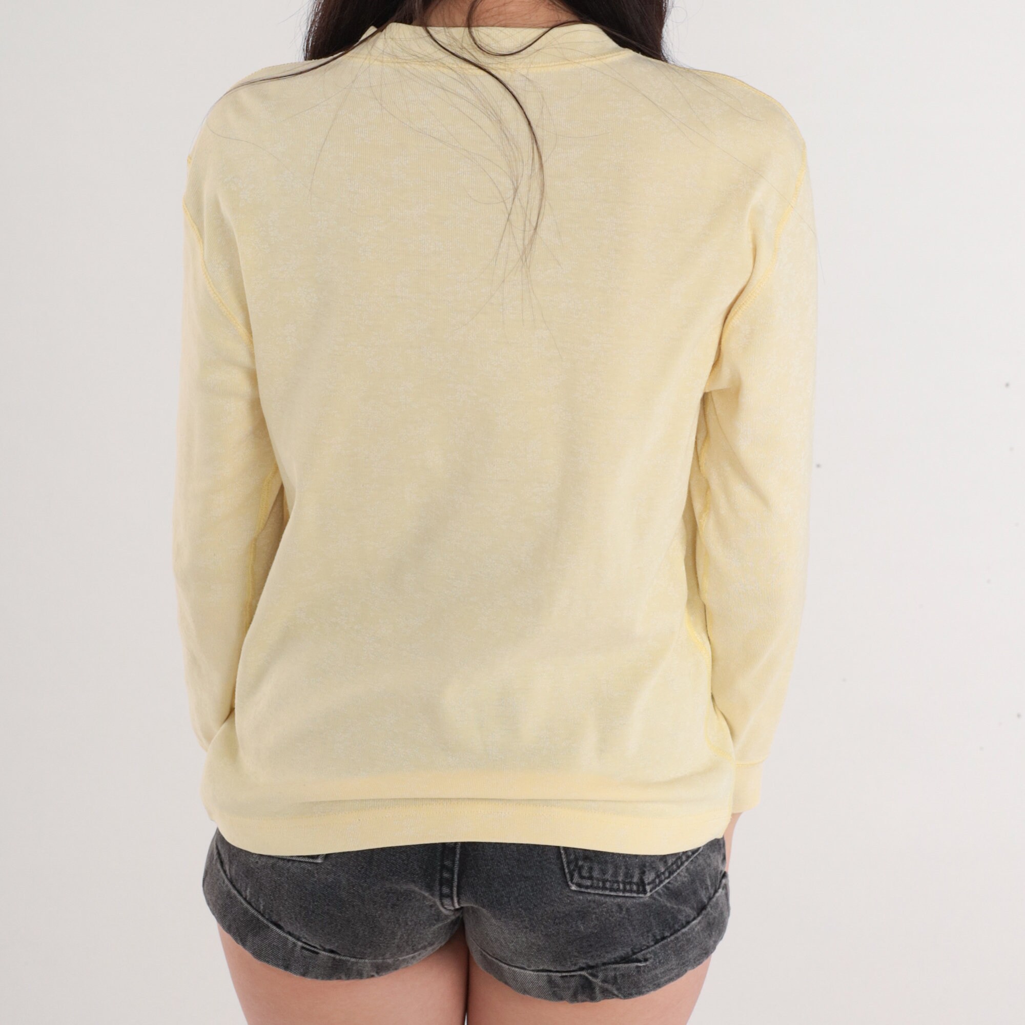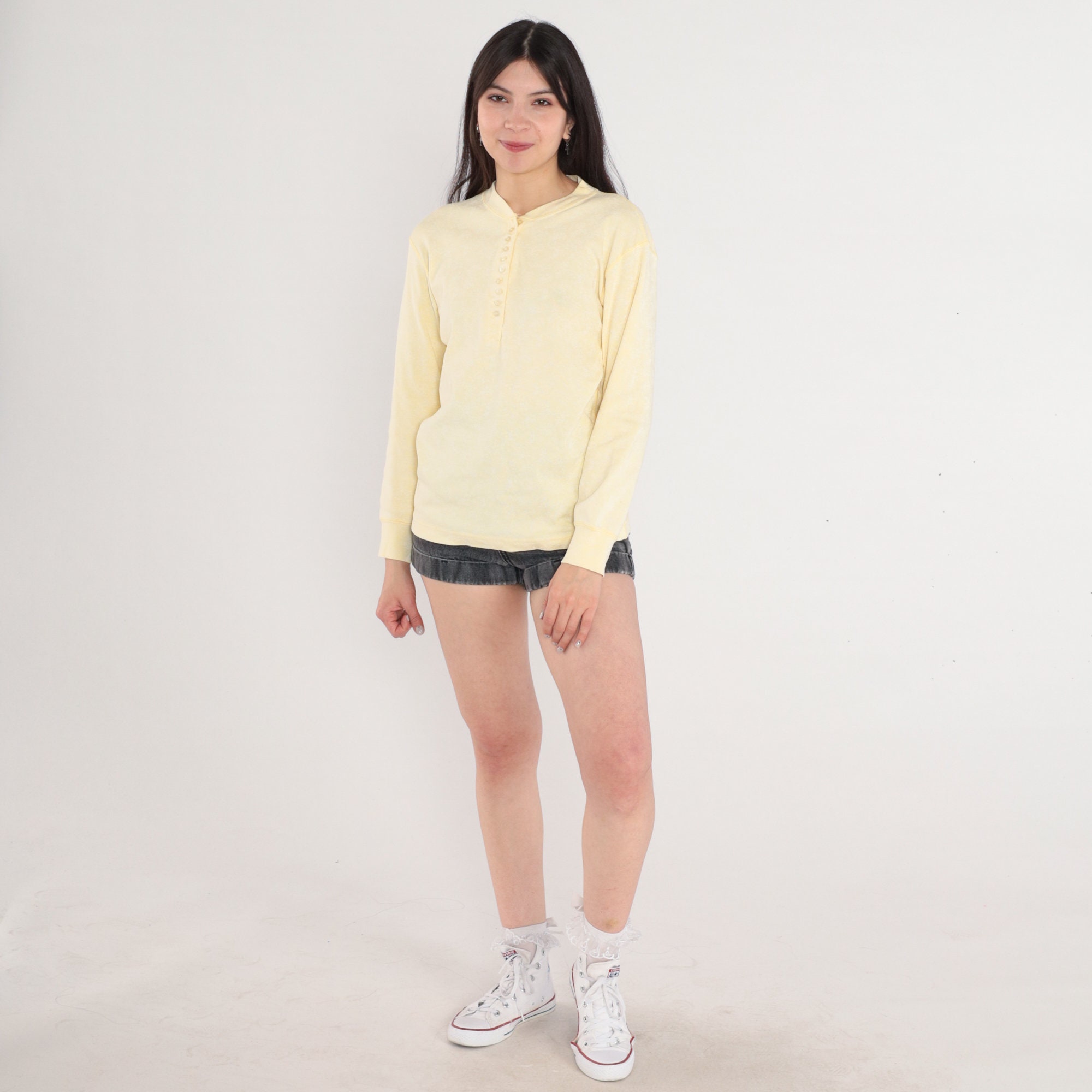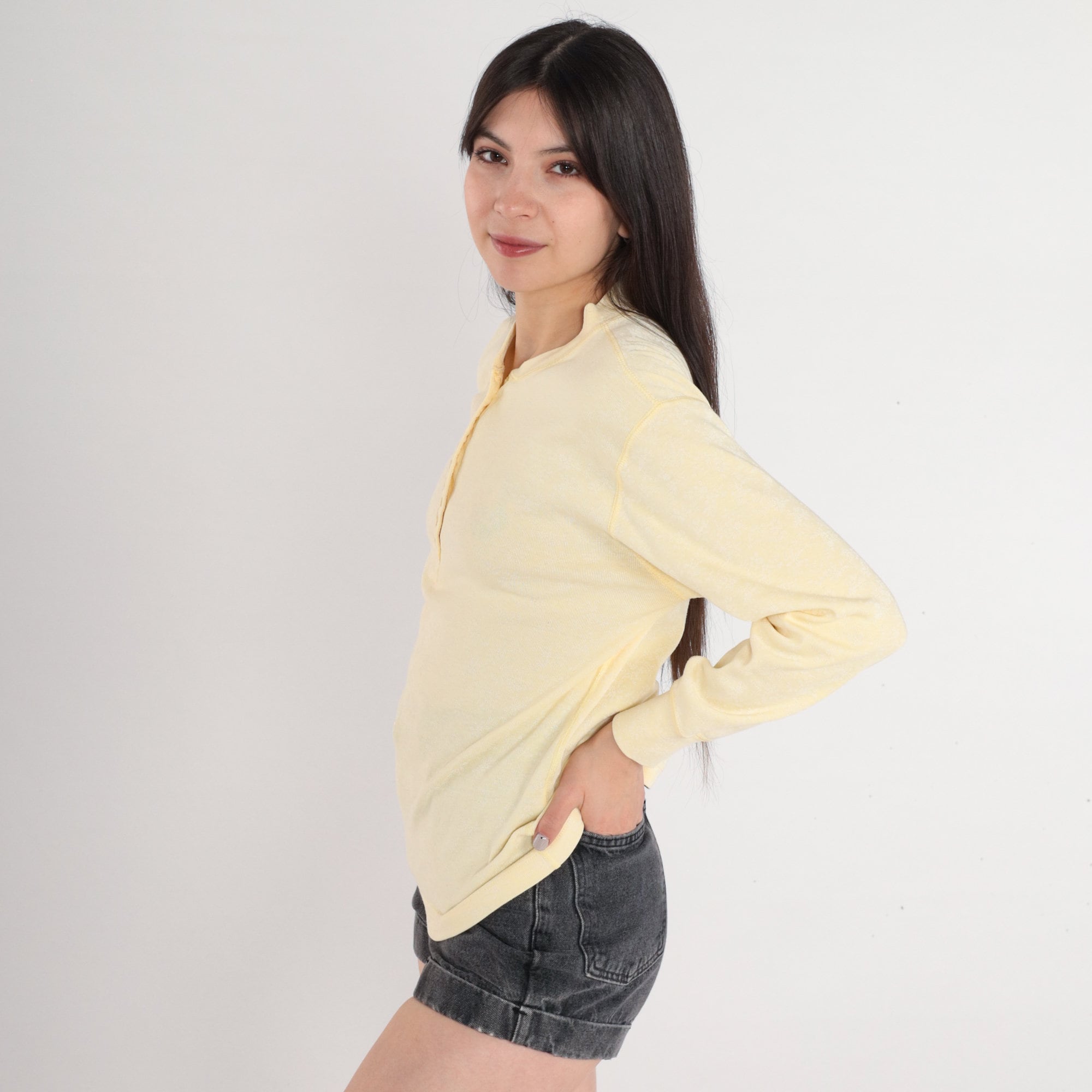 Vintage 80s henley shirt in pale yellow with a subtle floral print. Long sleeves and buttons up the chest.