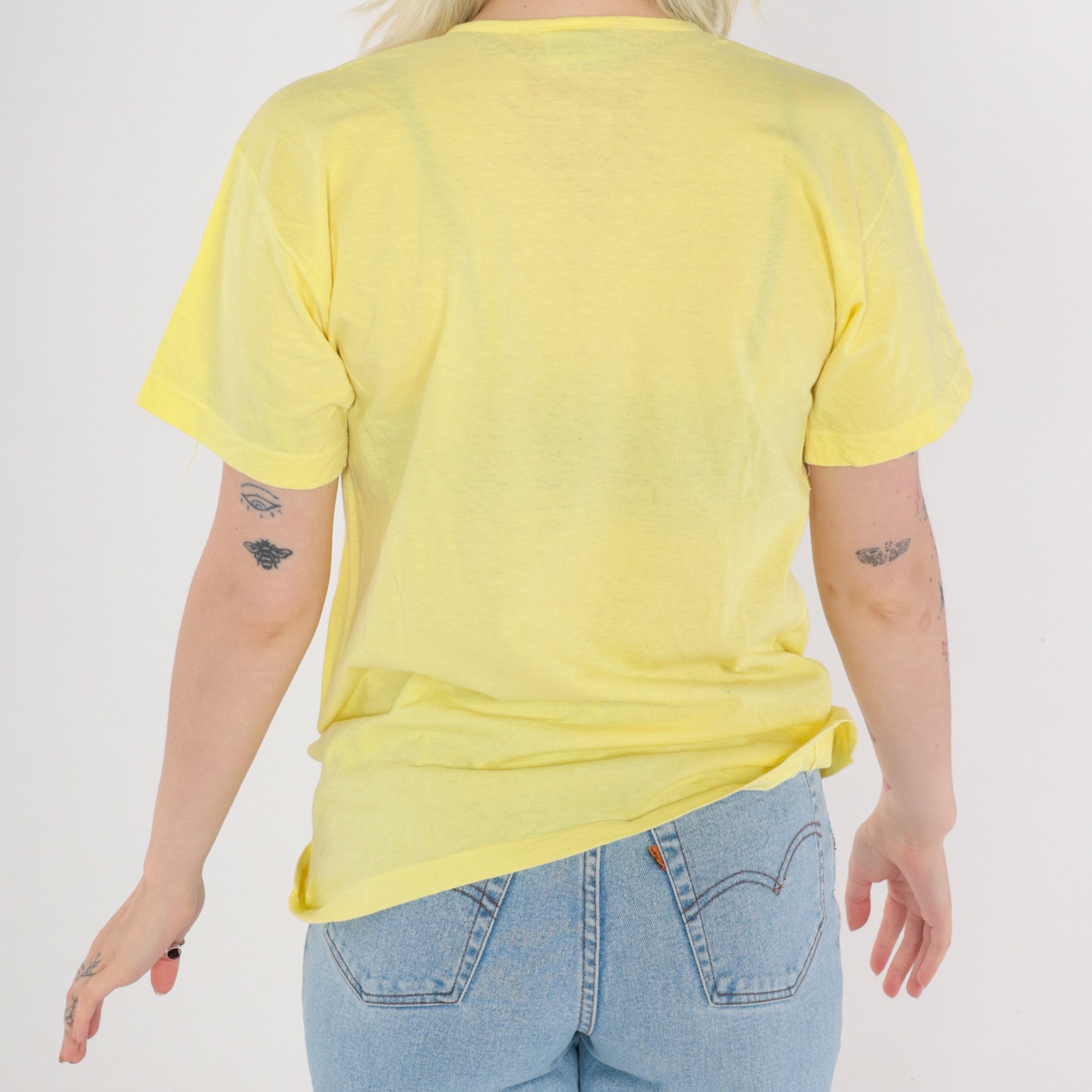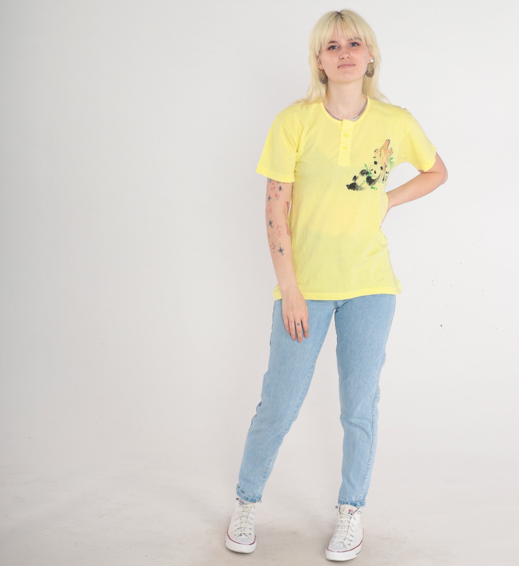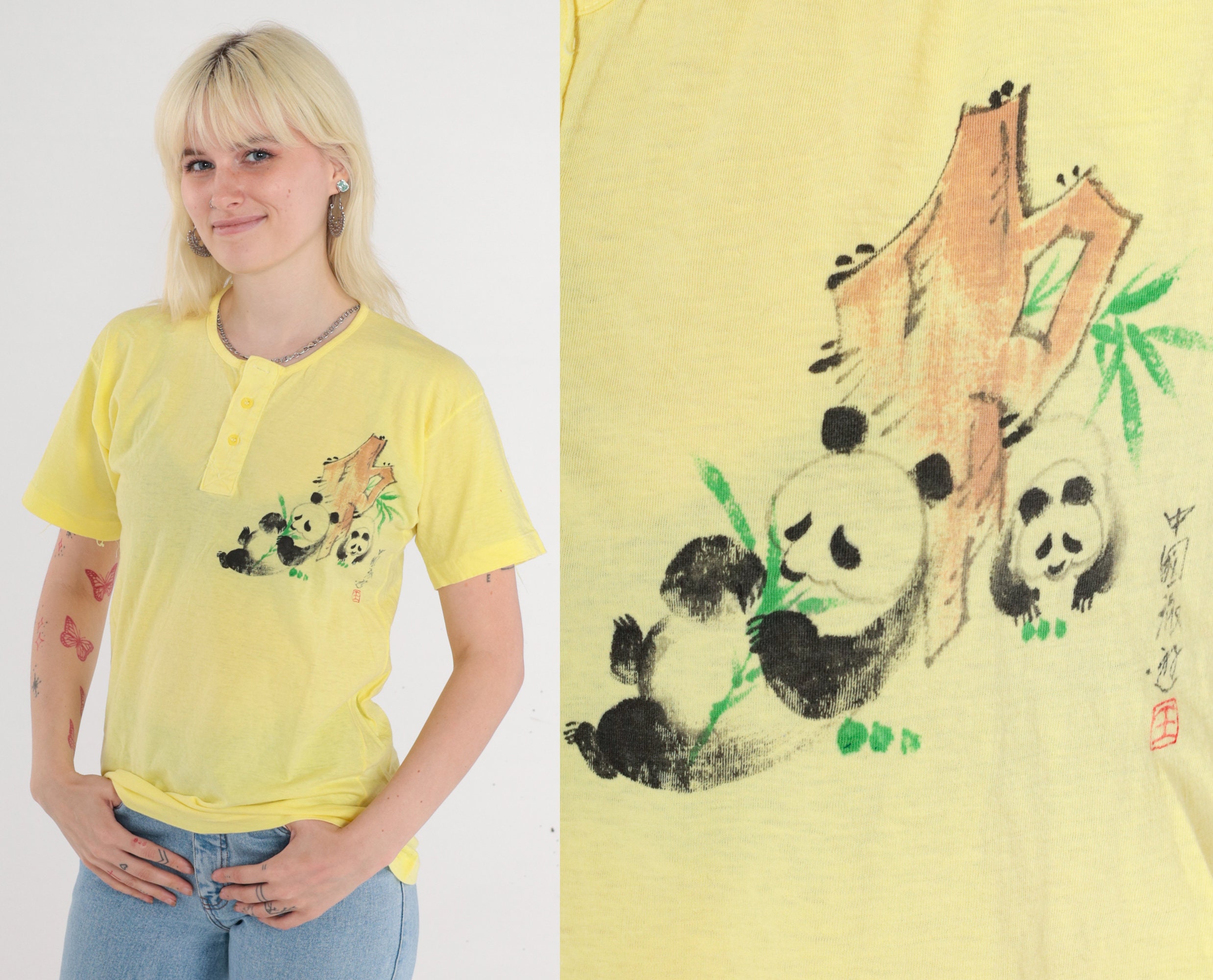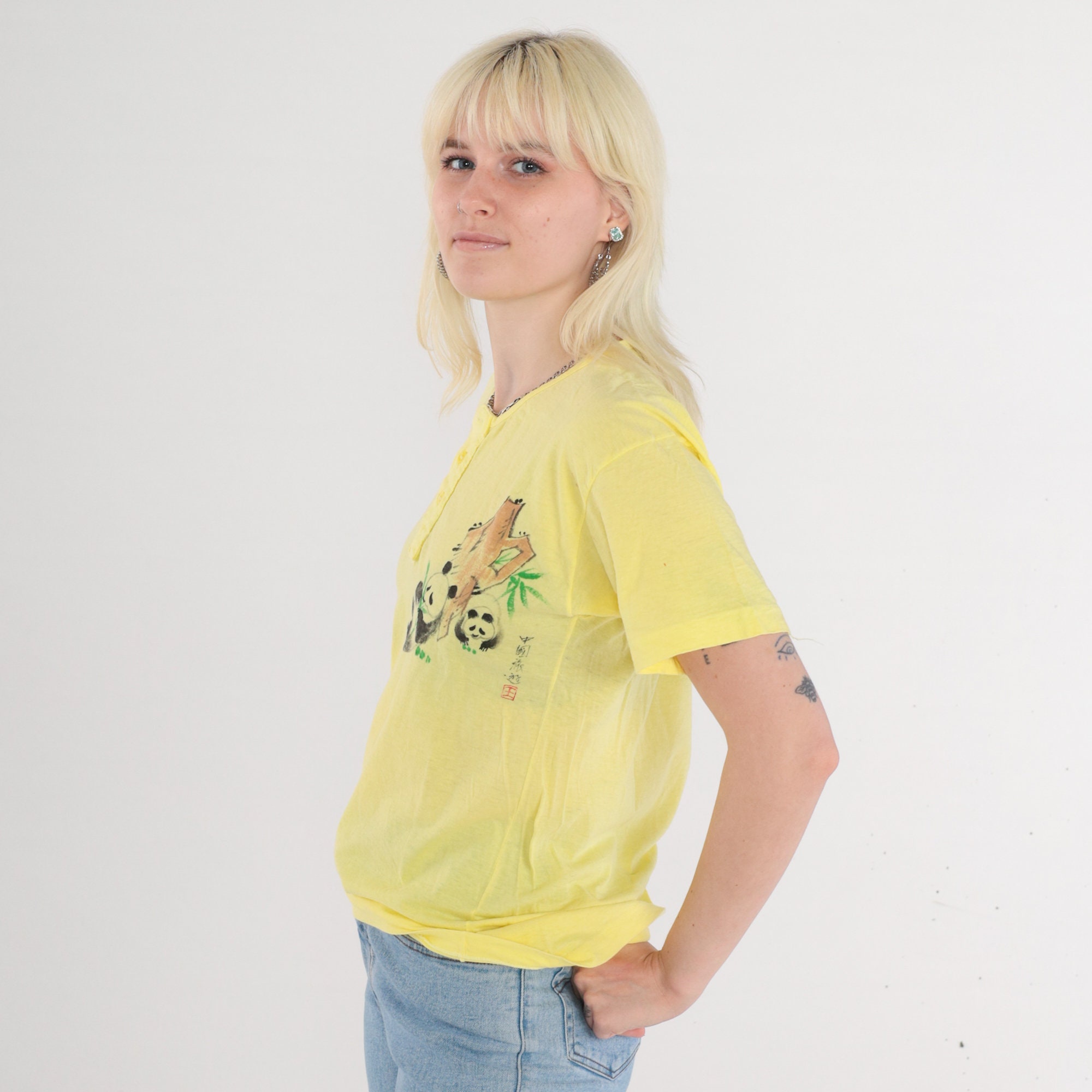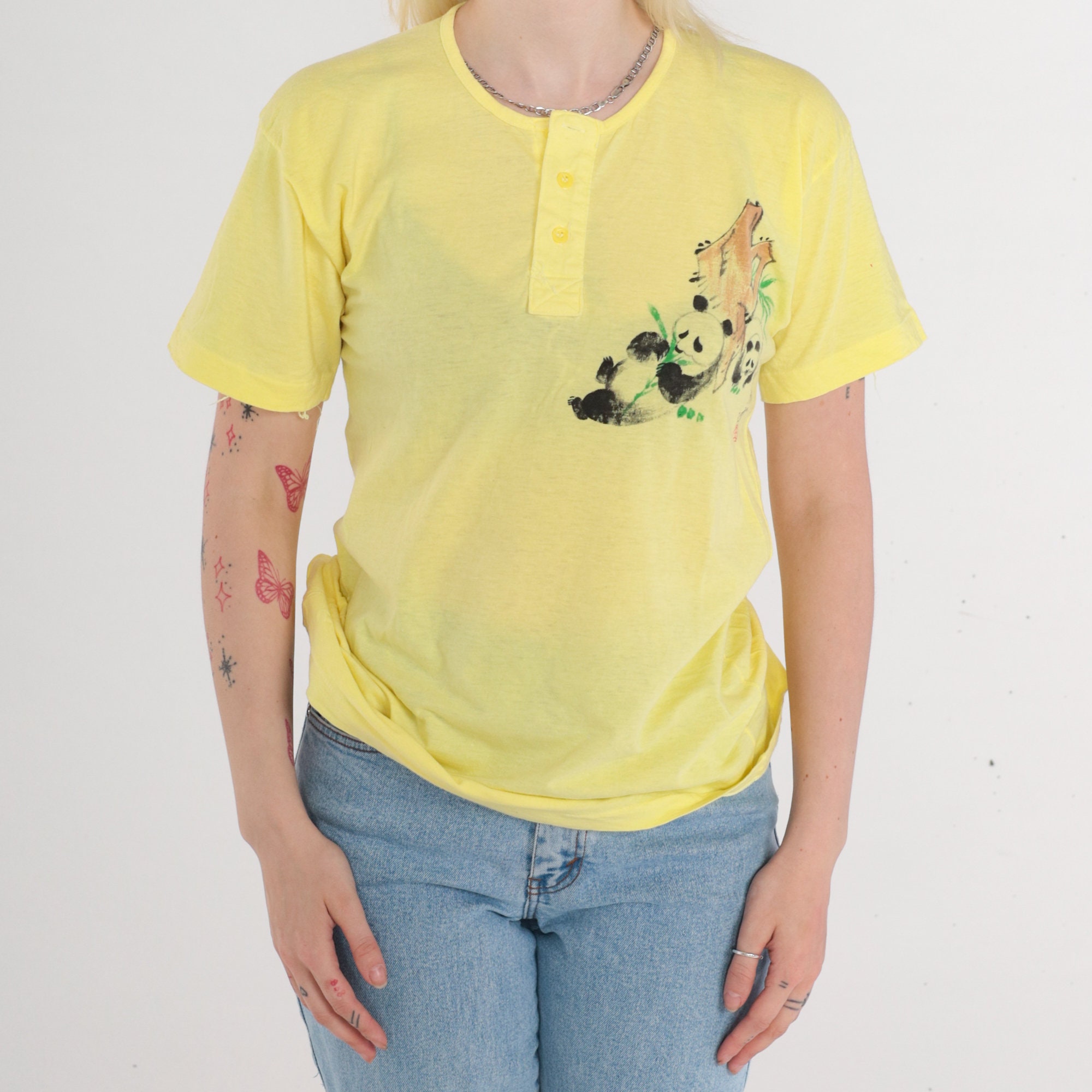 Vintage 80s t shirt in yellow with a painted panda graphic on the chest and a button up henley neckline.