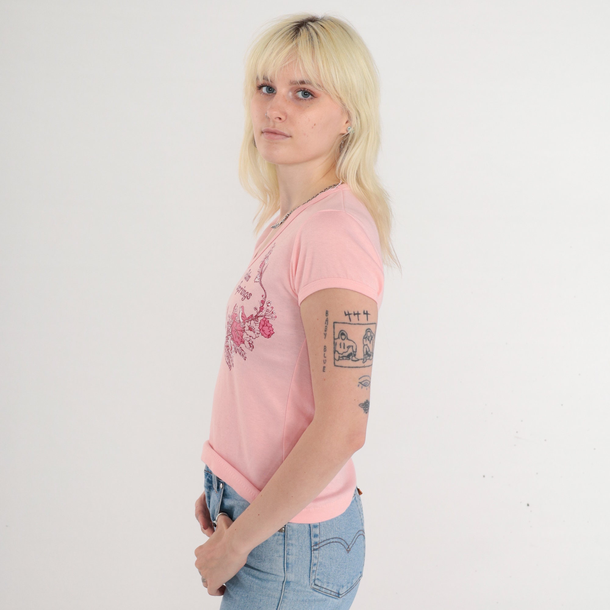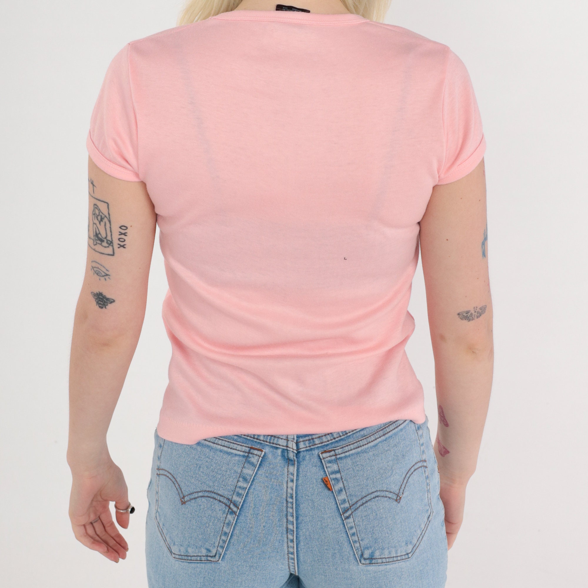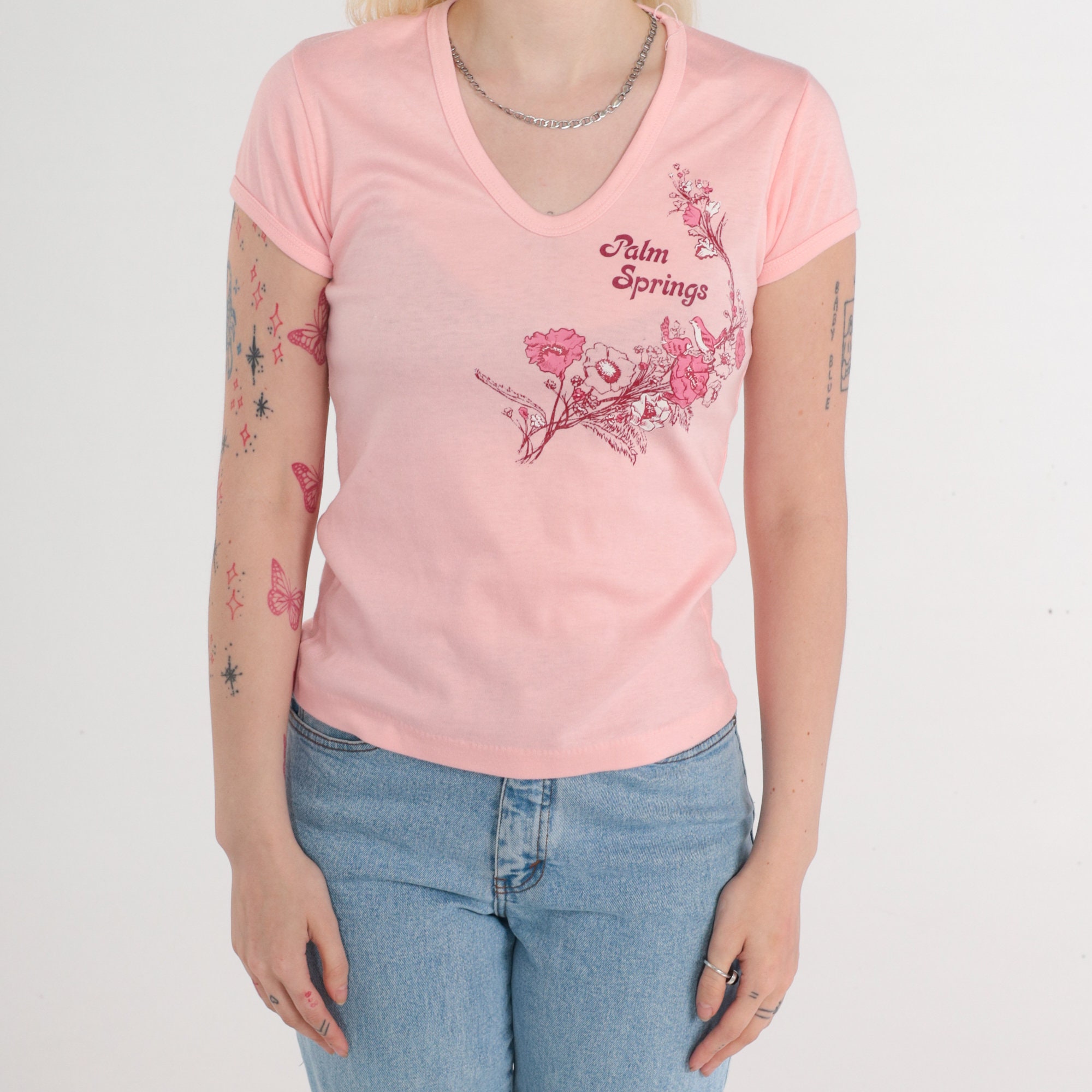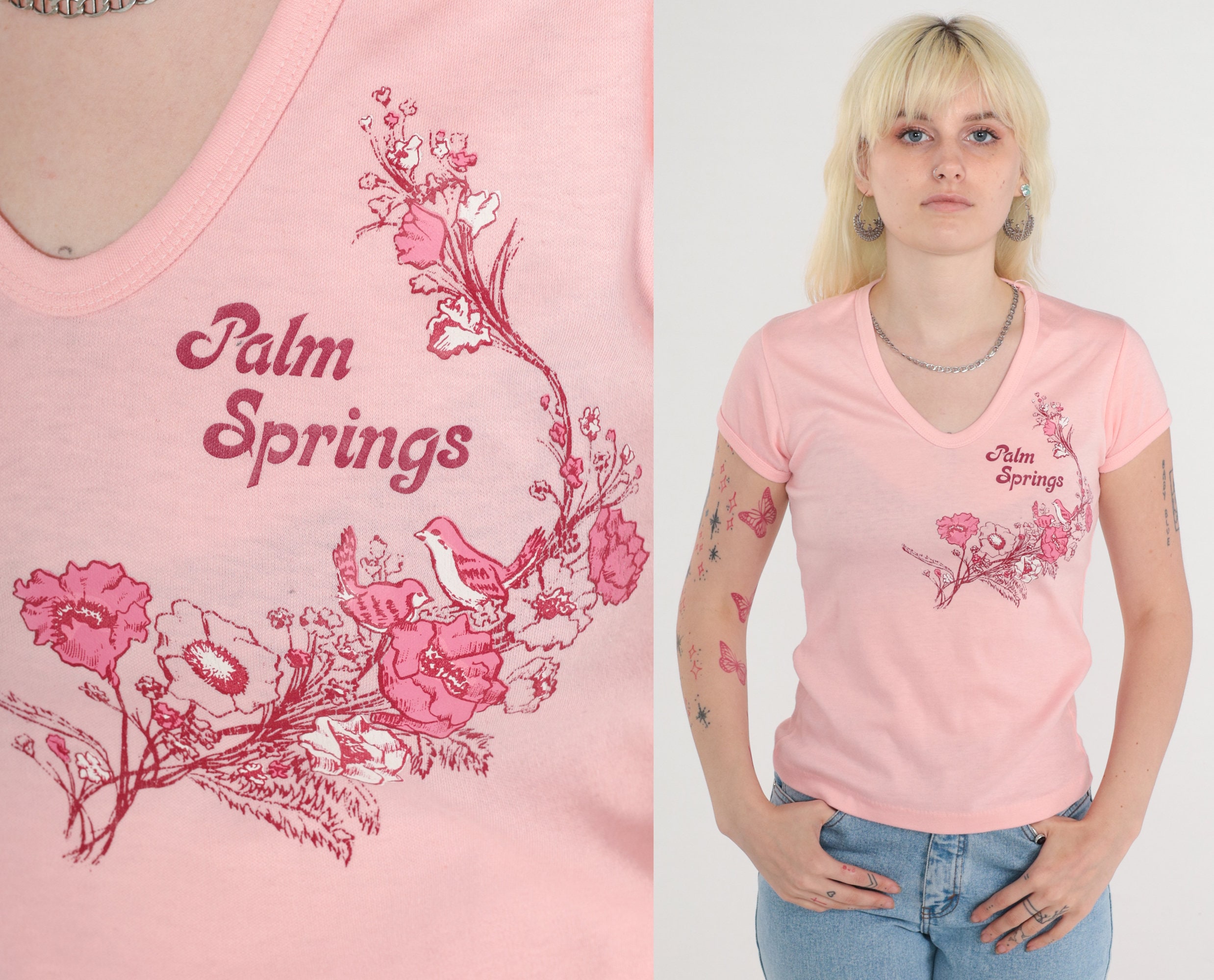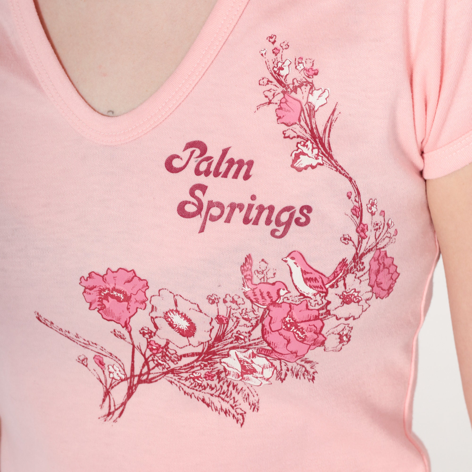 Vintage 80s v-neck t-shirt in pink with a floral graphic and "Palm Springs" on the chest.