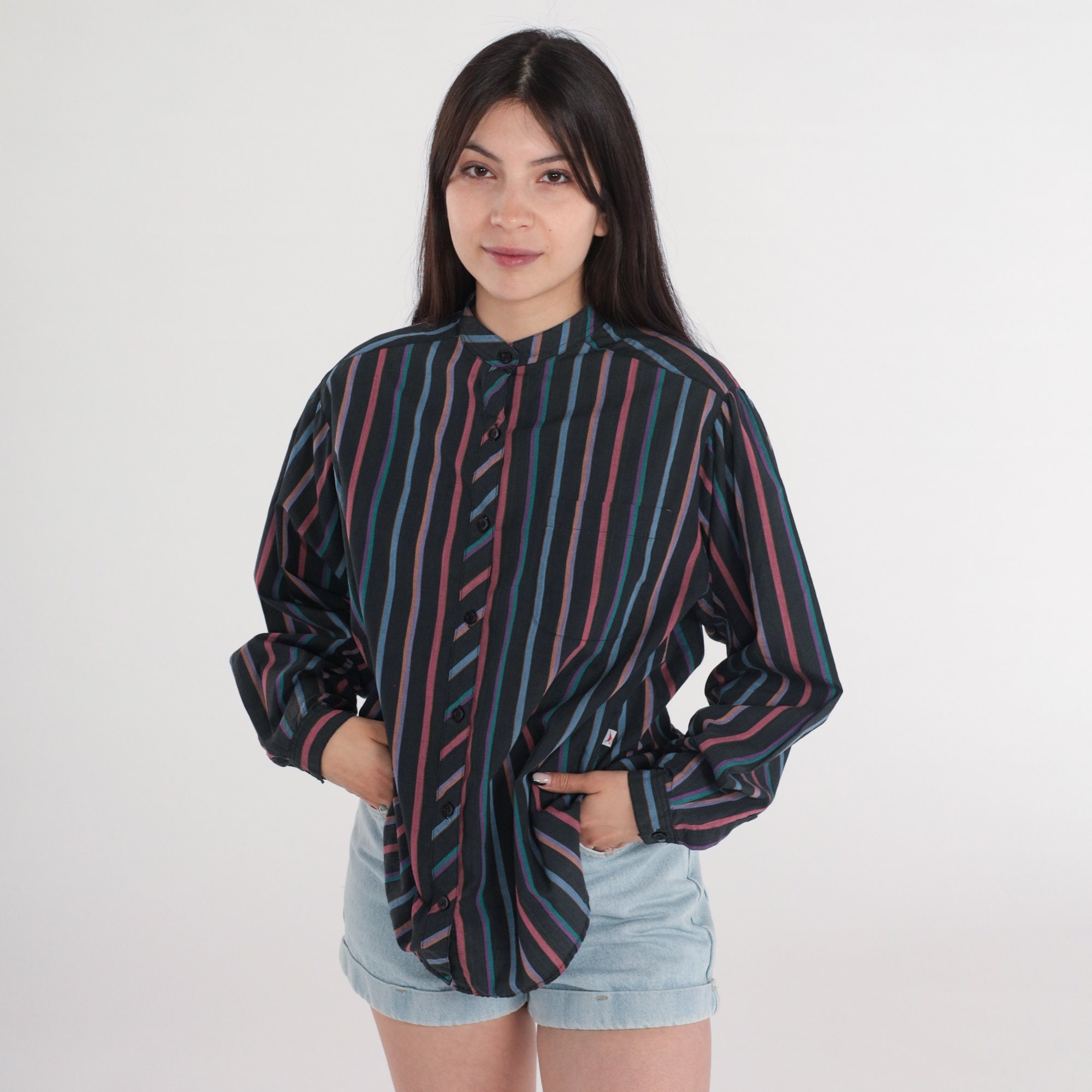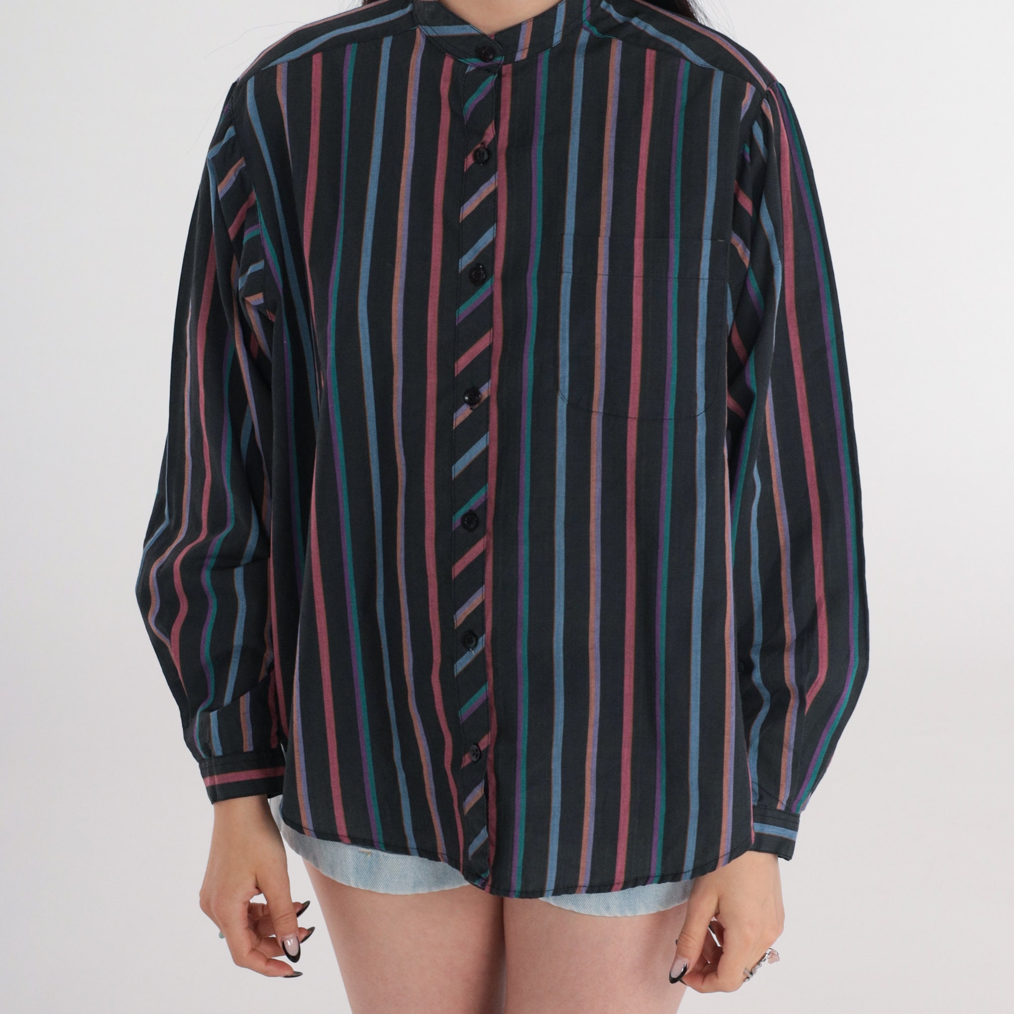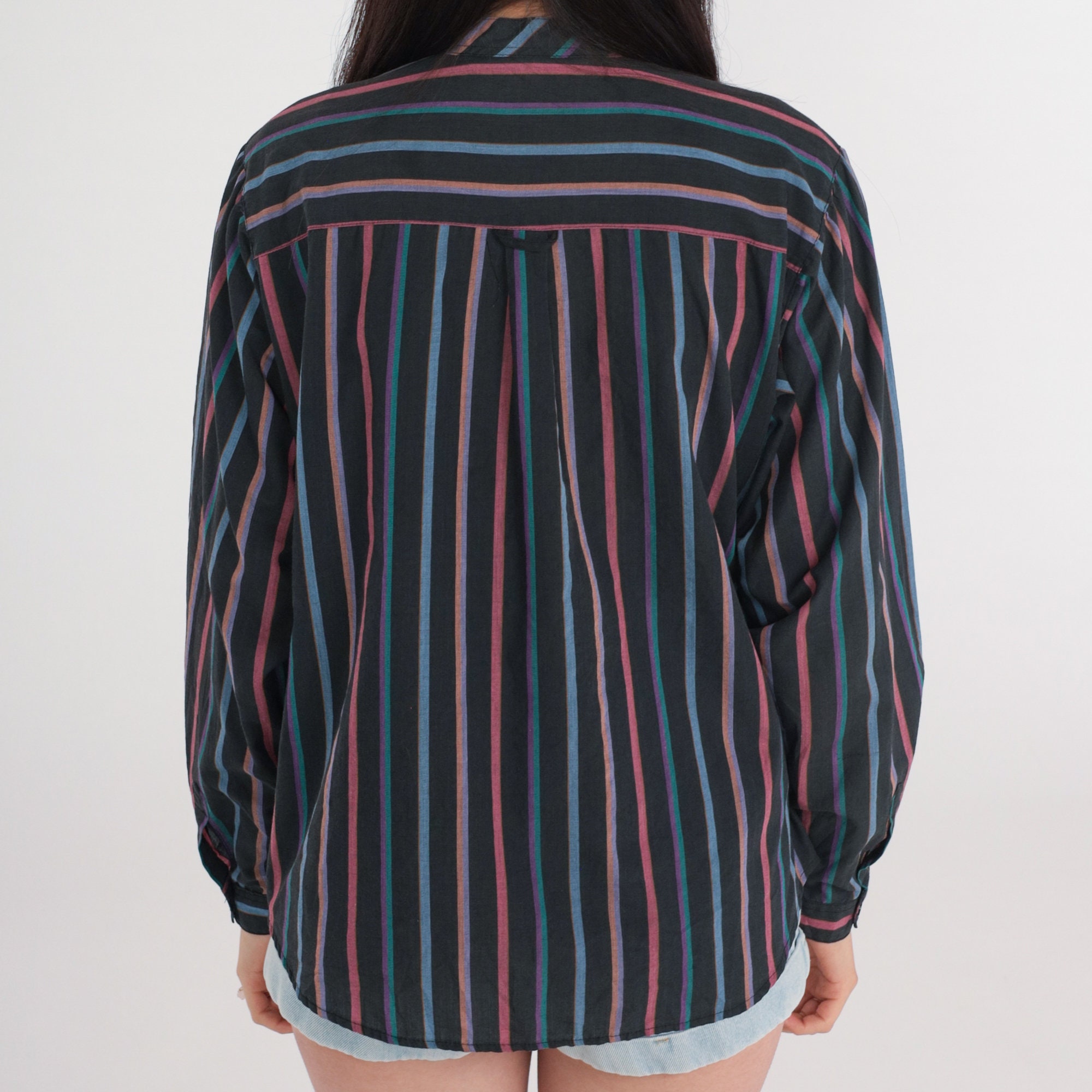 Vintage 90s shirt in black with stripes and a chest pocket. It has long sleeves and buttons up the front.