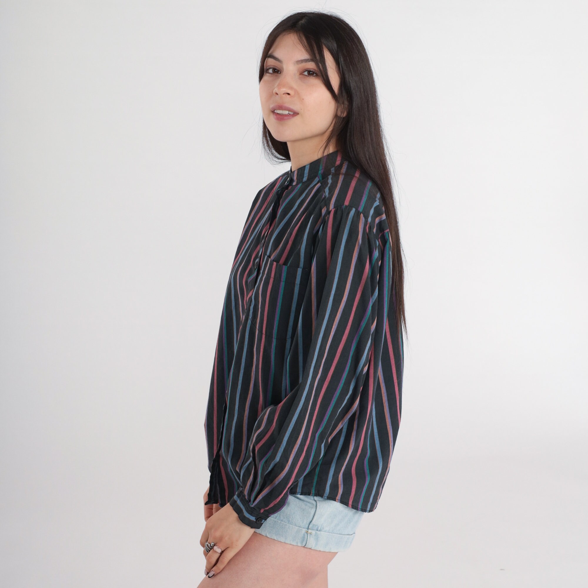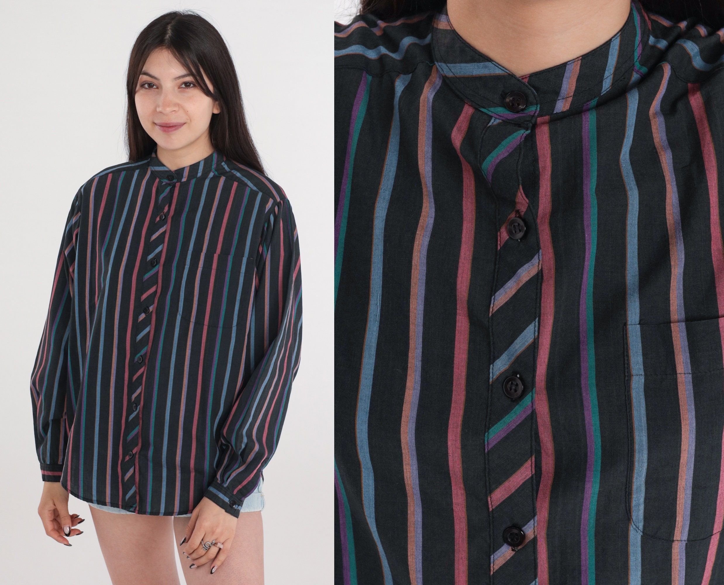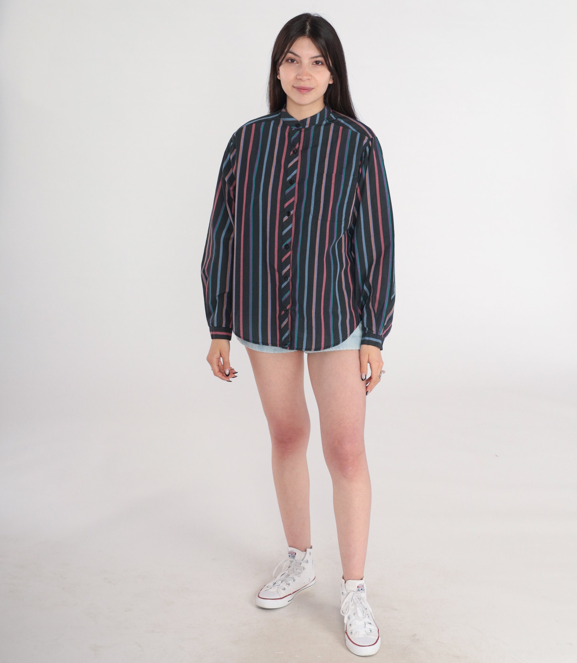 Vintage 90s shirt in black with stripes and a chest pocket. It has long sleeves and buttons up the front.