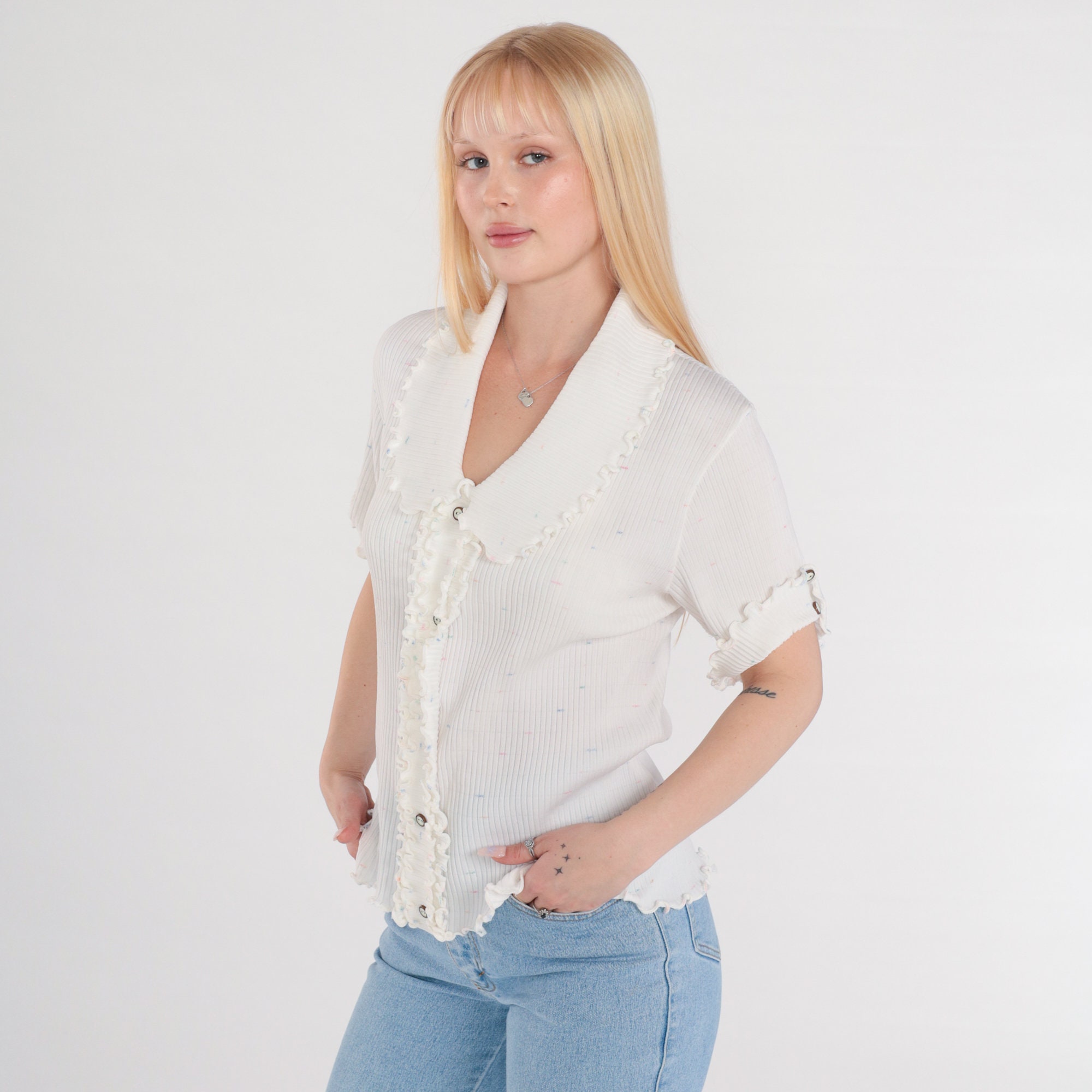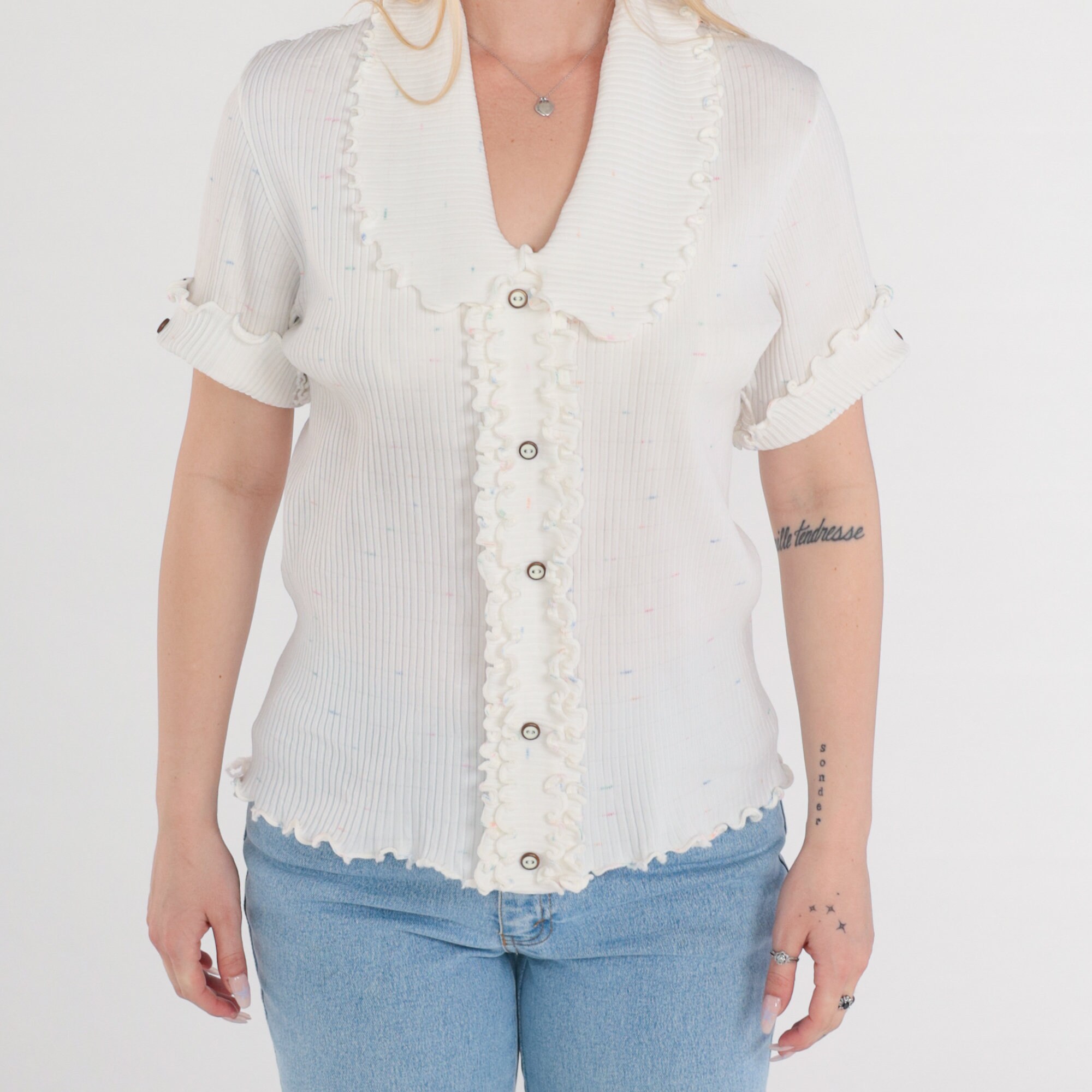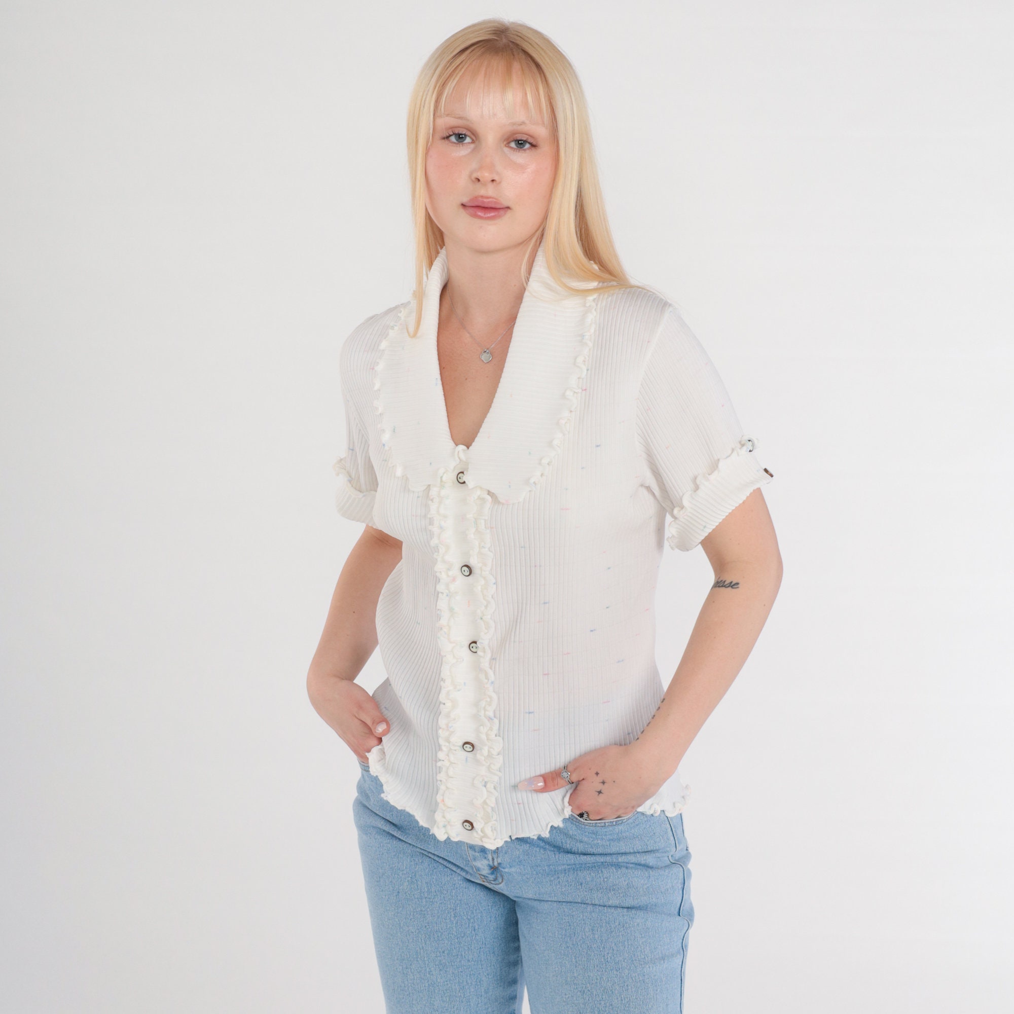 Vintage 70s blouse in ribbed white with ruffle trim. Short sleeves, a large rounded collar, and decorative buttons up the front.